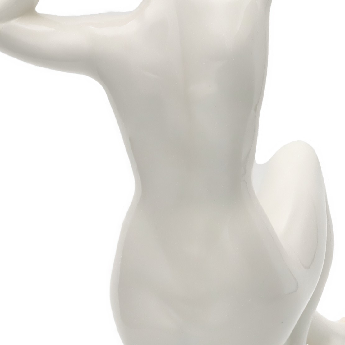 Die weibliche Figur sitzt entspannt und wirkt fast so, als sei sie in Gedanken versunken, während sie ihre Haare hochhebt – ein Motiv, das sowohl zeitlos als auch von anmutiger Einfachheit ist. Die glatte, glänzende Oberfläche des Porzellans verstärkt die weichen, fließenden Linien der Figur, und die subtile Farbgebung, die durch die handbemalten Details erreicht wird, sorgt für eine feine Balance zwischen Natürlichkeit und künstlerischer Interpretation.