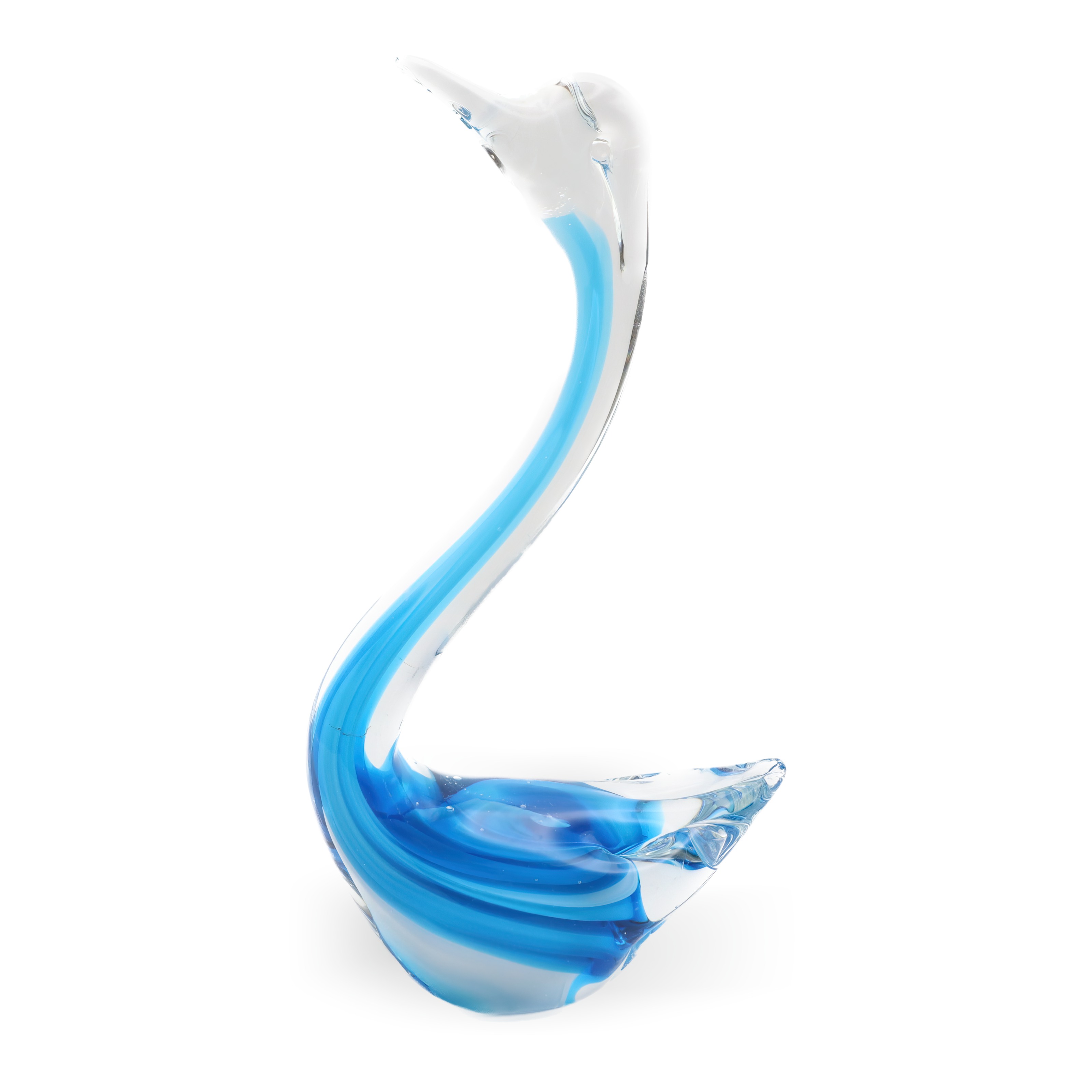 Ein fun fact: Kein original Murano-Objekt gleicht exakt dem anderen. Der gesamte Entstehungsprozess, vom Einschmelzen über das Formen bis zum Abkühlen, wird von Hand durchgeführt. Das macht jeden Schwan zum Unikat. Die Manufaktur-Techniken, wie der gezielte Einsatz von Farbigem Glas in transparenten Überfang, wurden auf Murano kontinuierlich weiterentwickelt. Gerade diese farbintensive, dynamische Optik ist typisch für Stücke aus den Sechziger- und Siebzigerjahren.