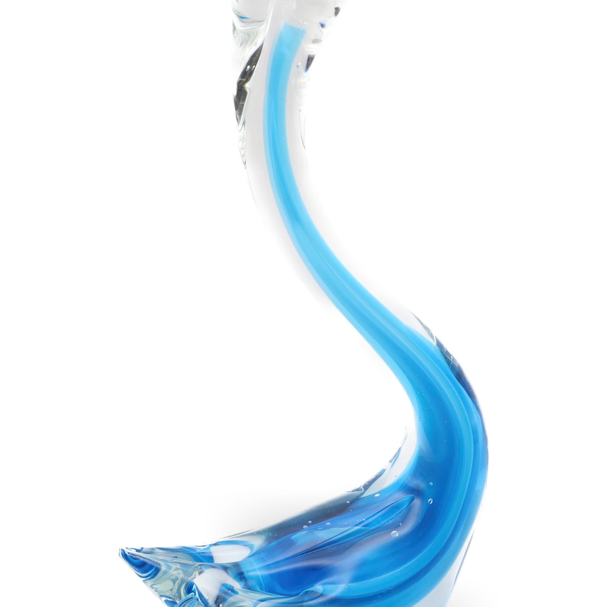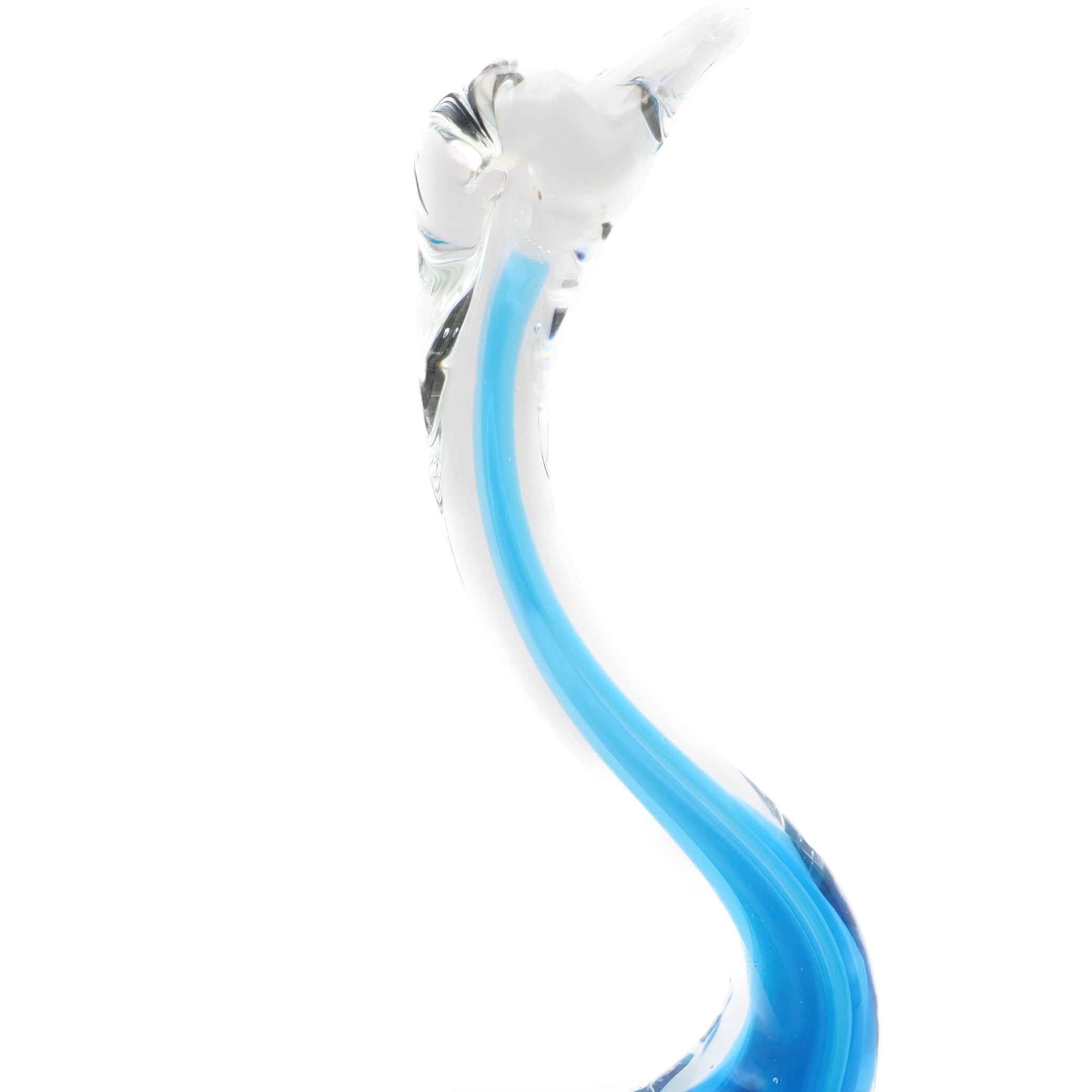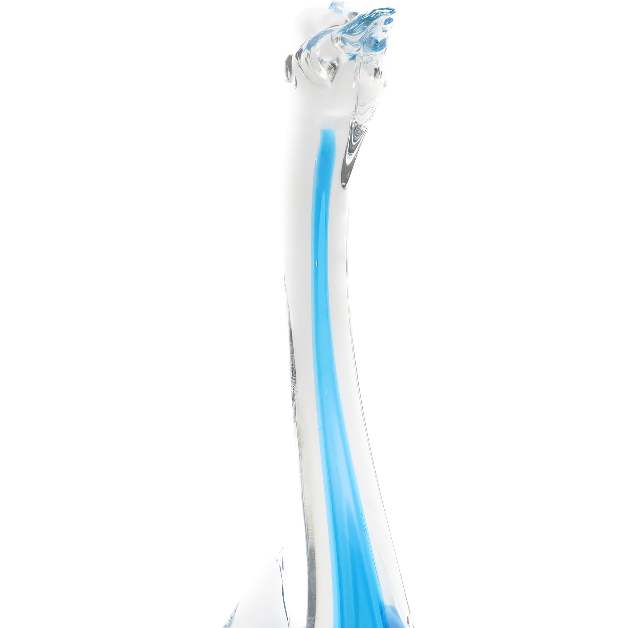 Gefertigt im Jahre 1970 auf Murano, der legendären Glas-Insel bei Venedig, zeugt dieses Deko-Sammlerstück von echter italienischer Handwerkskunst. Die Skulptur ist mit einer Höhe von 21,59 cm, einer Breite von 5,08 cm und einer Länge von 10,16 cm nicht zu übersehen und wird sofort zum Blickfänger in Deiner Mid-Century oder Retro-Einrichtung. Die kühne Verwendung türkisblauer Farbe, eingeschlossen in transparentem Glas, lässt das Licht eindrucksvoll tanzen – je nach Tageszeit und Umgebung entstehen immer neue, faszinierende Reflexe.
