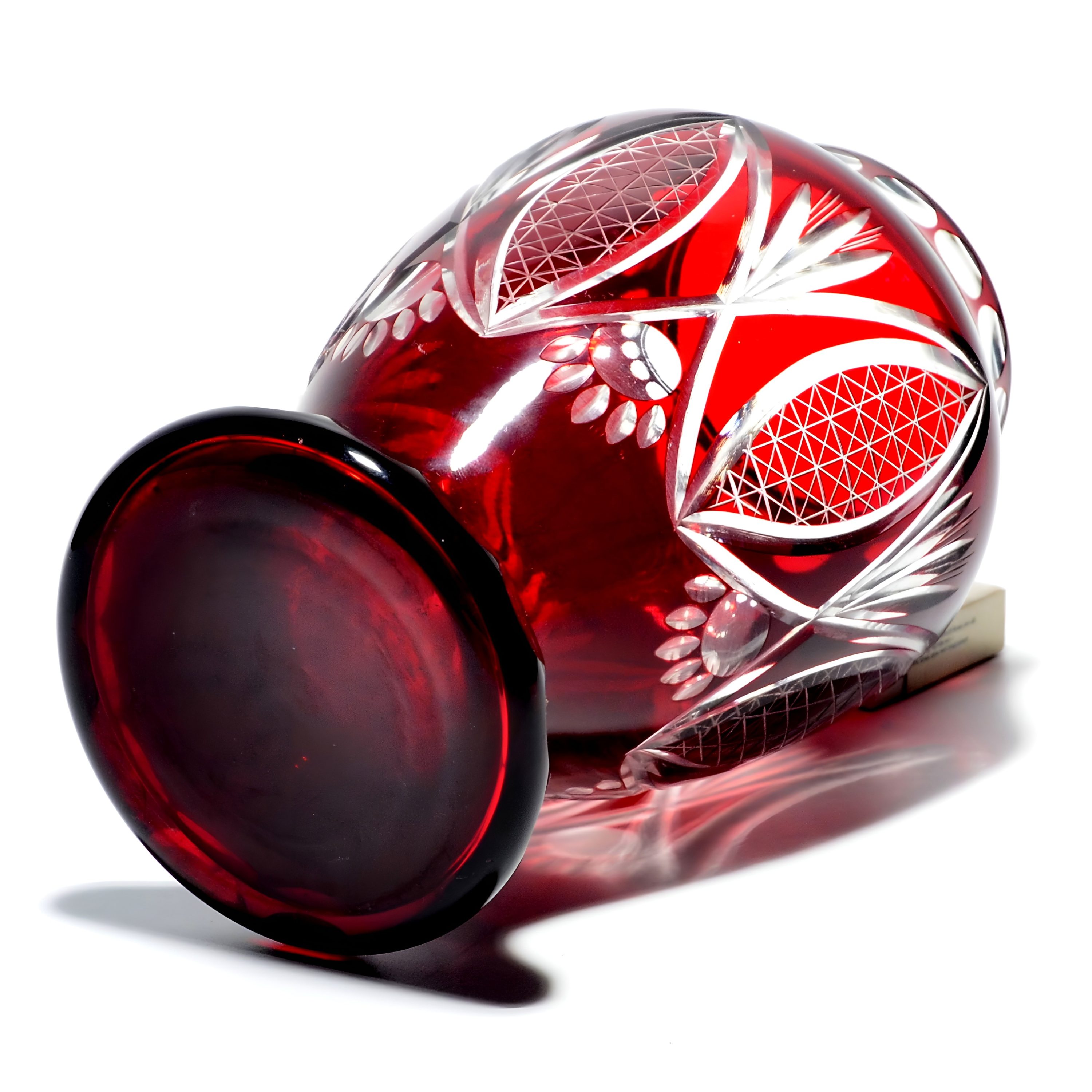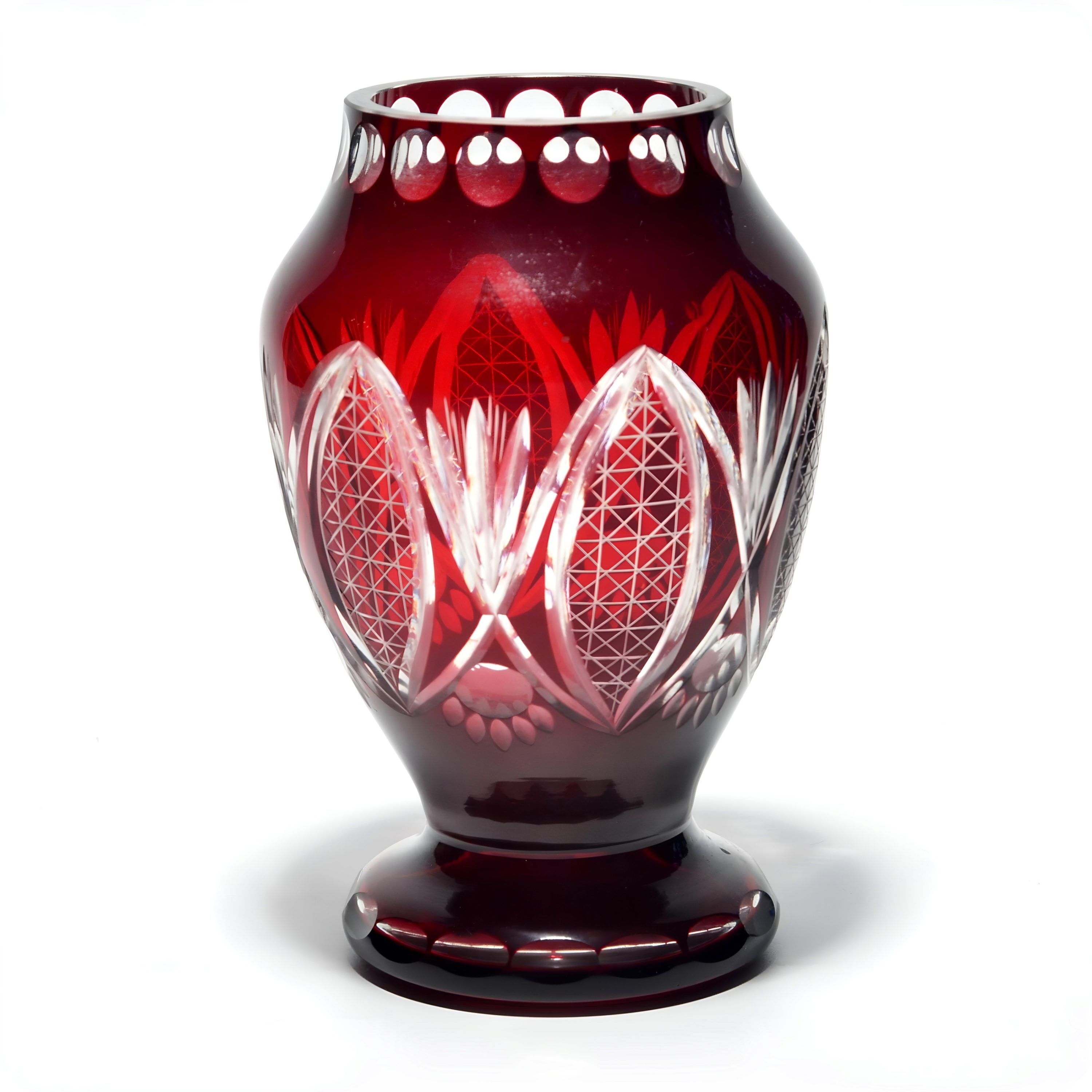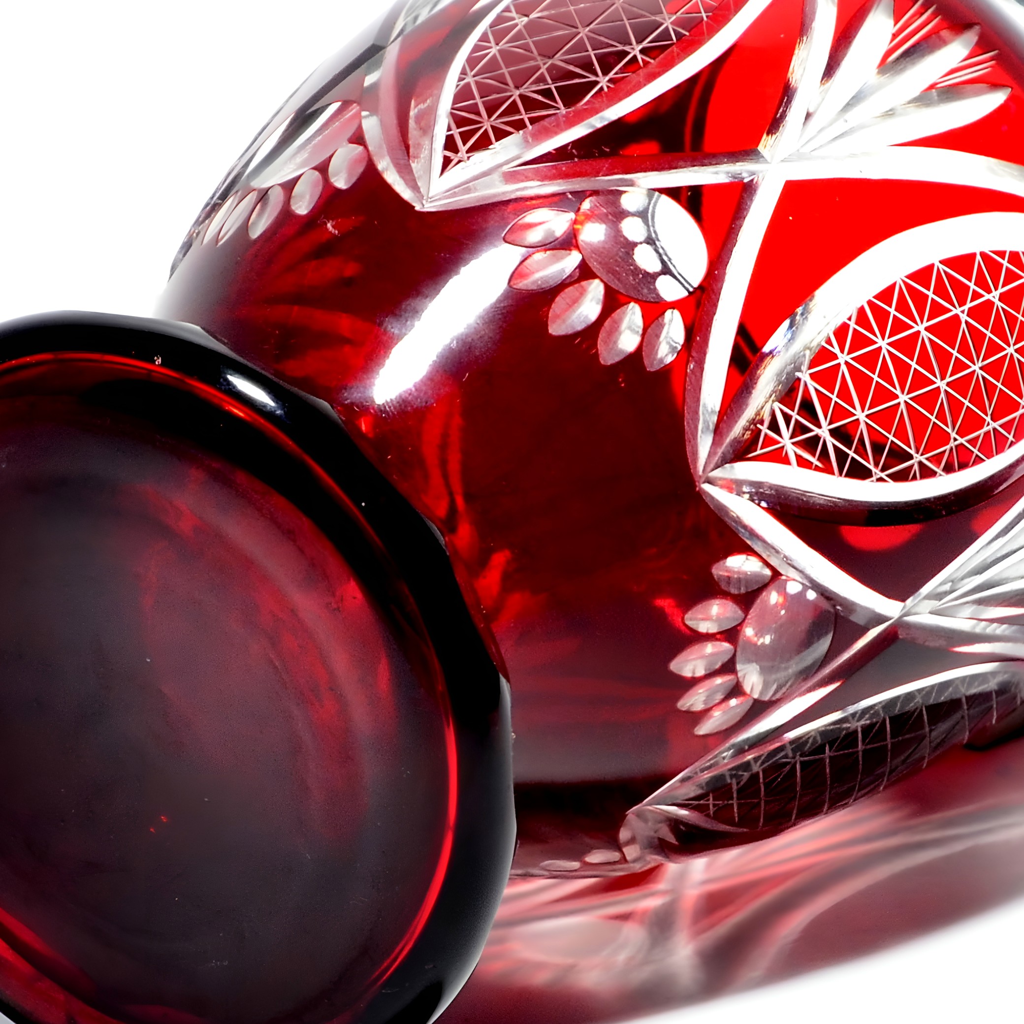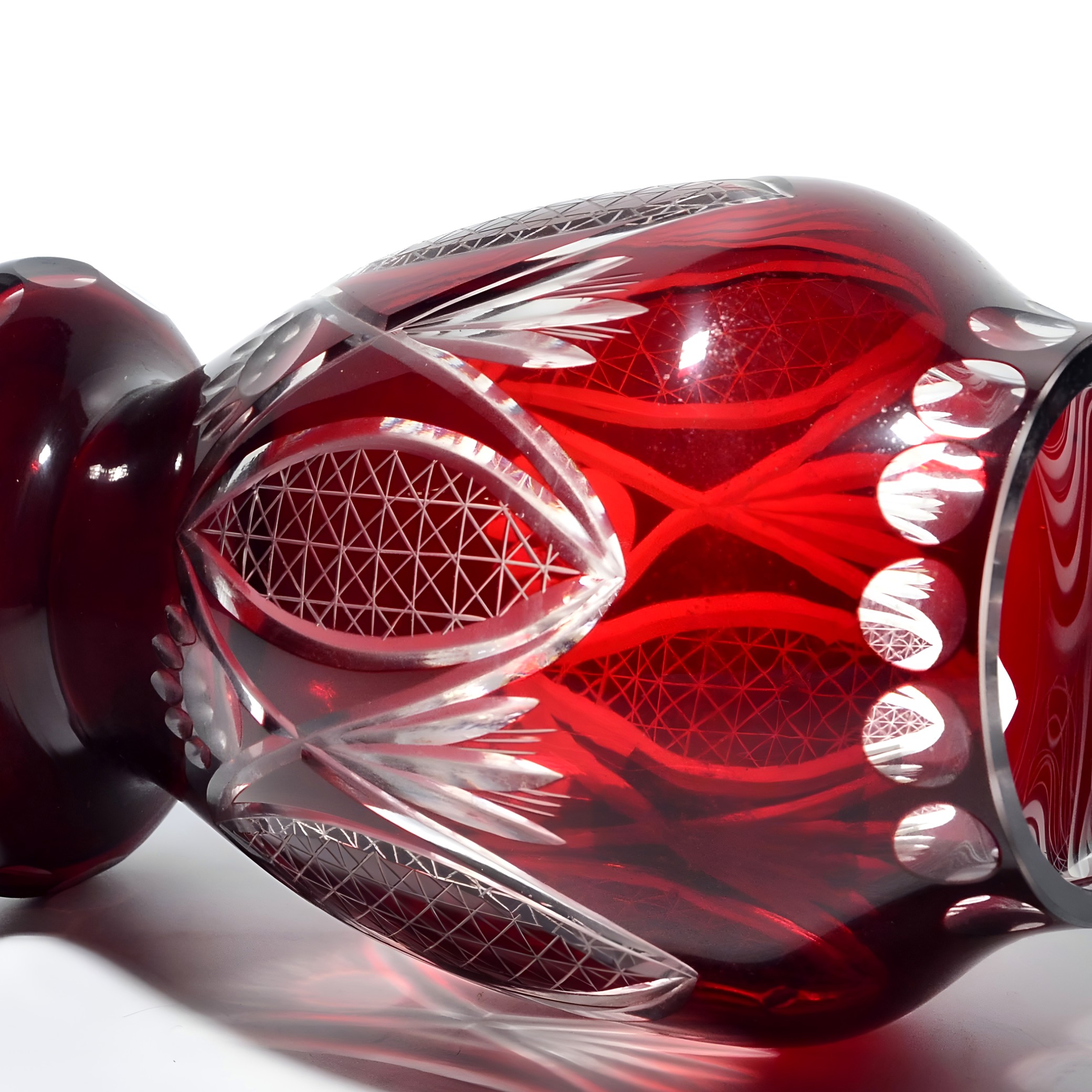 Der erste Blick auf die Vase offenbart ihre tiefe, sattrote Farbe, die sofort die Aufmerksamkeit auf sich zieht. Das Licht spielt förmlich mit den geschnitzten Mustern, die kunstvoll in das Glas integriert sind. Diese Muster sind nicht nur dekorativ, sondern erzählen von der Fertigkeit der Glaskünstler, die in der Lage waren, solch präzise und filigrane Schnitte zu erzeugen. Diese handwerkliche Präzision macht die Vase nicht nur zu einem Ziergegenstand, sondern zu einem Zeugnis einer reichen Tradition der Glasbearbeitung.
