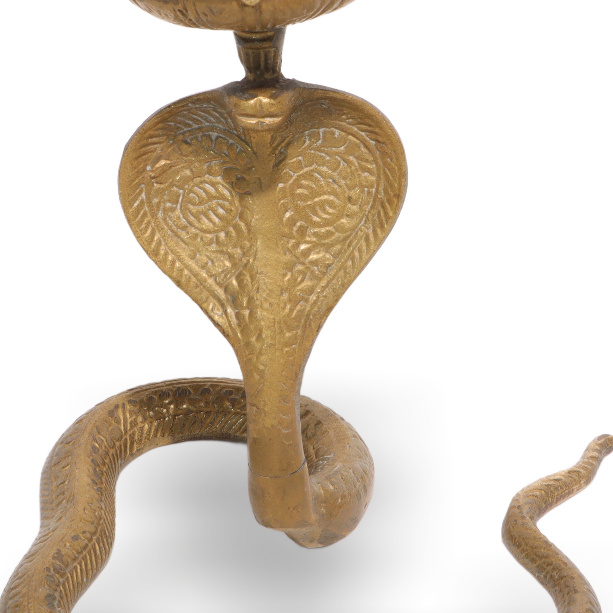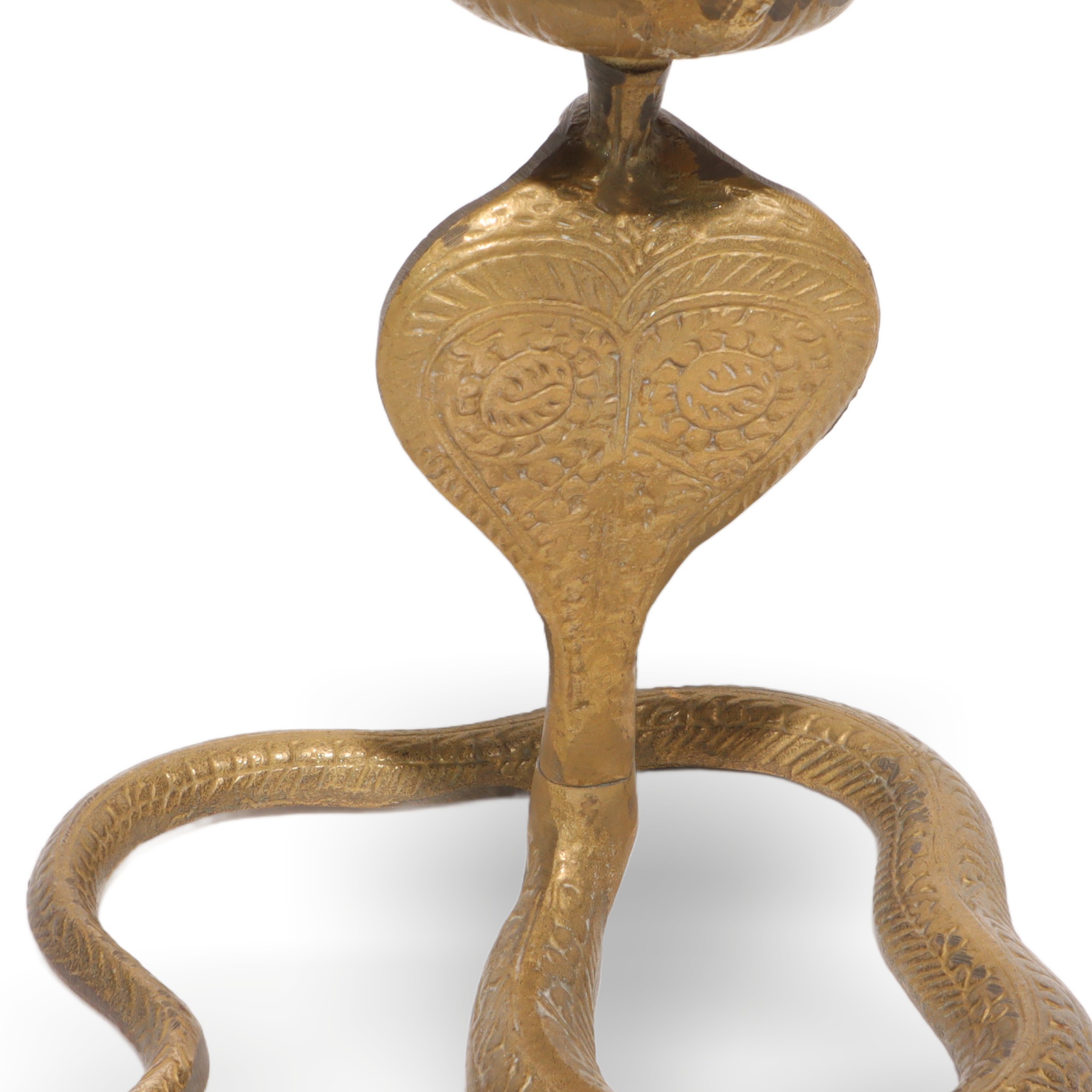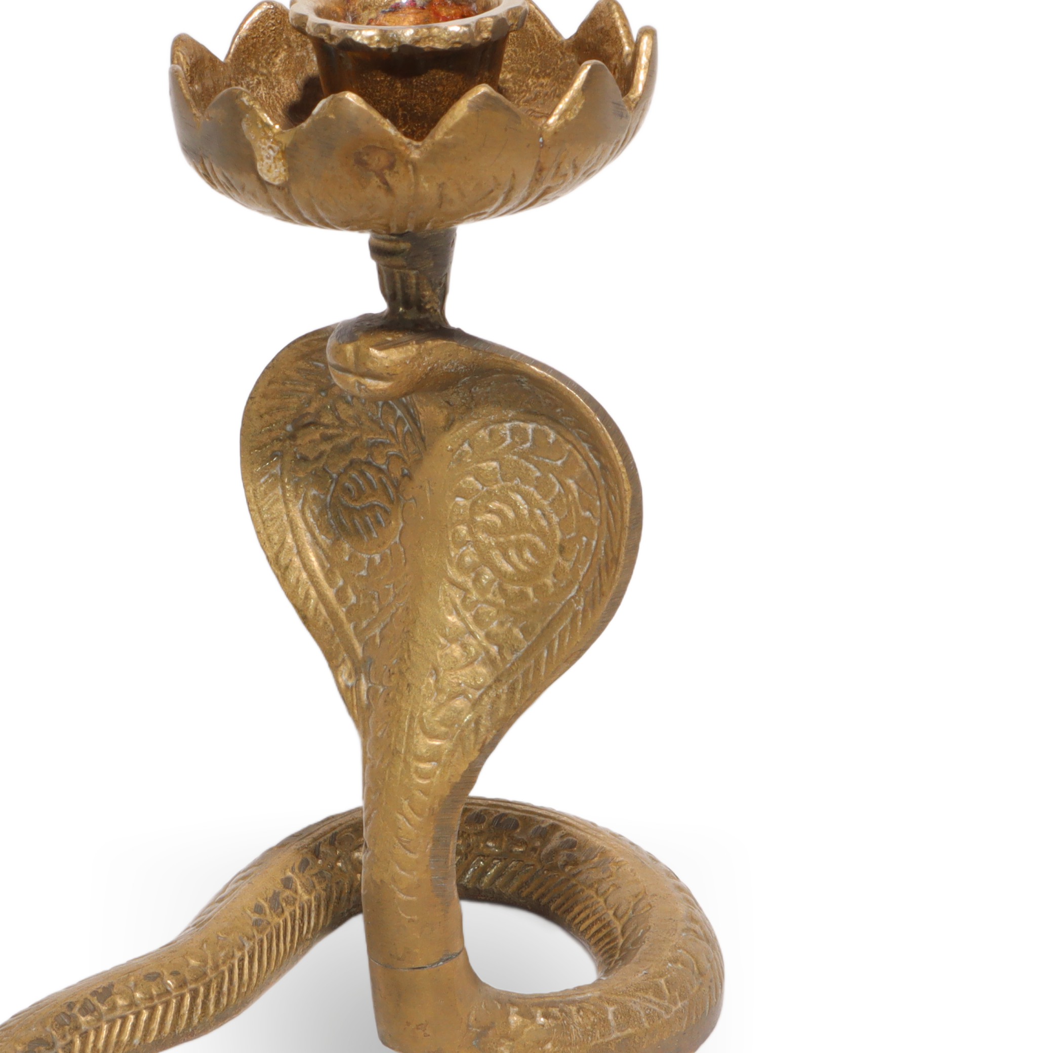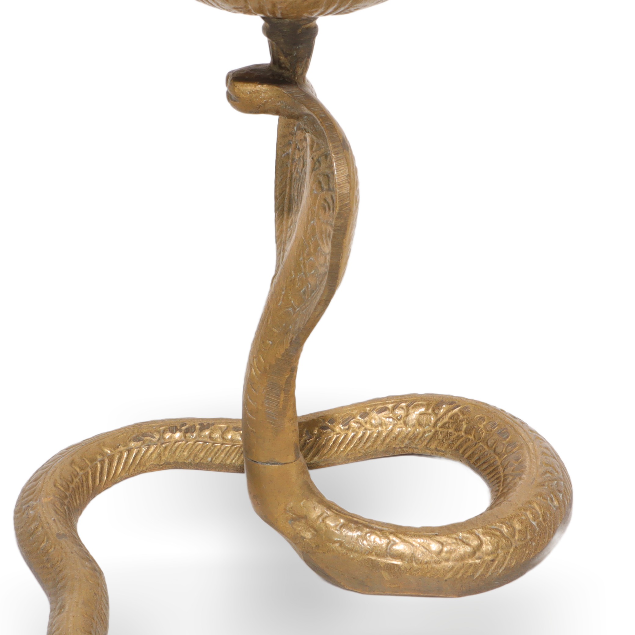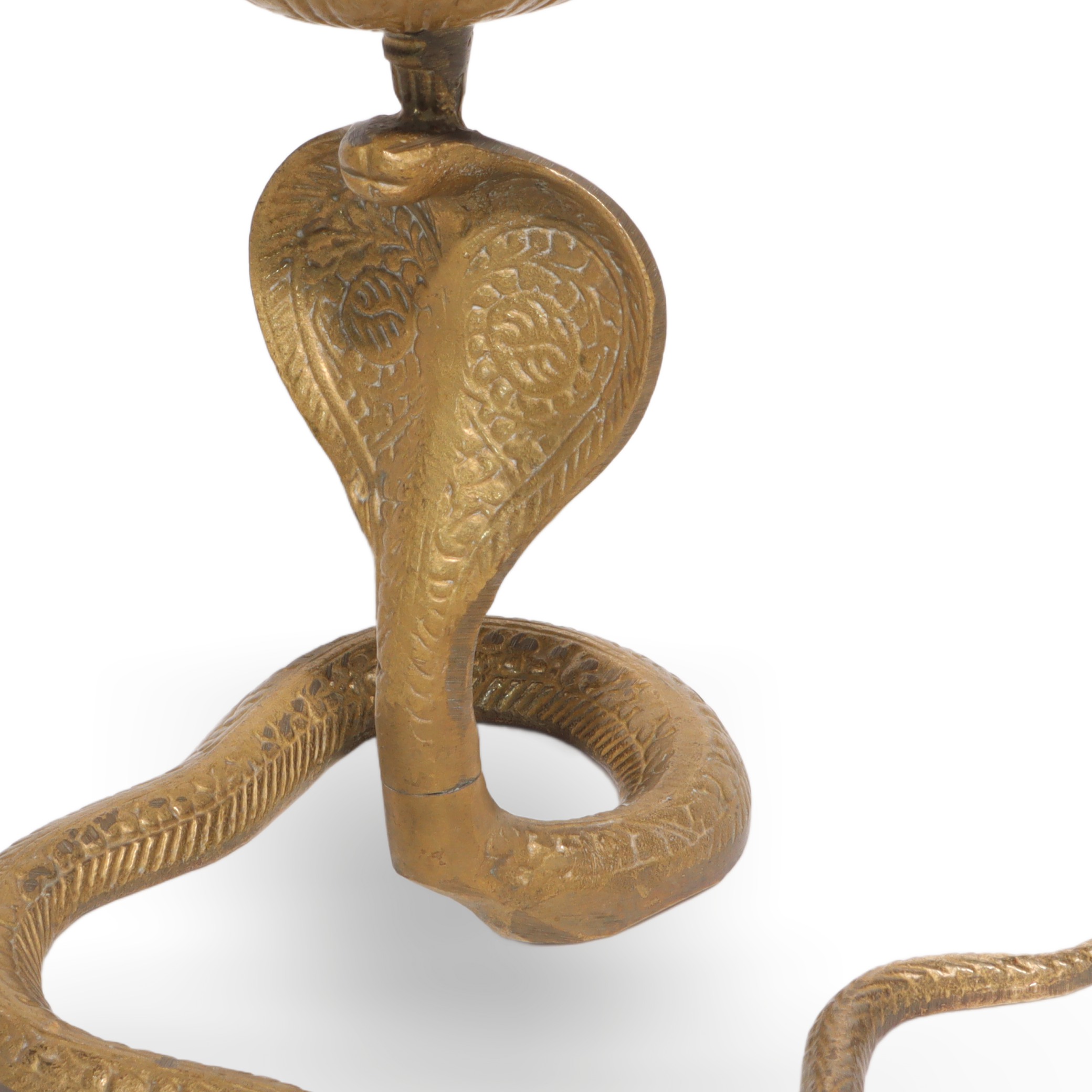 Der Kandelaber dieser Machart eignet sich hervorragend als Geschenk für Kunstliebhaber:innen, aber auch als exquisites Dekorationsobjekt in stilvollen Räumen – egal, ob Retro, Midcentury oder Boho-Chic der Grundton ist. Die Kombination aus der anmutigen, mythischen Formgebung der Kobra und dem schweren, warmen Metall schafft eine Atmosphäre, die gleichzeitig exotisch und zeitlos wirkt.