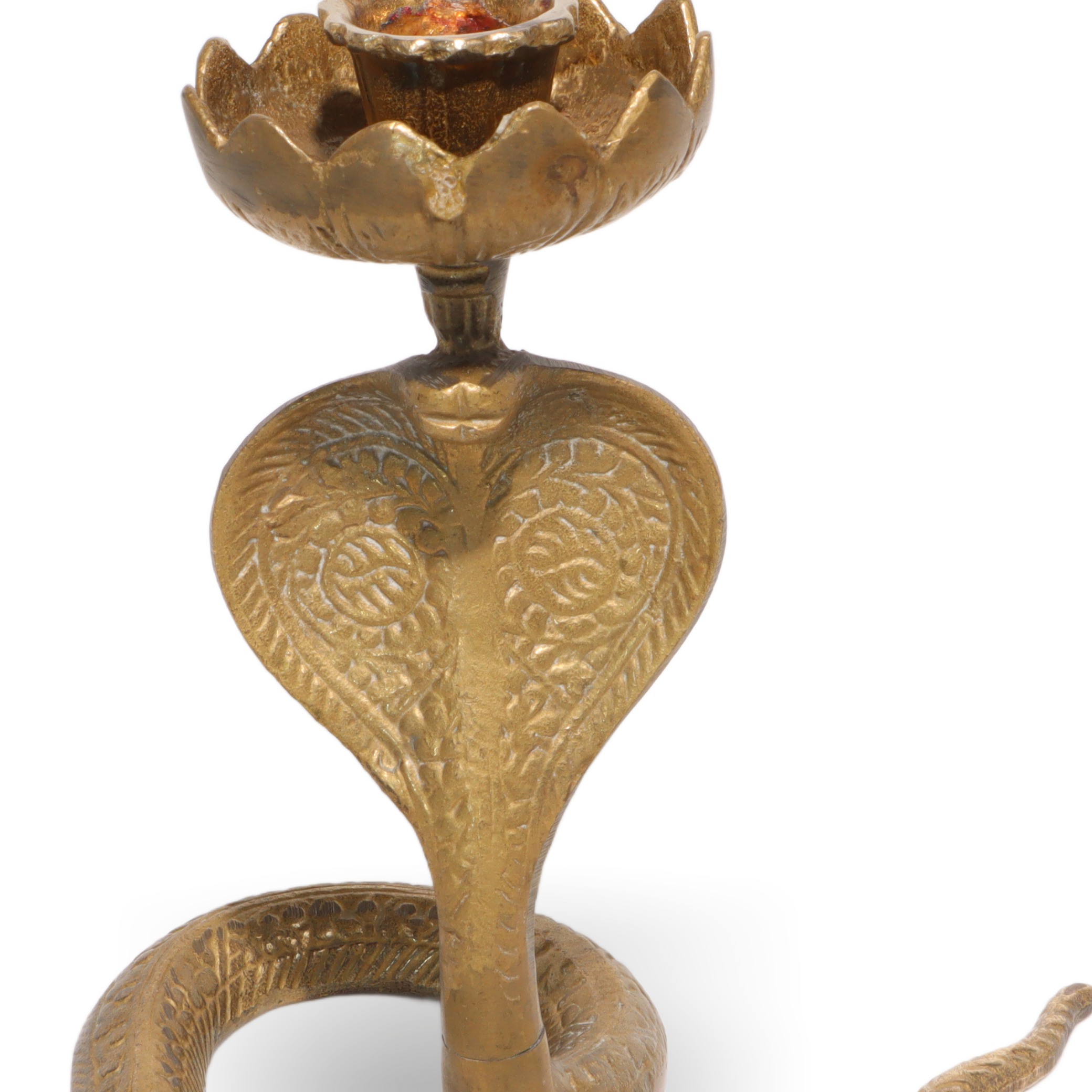 Zur Marke beziehungsweise Fertigung dieses Vintage Kobra Kerzenhalters: Solche Bronzeobjekte wurden in den 1960ern häufig in kleinen Werkstätten von Hand gegossen und bearbeitet. Meistens stammen sie entweder aus dem europäischen Raum (vor allem Italien oder Frankreich) oder aus Indien, wo das Kobra-Motiv besonders beliebt war. Da der Kerzenhalter inzwischen über 60 Jahre alt ist, zählt er definitiv zu den Vintage-Raritäten. Die Tatsache, dass dieses Exemplar nahezu neuwertig erhalten ist, macht es besonders wertvoll für Sammler:innen, denn die meisten sind entweder stärker patiniert oder wiesen schon in den Achtzigern Gebrauchsspuren auf.