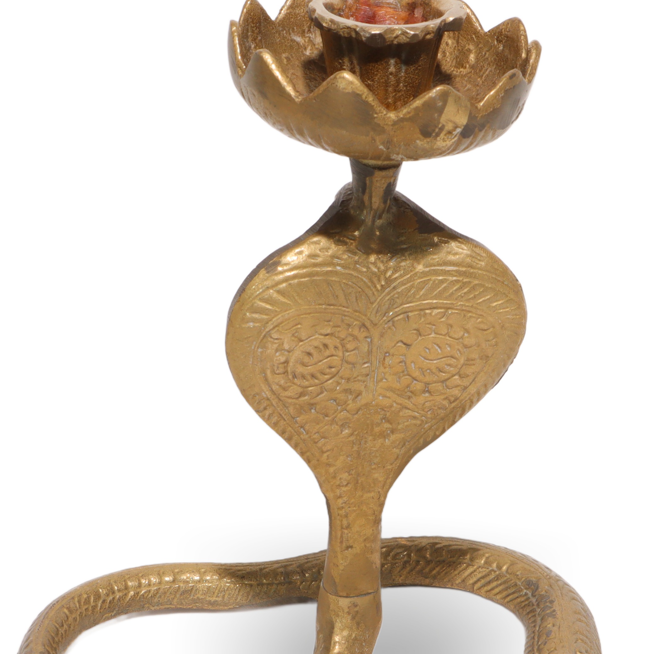 Du siehst hier ein außergewöhnliches Sammlerstück: Einen Bronze Snake Kandelaber, besser bekannt als Vintage Kobra Kerzenhalter, gefertigt im Jahr 1960. Das Design dieses edlen Kerzenhalters ist ein herausragendes Beispiel für die künstlerische Handwerkskunst jener Zeit. Direkt ins Auge sticht die detaillierte Darstellung einer sich aufrichtenden Kobra, deren Körper sich elegant windet und einen stabilen Sockel bildet. Die filigranen Ornamente auf dem bronze-goldenen Körper, die kunstvoll eingravierten Schuppen sowie das fein gearbeitete Geflecht des Halses – all das zeugt von exzellenter, traditioneller Metallbearbeitung.