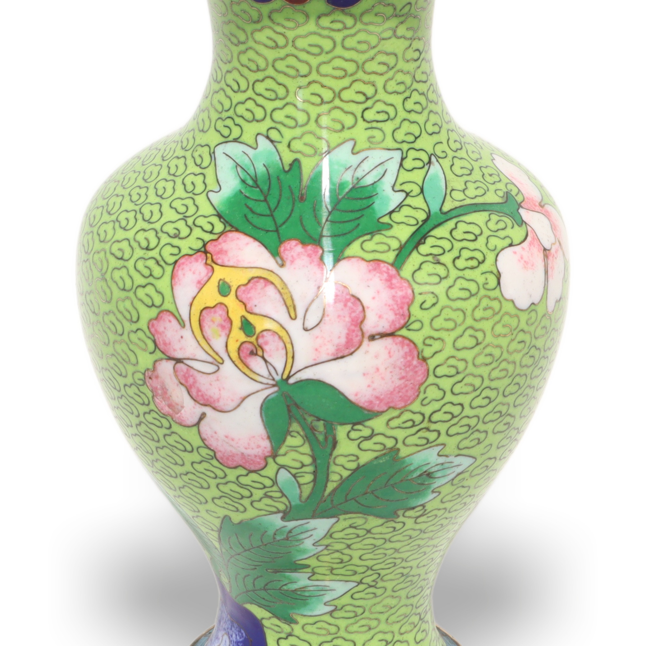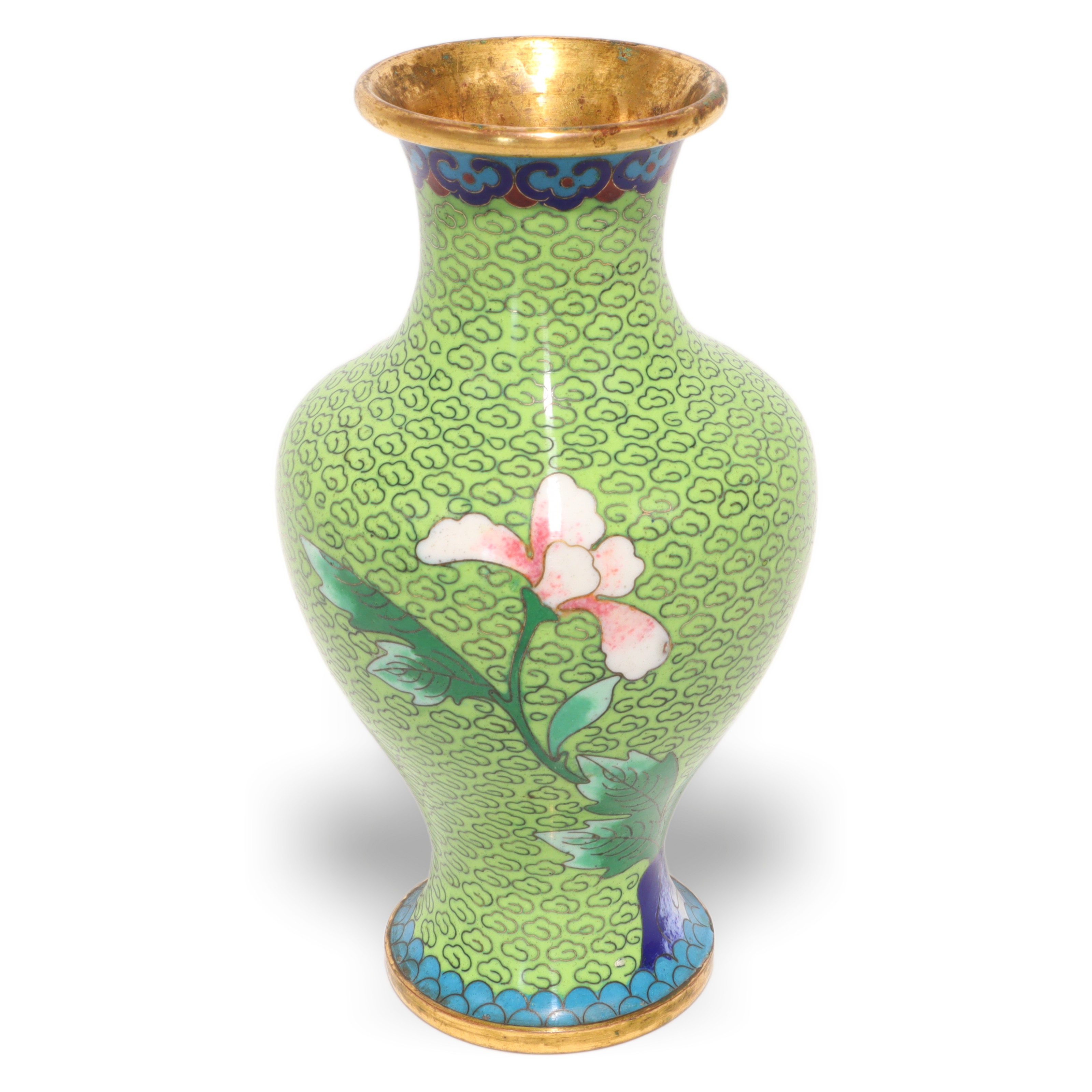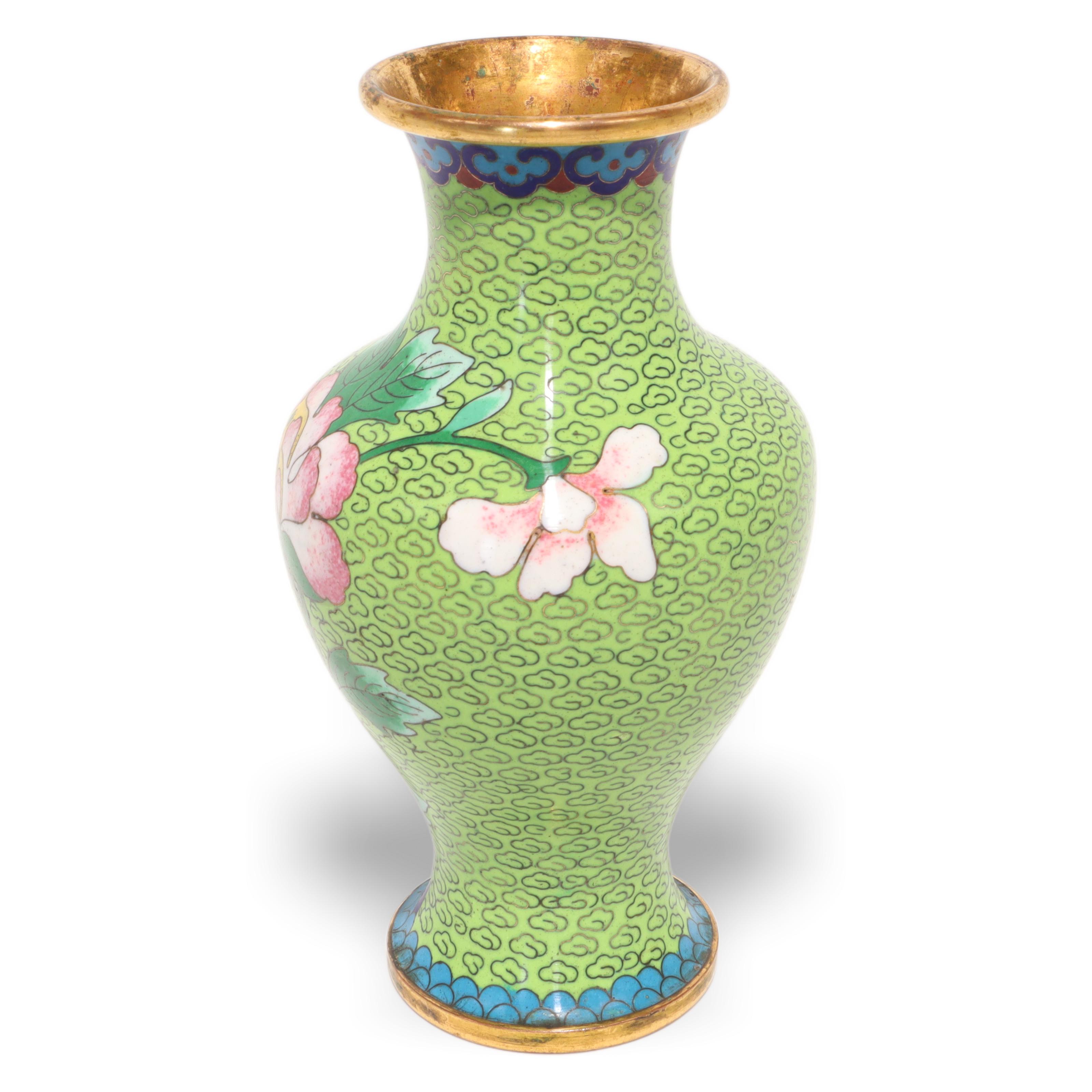 Das Highlight dieser Vase ist ihr lebendiges, grünes Glasuremail, das als Hintergrund für das üppige Blumenmotiv dient. Die Oberfläche ist mit feinen, goldfarbenen Messingdrähten durchzogen, die detailliert die Konturen der filigran gestalteten Blüten und Blätter nachzeichnen. Die Technik nennt sich Cloisonné und ist eine uralte Kunstform aus China, bei der Emaillepulver in kleine, durch Metallstege abgegrenzte Felder (Cloisons) eingearbeitet und anschließend gebrannt wird. Das Ergebnis ist ein prächtiges Farbenspiel, das hier ganz besonders durch das Zusammenspiel von zartem Rosa, kräftigem Grün und betontem Gold zur Geltung kommt.