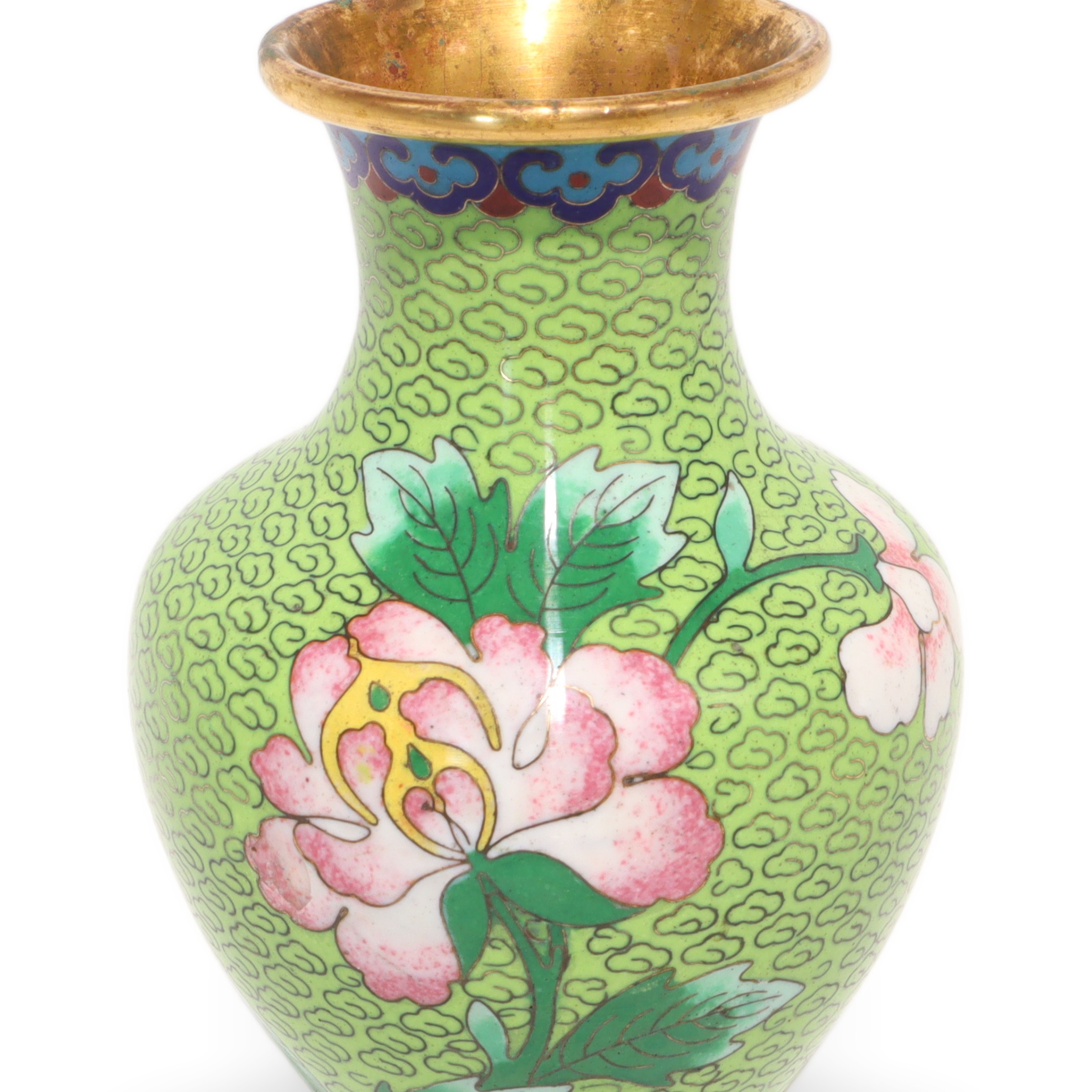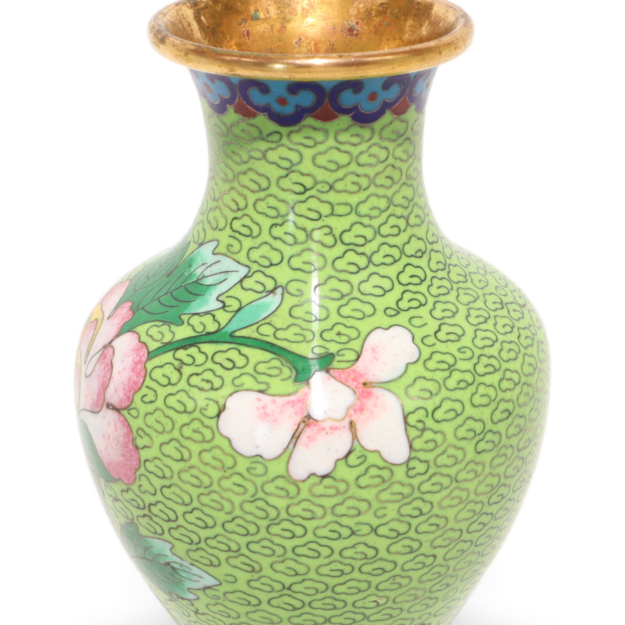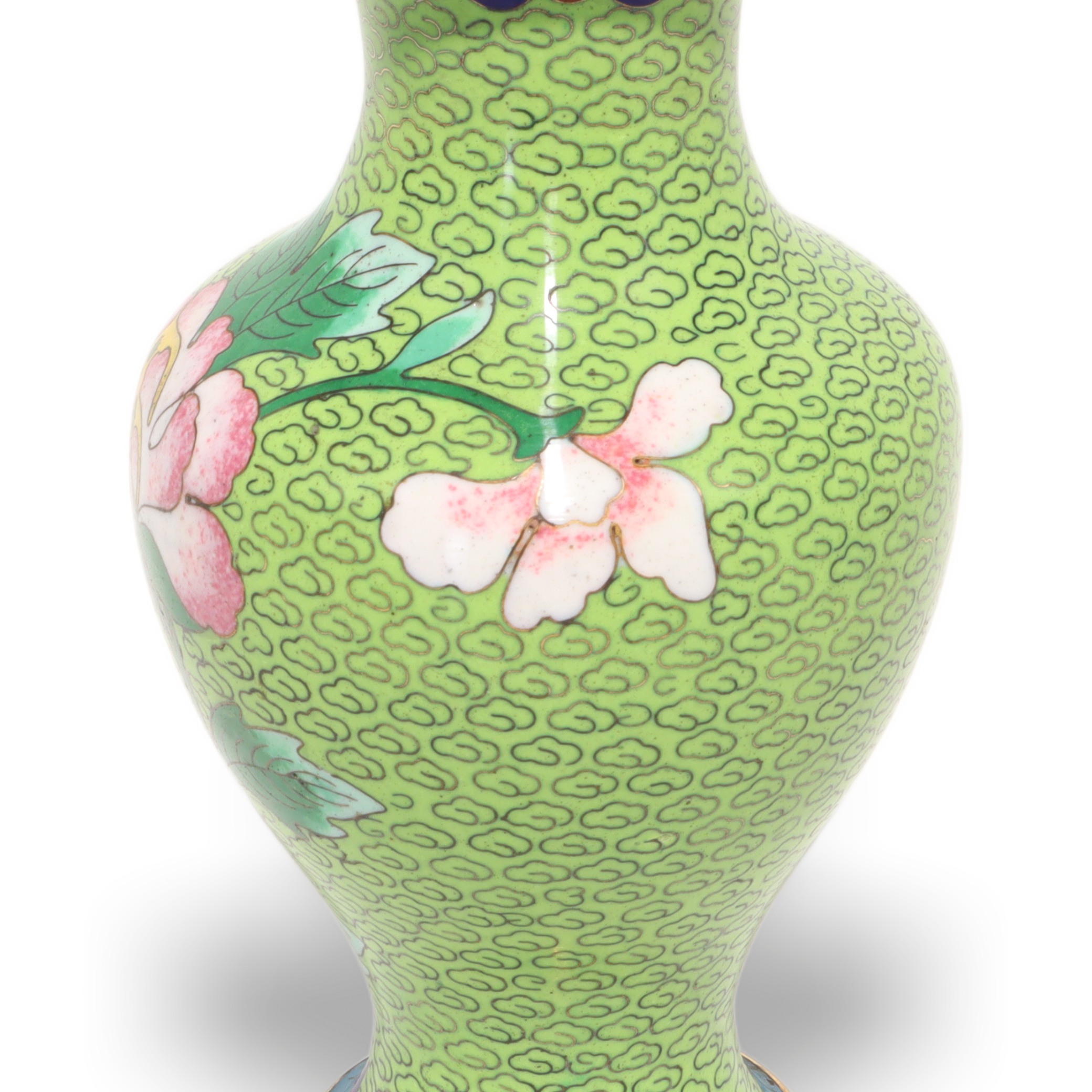 Das Highlight dieser Vase ist ihr lebendiges, grünes Glasuremail, das als Hintergrund für das üppige Blumenmotiv dient. Die Oberfläche ist mit feinen, goldfarbenen Messingdrähten durchzogen, die detailliert die Konturen der filigran gestalteten Blüten und Blätter nachzeichnen. Die Technik nennt sich Cloisonné und ist eine uralte Kunstform aus China, bei der Emaillepulver in kleine, durch Metallstege abgegrenzte Felder (Cloisons) eingearbeitet und anschließend gebrannt wird. Das Ergebnis ist ein prächtiges Farbenspiel, das hier ganz besonders durch das Zusammenspiel von zartem Rosa, kräftigem Grün und betontem Gold zur Geltung kommt.