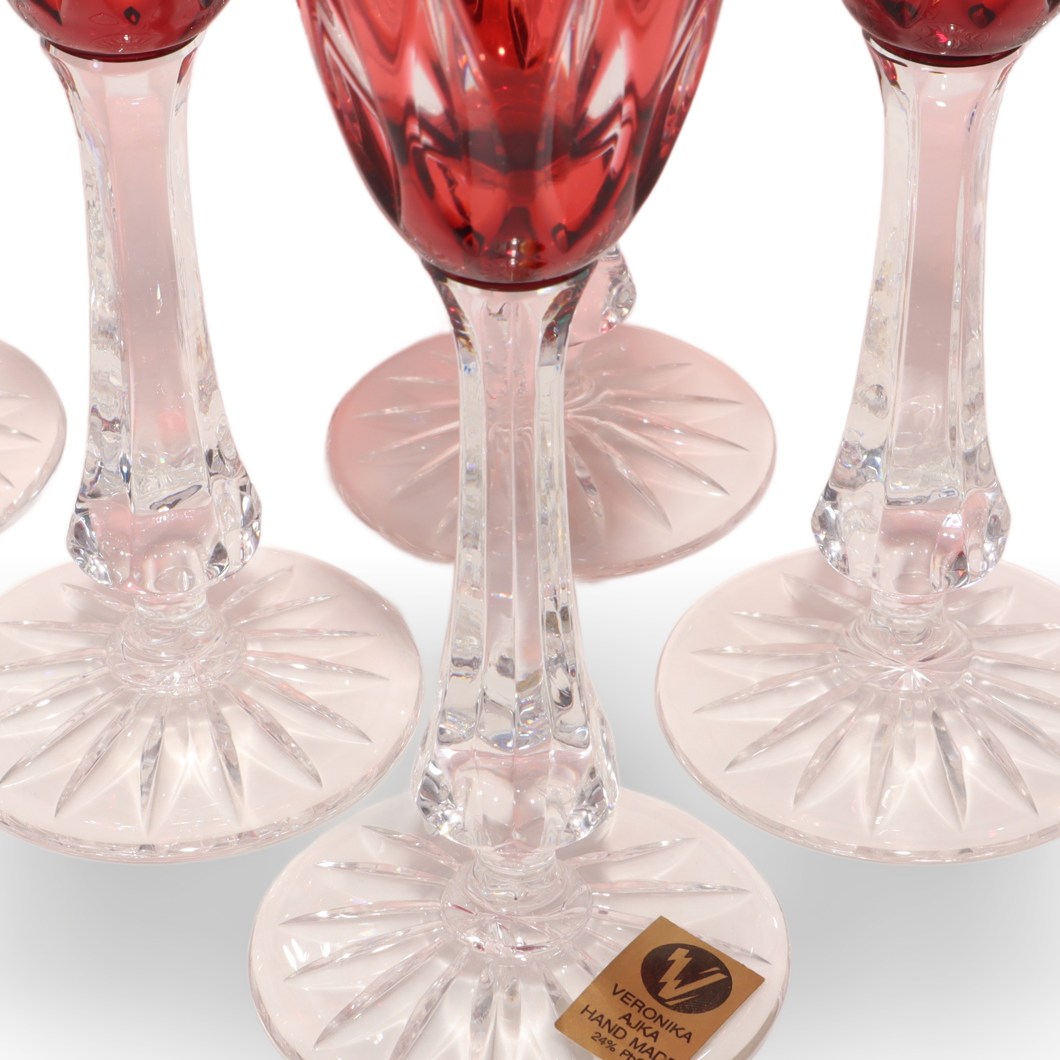 Hier hast du ein wahrhaft außergewöhnliches Set vor dir: Handgeschliffene Kristall-Champagnergläser – Set aus sechs – Ajka – Ungarn – aus dem Jahr 1970. Schon beim ersten Blick springt die intensive, rubinrote Farbe der Kelche ins Auge. Das tiefrote Kristallglas fängt das Licht auf beeindruckende Weise ein und lässt jeden Anlass noch ein wenig festlicher wirken. Die Gläser zeichnen sich durch ihren eleganten, schlanken Körper aus, der nahtlos in einen klaren, kunstvoll geschliffenen Stiel übergeht. Der Fuß jedes Glases ist sternförmig geschliffen, was dem Ganzen einen wunderbaren Glanz und zusätzlich Grip verleiht. Mit einer Höhe von 25 cm und einem Durchmesser von 5 cm wirken diese Gläser gleichermaßen majestätisch wie fein; sie liegen schwer und angenehm in der Hand – ein klares Indiz für höchste Handwerkskunst.