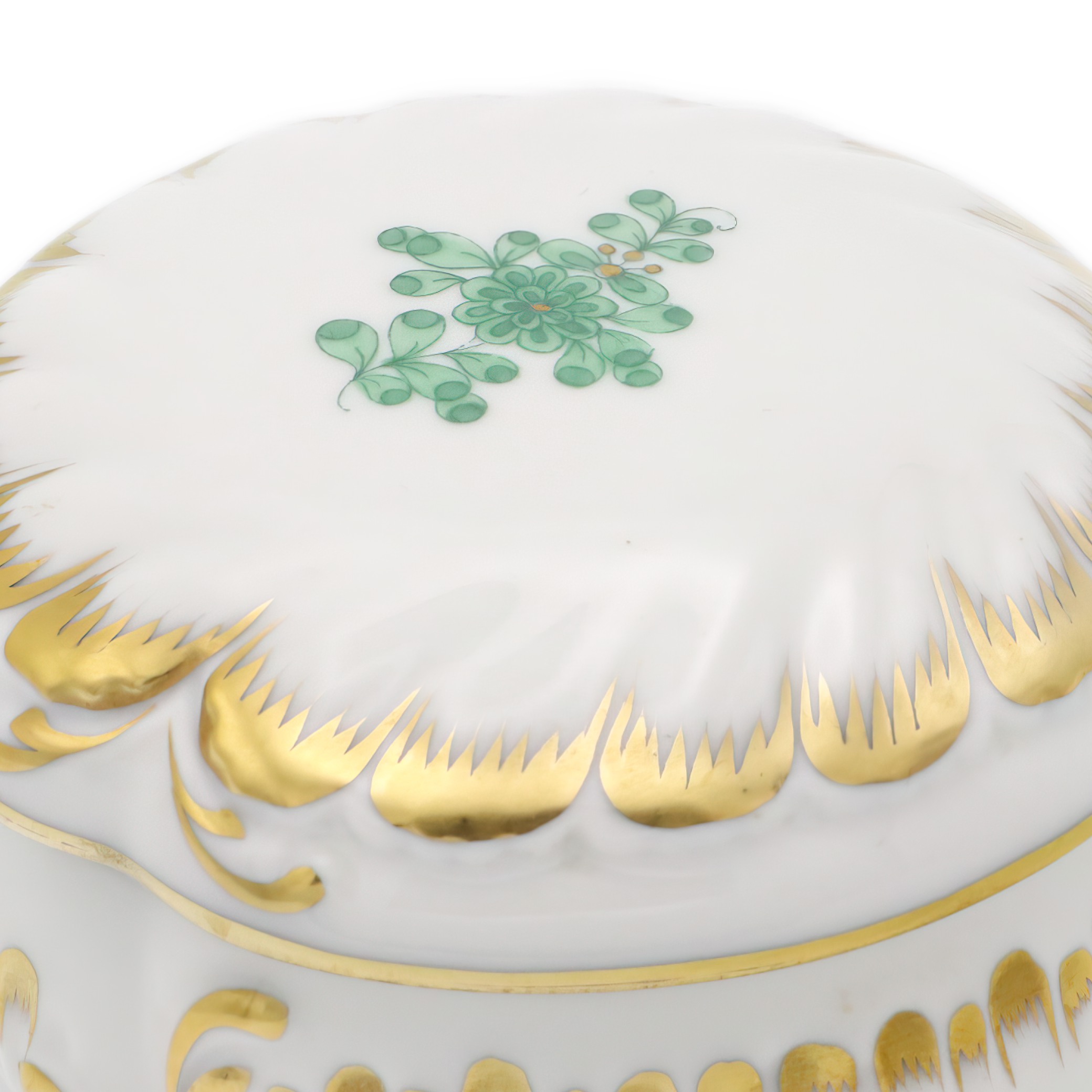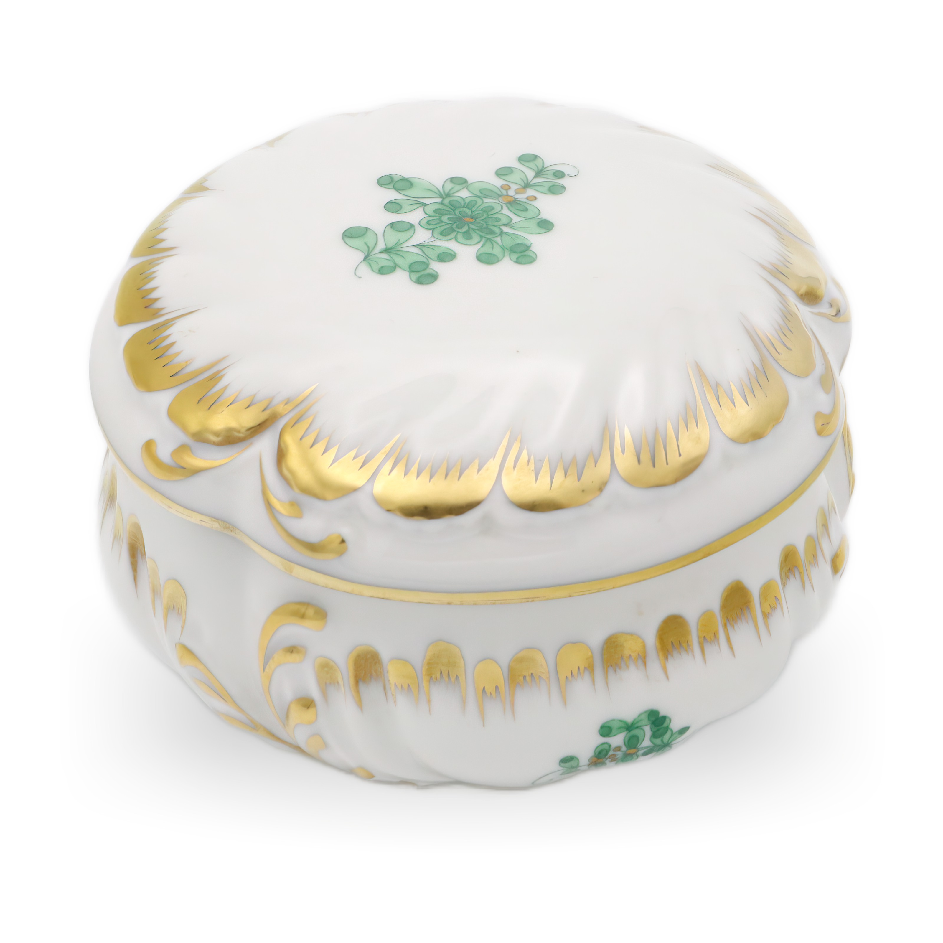 Die Schmuckdosen dieser Zeit, besonders aus den 1940er Jahren, gelten heute als ausgesprochene Raritäten, da viele Stücke im Laufe der Jahrzehnte schlicht verloren gegangen oder in privaten Sammlungen verschwunden sind. Das klassische Grün-Gold-Dekor gehört zu den beliebtesten und bekanntesten Mustern von Herend, das bereits seit dem 19. Jahrhundert für höfische Tafeln und als exklusives Geschenk verwendet wurde. Mit einem Alter von über acht Jahrzehnten und in fast neuwertigem Zustand ist diese Herend Schmuckdose ein echtes Liebhaberstück, das die Eleganz und das meisterhafte Handwerk einer vergangenen Ära lebendig erhält.