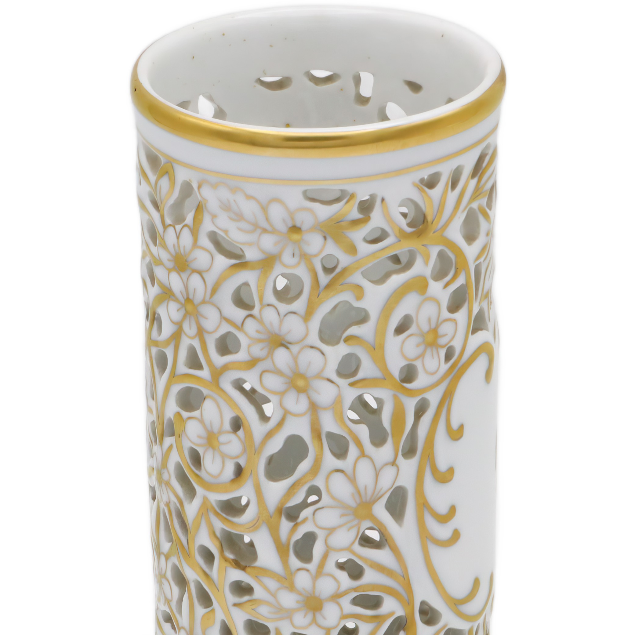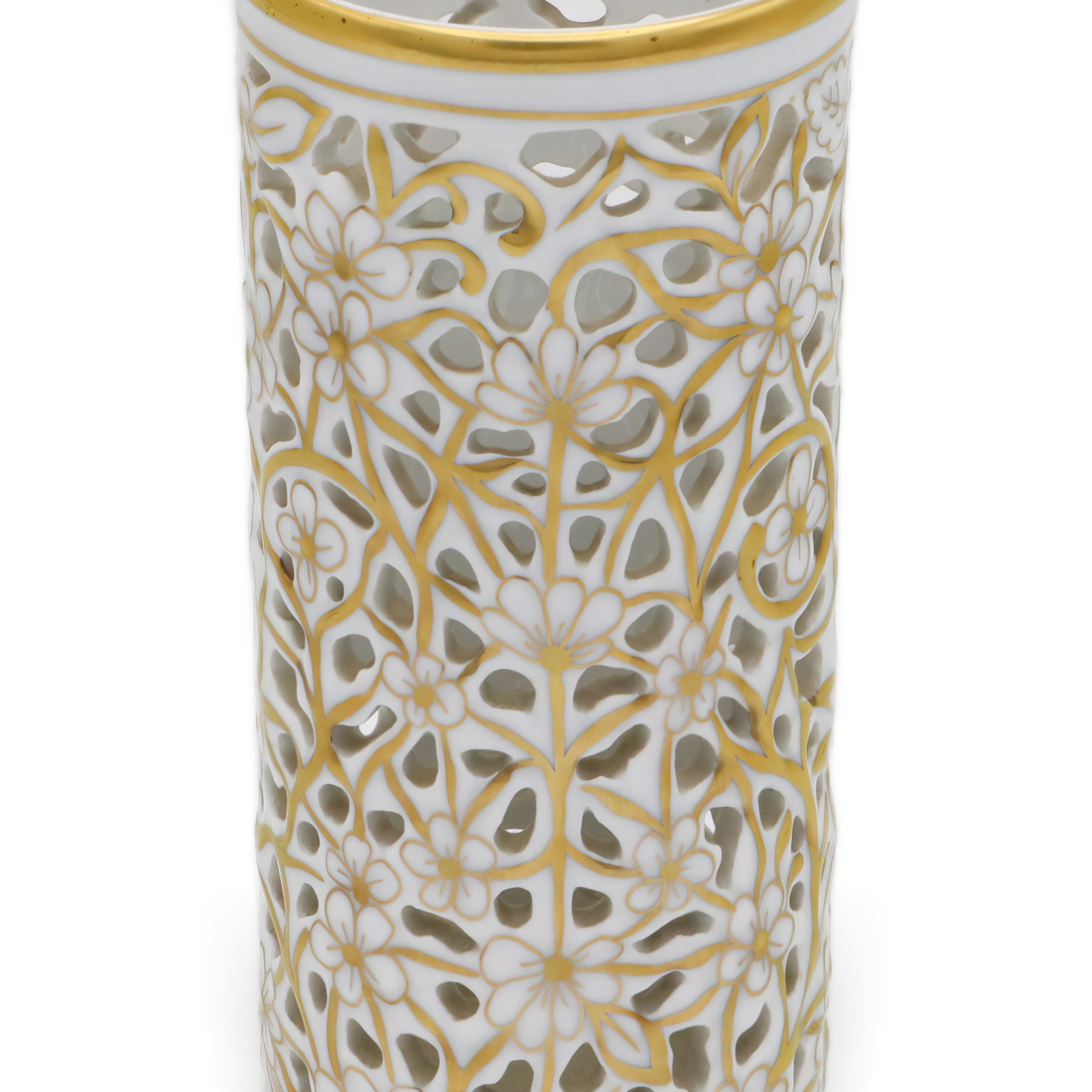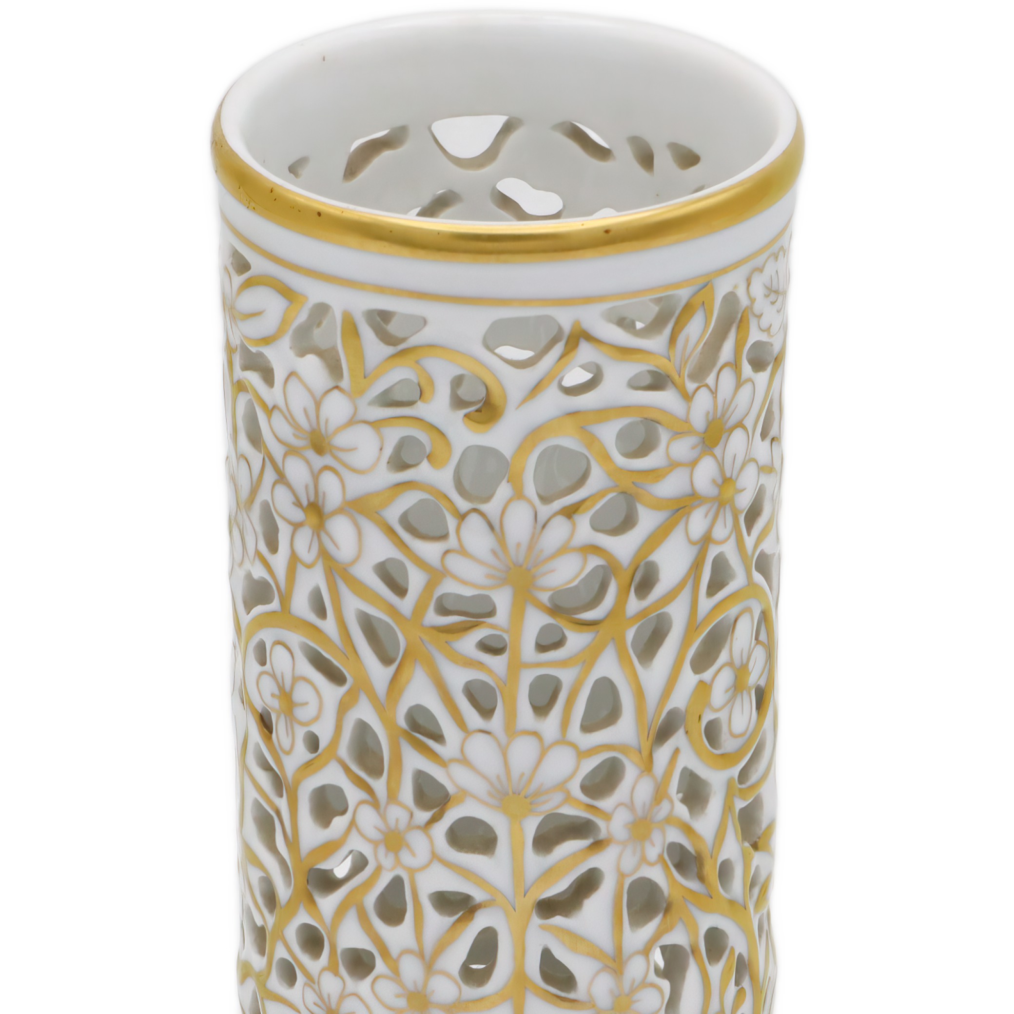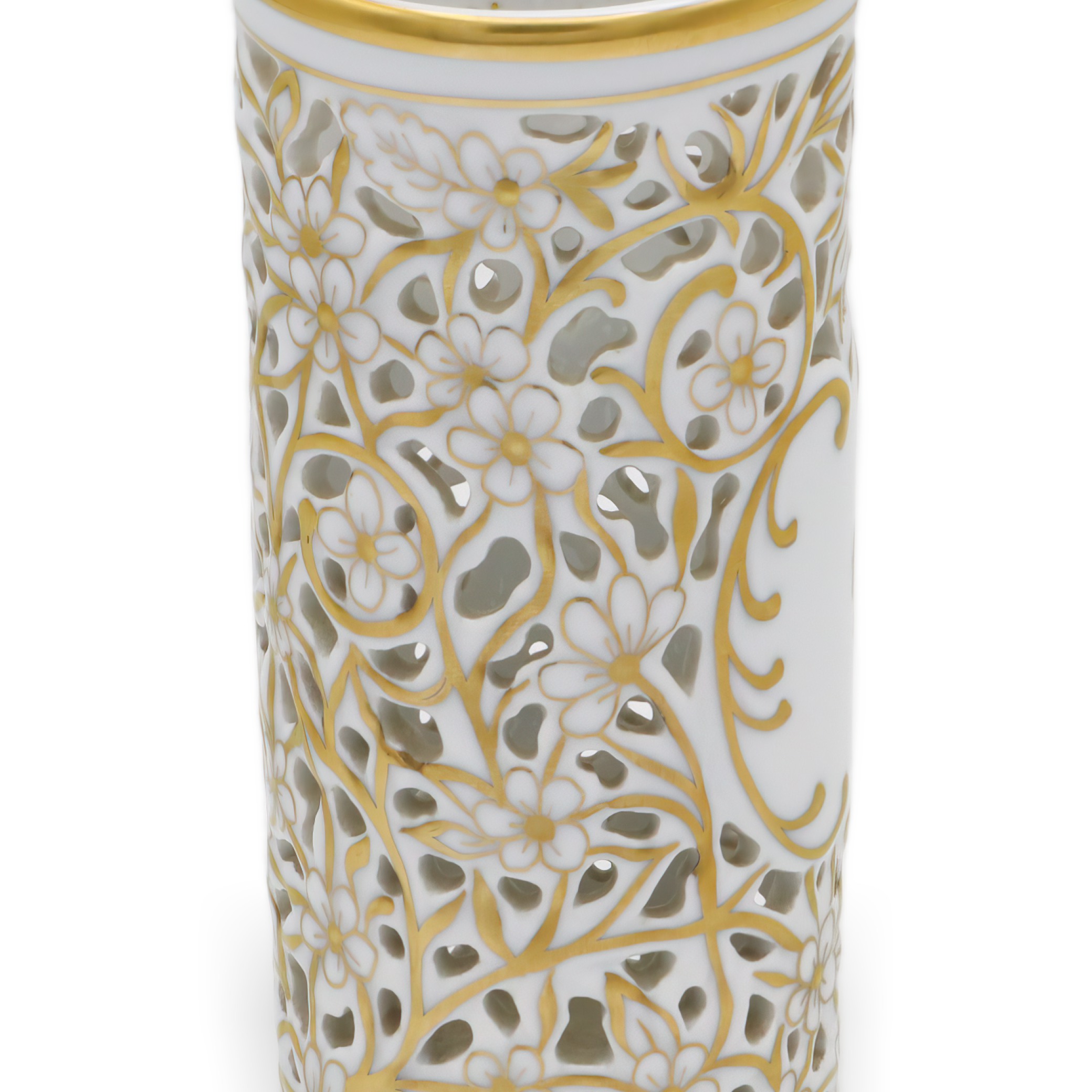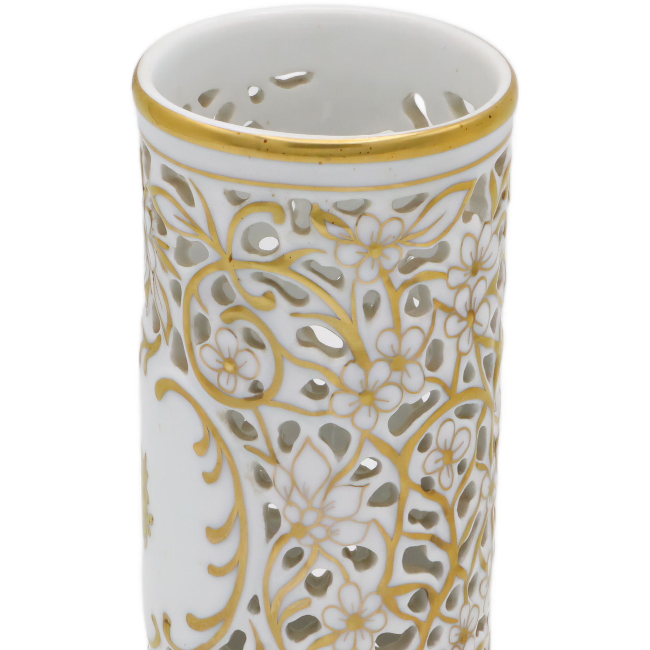 Was dieses Stück wirklich besonders macht, sind die Details: Jede Blüte und jedes Blättchen sind mit äußerster Präzision per Hand gearbeitet. Das goldene Dekor bringt einen Hauch Luxus und hebt den klassischen weißen Scherben wunderschön hervor. Das Muster ist aufwendig ausgearbeitet, viele kleine Durchbrüche machen die Vase fast leicht und filigran. Gleichzeitig ist sie trotz ihrer feinen Gestaltung erstaunlich stabil und steht sicher.