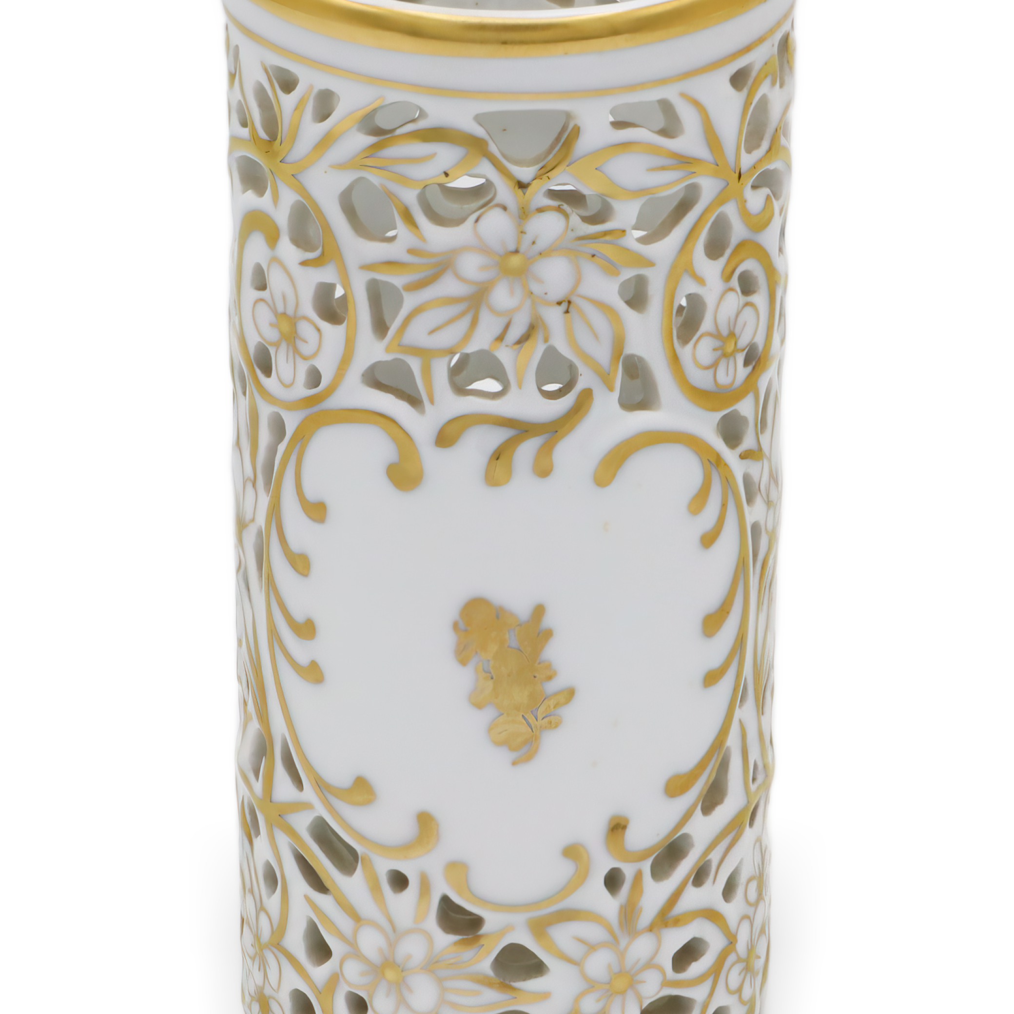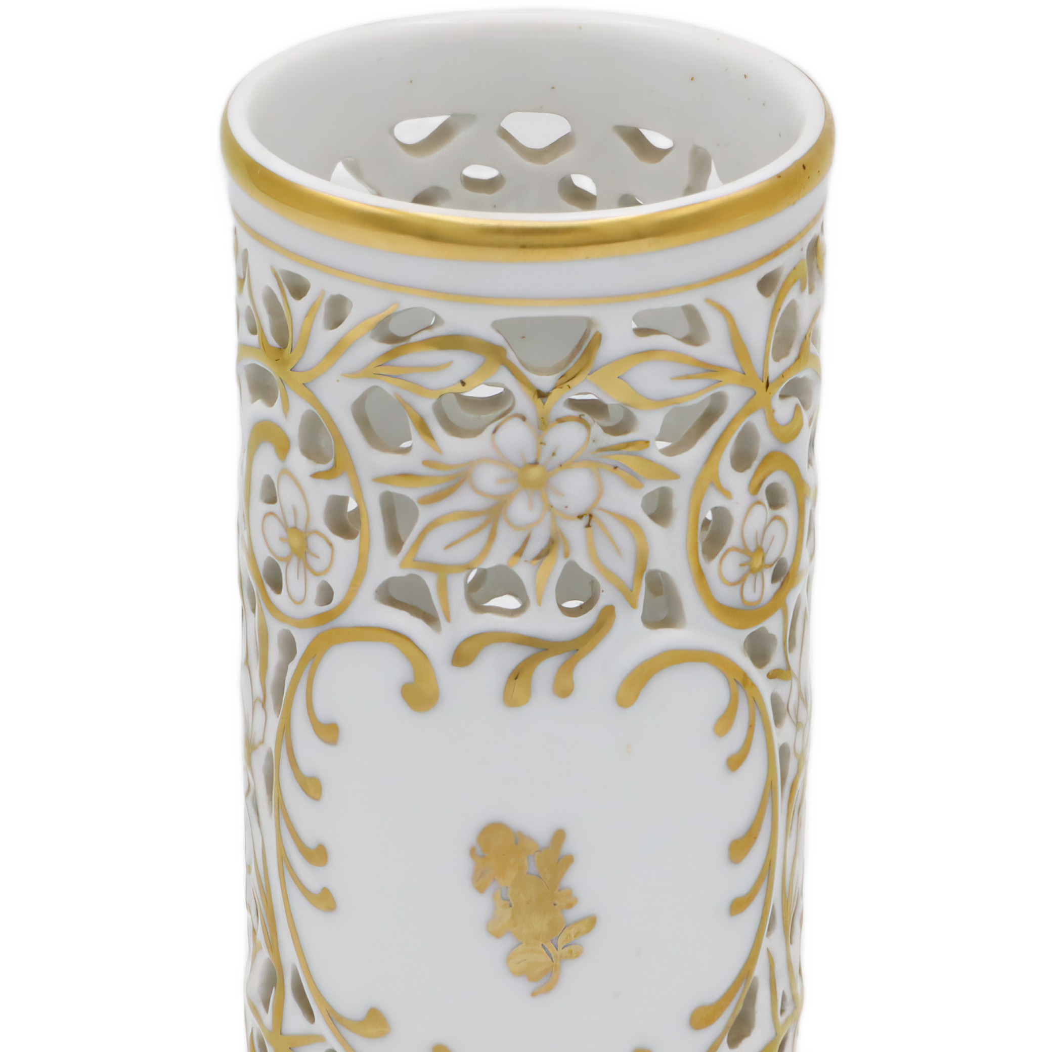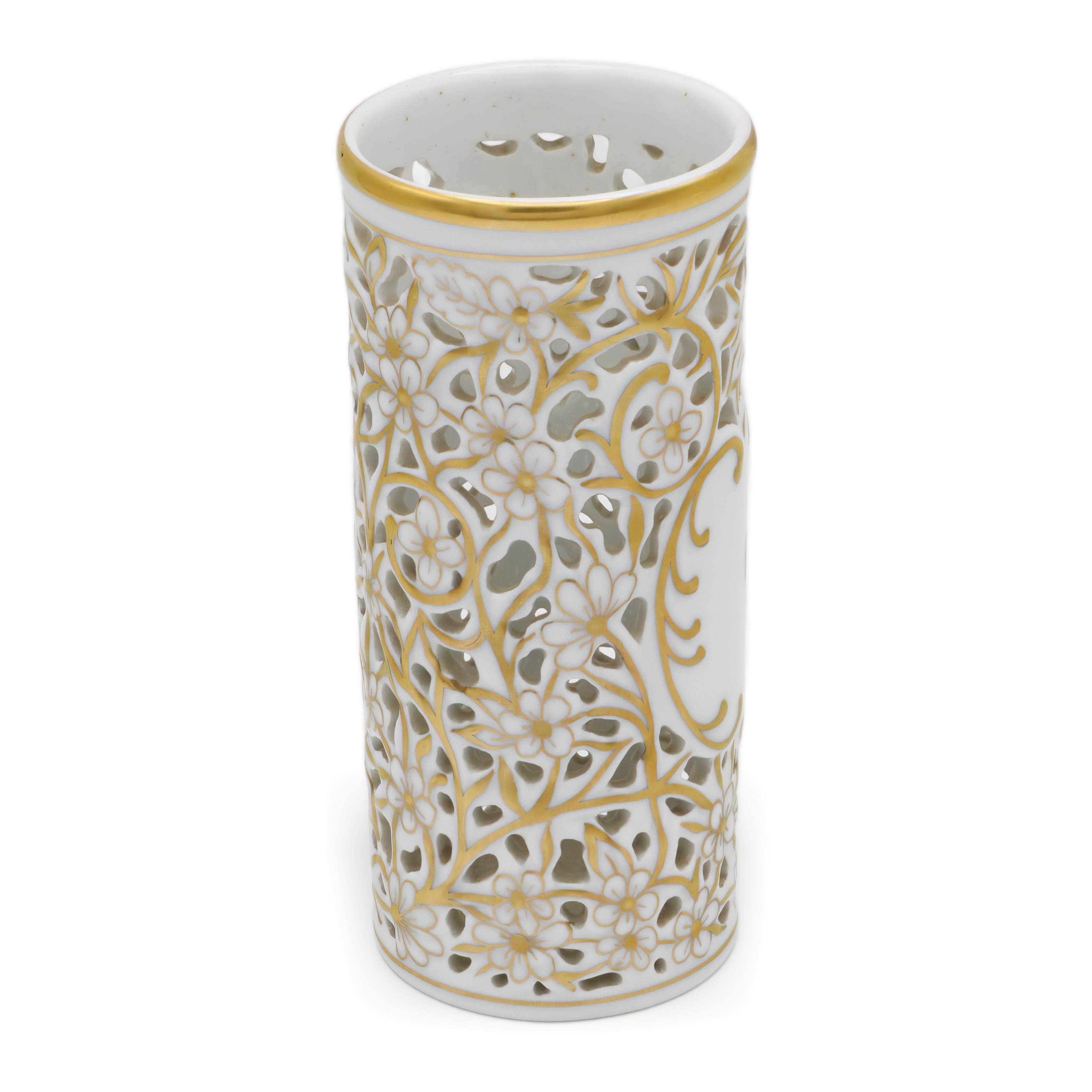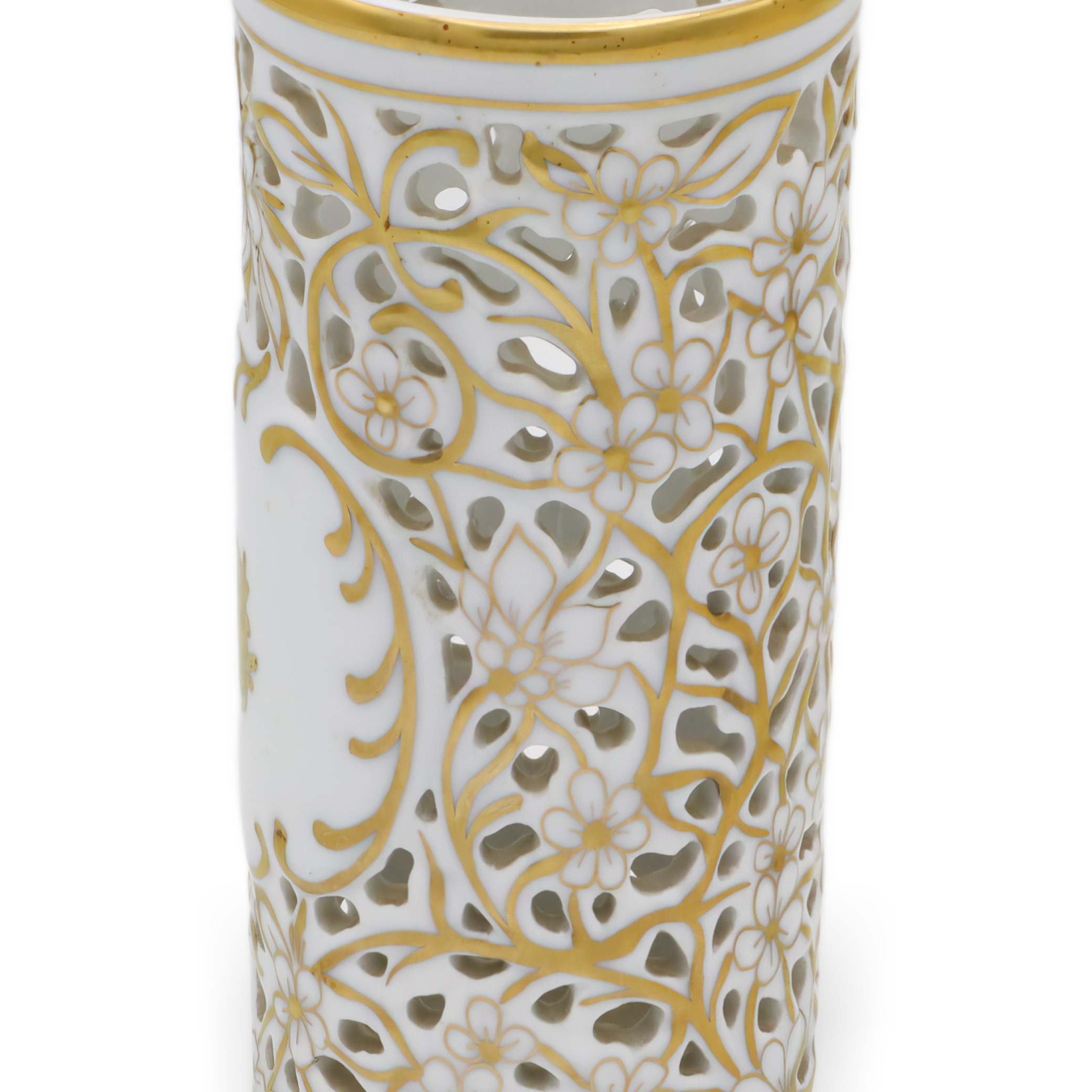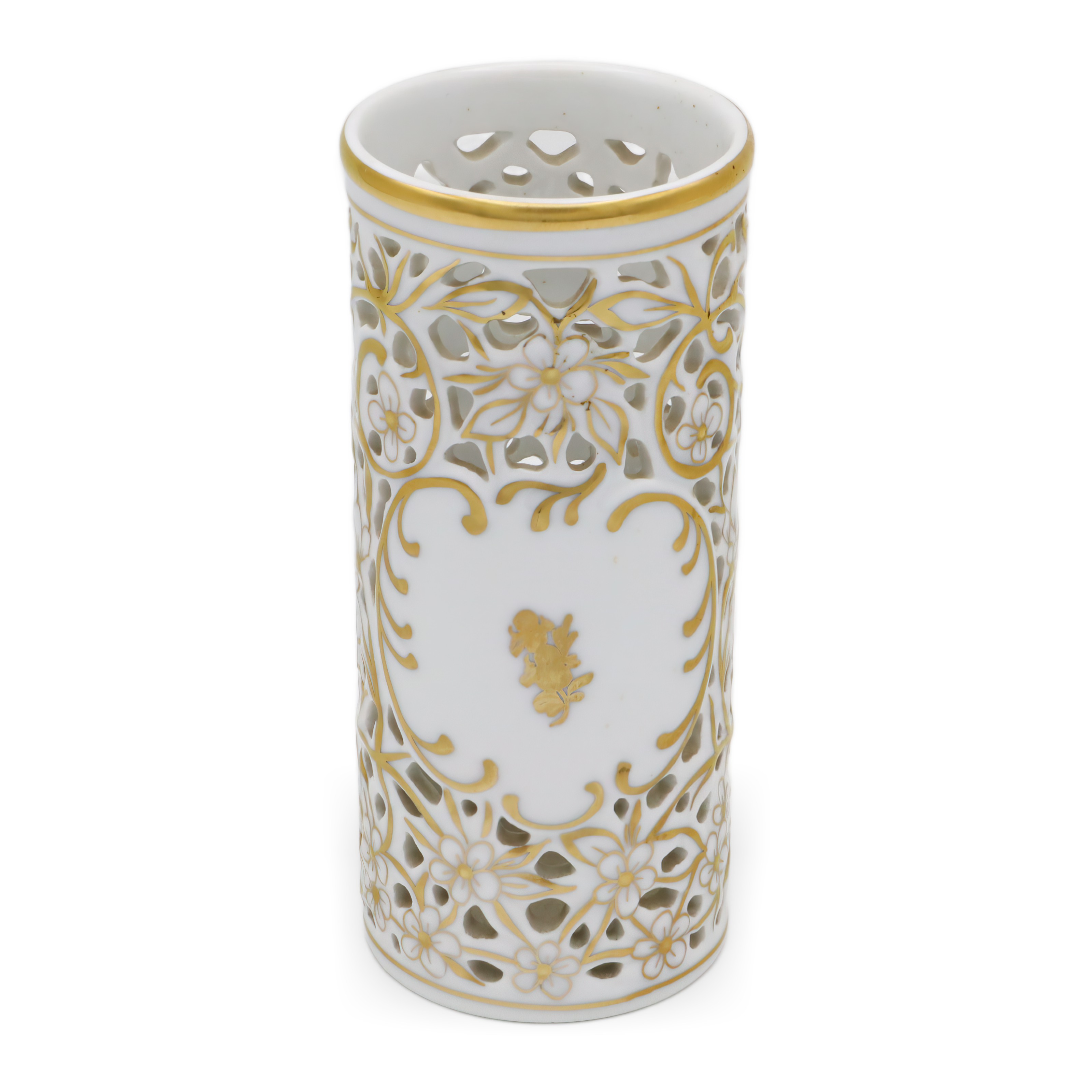 Was dieses Stück wirklich besonders macht, sind die Details: Jede Blüte und jedes Blättchen sind mit äußerster Präzision per Hand gearbeitet. Das goldene Dekor bringt einen Hauch Luxus und hebt den klassischen weißen Scherben wunderschön hervor. Das Muster ist aufwendig ausgearbeitet, viele kleine Durchbrüche machen die Vase fast leicht und filigran. Gleichzeitig ist sie trotz ihrer feinen Gestaltung erstaunlich stabil und steht sicher.
