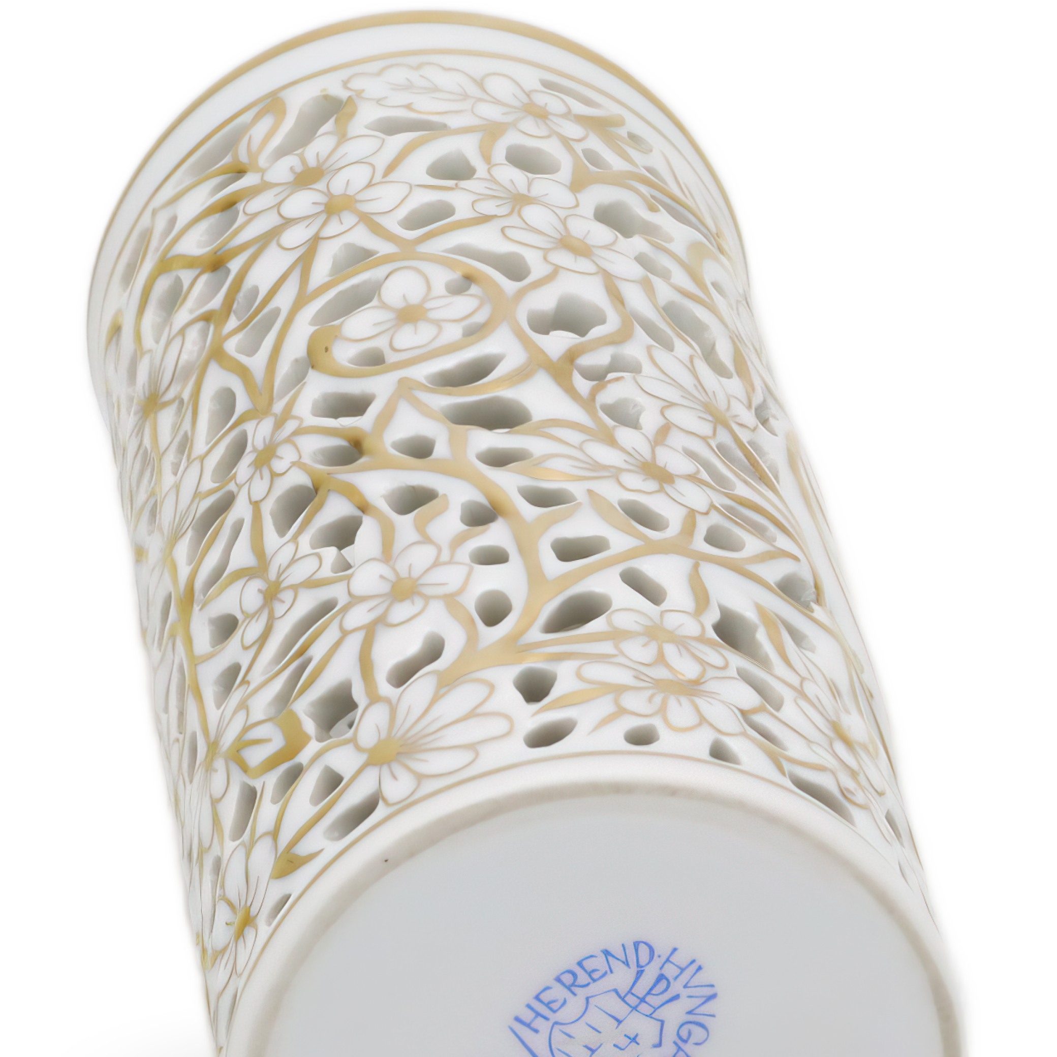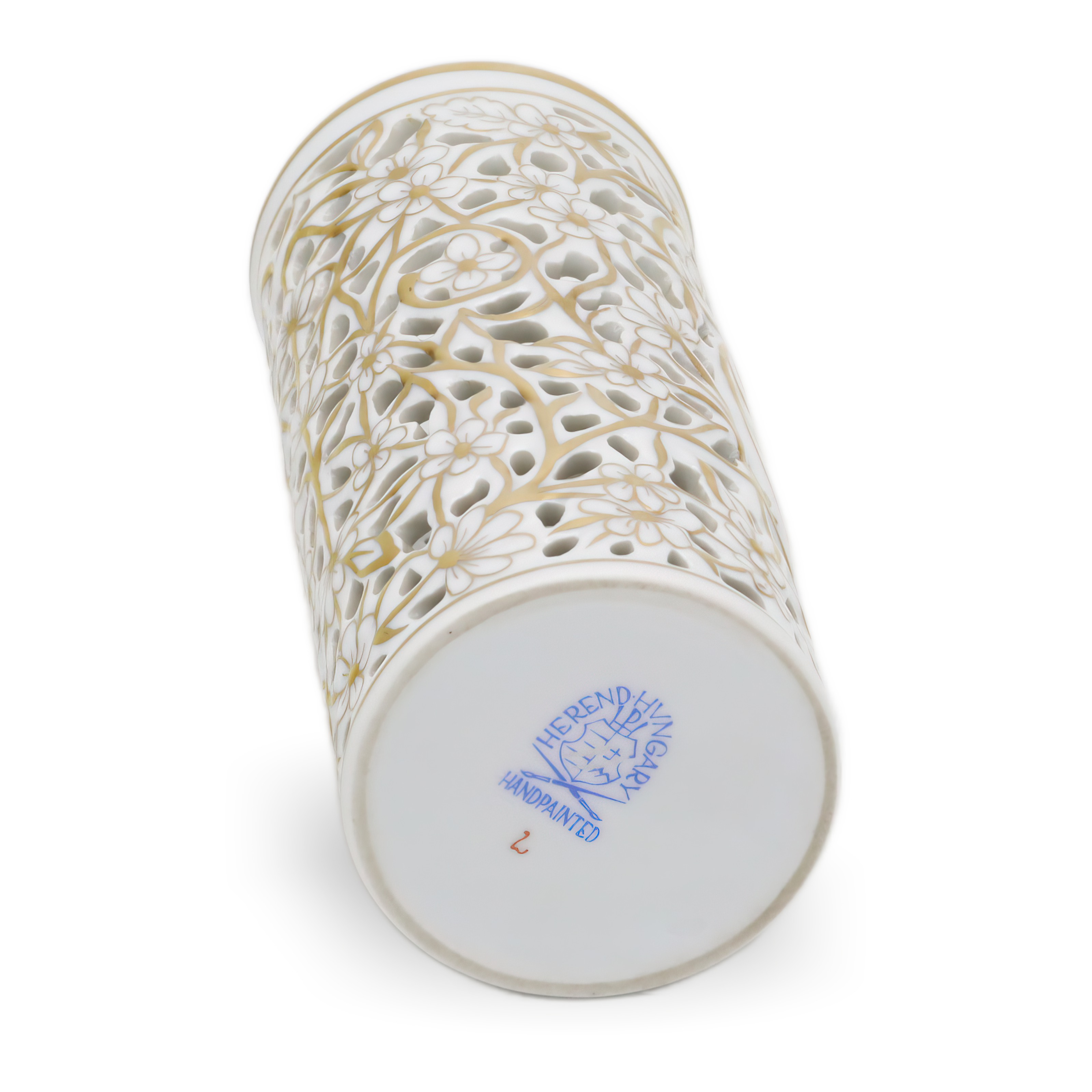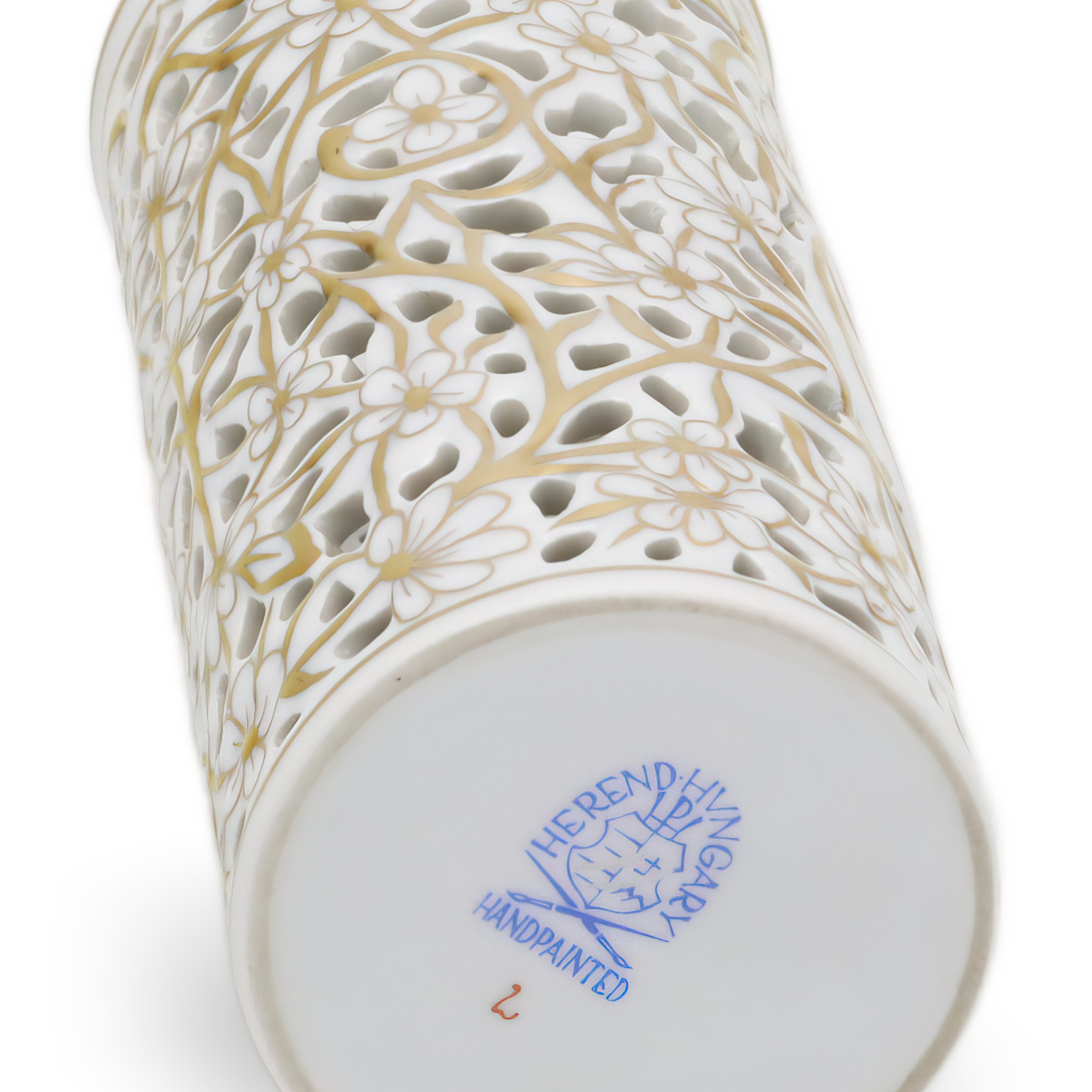 Das Design spricht für sich – zartes, weißes Porzellan, kunstvoll durchbrochen gearbeitet, sogenanntes „Openwork“. Die filigranen Durchbrüche lassen das Licht besonders schön spielen, was für viele Herend-Objekte ganz typisch ist. Die Oberfläche ist mit floralen Ornamenten und eleganten Schwüngen in echtem Gold handbemalt. Und natürlich gibt es das charakteristische Herend-Motiv in der Mitte – dezent, aber sofort erkennbar als Markenzeichen dieses Hauses.