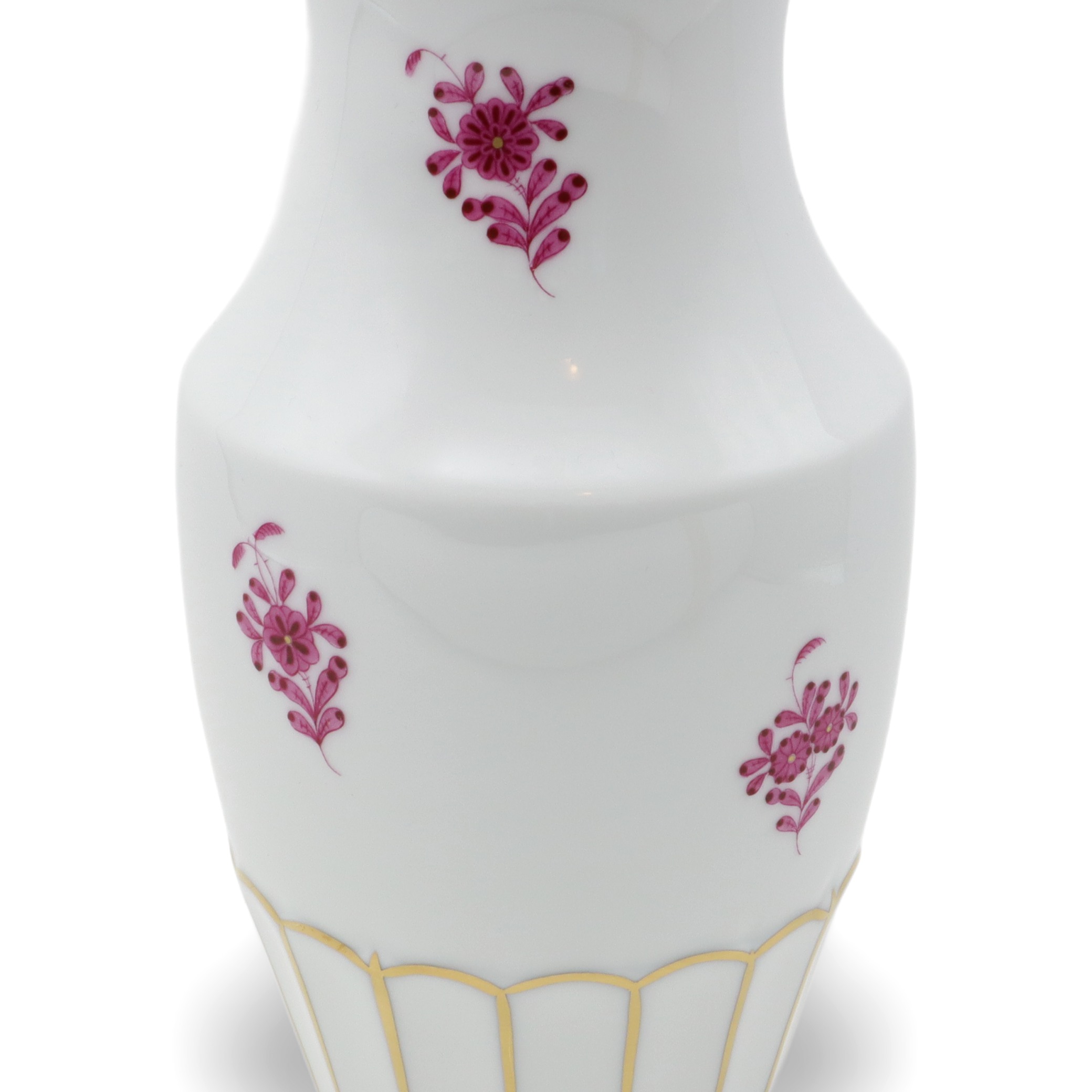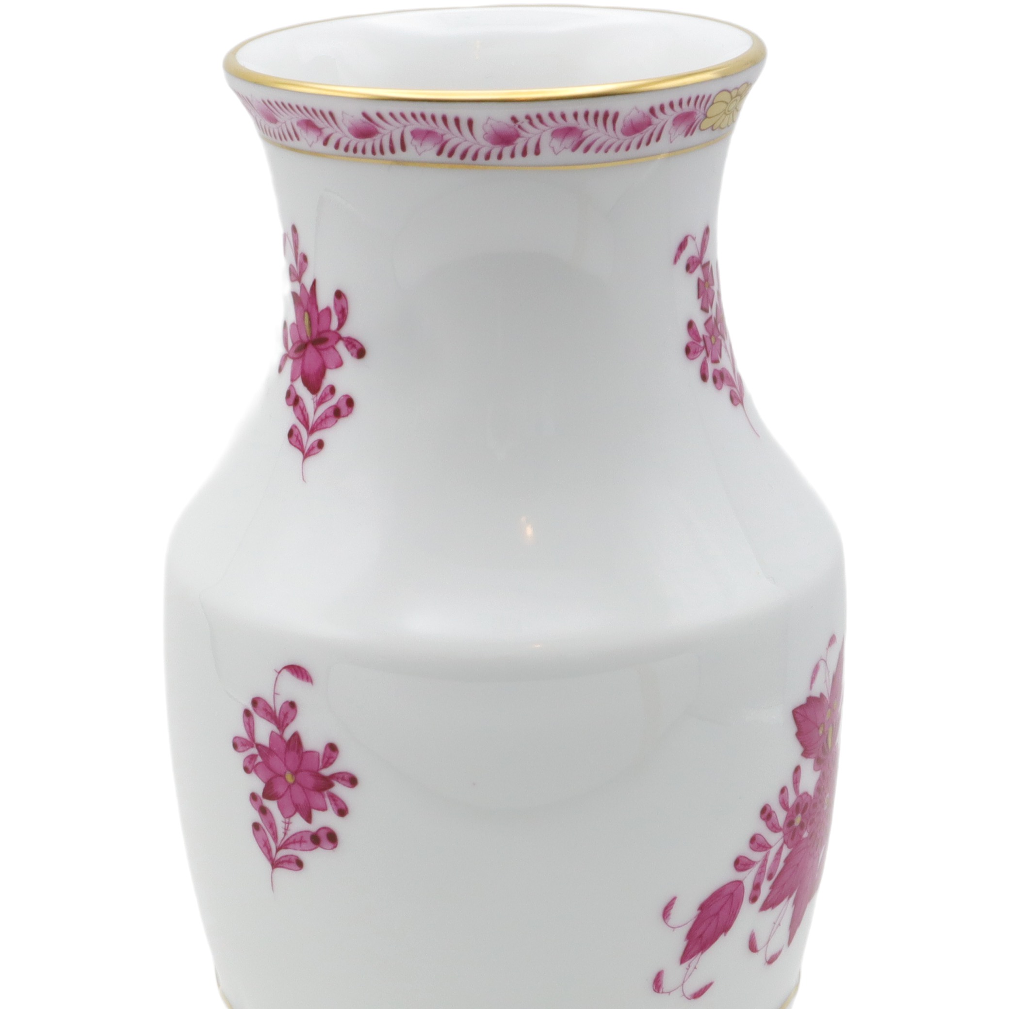 Das Dekor der Vase ist das berühmte chinesische Bouquet-Muster, international auch als „Apponyi“ bekannt. Dieses ikonische Design wurde ursprünglich im 19. Jahrhundert für den ungarischen Adel geschaffen und ist benannt nach dem Grafen Albert Apponyi, der ein begeisterter Liebhaber genau dieser kunstvollen Motive war. Das Hauptmotiv zeigt ein zentrales Blumenbouquet in kräftigem Purpur, das von feinen, goldenen Akzenten auf wunderschön weißem Herend-Porzellan umrahmt ist. Jeder Pinselstrich ist ein Zeugnis traditioneller Handwerkskunst, handbemalt mit viel Liebe zum Detail. Die Farbintensität des Purpur ist ebenso leuchtend wie edel, und die filigranen Blatt- und Blütenornamente zeugen von einer unglaublichen Präzision – kein Vergleich zu industriell gefertigter Massenware.