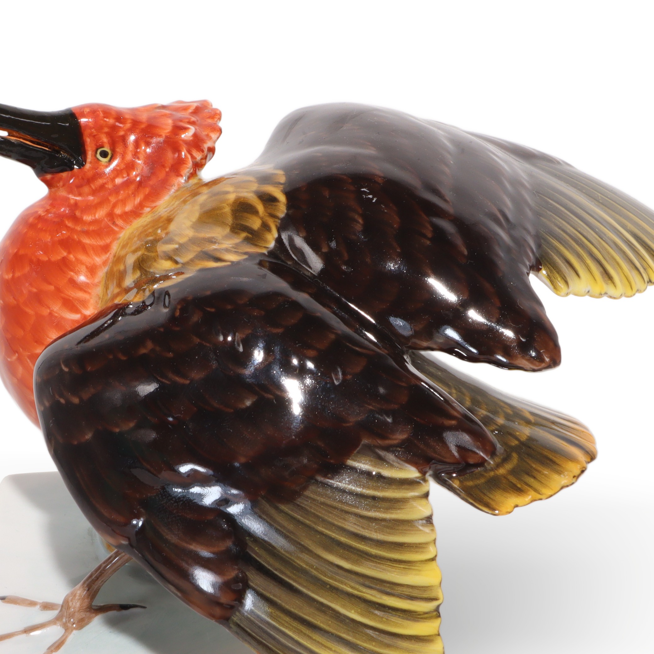 Der Vogel zeigt ein spektakuläres Farbspiel. Das Brustgefieder schimmert in sattem Orange und Rot – die Federstruktur ist dabei so detailreich wiedergegeben, dass man fast meint, sie anfassen zu können. Die Flügel beeindrucken durch ein intensives Dunkelbraun, das zu den zarten, gelblichgrünen Spitzen hin übergeht, und in wunderbarem Kontrast zu dem helleren Körper steht. Besonders bemerkenswert sind die ausdrucksstarken, mandelgrünen Augen mit feinen Konturen und dem subtil schwarz glänzenden Schnabel. Diese Kombination aus kräftigen, aber natürlichen Farbtönen verleiht der Figur einen lebendigen und edlen Gesamteindruck.