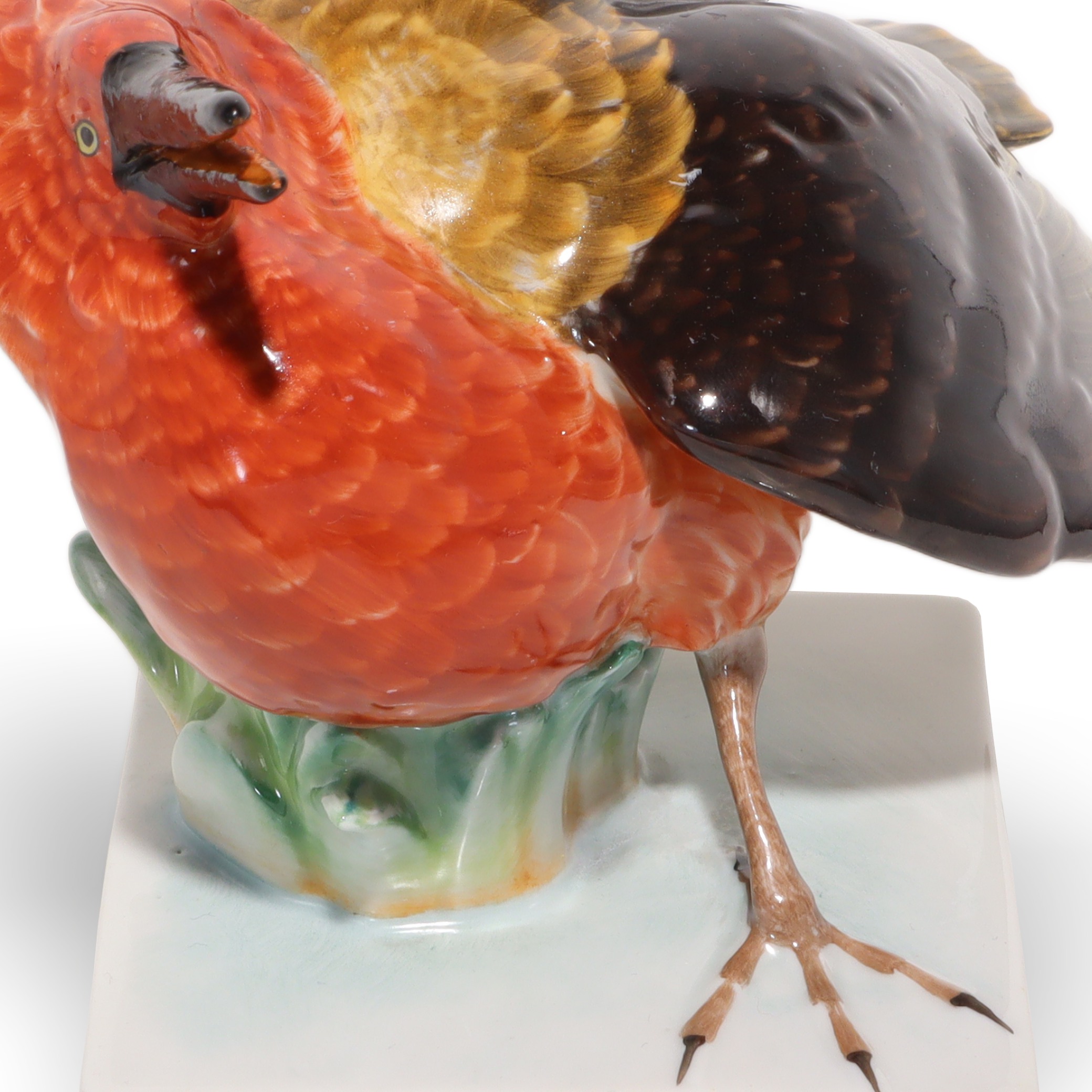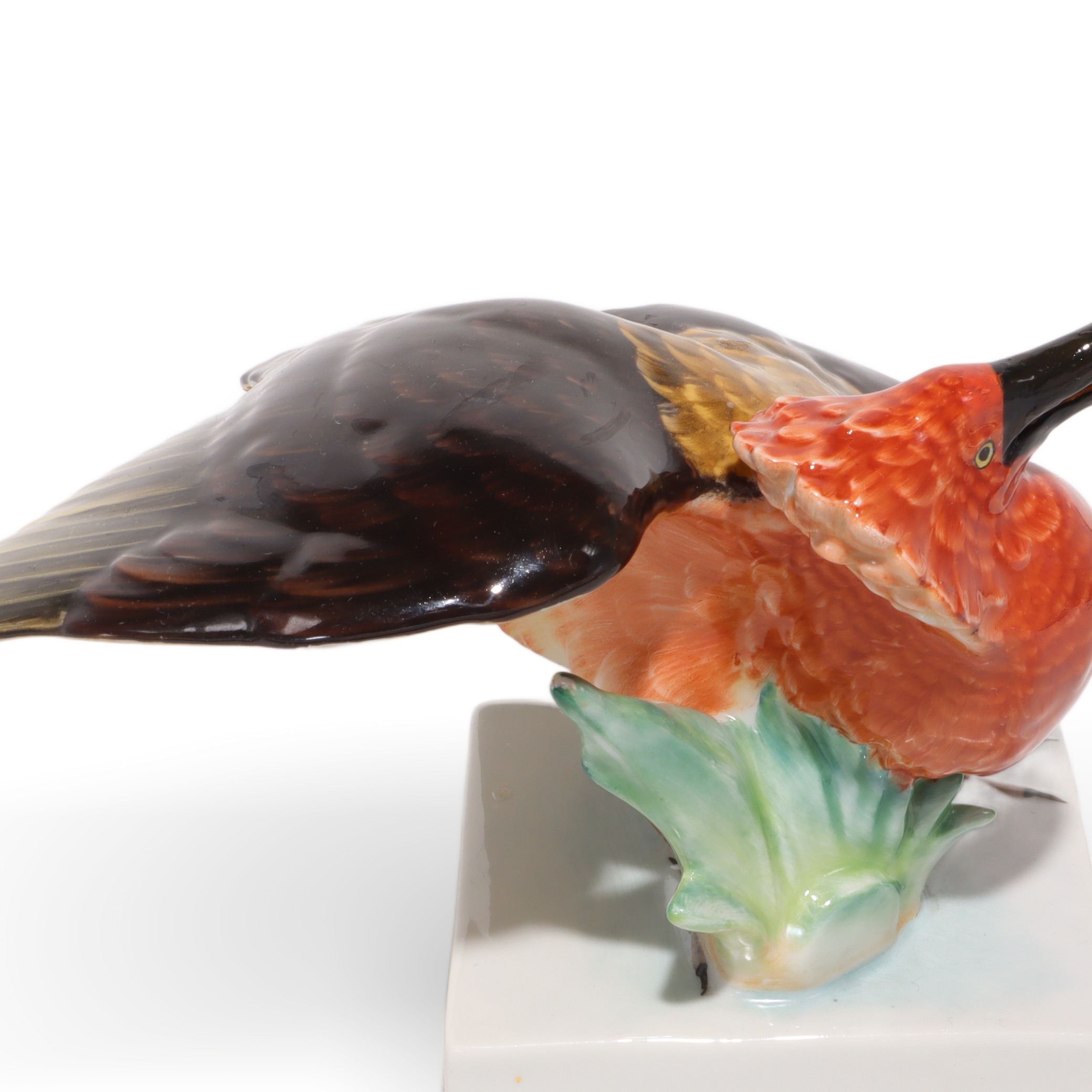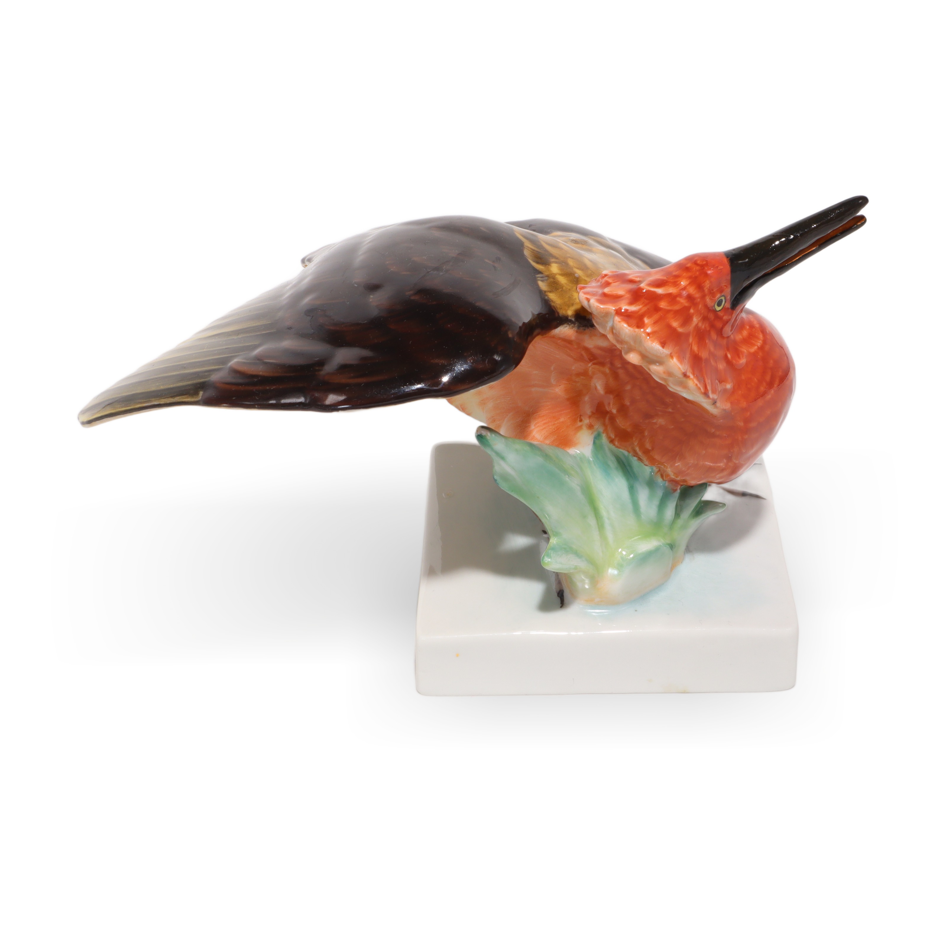 Der Vogel sitzt auf einem schlichten, weißen Sockel, der die Komposition erdet und ihr einen modernen Rahmen gibt, ohne von der Figur selbst abzulenken. Dadurch wird die Aufmerksamkeit automatisch auf die expressive Pose und die meisterhafte Bemalung gelenkt. Die Maße – eine Höhe von 11,25 cm, eine Breite von 17,5 cm und eine Länge von 15 cm – machen diese Porzellanfigur zu einem echten Blickfang in jeder Vitrine, auf Sideboards oder in klassisch eingerichteten Arbeitszimmern. Trotz ihres Alters ist der Zustand dieses Stücks fast neuwertig, was bei handbemalten Porzellanfiguren keineswegs selbstverständlich ist. Es sind keine sichtbaren Risse, Farbabriebe oder sonstige Beschädigungen zu erkennen.