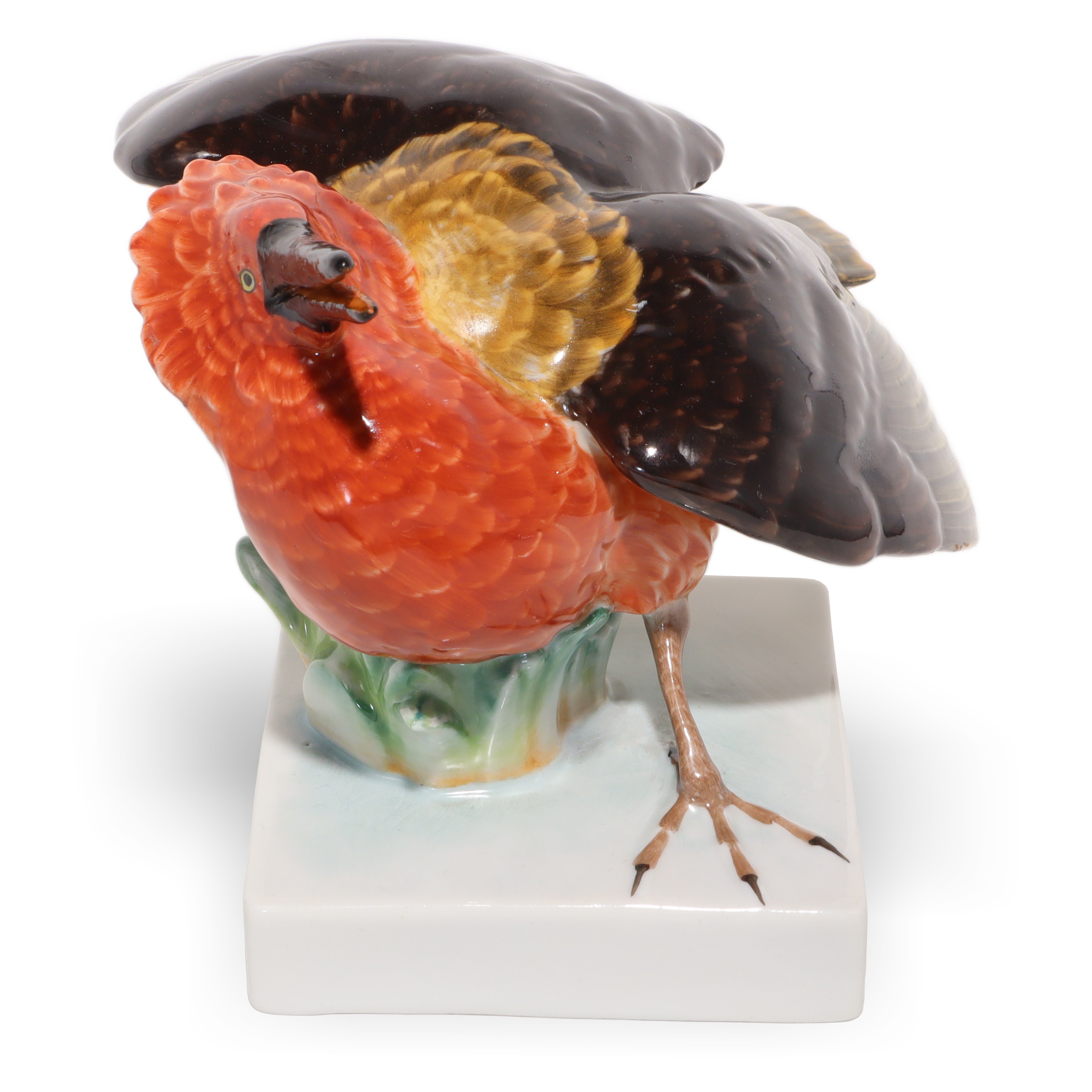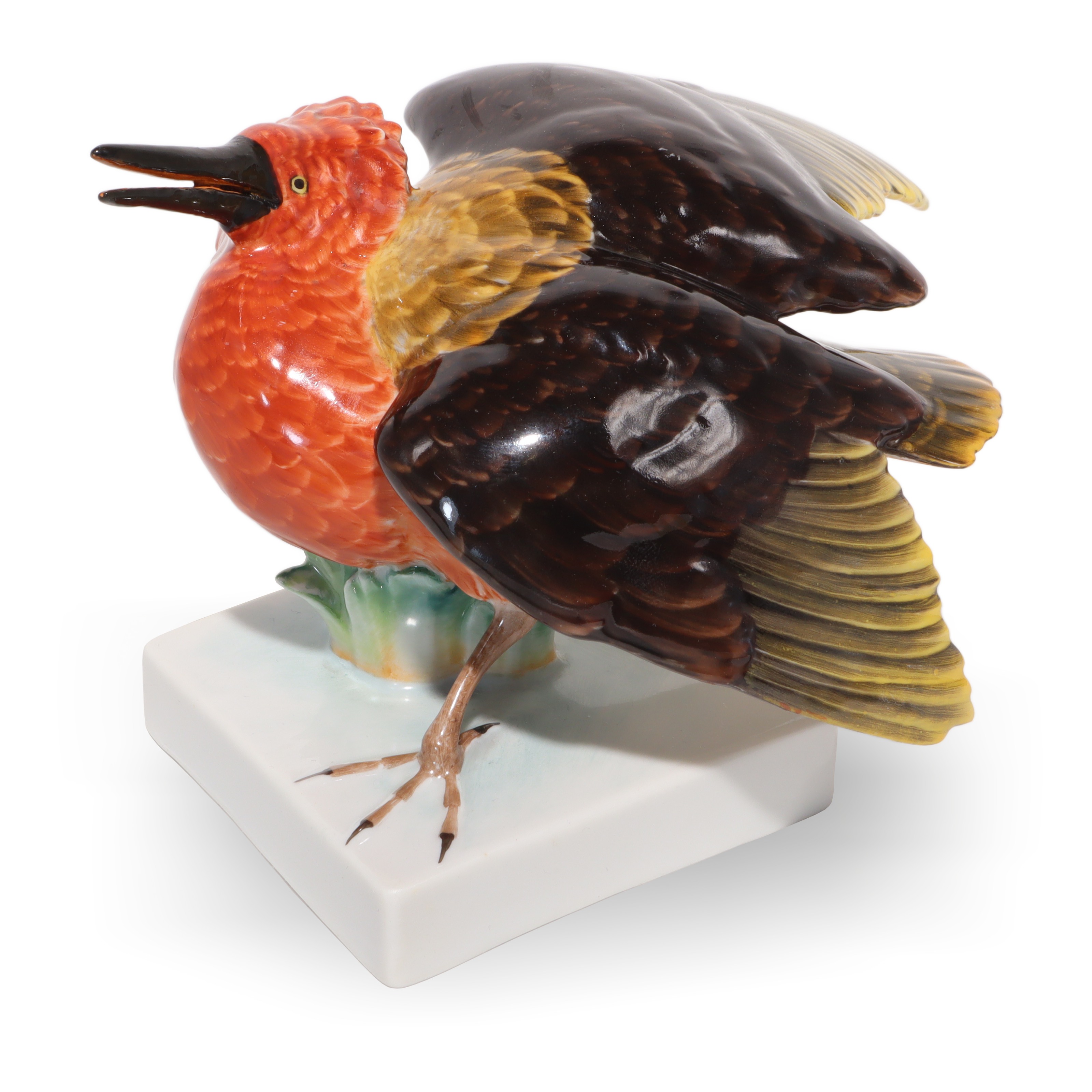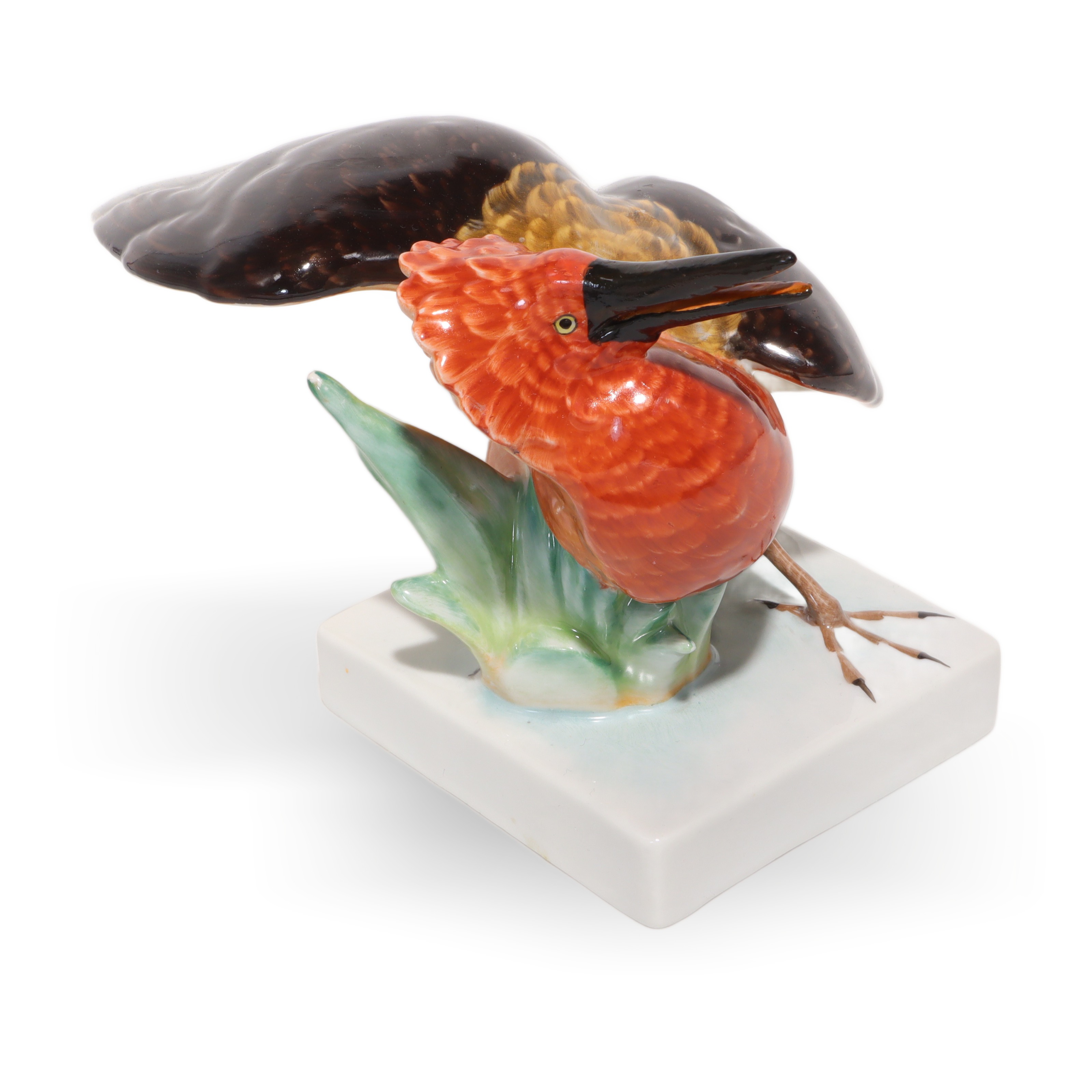 Der Vogel sitzt auf einem schlichten, weißen Sockel, der die Komposition erdet und ihr einen modernen Rahmen gibt, ohne von der Figur selbst abzulenken. Dadurch wird die Aufmerksamkeit automatisch auf die expressive Pose und die meisterhafte Bemalung gelenkt. Die Maße – eine Höhe von 11,25 cm, eine Breite von 17,5 cm und eine Länge von 15 cm – machen diese Porzellanfigur zu einem echten Blickfang in jeder Vitrine, auf Sideboards oder in klassisch eingerichteten Arbeitszimmern. Trotz ihres Alters ist der Zustand dieses Stücks fast neuwertig, was bei handbemalten Porzellanfiguren keineswegs selbstverständlich ist. Es sind keine sichtbaren Risse, Farbabriebe oder sonstige Beschädigungen zu erkennen.