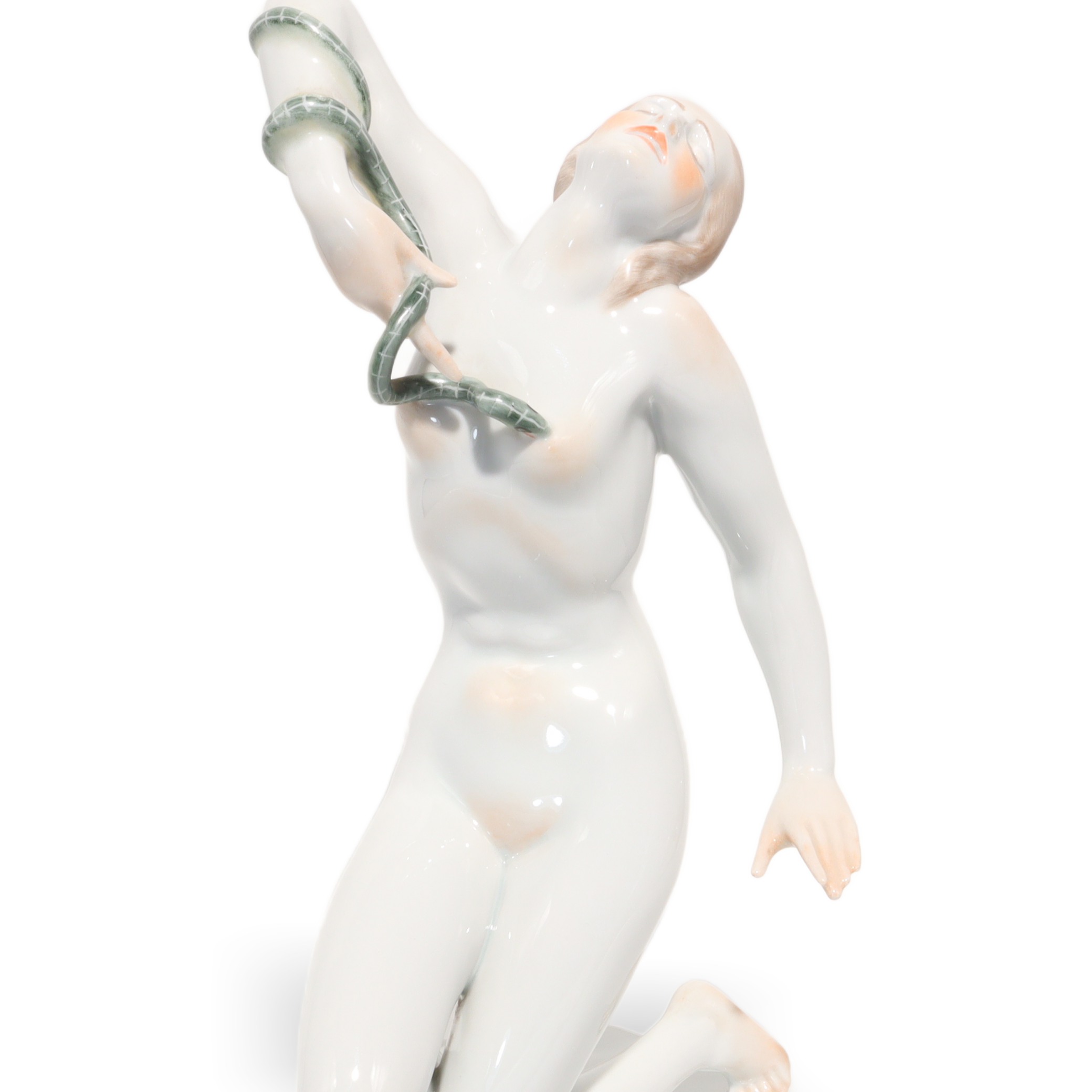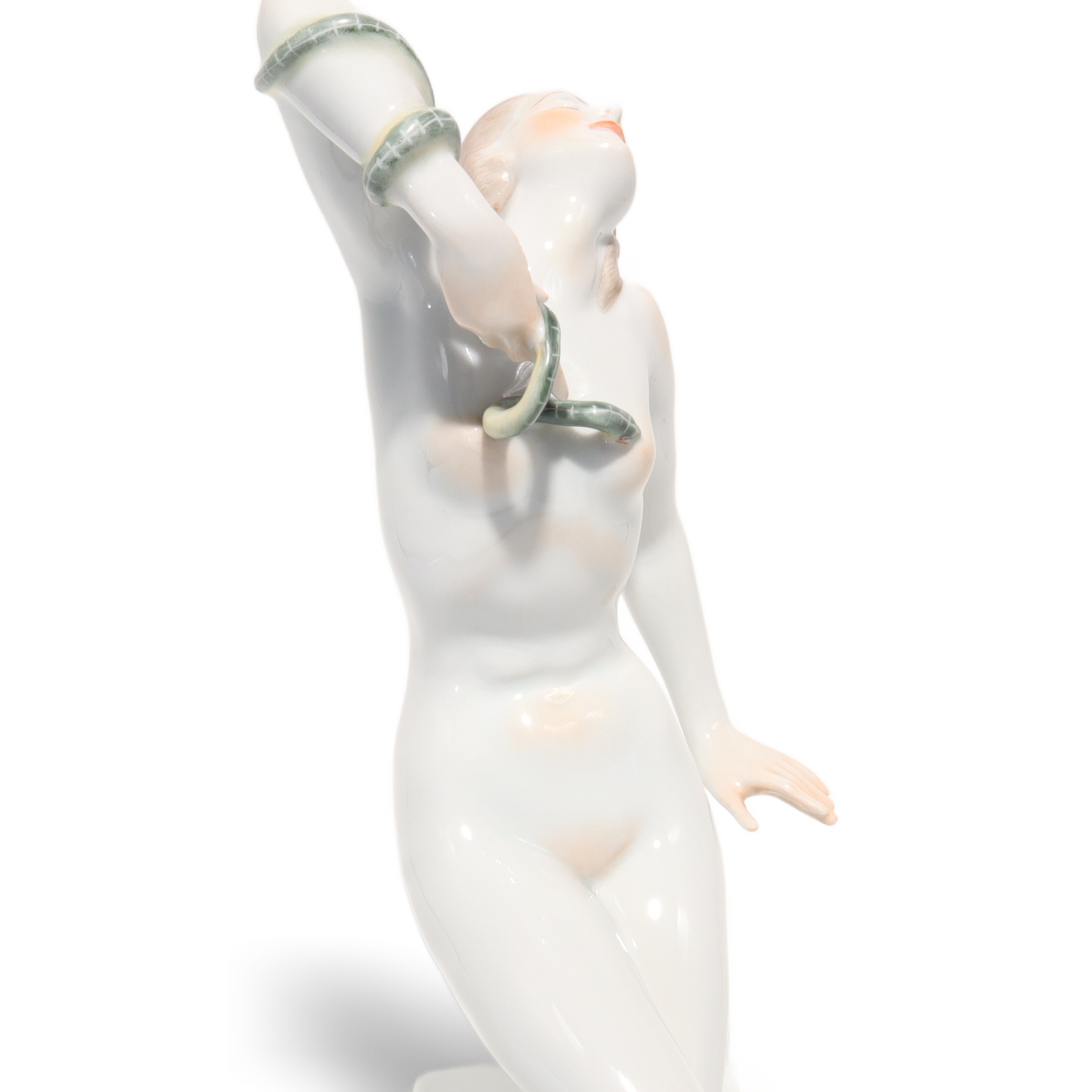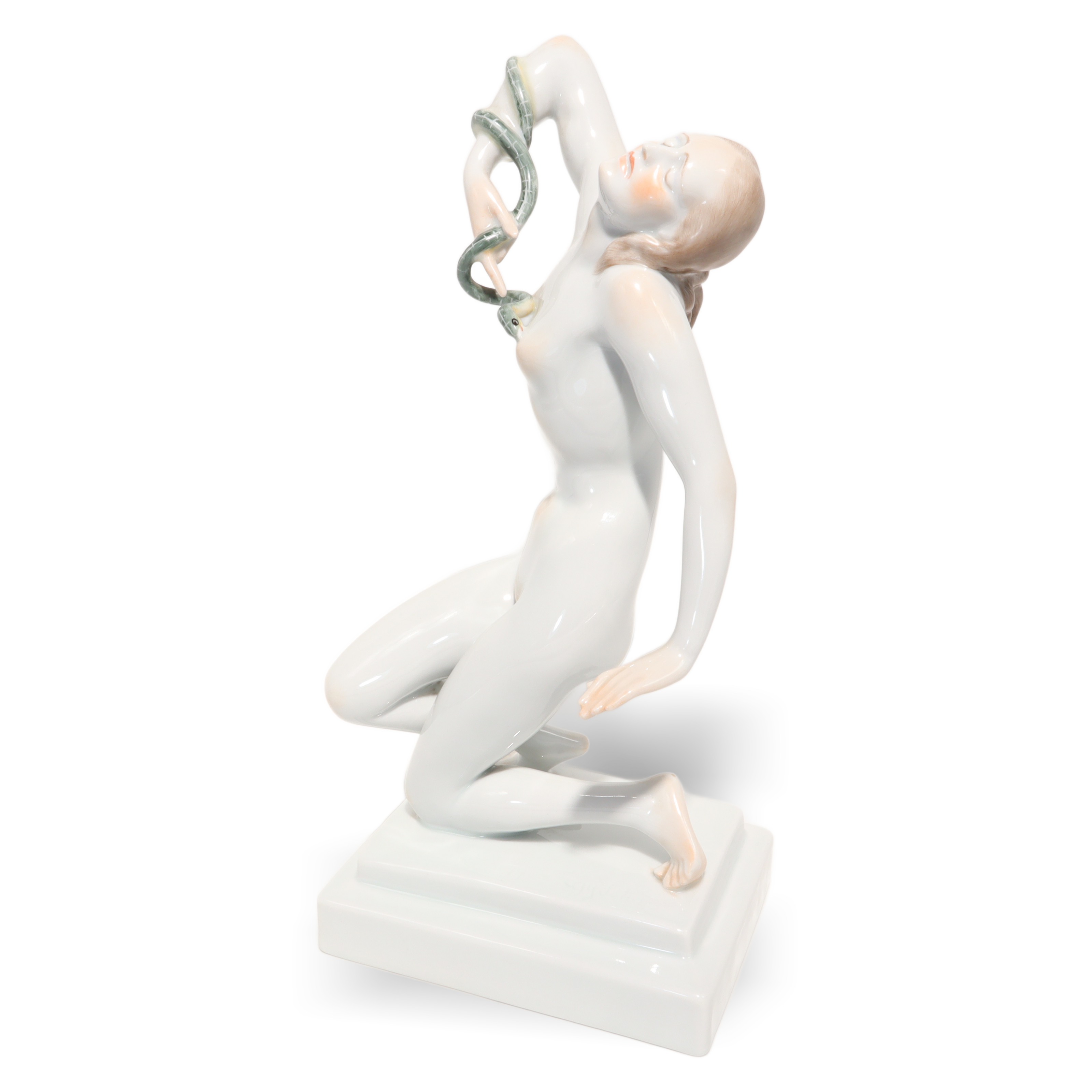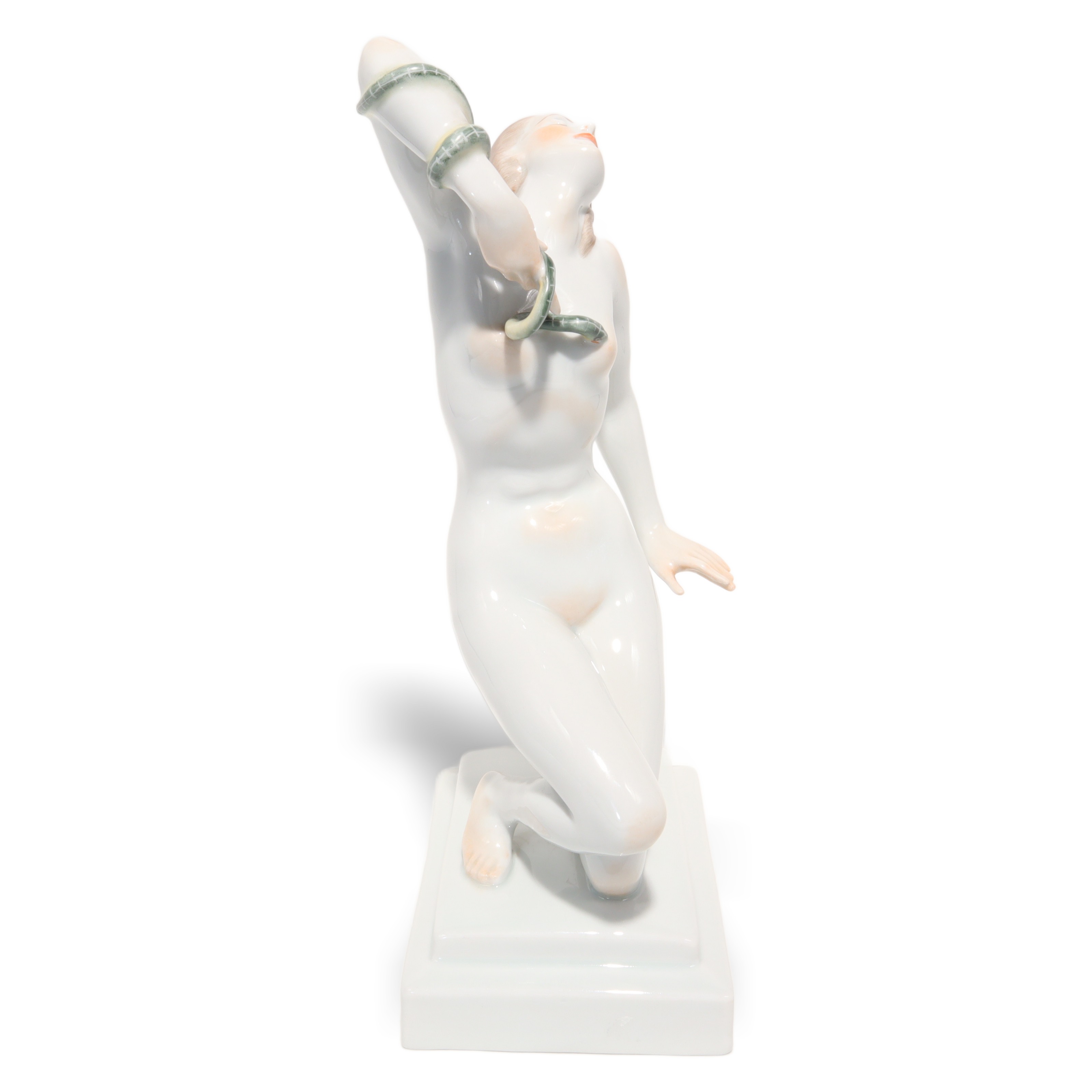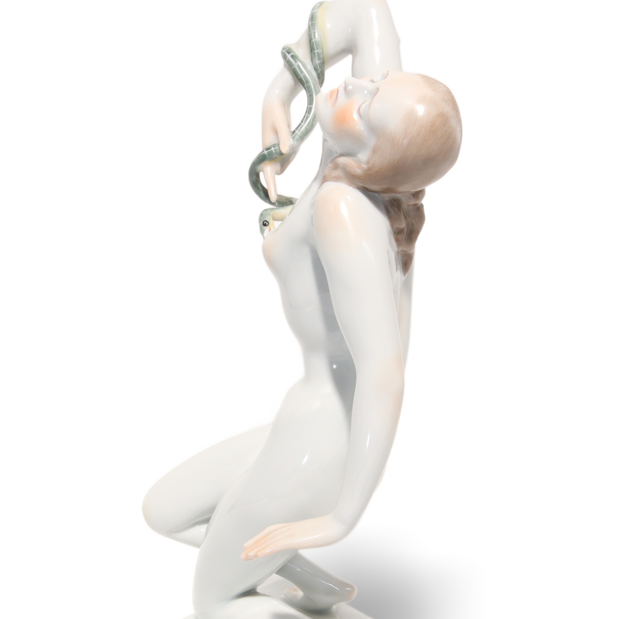 Der Zustand der Figur ist fast neuwertig, bei dem Alter von mehr als fünfzig Jahren fast eine kleine Sensation. Keine Risse, keine Chips, keine sichtbaren Gebrauchsspuren – das macht sie besonders attraktiv für Sammlerinnen, die Wert auf tadellose Qualität legen. Die Porzellanoberfläche glänzt wunderbar, die Schlange ist filigran gearbeitet, alles sitzt makellos. Ein ideales Geschenk für Kunstliebhaberinnen, Menschen mit Faible für Historie oder stilvolle Interiors – aber vor allem etwas für jene, die Freude an echten Raritäten haben.