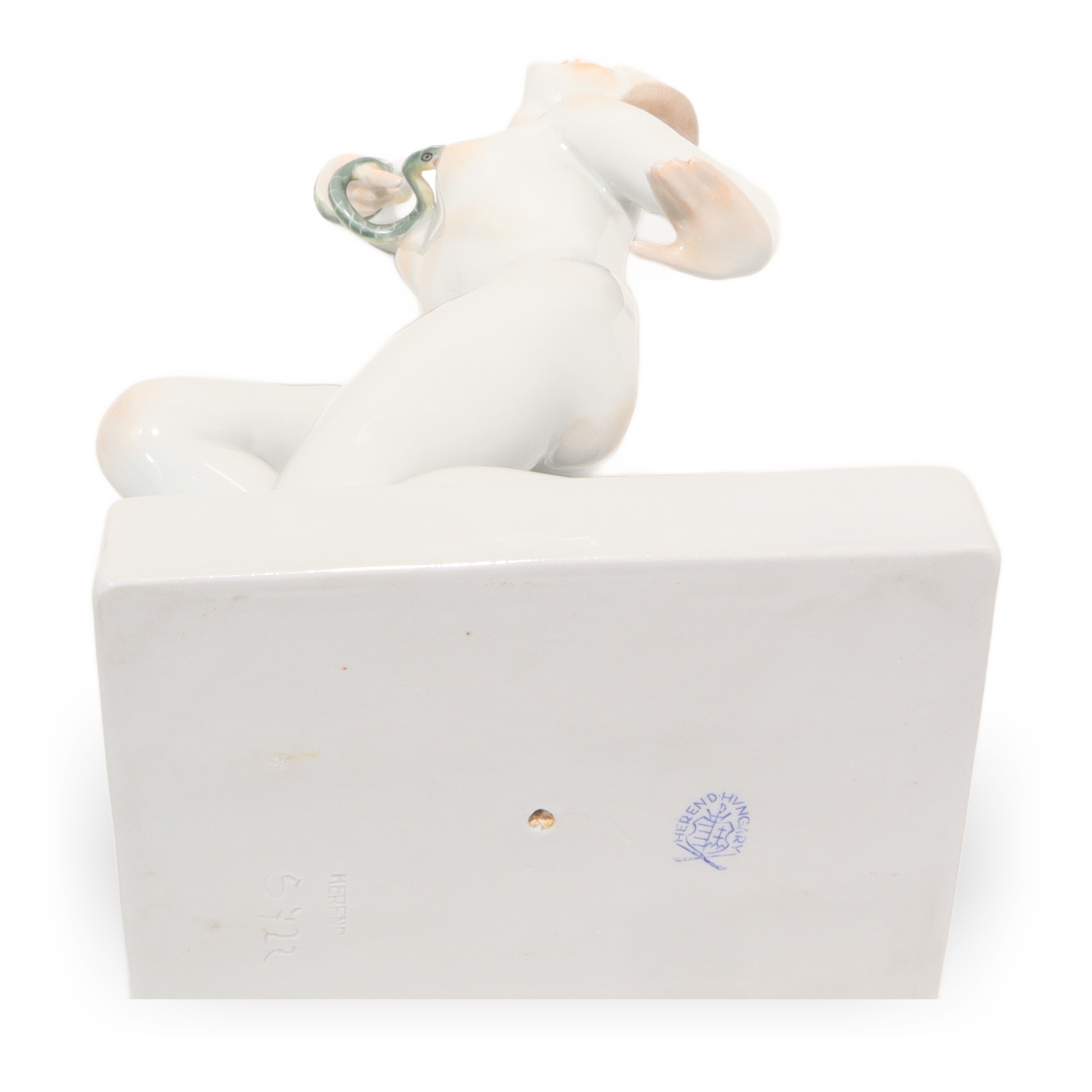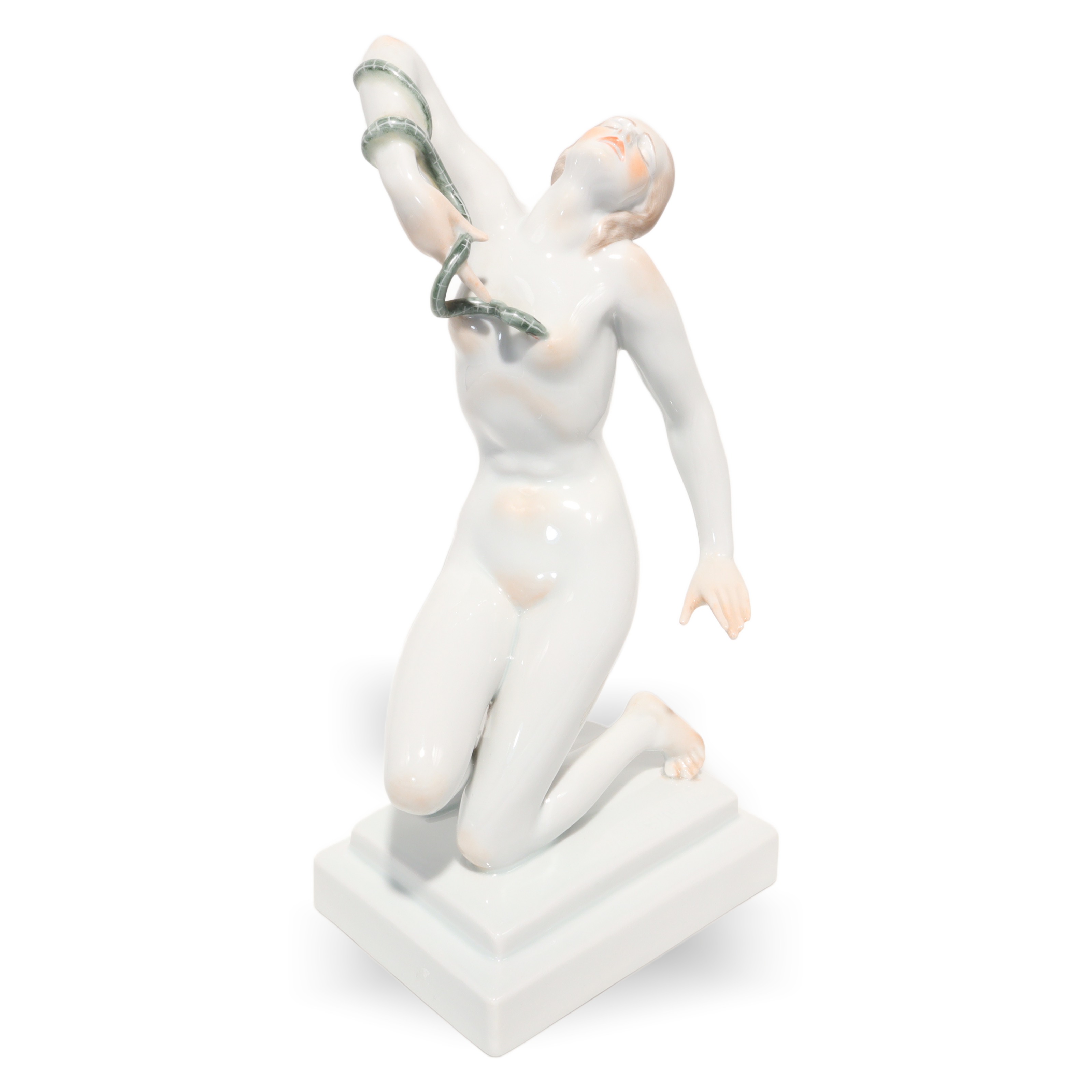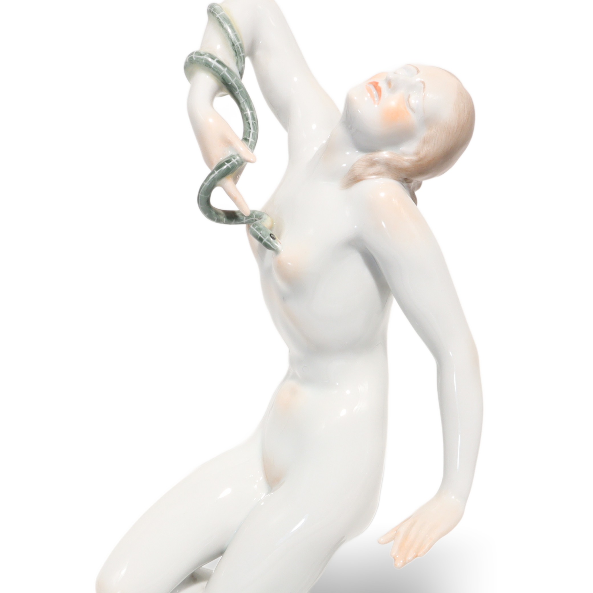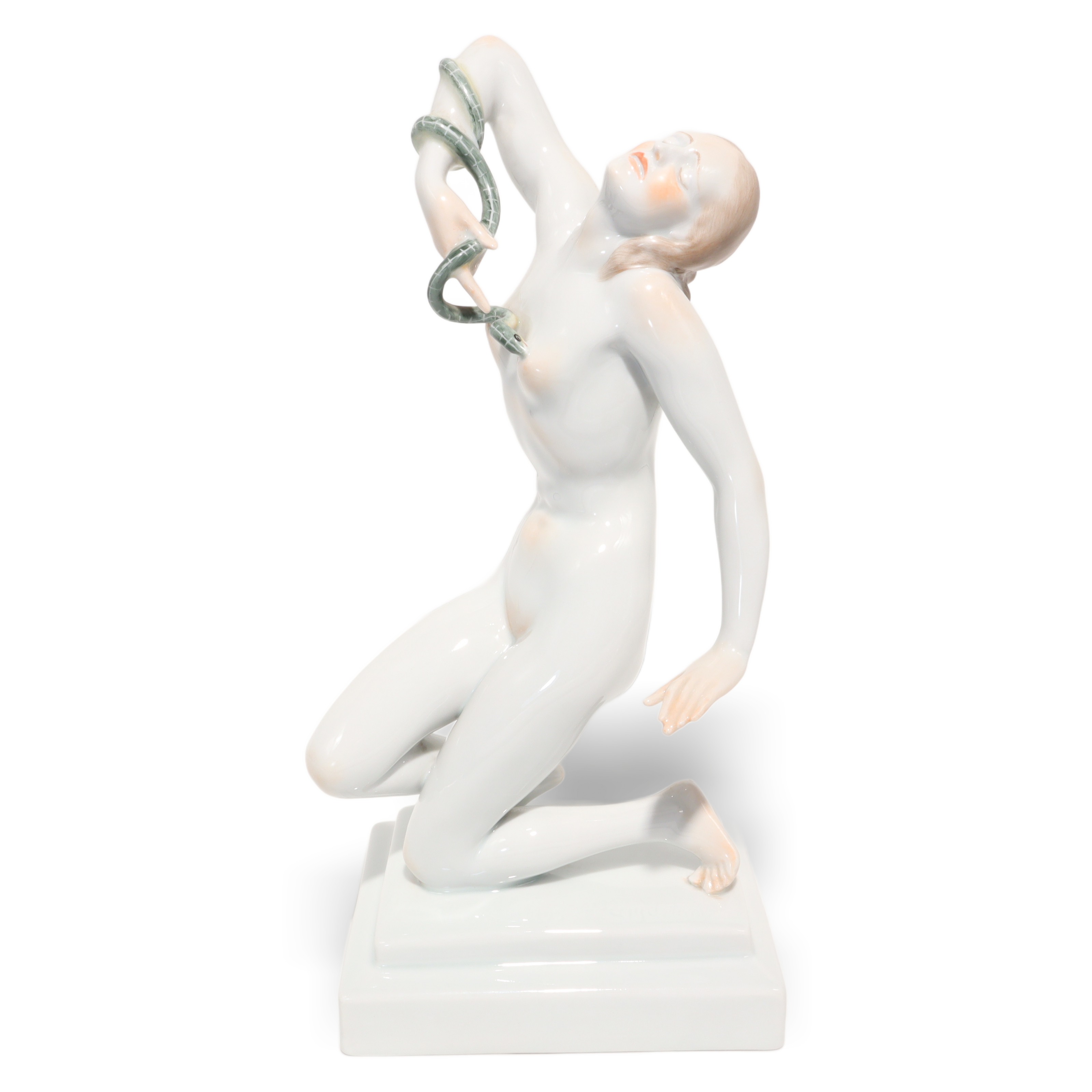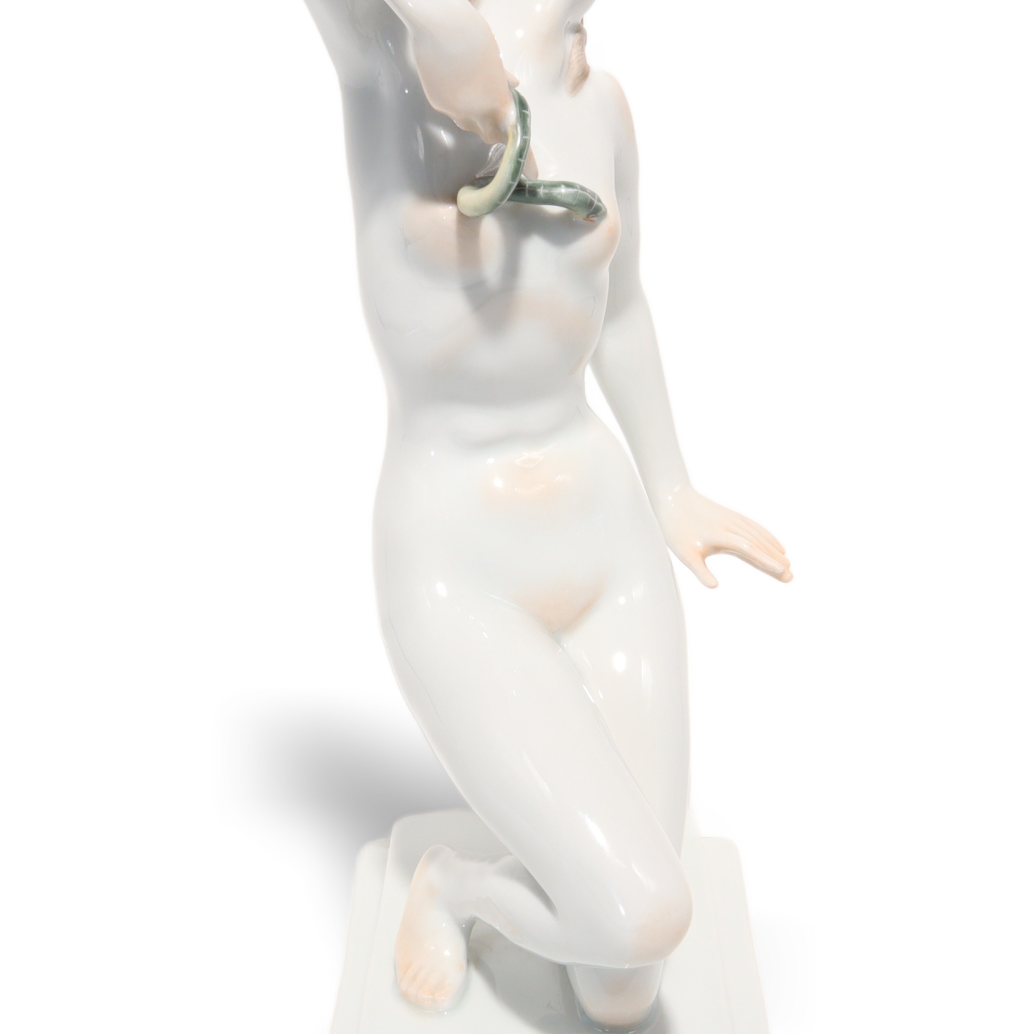 Der Zustand der Figur ist fast neuwertig, bei dem Alter von mehr als fünfzig Jahren fast eine kleine Sensation. Keine Risse, keine Chips, keine sichtbaren Gebrauchsspuren – das macht sie besonders attraktiv für Sammlerinnen, die Wert auf tadellose Qualität legen. Die Porzellanoberfläche glänzt wunderbar, die Schlange ist filigran gearbeitet, alles sitzt makellos. Ein ideales Geschenk für Kunstliebhaberinnen, Menschen mit Faible für Historie oder stilvolle Interiors – aber vor allem etwas für jene, die Freude an echten Raritäten haben.