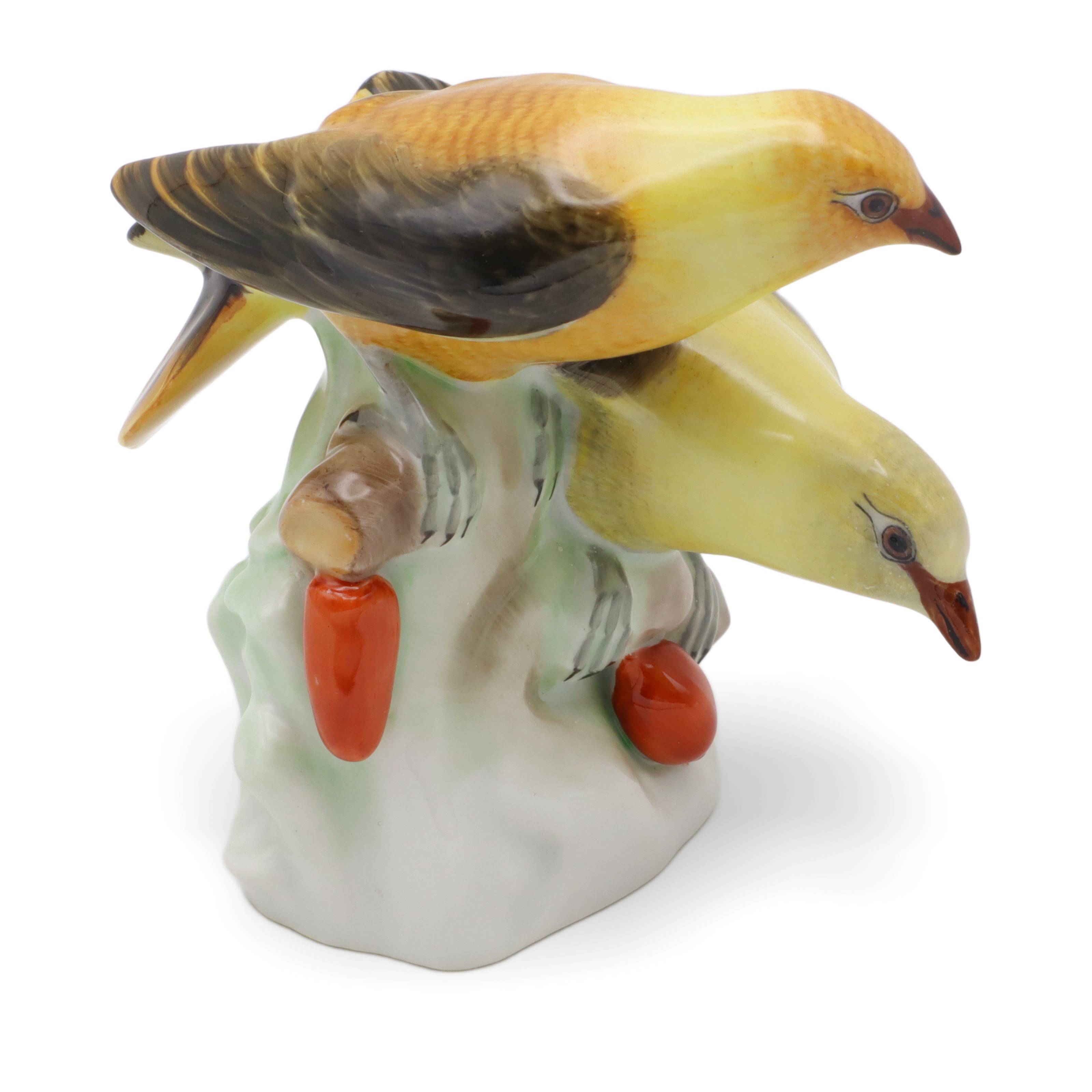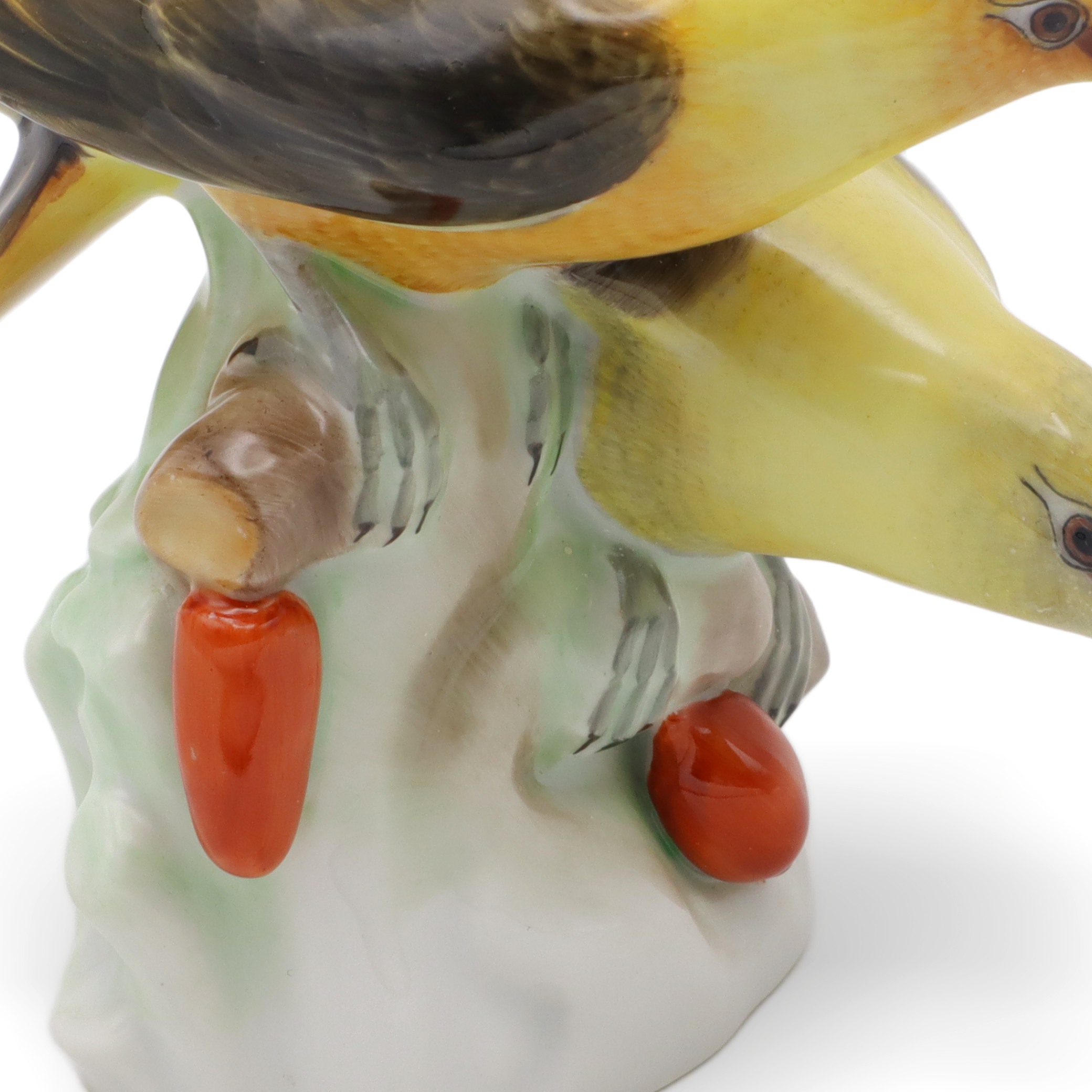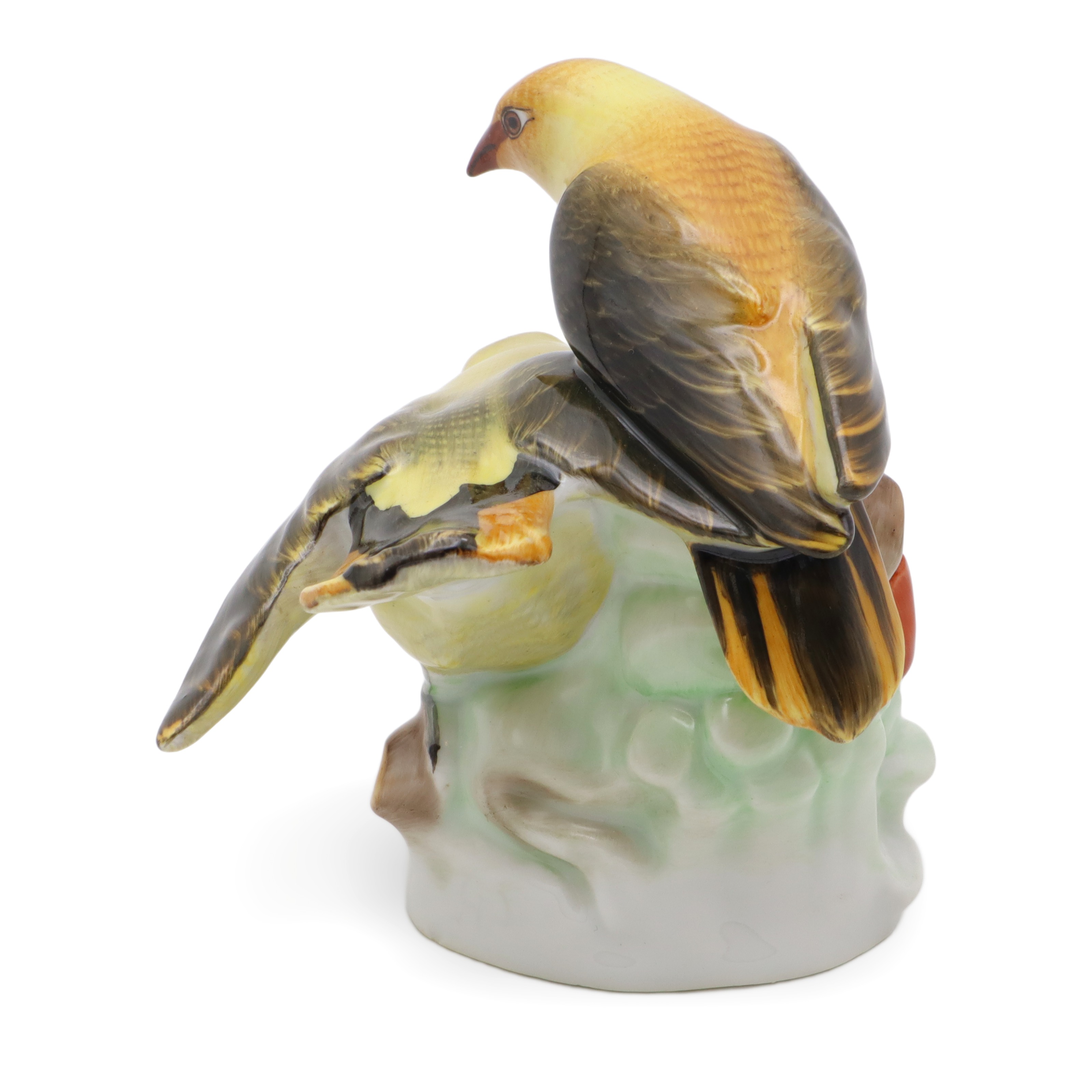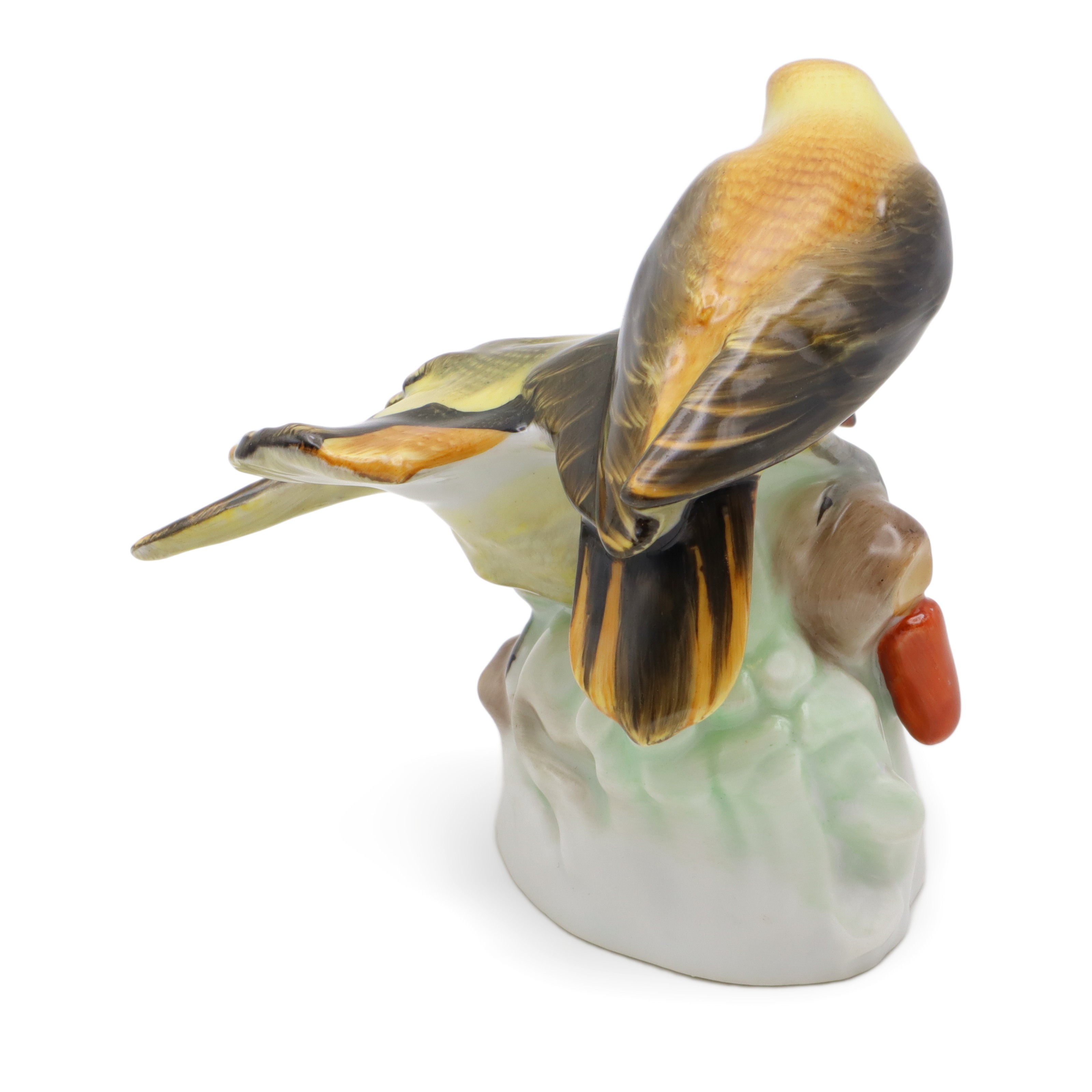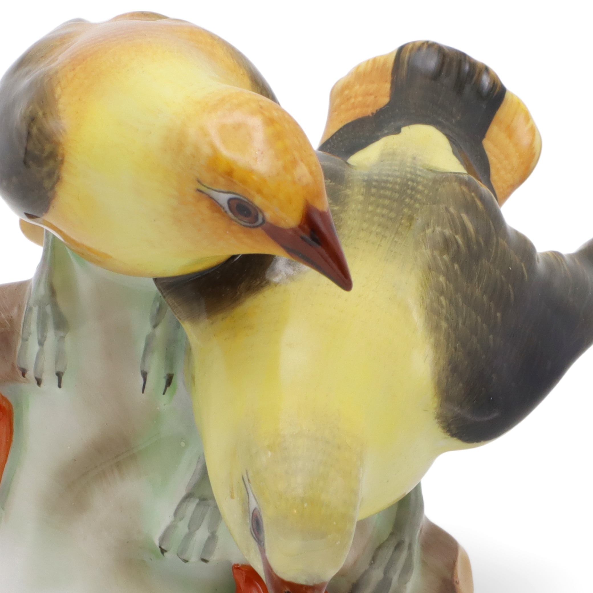 Die Figur ist in fast neuwertigem Zustand erhalten, was angesichts ihres stolzen Alters von mehr als 80 Jahren wirklich außergewöhnlich ist. Mit ihren Maßen – zehn Zentimeter hoch, zehn Zentimeter breit und zehn Zentimeter lang – bringt sie exakt die richtige Präsenz auf ein Sideboard, in eine Vitrine oder auf einen Schreibtisch. Das Zusammenspiel aus matten und glänzenden Porzellan-Elementen, aus zurückhaltendem Untergrund und leuchtenden Farben, sorgt für ein faszinierendes Wechselspiel bei wechselndem Licht. Die handbemalten Details machen jedes Exemplar zum Unikat, jedes einzelne Federchen scheint individuell modelliert und liebevoll koloriert. Auch die kleinen Blätter und Beeren am Fuß der Figur sind originalgetreu und mit wahrem künstlerischen Gespür eingefangen.