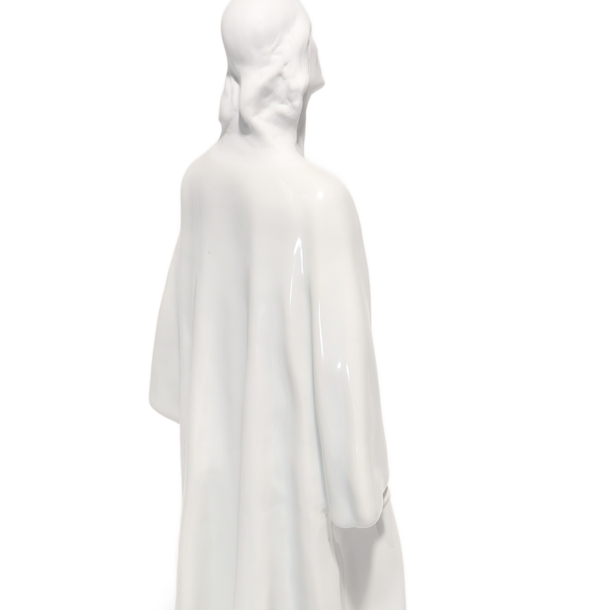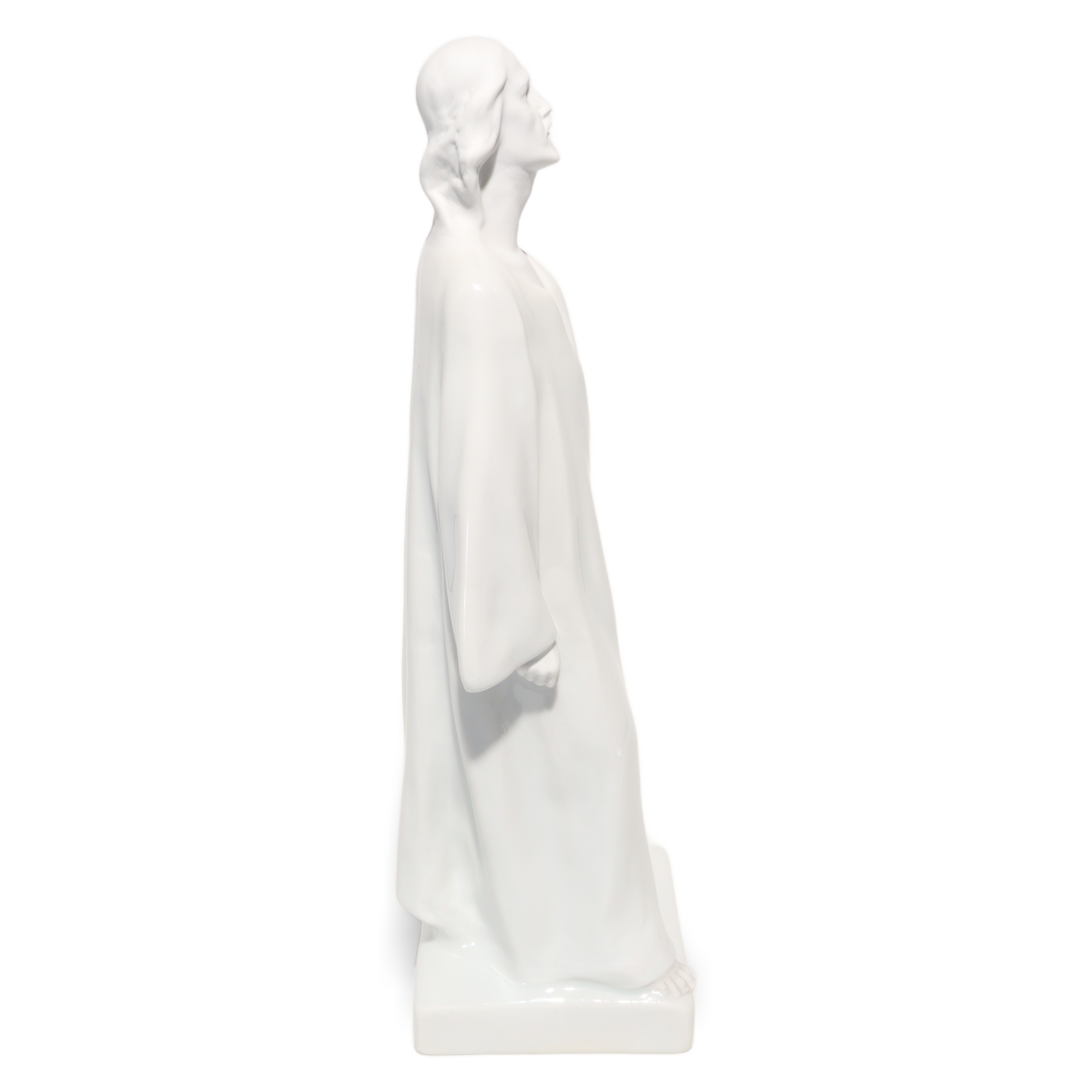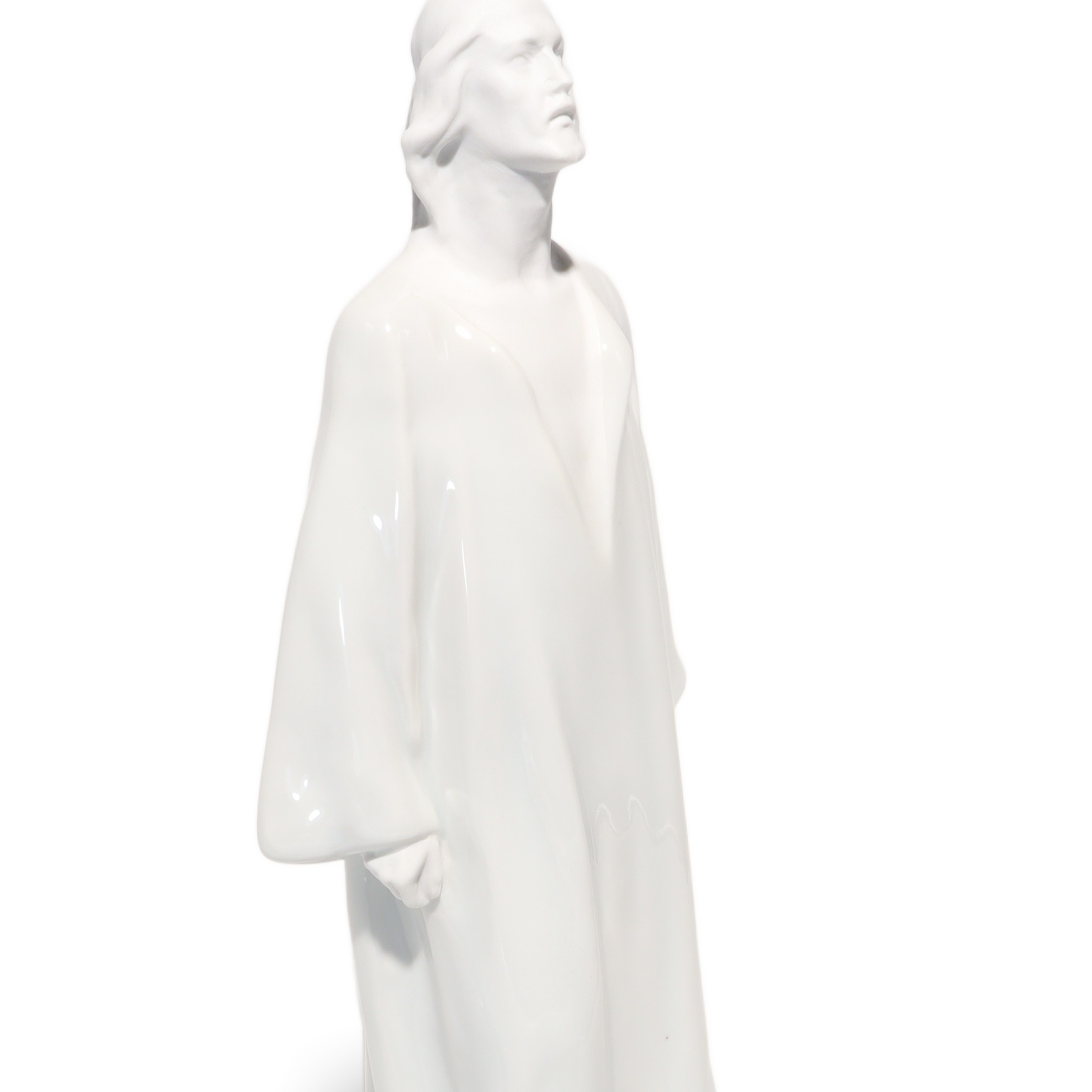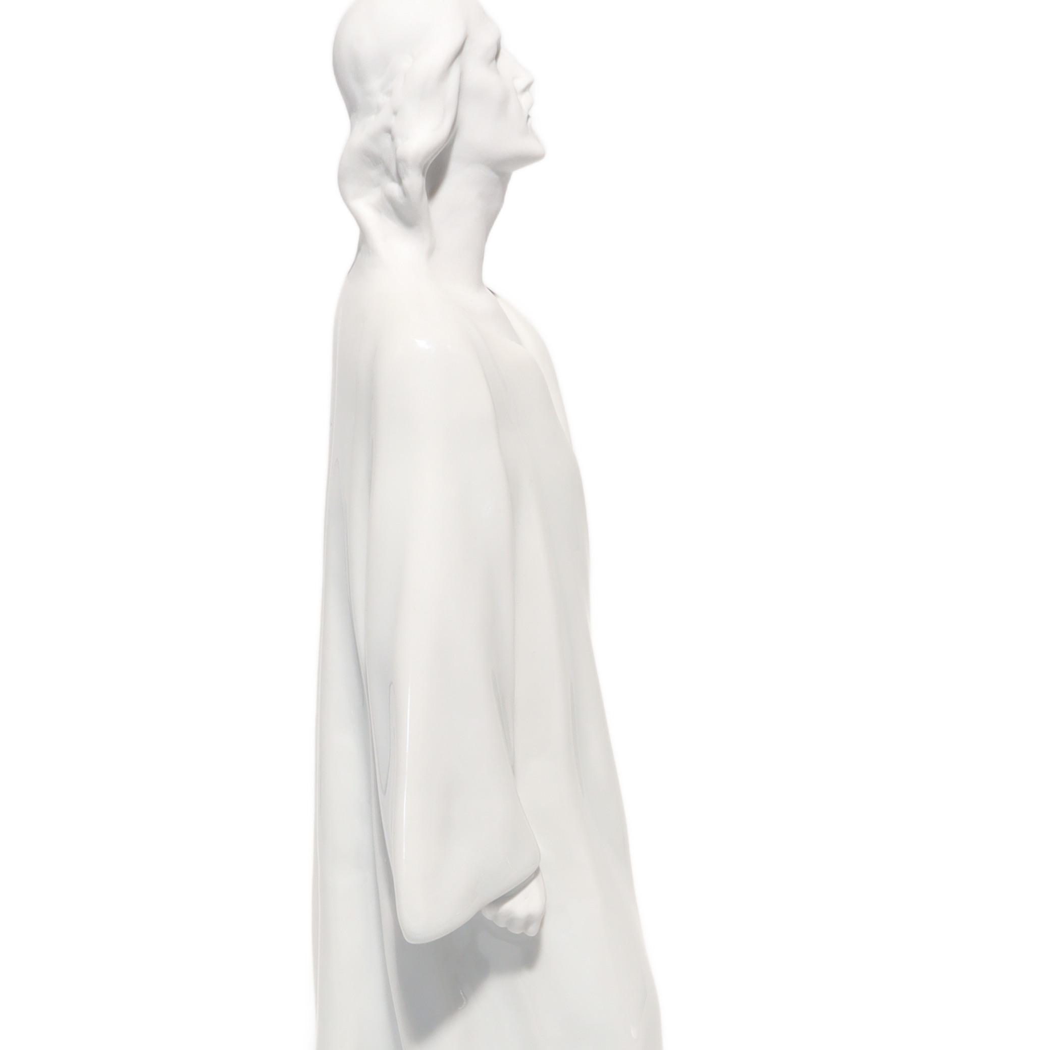 Jede Kante, Faltung des Gewands und die ruhig wirkende Körpersprache sind so ausgeführt, dass Licht und Schatten ihre volle Wirkung entfalten können. Das glänzende Porzellan reflektiert subtil das Umgebungslicht und verleiht der Figur eine sanfte Präsenz, fast einen Hauch von Spiritualität. Besonders auffällig sind die offenen, auf den Himmel gerichteten Augen – sie vermitteln eine tiefe Kontemplation und das Gefühl von Hoffnung und Vertrauen.