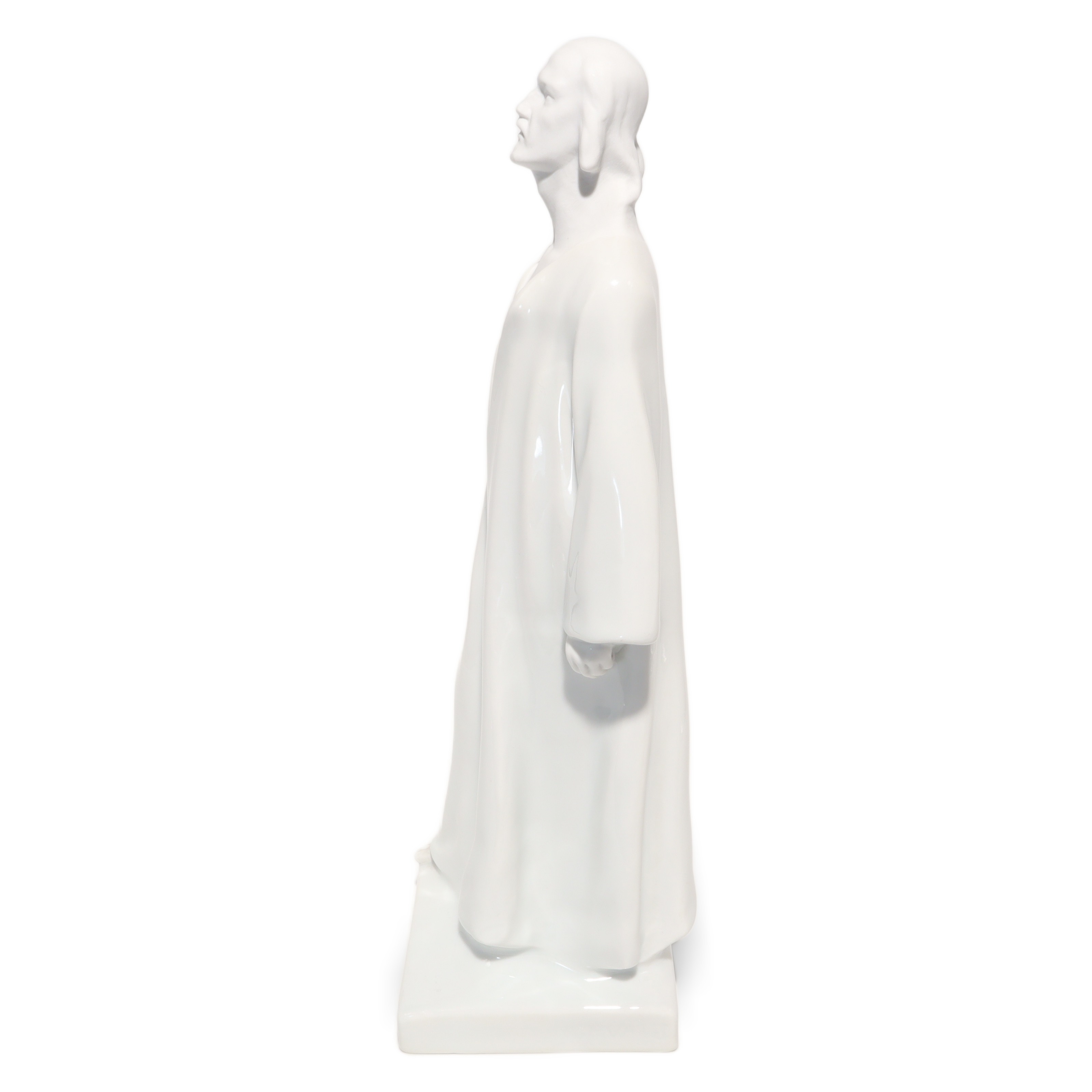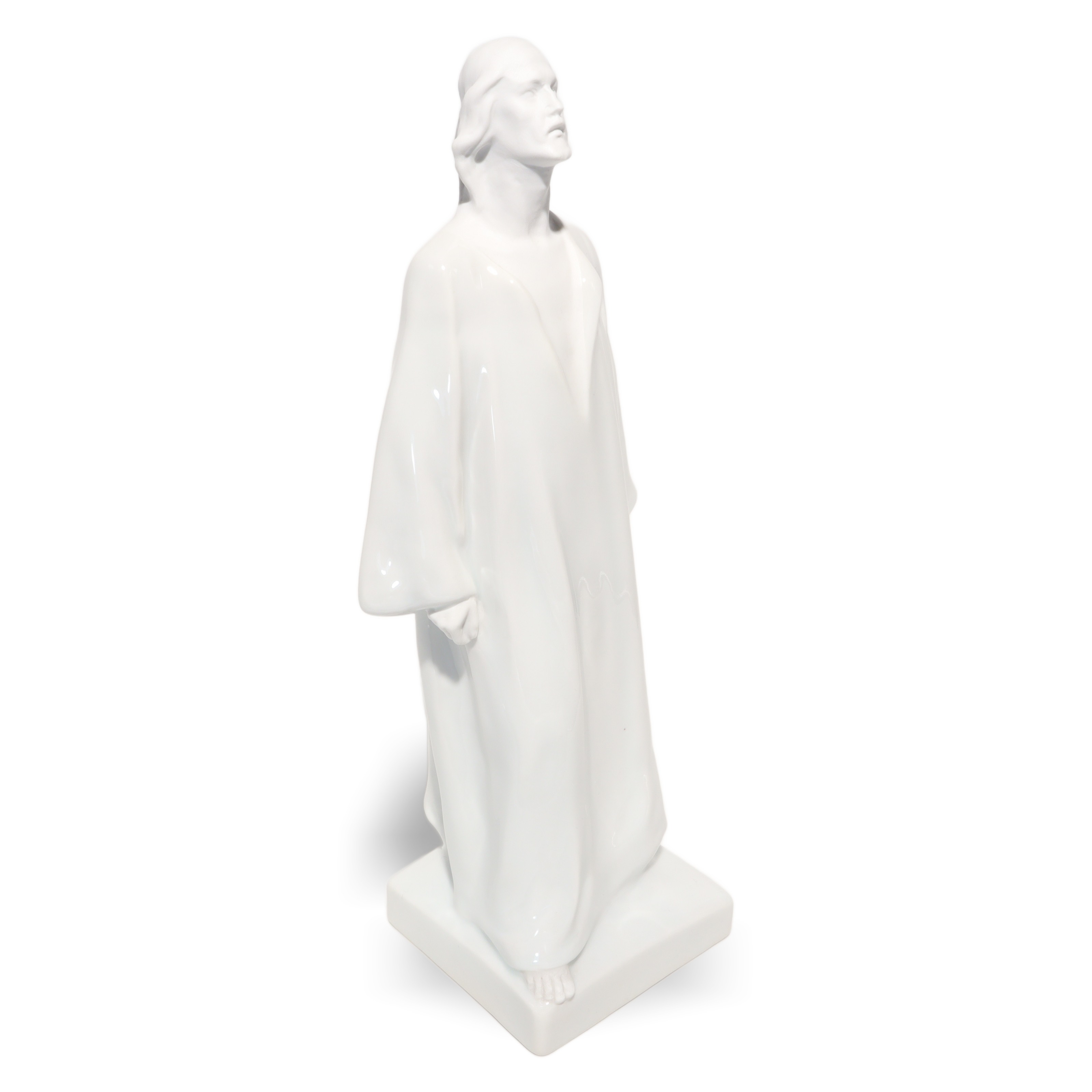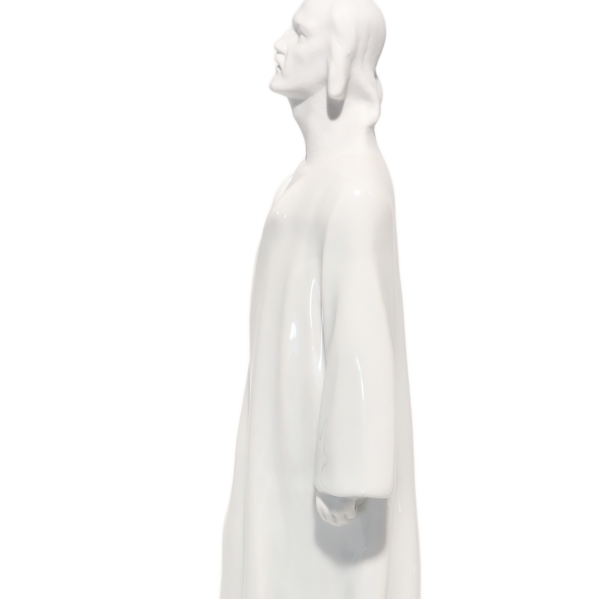 Jede Kante, Faltung des Gewands und die ruhig wirkende Körpersprache sind so ausgeführt, dass Licht und Schatten ihre volle Wirkung entfalten können. Das glänzende Porzellan reflektiert subtil das Umgebungslicht und verleiht der Figur eine sanfte Präsenz, fast einen Hauch von Spiritualität. Besonders auffällig sind die offenen, auf den Himmel gerichteten Augen – sie vermitteln eine tiefe Kontemplation und das Gefühl von Hoffnung und Vertrauen.