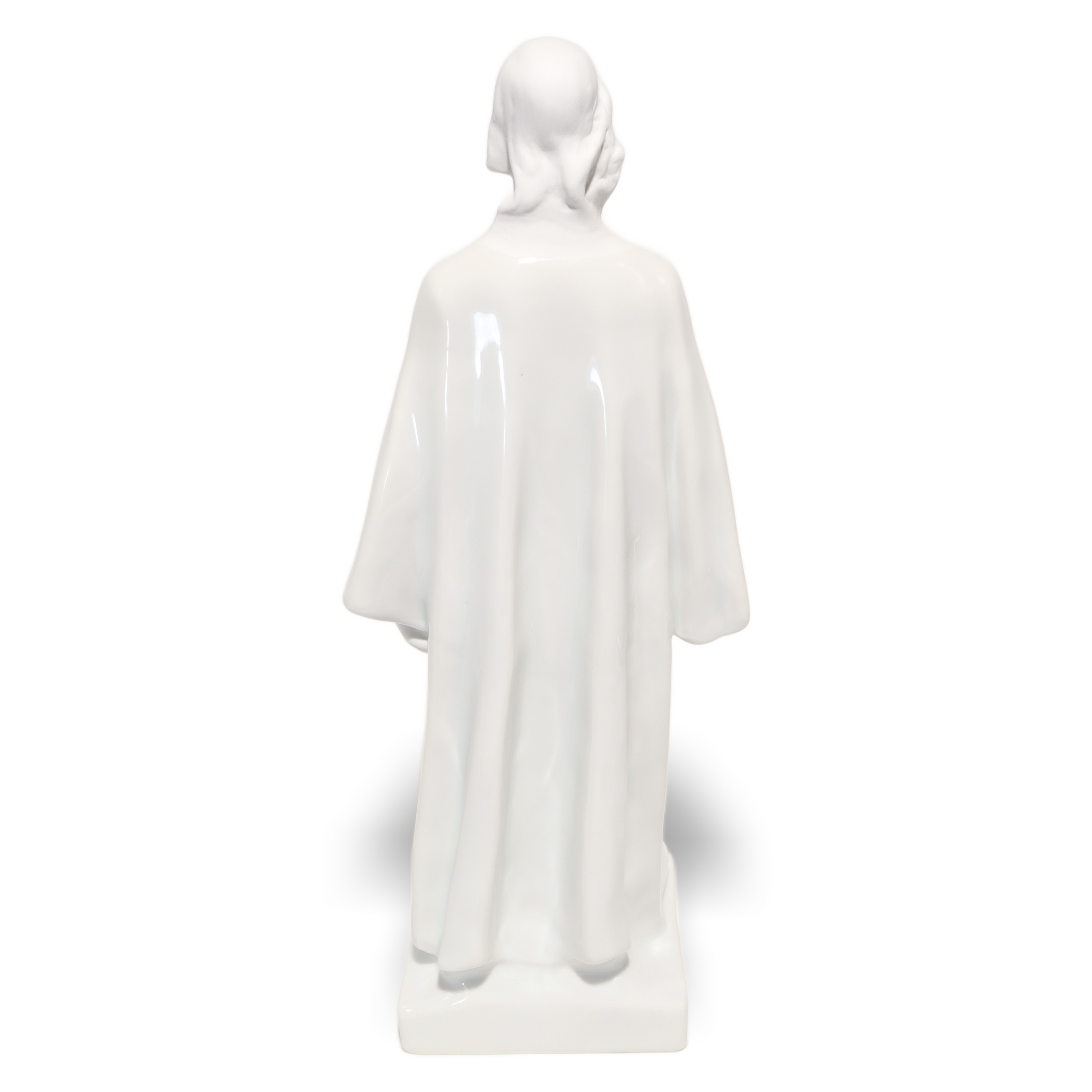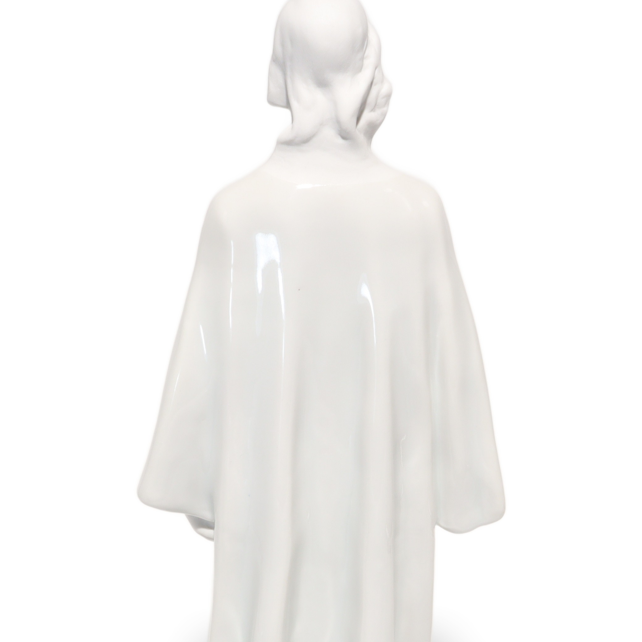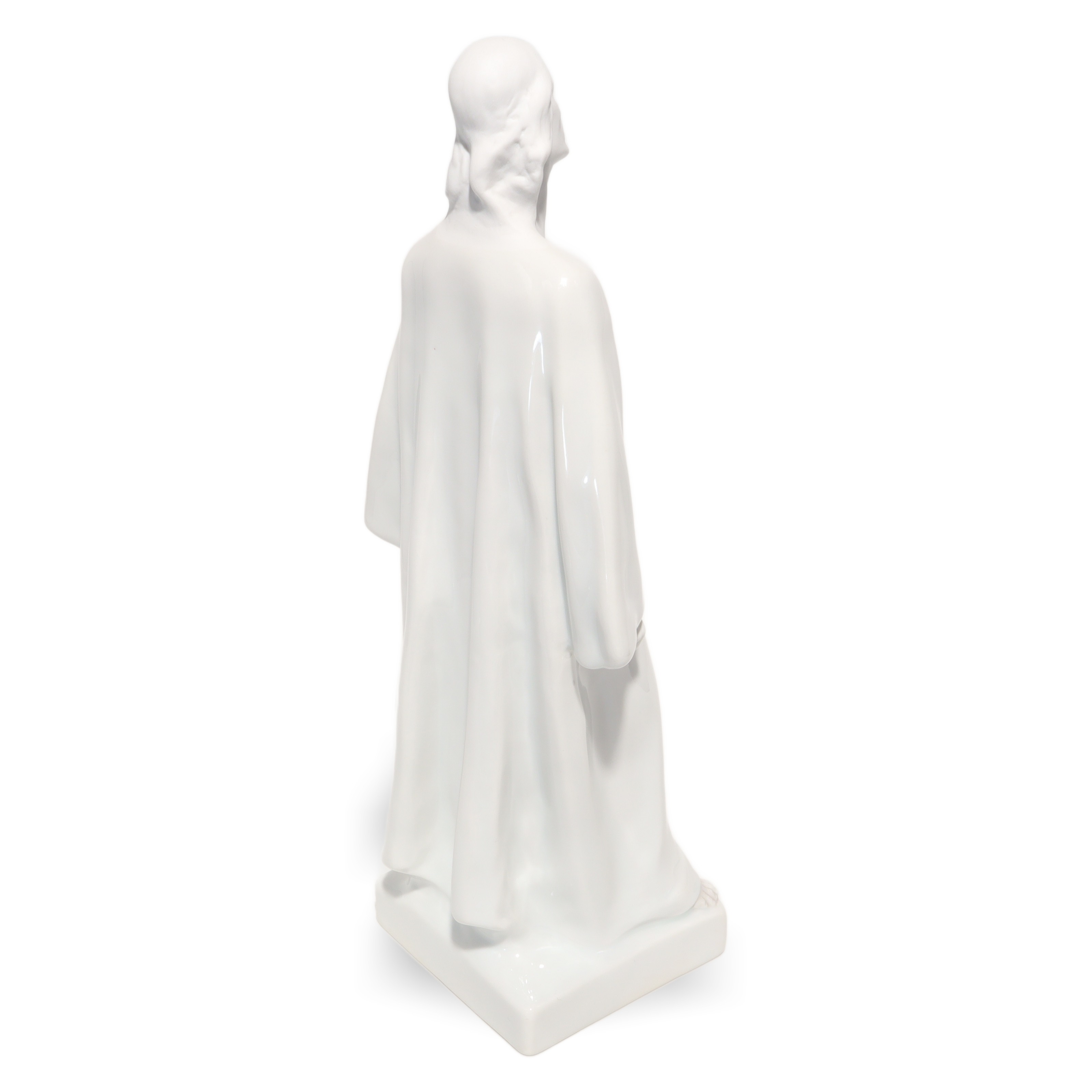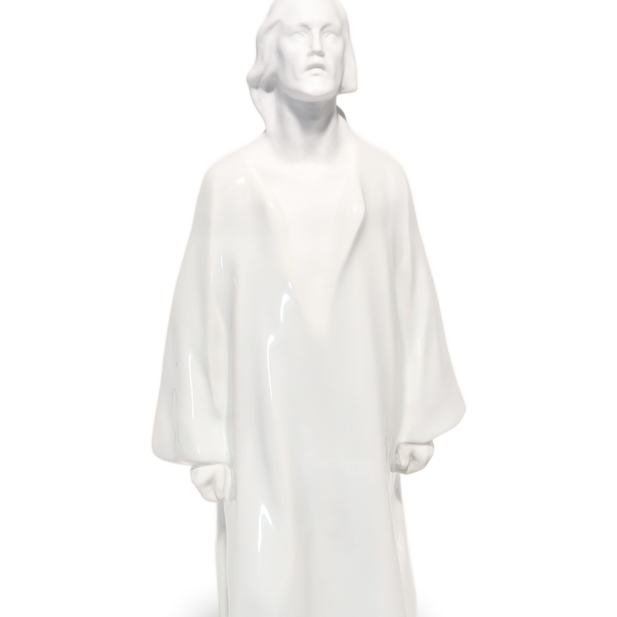 Jede Kante, Faltung des Gewands und die ruhig wirkende Körpersprache sind so ausgeführt, dass Licht und Schatten ihre volle Wirkung entfalten können. Das glänzende Porzellan reflektiert subtil das Umgebungslicht und verleiht der Figur eine sanfte Präsenz, fast einen Hauch von Spiritualität. Besonders auffällig sind die offenen, auf den Himmel gerichteten Augen – sie vermitteln eine tiefe Kontemplation und das Gefühl von Hoffnung und Vertrauen.