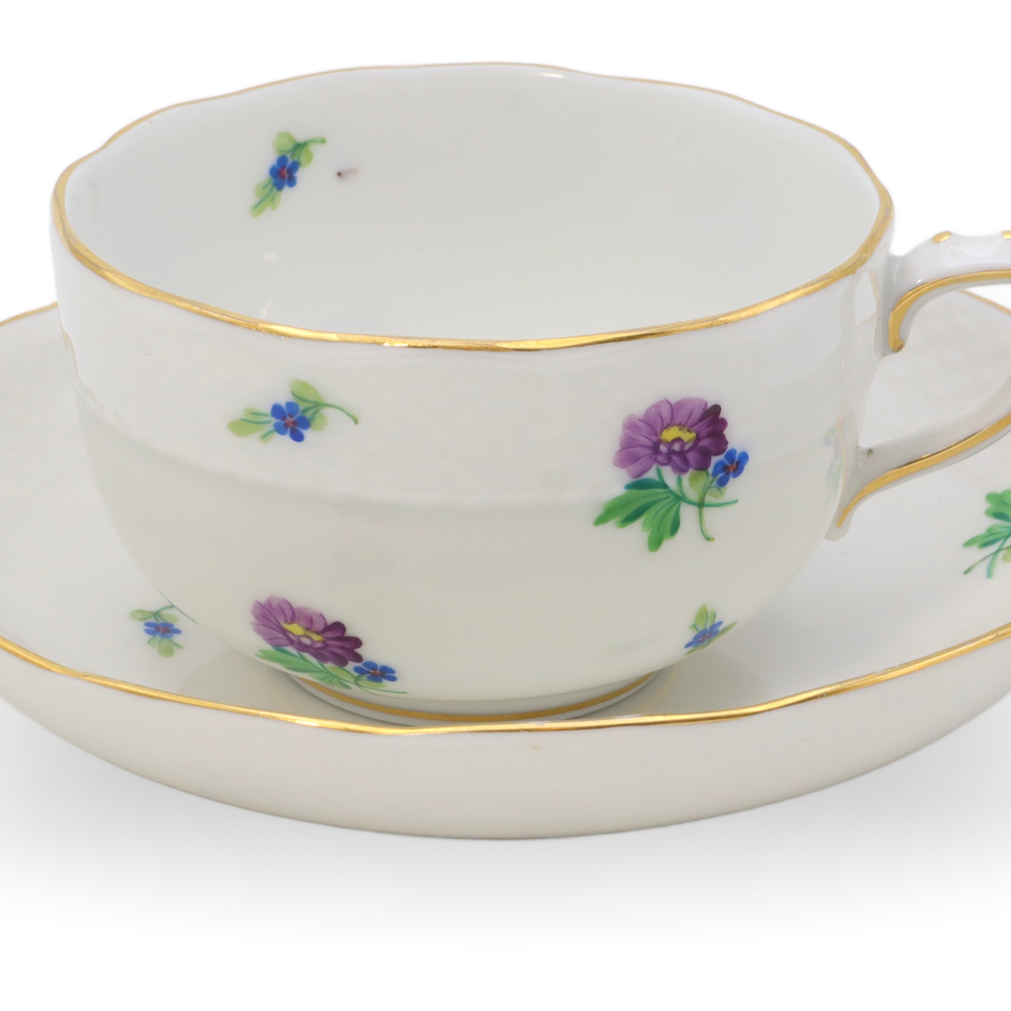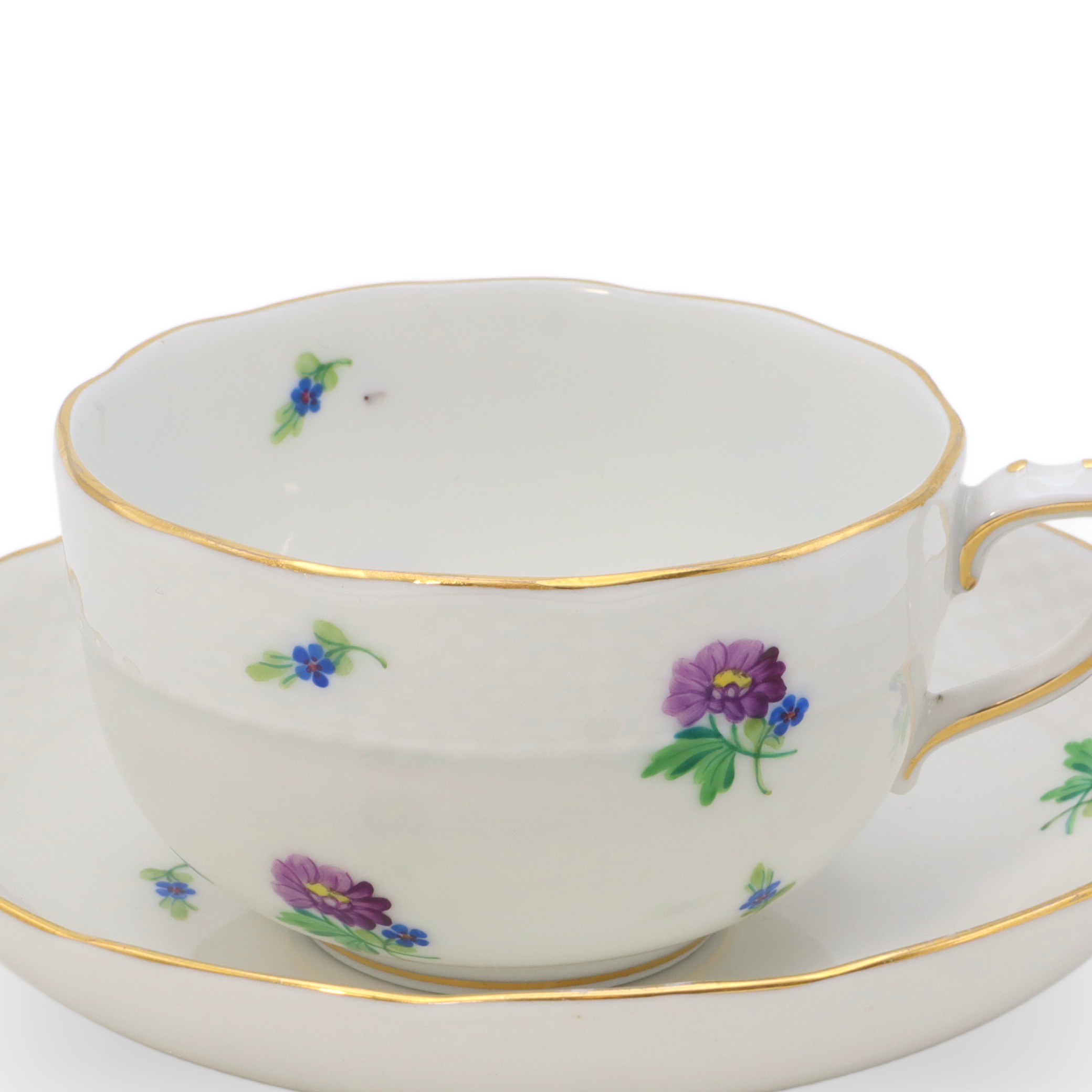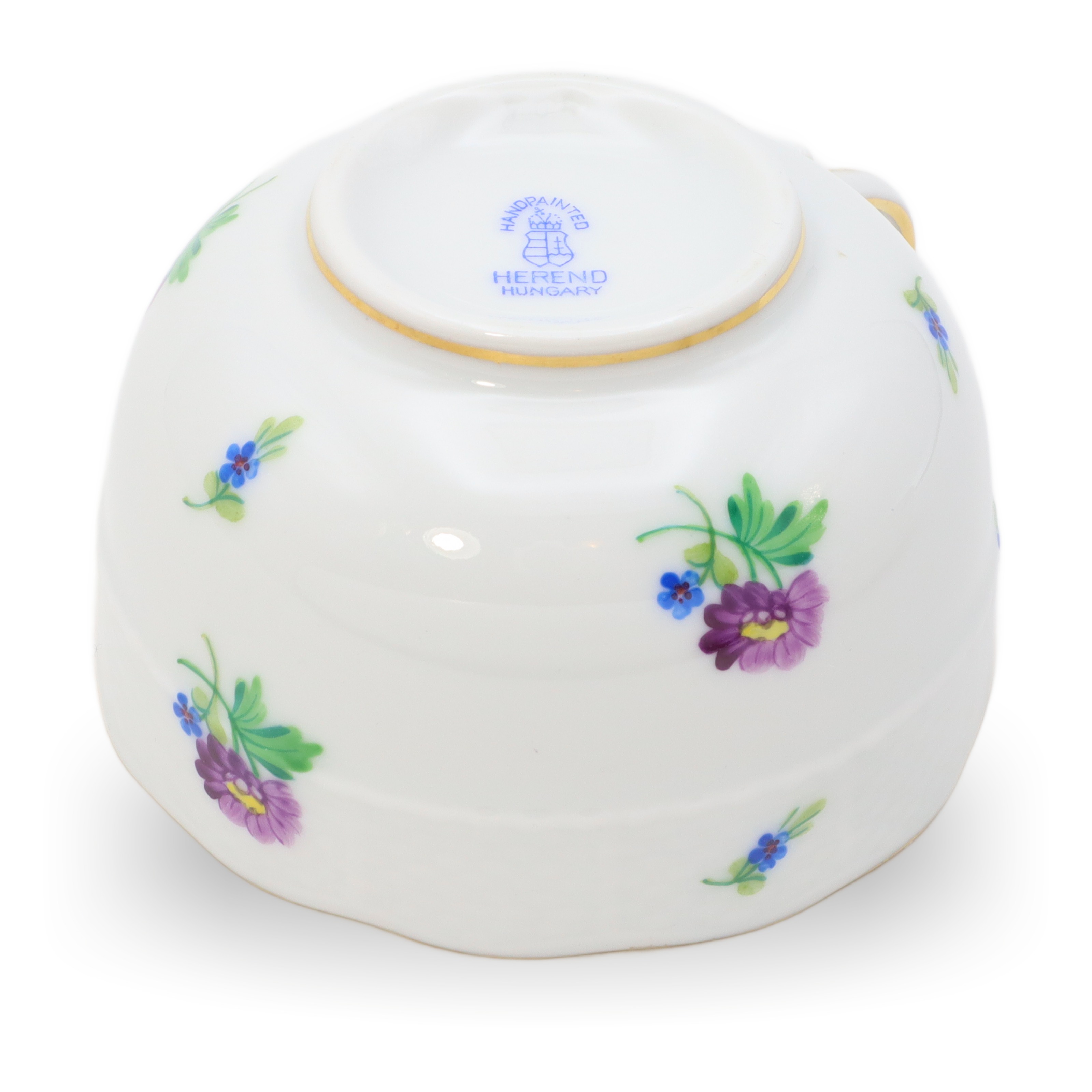 Besonders auffällig ist der feine Goldrand, der sich wie ein leuchtender Akzent an die Ränder von Tasse und Untertasse schmiegt. Die Form der Tasse, leicht facettiert und mit eleganter, eckiger Henkelgestaltung, ist typisch für Herend der 60er- und 70er-Jahre und lässt den Einfluss des Bauhauses und der Nachkriegsmoderne erkennen. Die Bemalung mit verschiedenfarbigen kleinen Blüten, darunter Veilchen und Astern, wurde mit äußerster Präzision ausgeführt. Kein Detail wirkt willkürlich, jedes Blütenmotiv wurde – wie bei Herend üblich – von Hand gesetzt. So ist jede Mille Fleur-Tasse ein Unikat.