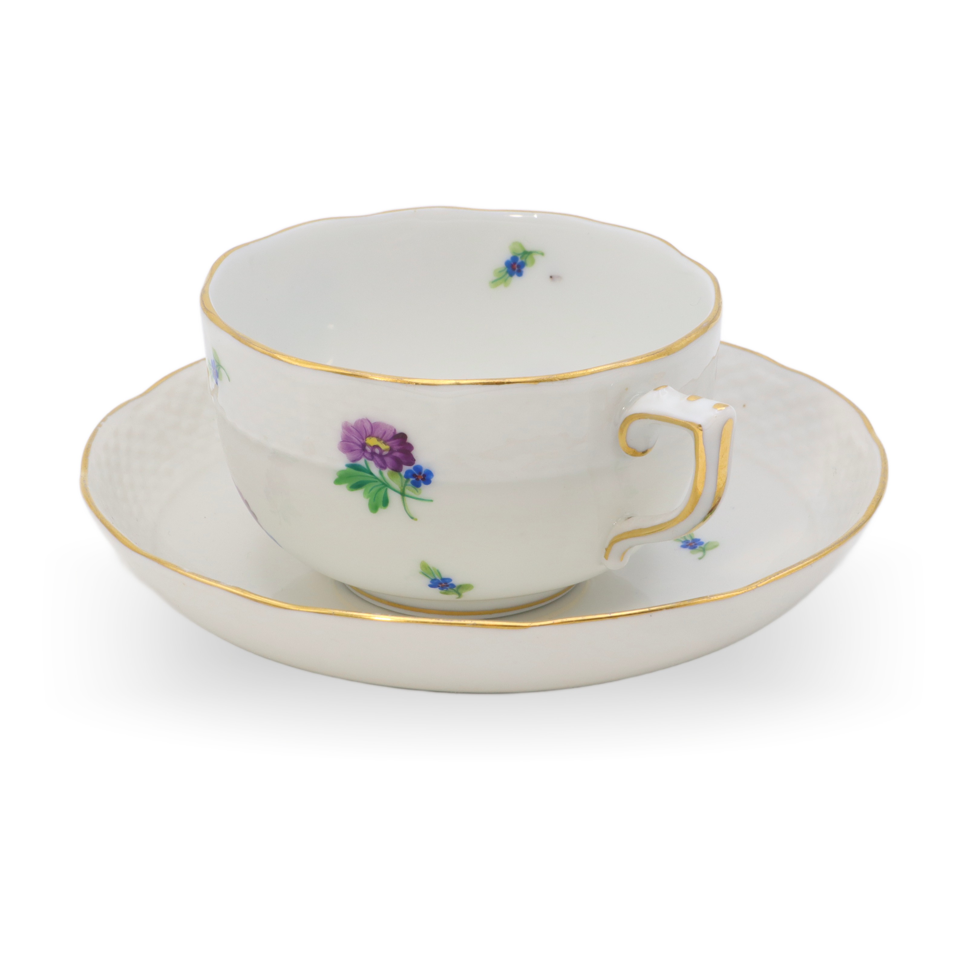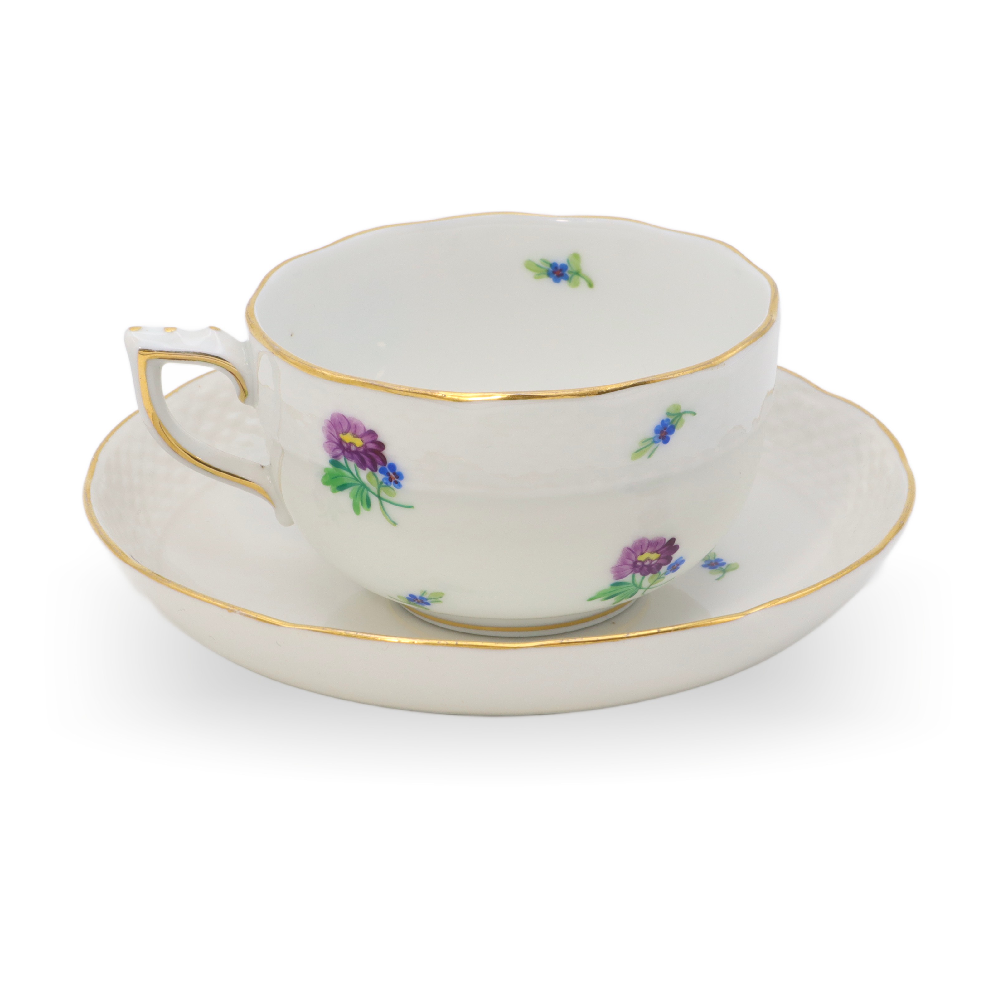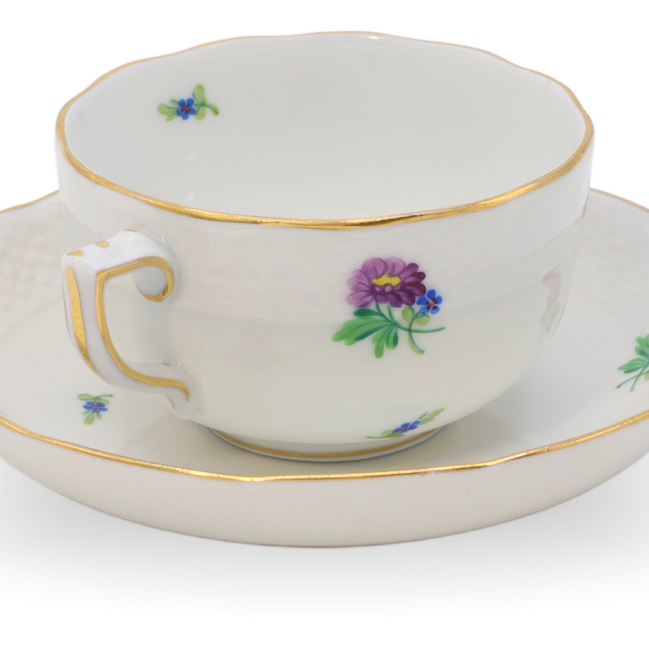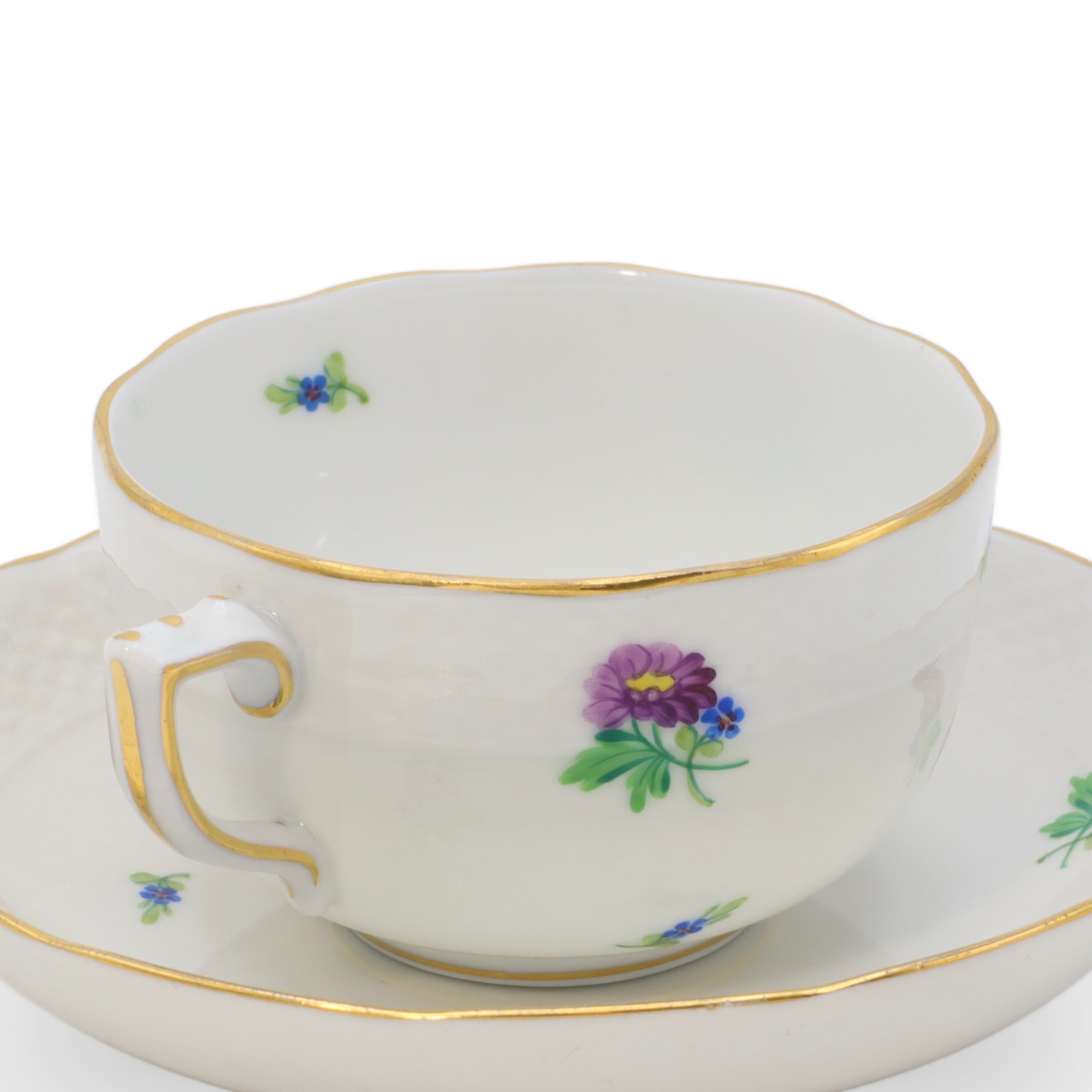 Die Tasse liegt angenehm in der Hand, die Materialdichte ist typisch für hochfeines Porzellan: dünnwandig, aber dennoch robust, beinahe durchsichtig gegen das Licht. Der Unterteller ist nicht bloß ein einfacher Untersatz, sondern wiederholt das Blumendekor und die goldene Linie, sodass ein harmonisches Ensemble entsteht, das sowohl in einer Vitrine zur Schau gestellt, wie auch im täglichen Gebrauch Freude bereitet. Die Farben des Dekors sind über die Jahrzehnte hinweg frisch und klar geblieben – ein Qualitätsmerkmal des Herender Porzellans, das auf weltweit einzigartige Glasur- und Brenntechniken zurückzuführen ist.