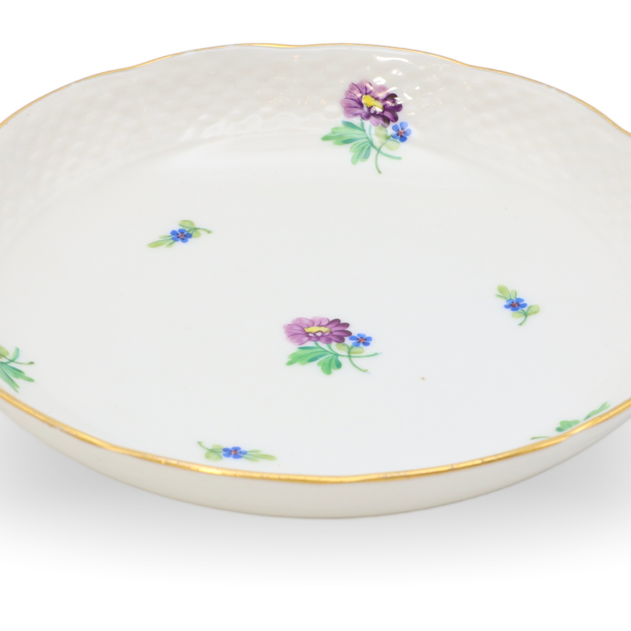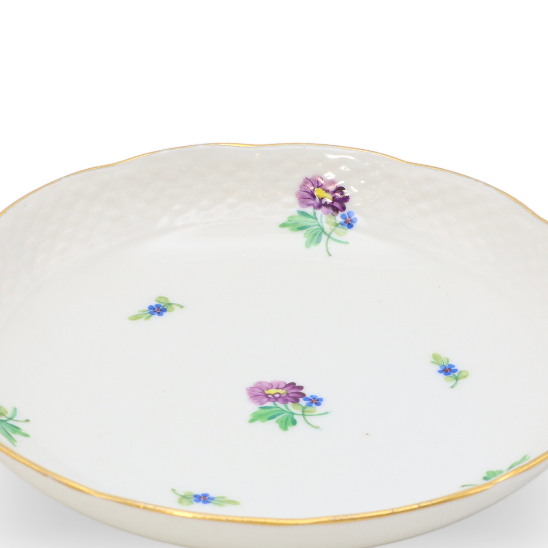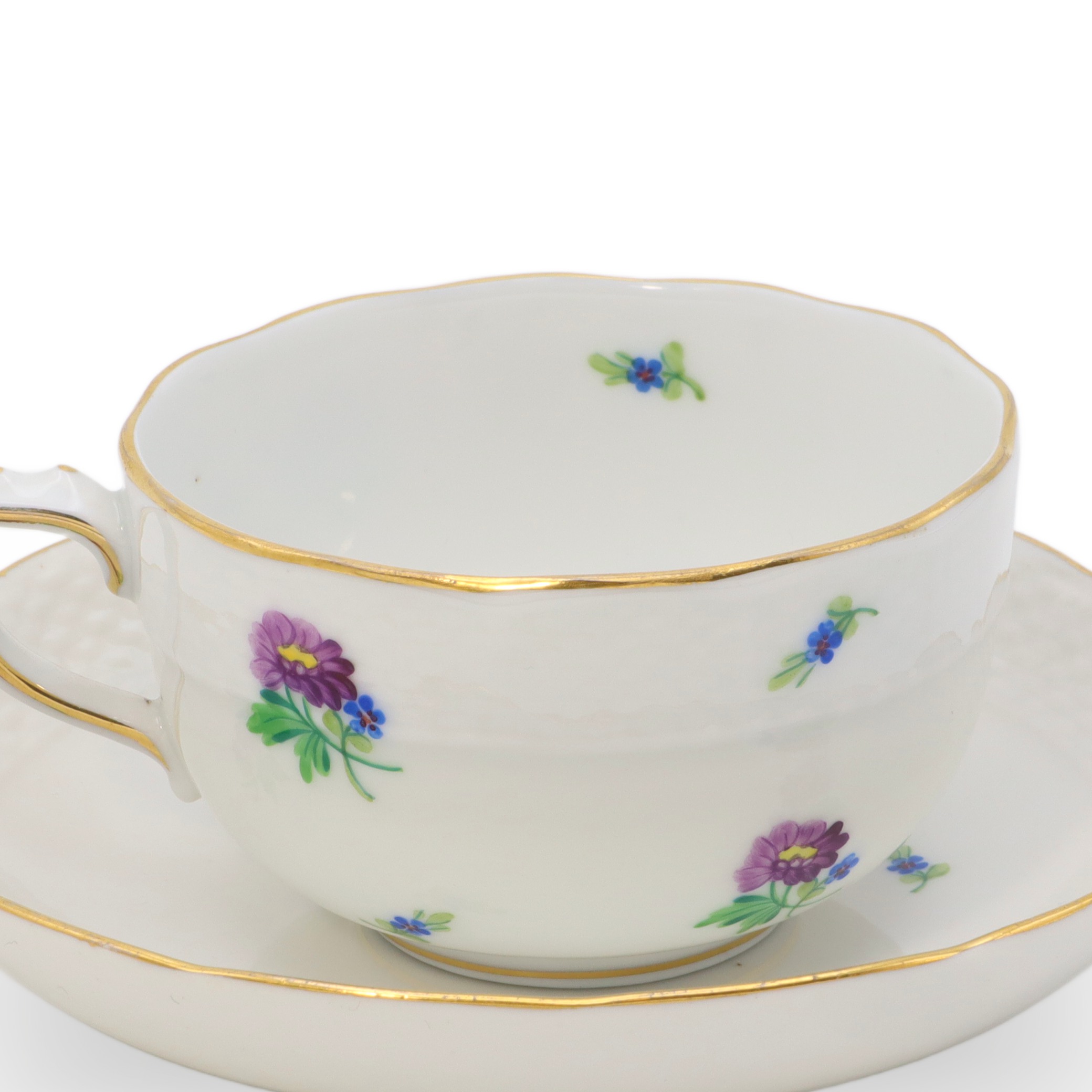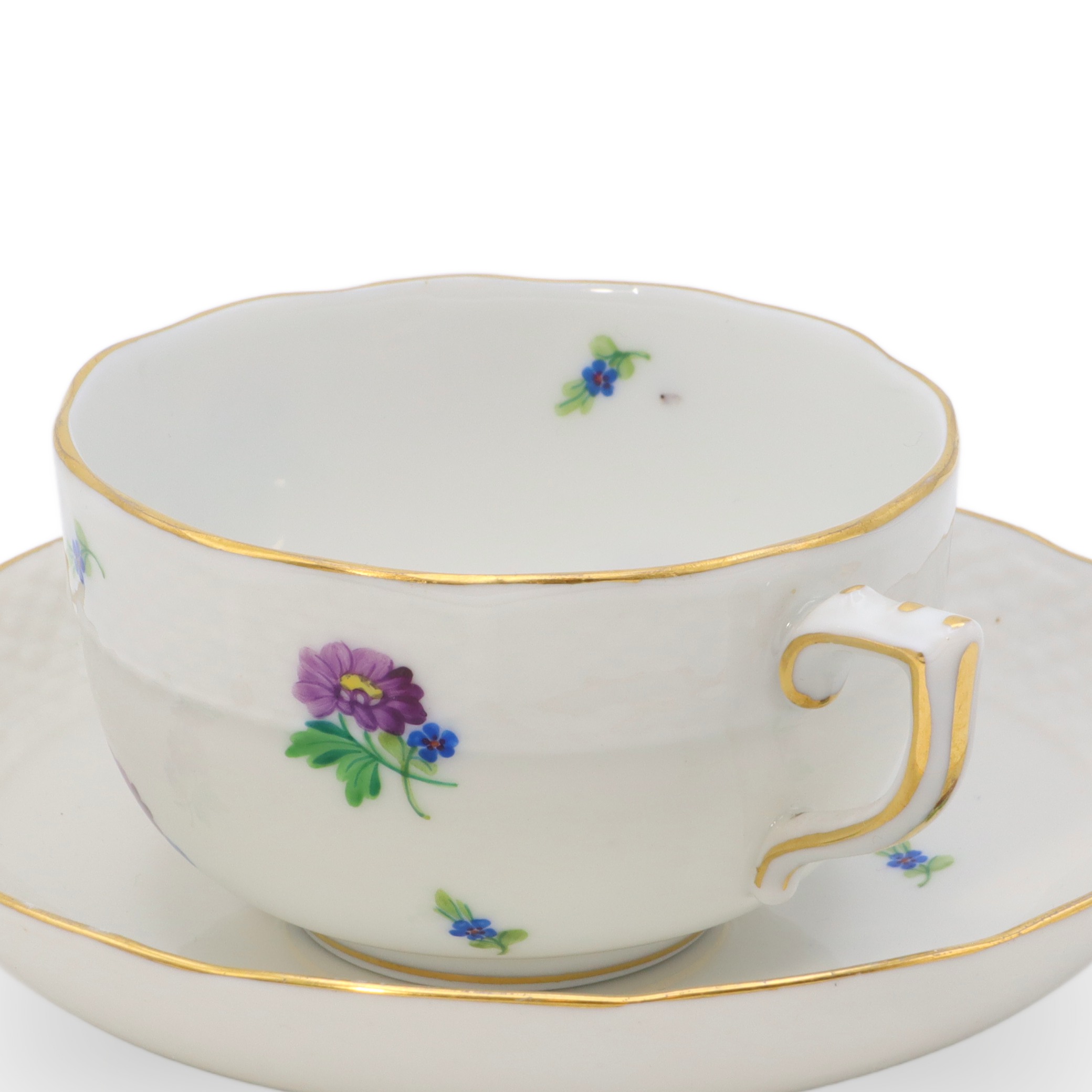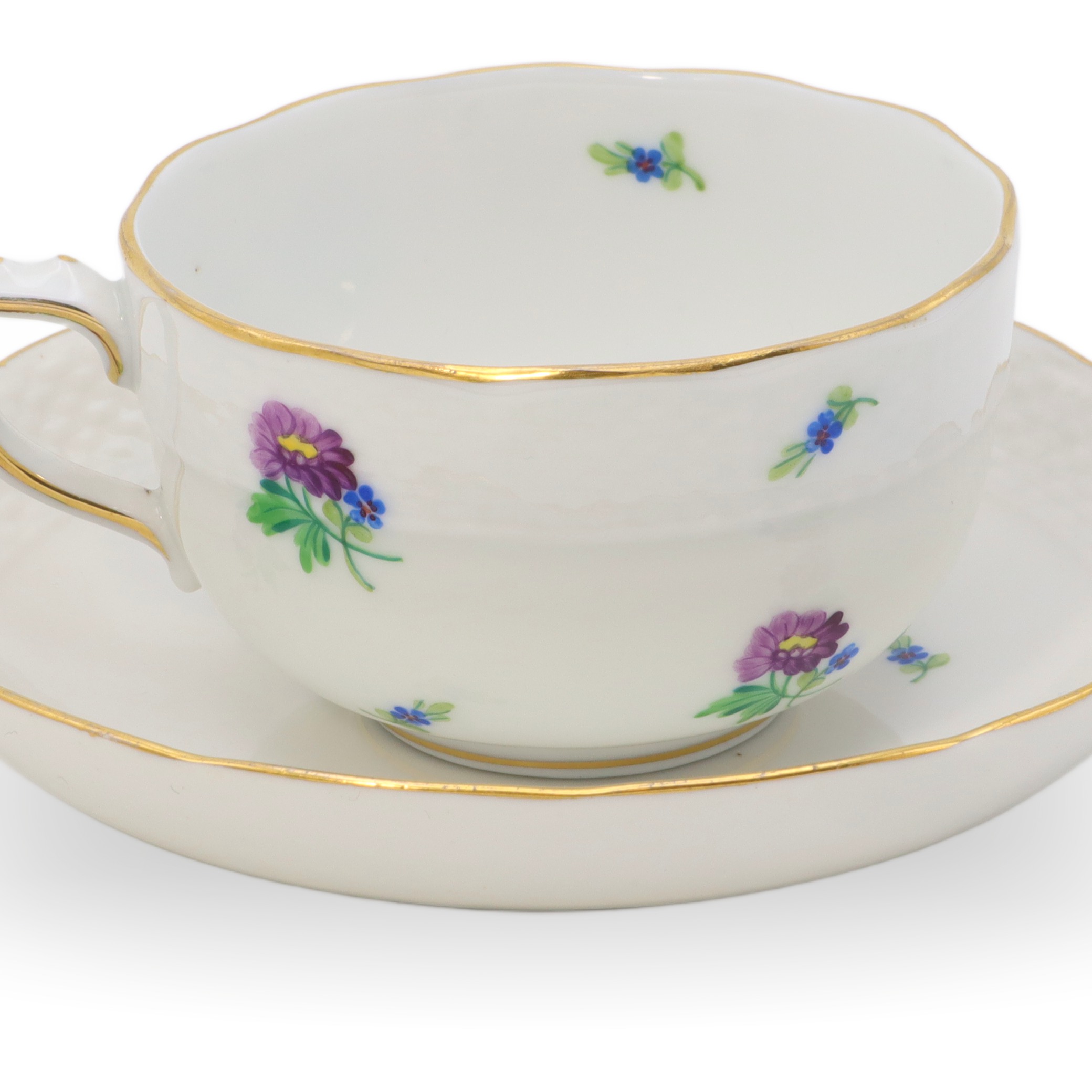 Die Tasse liegt angenehm in der Hand, die Materialdichte ist typisch für hochfeines Porzellan: dünnwandig, aber dennoch robust, beinahe durchsichtig gegen das Licht. Der Unterteller ist nicht bloß ein einfacher Untersatz, sondern wiederholt das Blumendekor und die goldene Linie, sodass ein harmonisches Ensemble entsteht, das sowohl in einer Vitrine zur Schau gestellt, wie auch im täglichen Gebrauch Freude bereitet. Die Farben des Dekors sind über die Jahrzehnte hinweg frisch und klar geblieben – ein Qualitätsmerkmal des Herender Porzellans, das auf weltweit einzigartige Glasur- und Brenntechniken zurückzuführen ist.