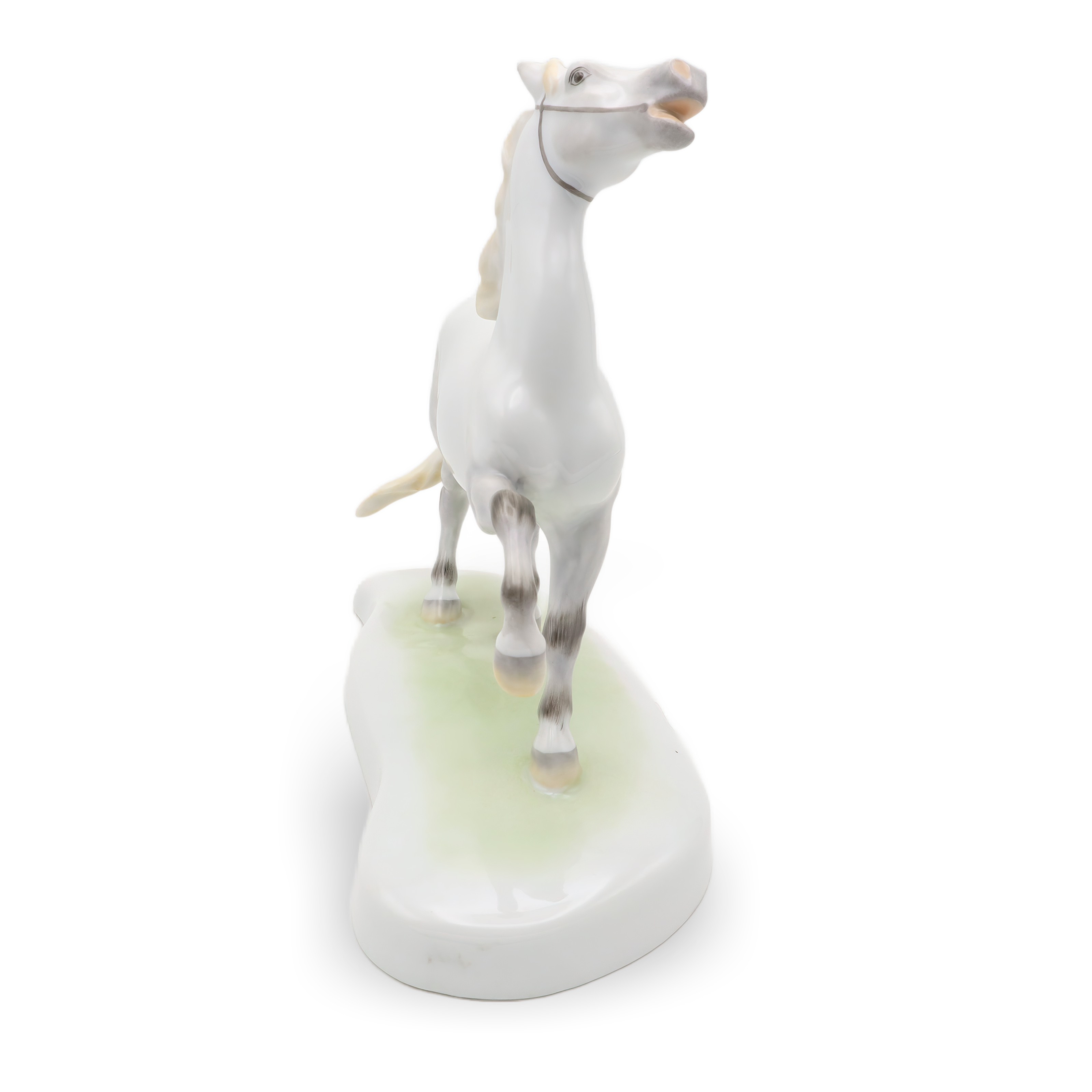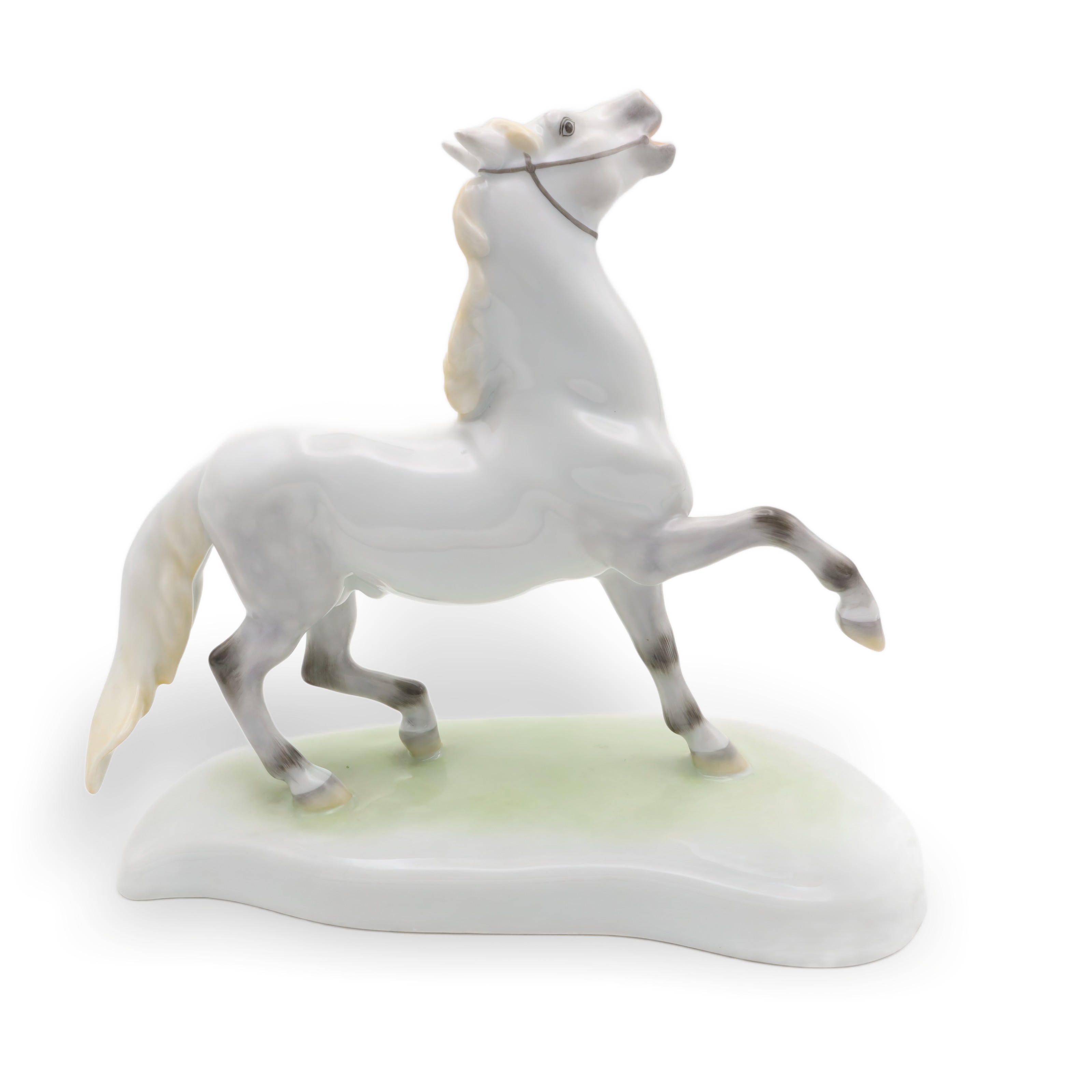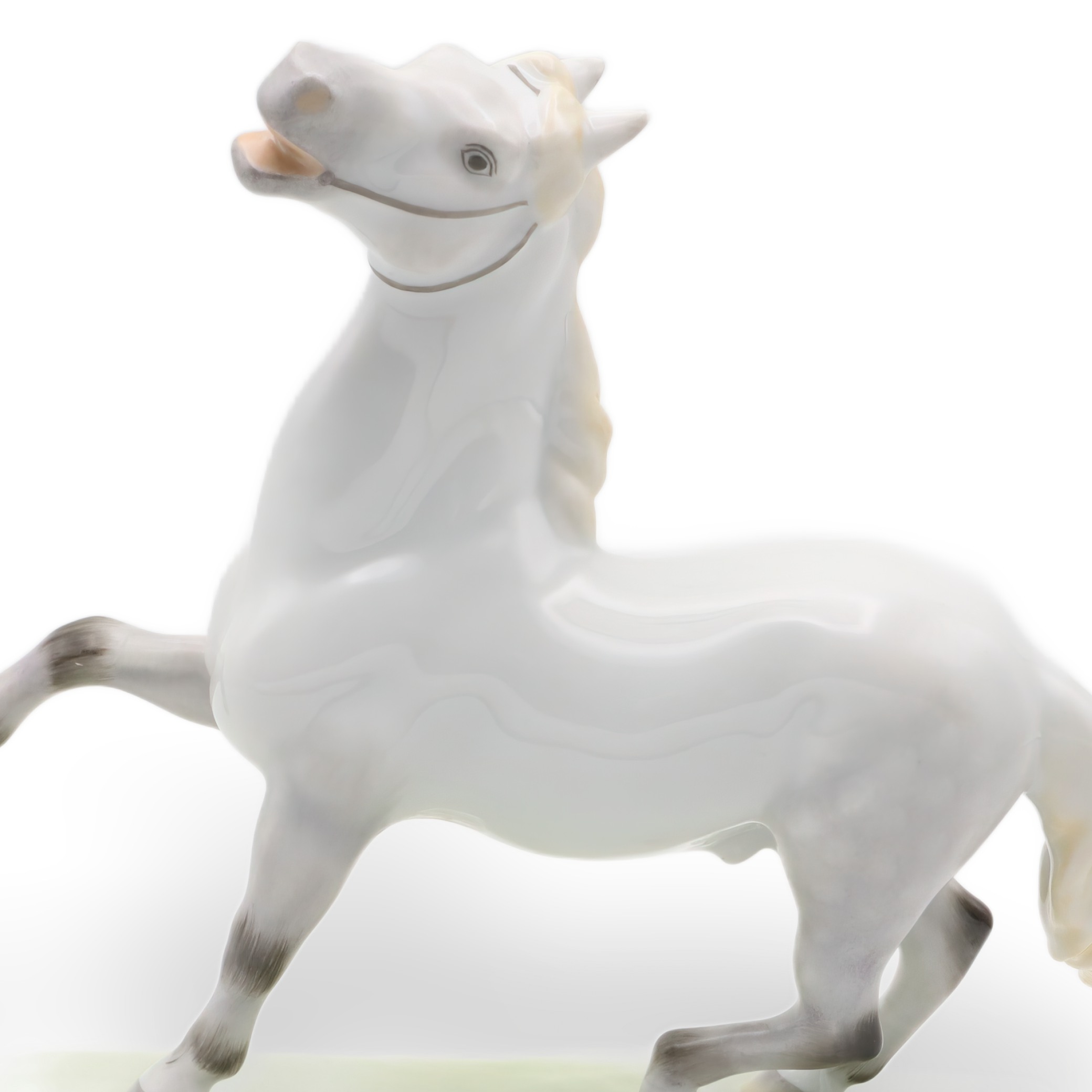 Die Figur ist fast neuwertig erhalten, was für ein über achtzig Jahre altes Sammlerstück alles andere als selbstverständlich ist. Das Porzellan zeigt einen sanften, seidigen Glanz, der weder durch Kratzer noch durch Abplatzer gestört wird. Besonders auffällig sind die harmonisch fließenden Übergänge der Bemalung: Die Beine des Pferdes sind sanft grau-schattiert, der Schweif setzt optische Akzente in pastelligem Beige, und der Sockel ist in zartem Grün gehalten, was dem Ganzen einen frühlingshaften Charakter verleiht. Die Maße betragen 17,5 cm in der Höhe und 17,5 cm in der Länge bei einer Breite von 7,5 cm – eine kompakte, aber trotzdem wirkungsvolle Figur, die sich perfekt auf dem Sideboard, im Regal oder als zentraler Blickfang in einer Vitrine macht.