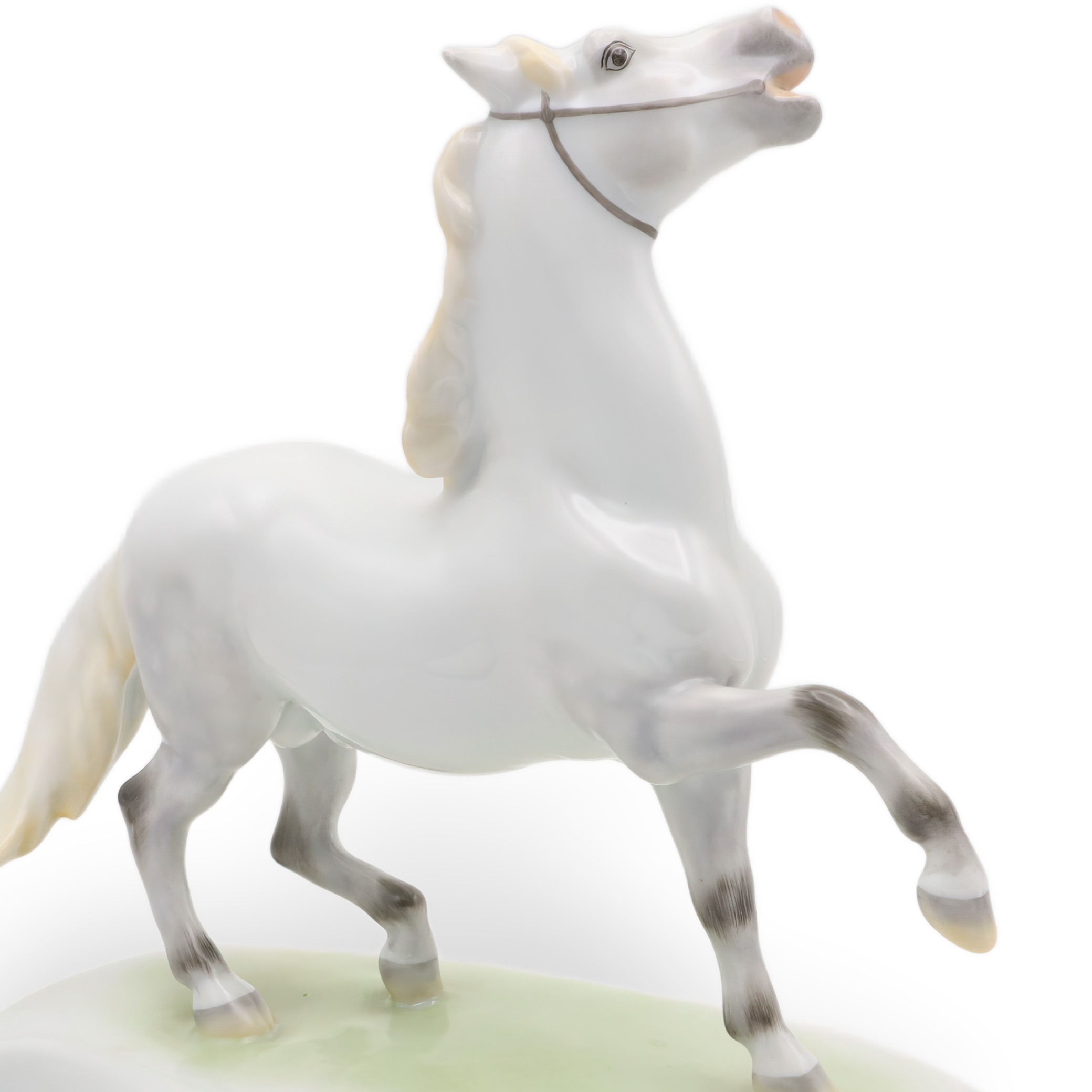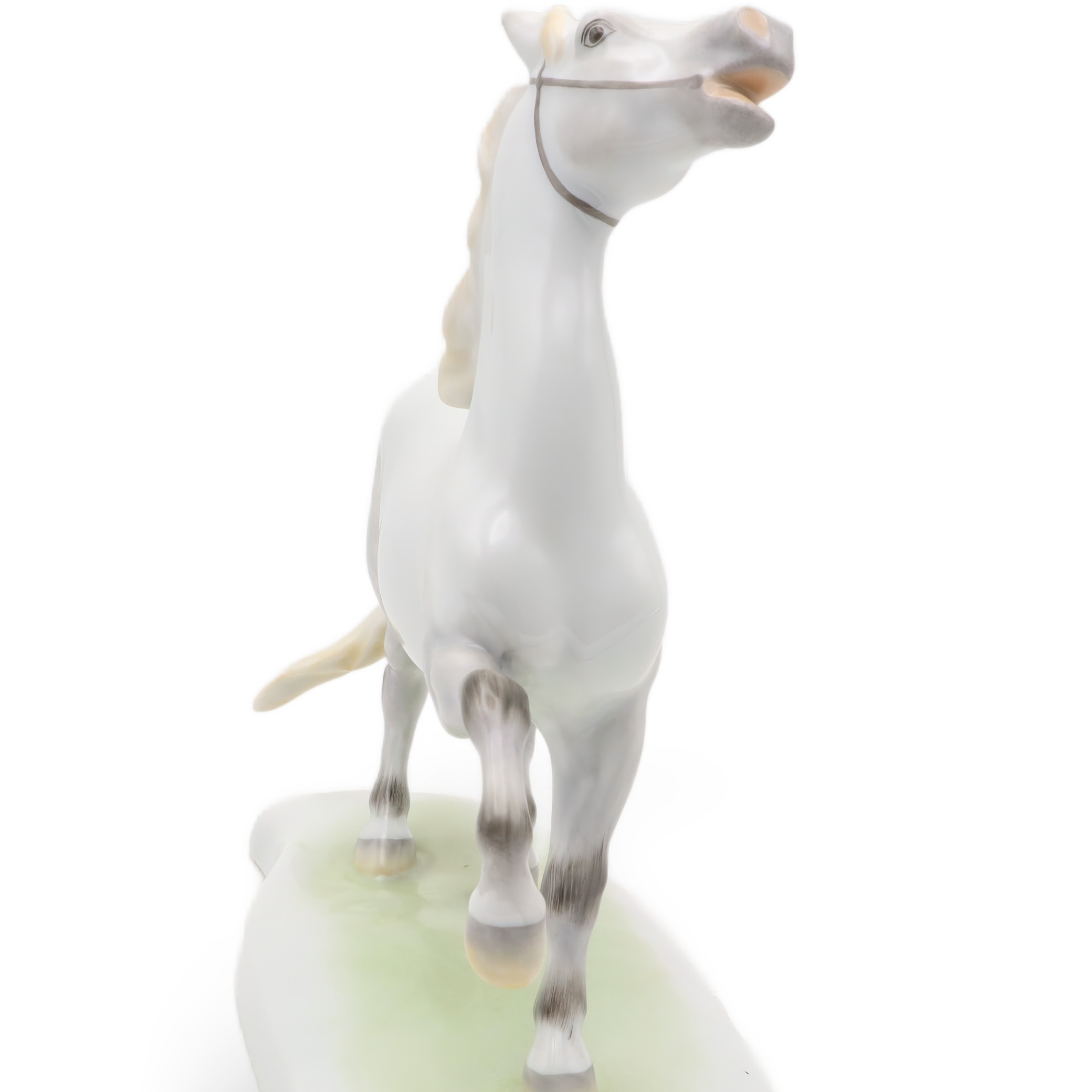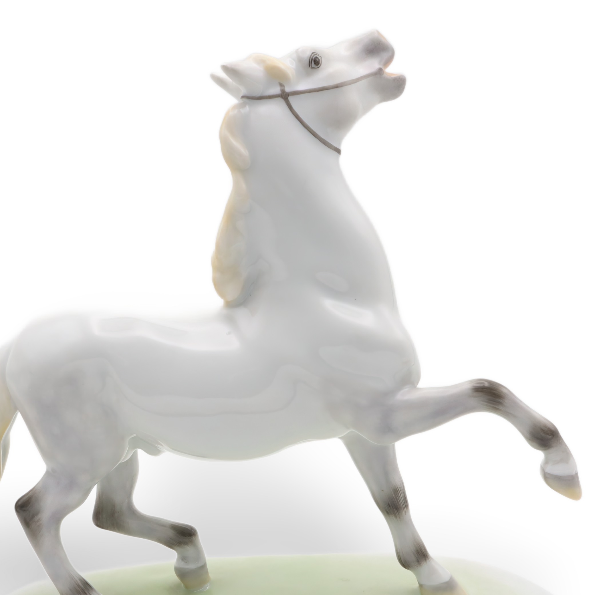 Die Figur ist fast neuwertig erhalten, was für ein über achtzig Jahre altes Sammlerstück alles andere als selbstverständlich ist. Das Porzellan zeigt einen sanften, seidigen Glanz, der weder durch Kratzer noch durch Abplatzer gestört wird. Besonders auffällig sind die harmonisch fließenden Übergänge der Bemalung: Die Beine des Pferdes sind sanft grau-schattiert, der Schweif setzt optische Akzente in pastelligem Beige, und der Sockel ist in zartem Grün gehalten, was dem Ganzen einen frühlingshaften Charakter verleiht. Die Maße betragen 17,5 cm in der Höhe und 17,5 cm in der Länge bei einer Breite von 7,5 cm – eine kompakte, aber trotzdem wirkungsvolle Figur, die sich perfekt auf dem Sideboard, im Regal oder als zentraler Blickfang in einer Vitrine macht.