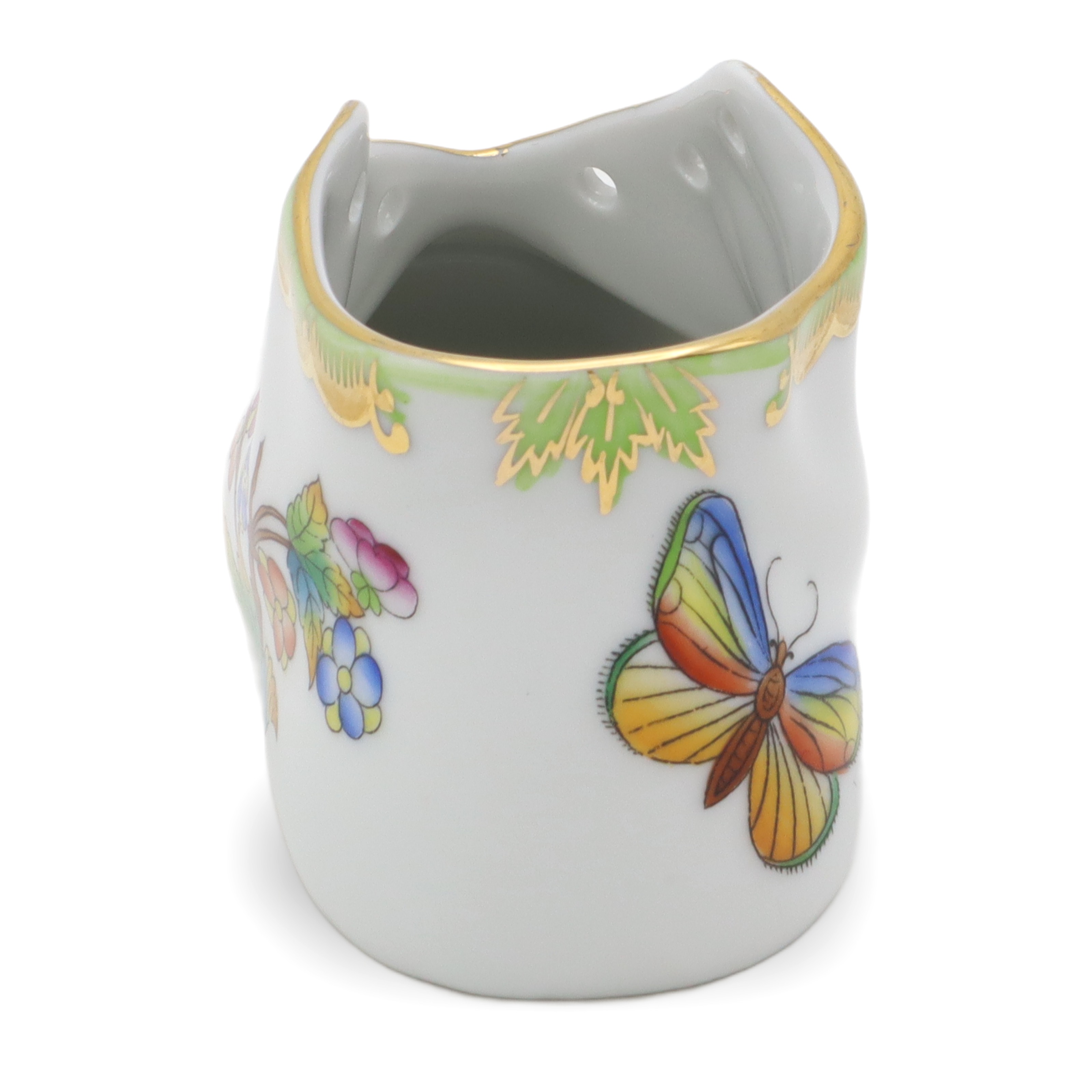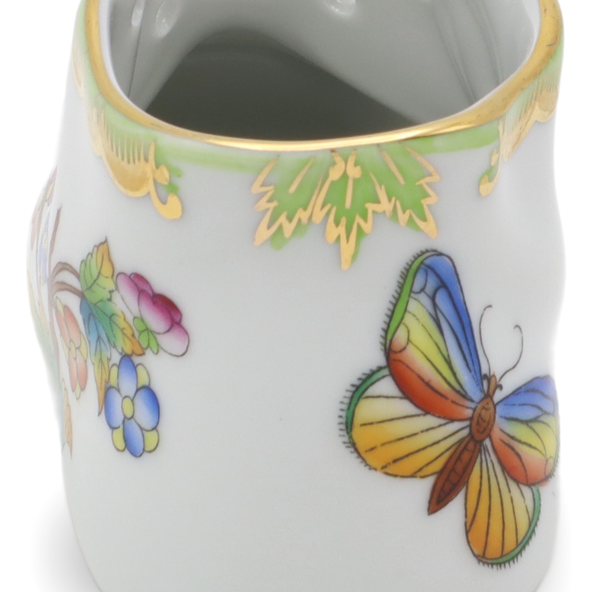 Das Dekor ist ein Meisterwerk des Herend-typischen Handwerks und strahlt in klaren, satten Farben. Die floralen Ornamente sind von Hand mit größter Präzision und Liebe zum Detail gemalt. Knallige Blüten, grüne Blätter und ein farbenfroher Schmetterling zeugen von der berühmten Queen Victoria Linie, die sich durch ihre außergewöhnliche Vielseitigkeit und Eleganz auszeichnet. Die goldenen Ränder sind zart von Hand aufgetragen und verleihen dem Objekt eine exklusive Note – ein Röhrchen Gold, das nur noch von traditionellen Porzellanmalern in Herend verwendet wird.