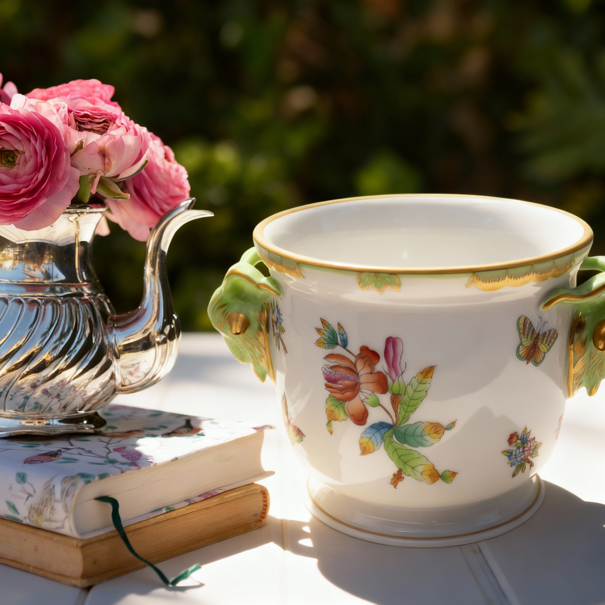 Du kannst diesen Cachepot vielseitig in Szene setzen: als luxuriöses Pflanzgefäß für edle Orchideen, als ungewöhnliches Dekorationsobjekt auf einem Sideboard oder, ganz klassisch, als Blickfang in einer Vitrine. In jedem Fall bringst du zeitlose Eleganz und Geschichte in deine Räume. Solche Herend-Unikate mit Queen Victoria Muster, vor allem mit den seltenen Widdergriffen und aus so frühem Datum, tauchen nur äußerst selten am Markt auf – und meist nur in musealen Sammlungen.