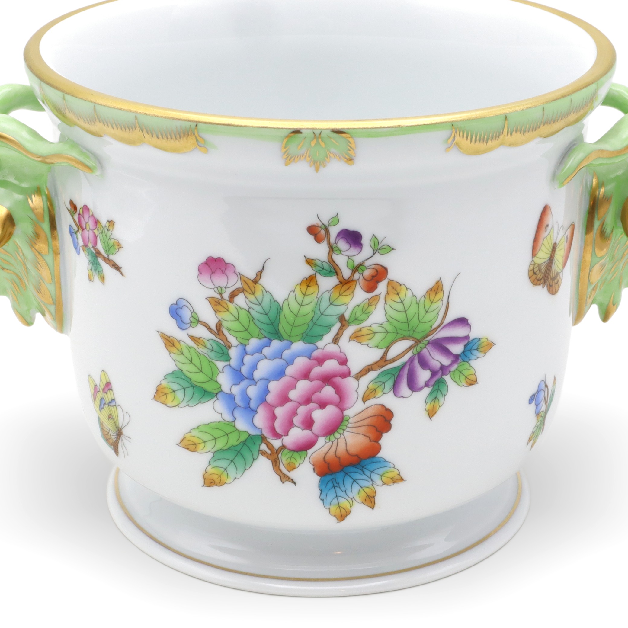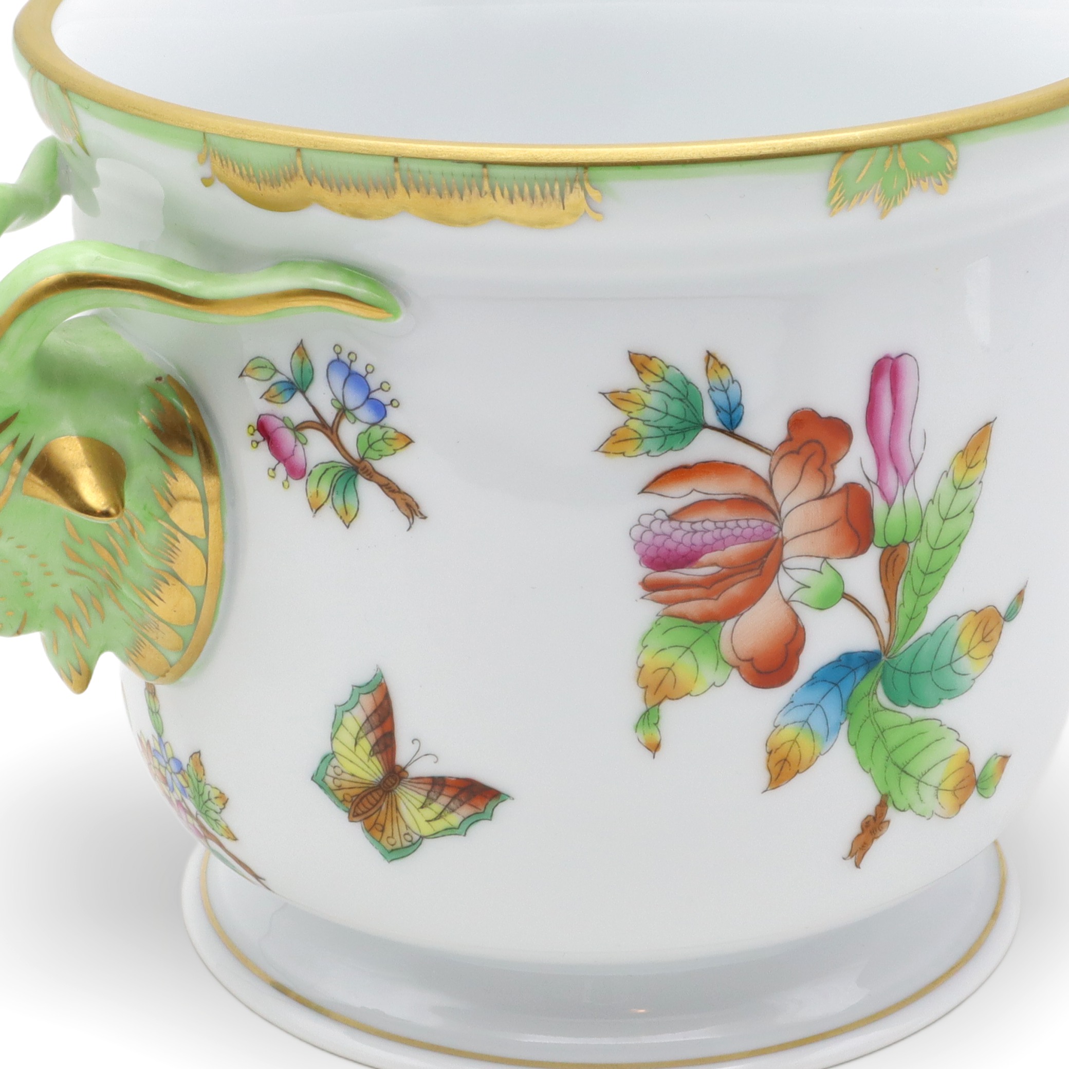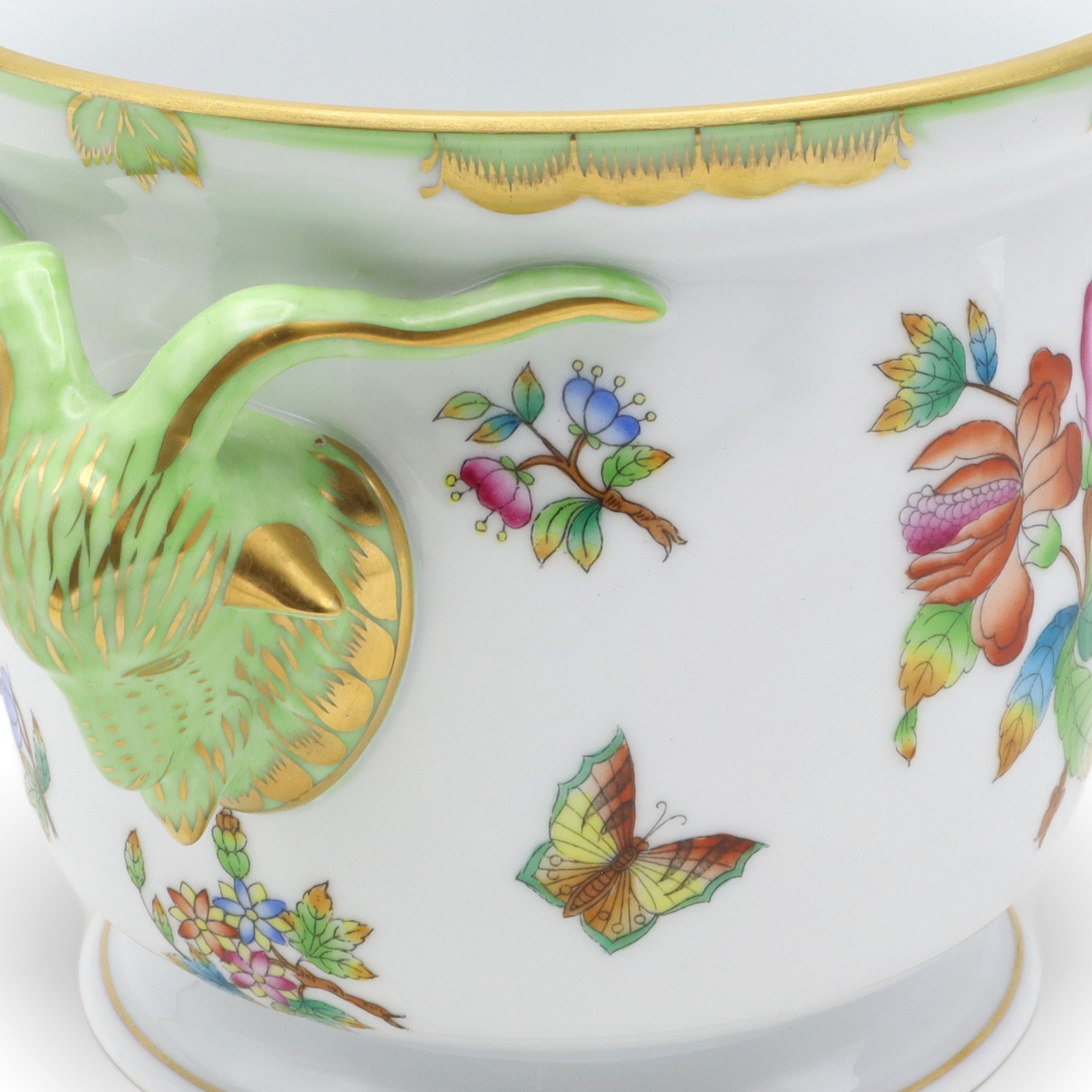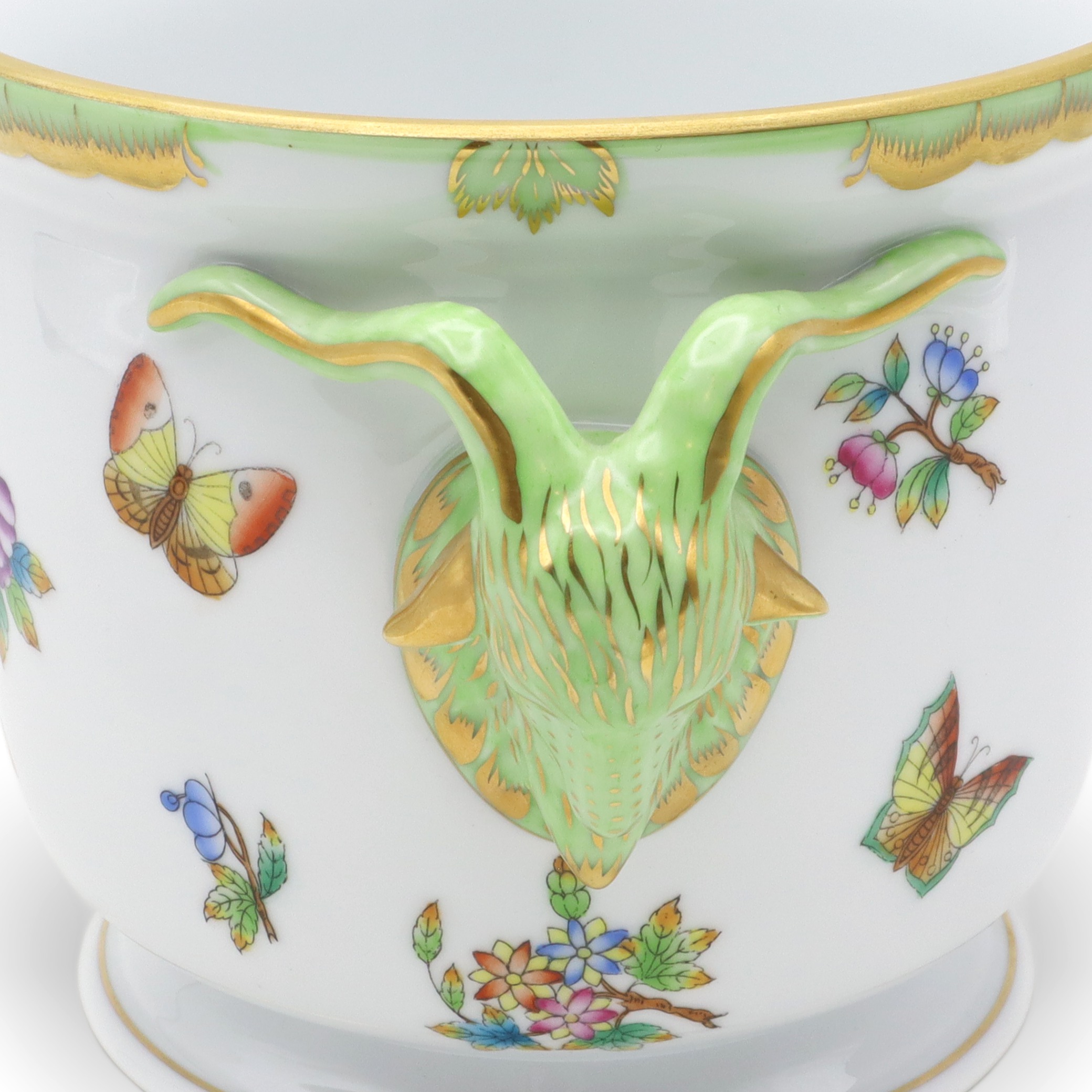 Der Cachepot misst 12,5 cm in der Höhe, 20 cm in der Breite sowie 13,75 cm in der Länge und im Durchmesser. Sein Zustand ist nahezu neuwertig – eine kleine Sensation, bedenkt man, dass dieses Meisterwerk bereits mehr als 70 Jahre alt ist. Die klassische Form und die umlaufende Bemalung werden sofort alle Blicke auf sich ziehen: Das Porzellan erstrahlt in leuchtendem Weiß. Besonders charakteristisch ist das unverkennbare Queen Victoria Dekor, das farbenfrohe Blüten, exotische Schmetterlinge und feine, goldene Akzente miteinander verbindet. Jede Malerei ist ein Unikat, denn bei Herend wurde – und wird bis heute – jedes Stück von Hand bemalt. Die floralen Motive wirken beinahe lebendig und bringen einen Hauch von Frühling ins Haus, egal zu welcher Jahreszeit.
