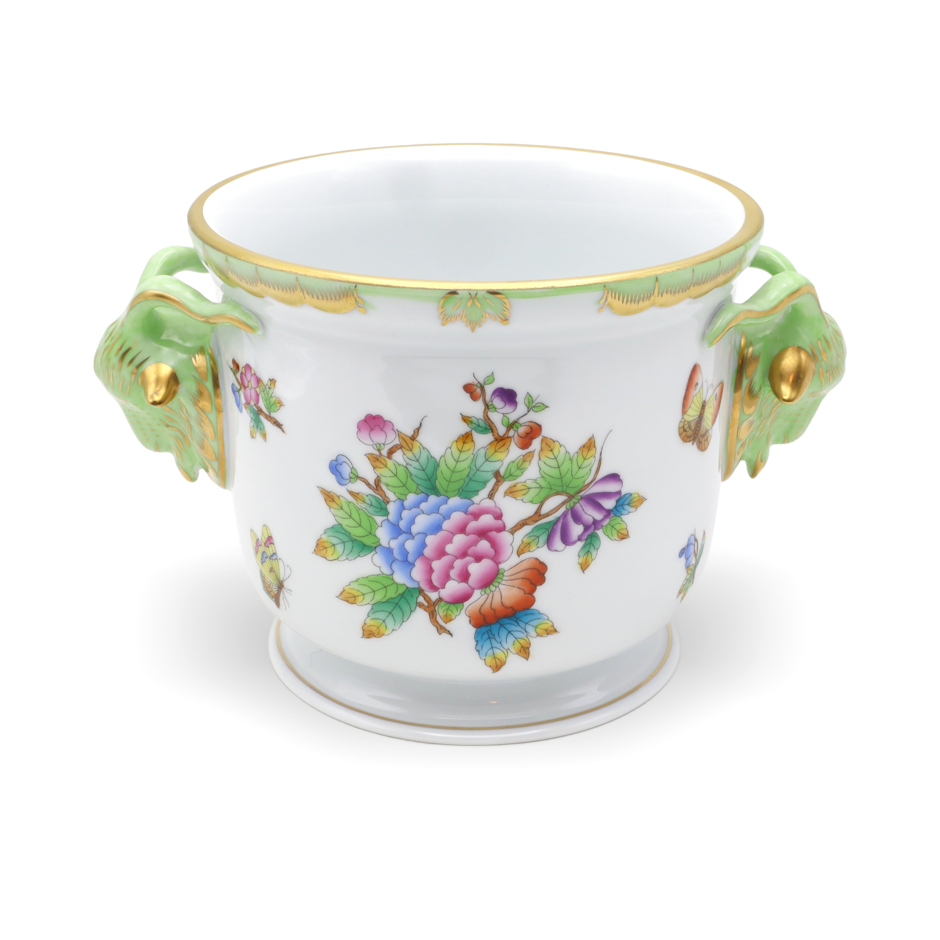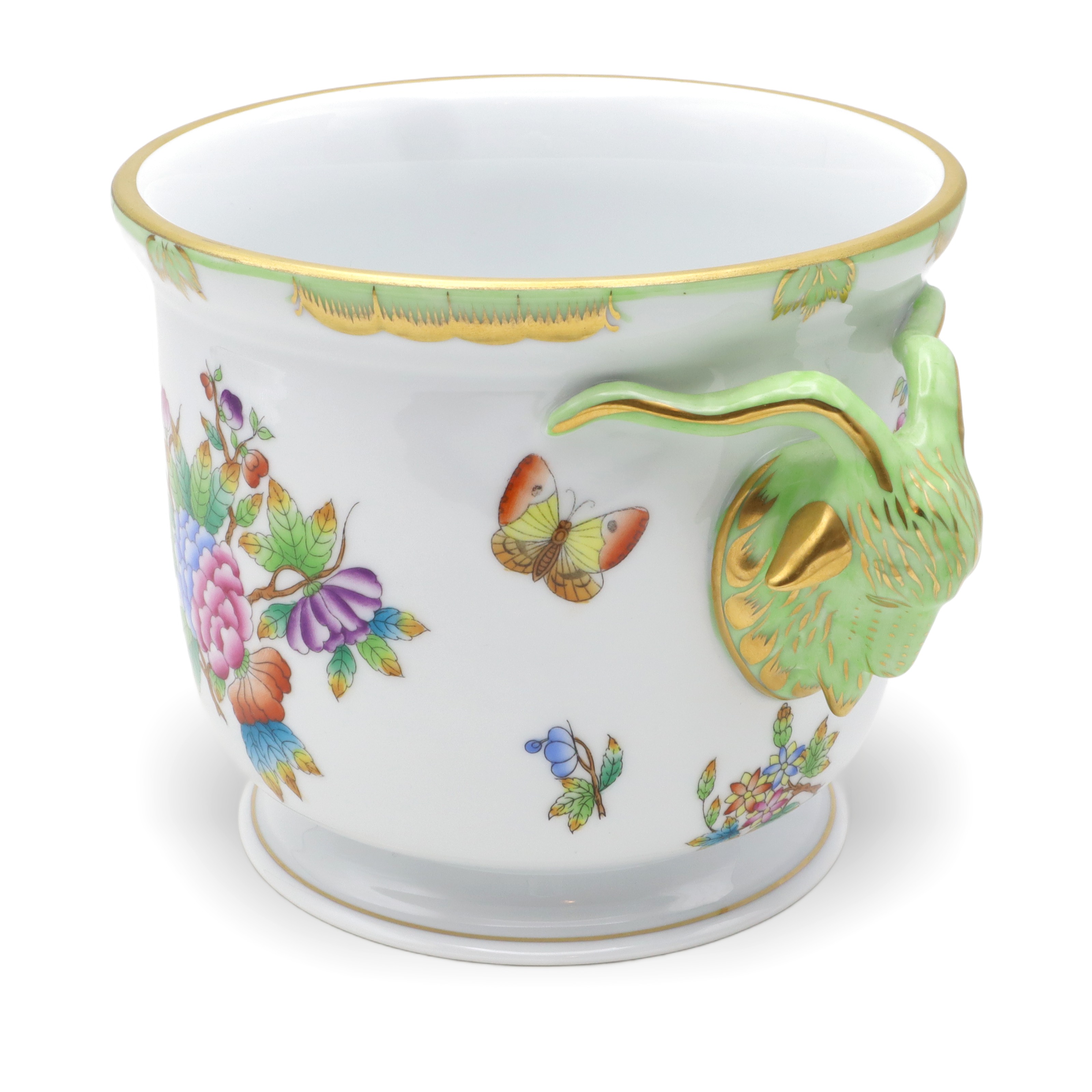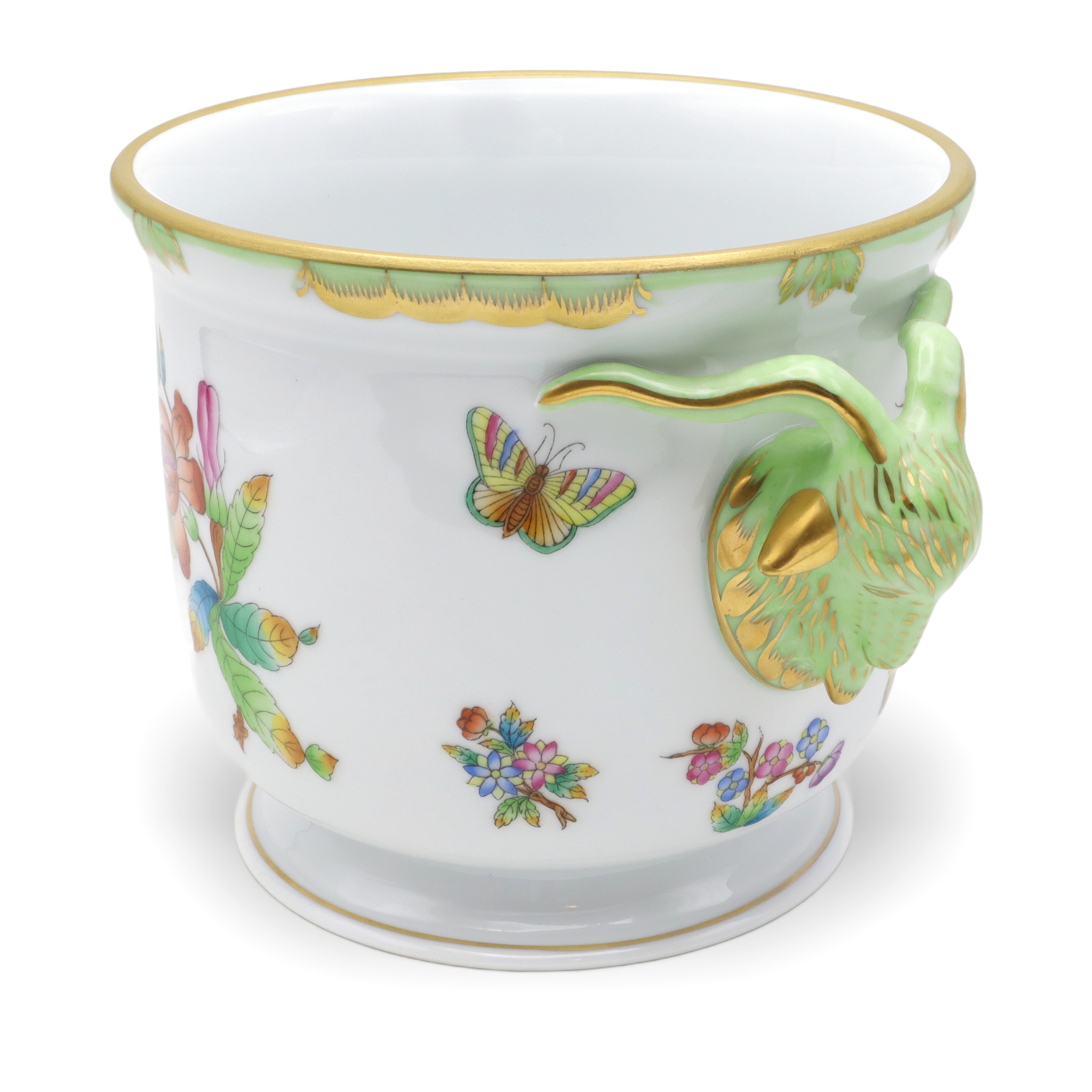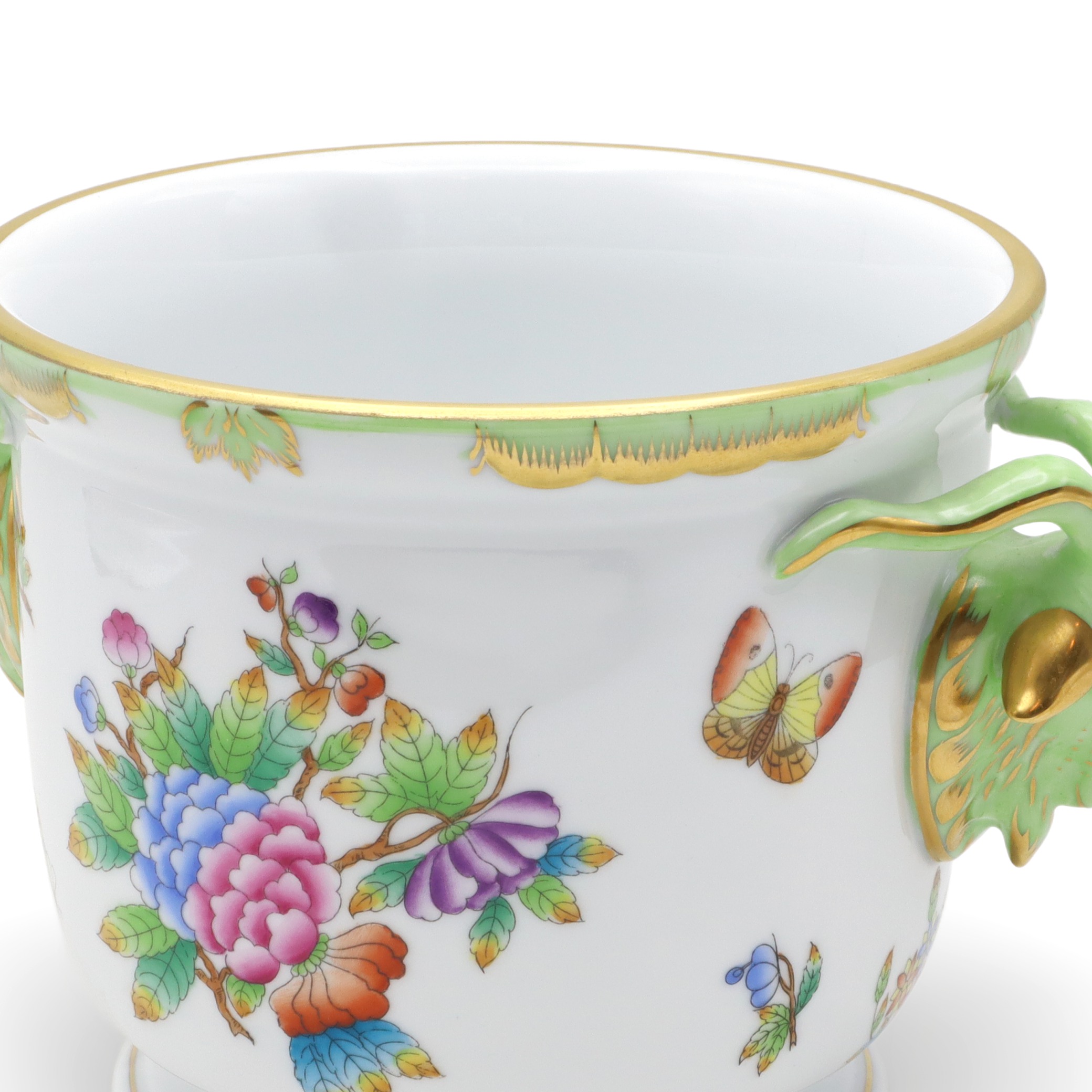 Der Cachepot misst 12,5 cm in der Höhe, 20 cm in der Breite sowie 13,75 cm in der Länge und im Durchmesser. Sein Zustand ist nahezu neuwertig – eine kleine Sensation, bedenkt man, dass dieses Meisterwerk bereits mehr als 70 Jahre alt ist. Die klassische Form und die umlaufende Bemalung werden sofort alle Blicke auf sich ziehen: Das Porzellan erstrahlt in leuchtendem Weiß. Besonders charakteristisch ist das unverkennbare Queen Victoria Dekor, das farbenfrohe Blüten, exotische Schmetterlinge und feine, goldene Akzente miteinander verbindet. Jede Malerei ist ein Unikat, denn bei Herend wurde – und wird bis heute – jedes Stück von Hand bemalt. Die floralen Motive wirken beinahe lebendig und bringen einen Hauch von Frühling ins Haus, egal zu welcher Jahreszeit.