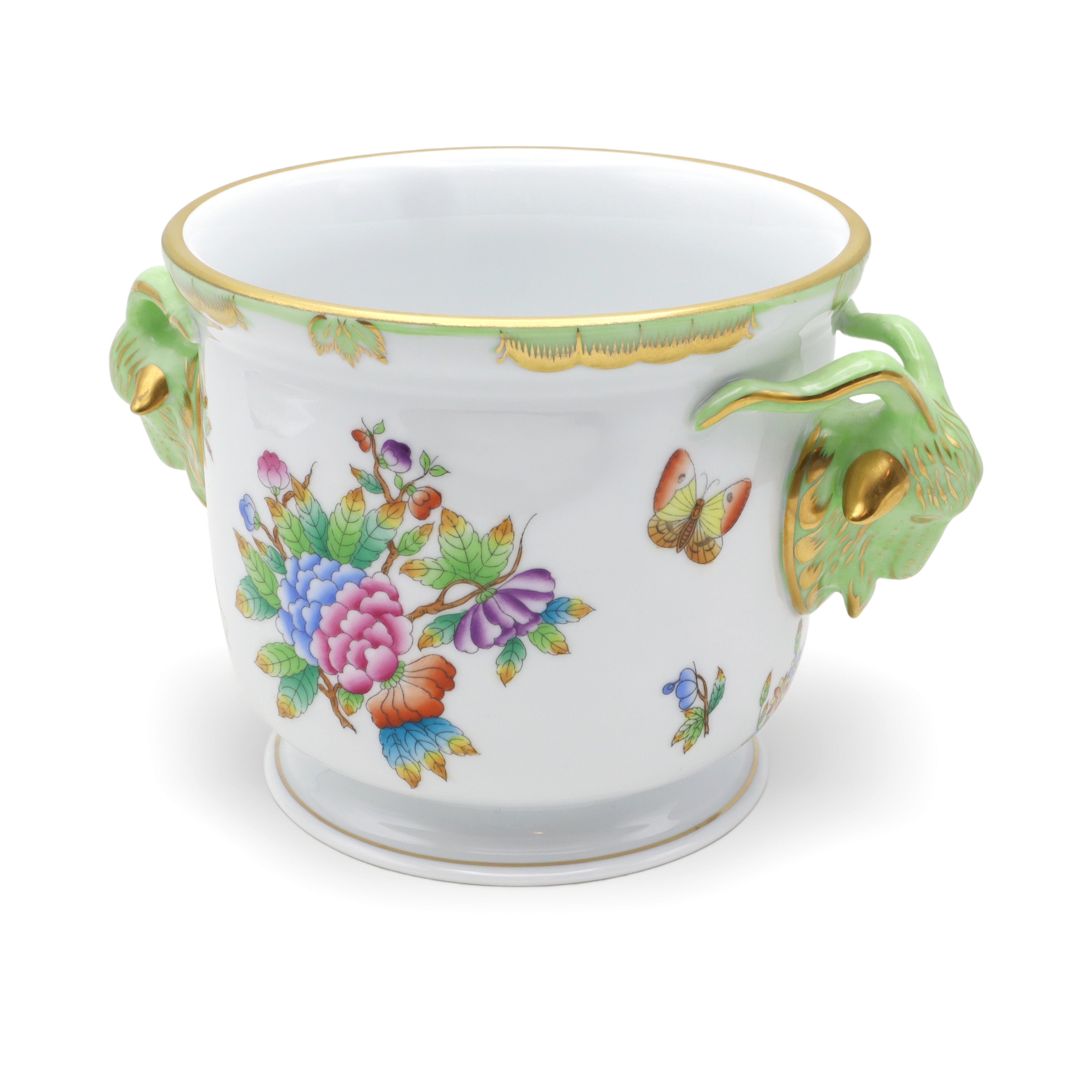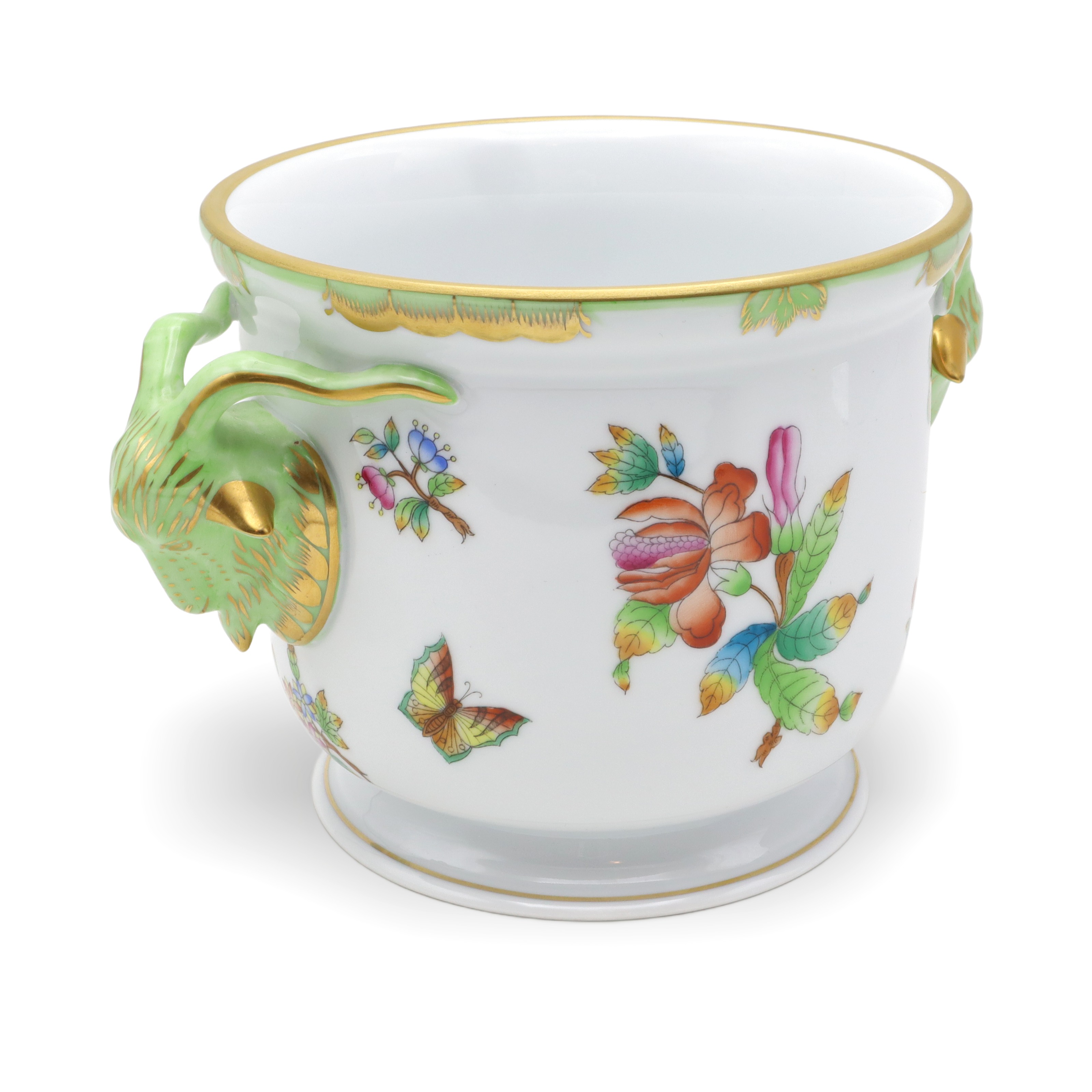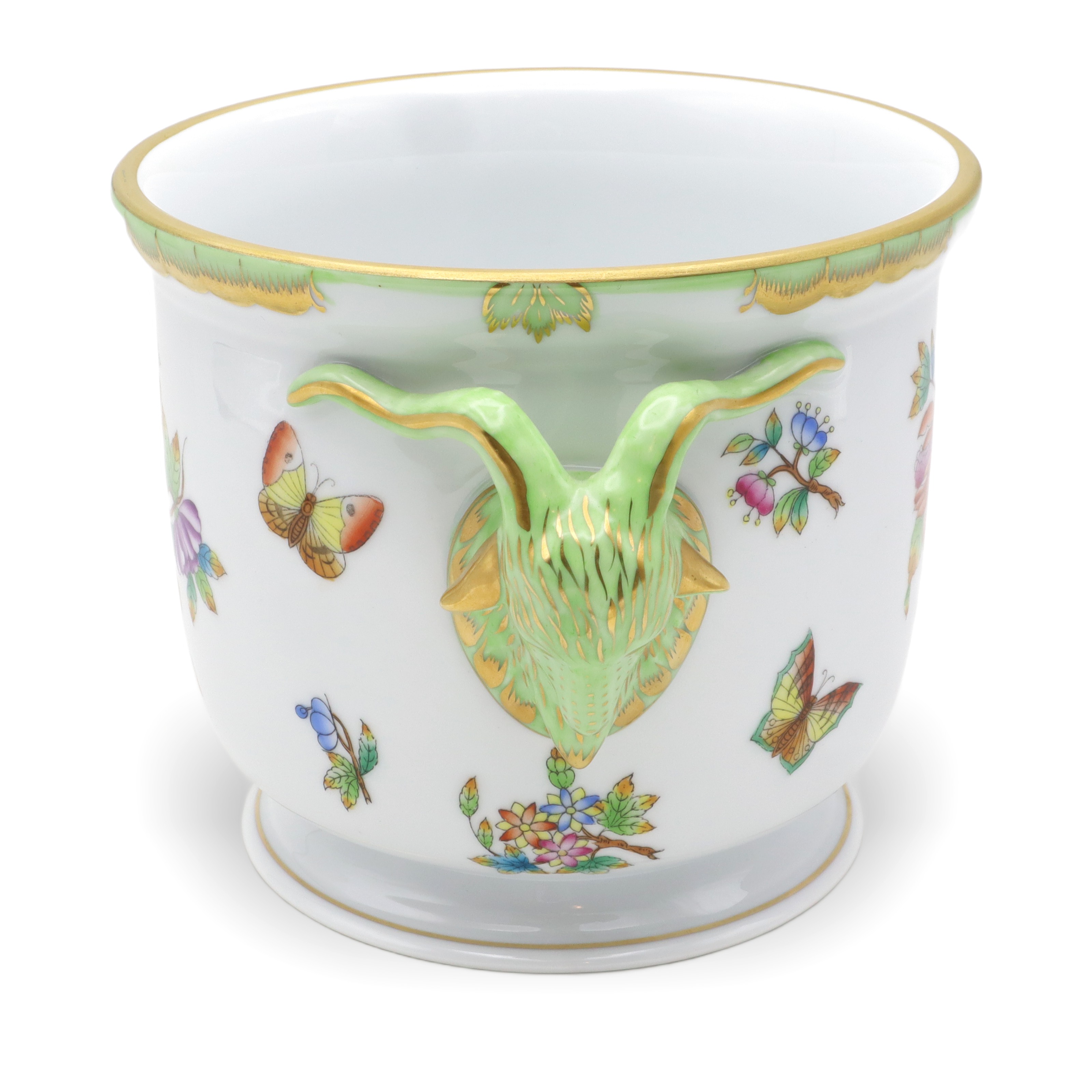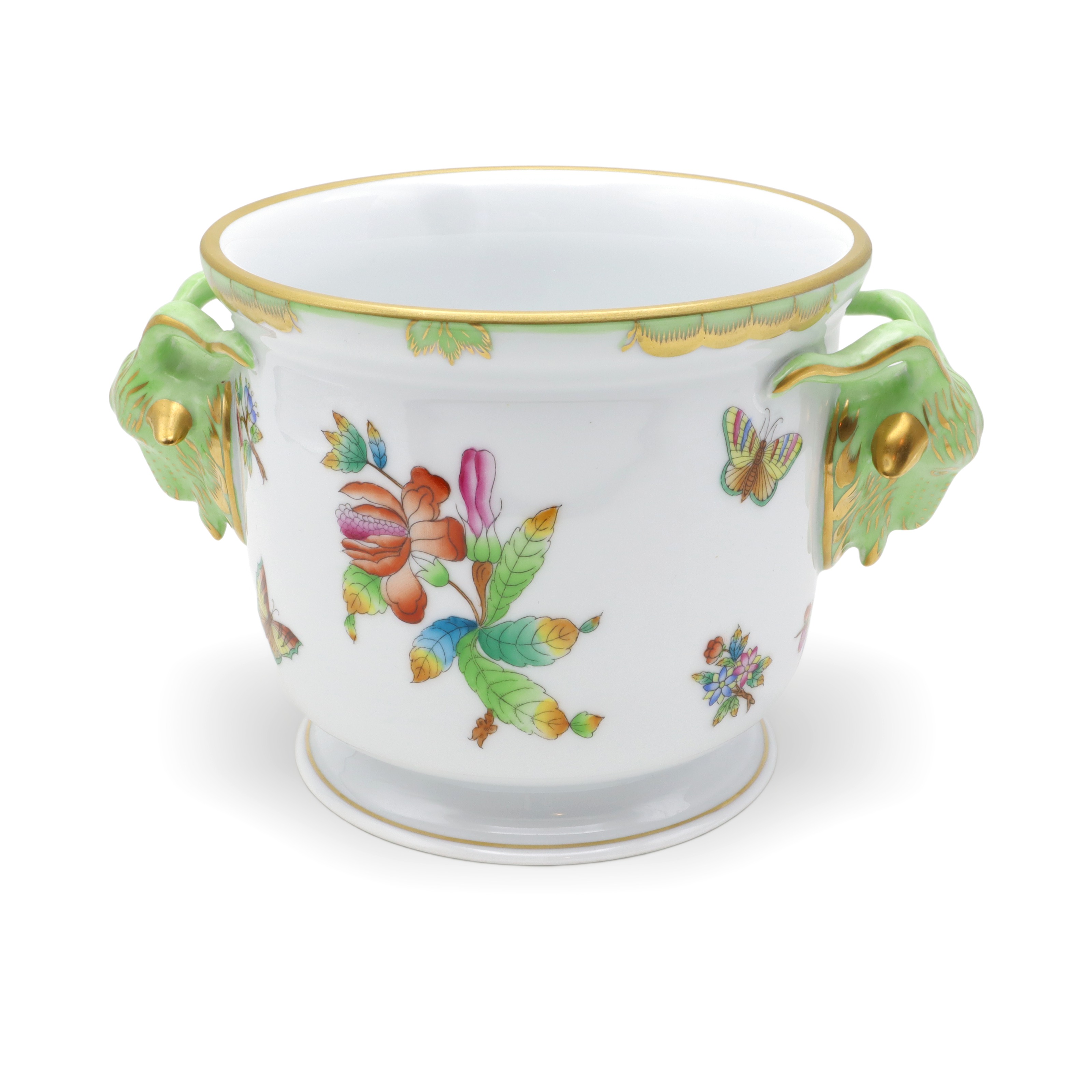 Der Cachepot misst 12,5 cm in der Höhe, 20 cm in der Breite sowie 13,75 cm in der Länge und im Durchmesser. Sein Zustand ist nahezu neuwertig – eine kleine Sensation, bedenkt man, dass dieses Meisterwerk bereits mehr als 70 Jahre alt ist. Die klassische Form und die umlaufende Bemalung werden sofort alle Blicke auf sich ziehen: Das Porzellan erstrahlt in leuchtendem Weiß. Besonders charakteristisch ist das unverkennbare Queen Victoria Dekor, das farbenfrohe Blüten, exotische Schmetterlinge und feine, goldene Akzente miteinander verbindet. Jede Malerei ist ein Unikat, denn bei Herend wurde – und wird bis heute – jedes Stück von Hand bemalt. Die floralen Motive wirken beinahe lebendig und bringen einen Hauch von Frühling ins Haus, egal zu welcher Jahreszeit.