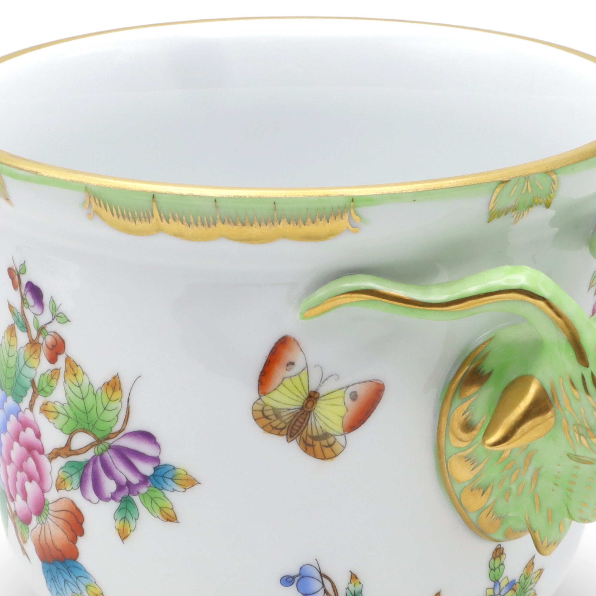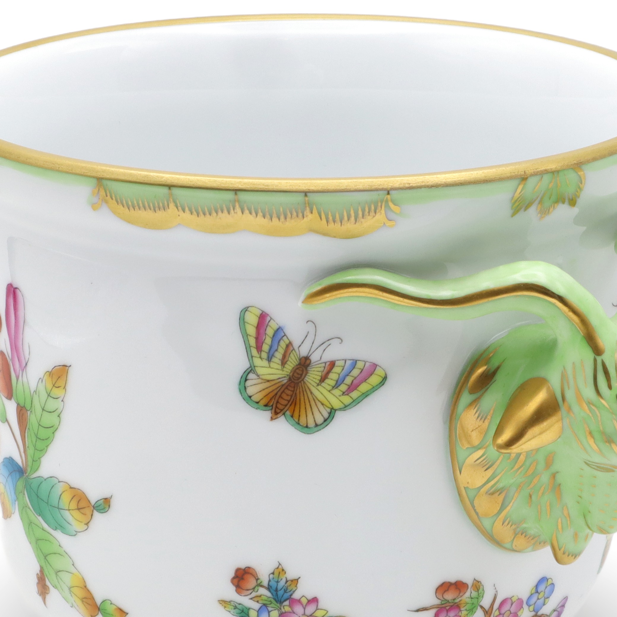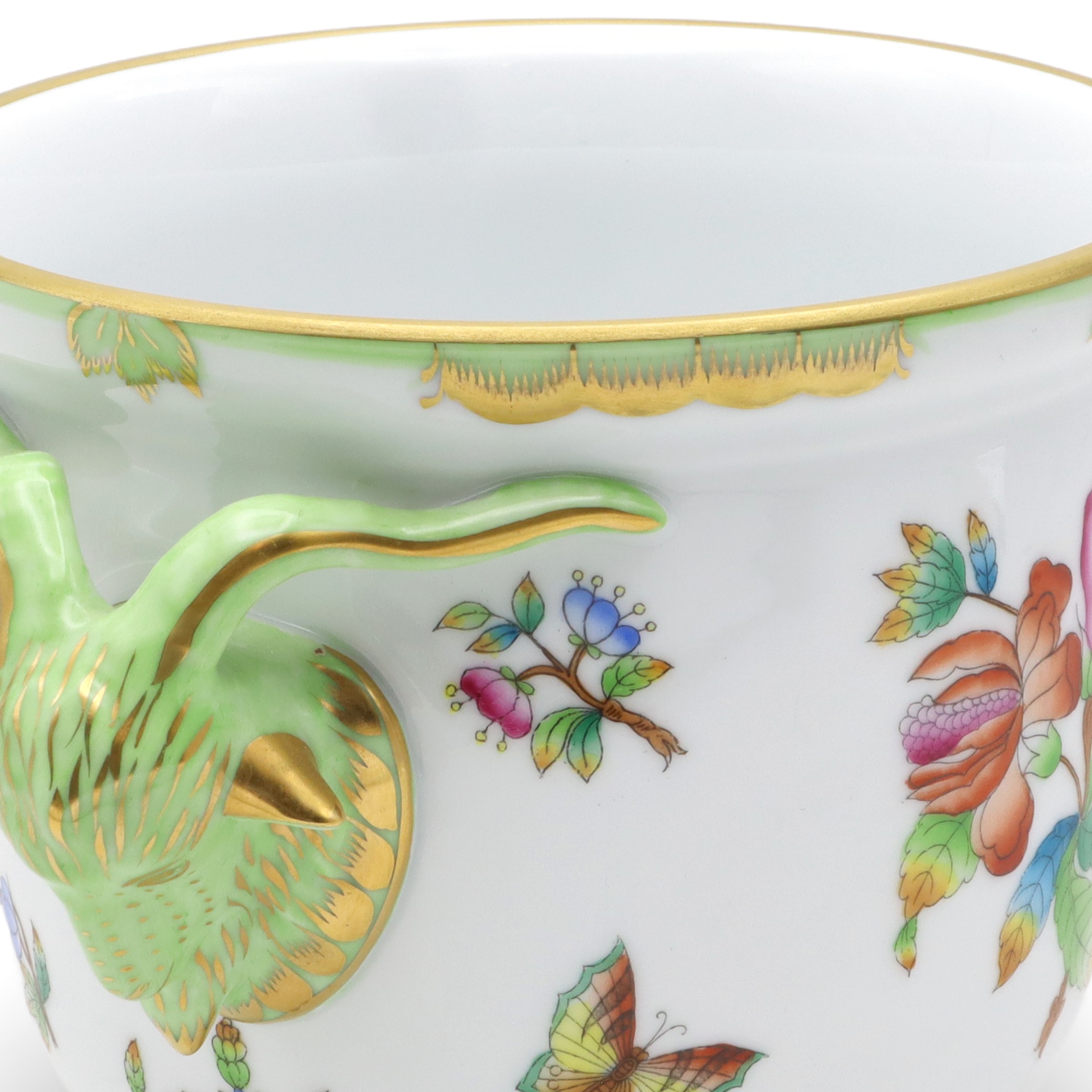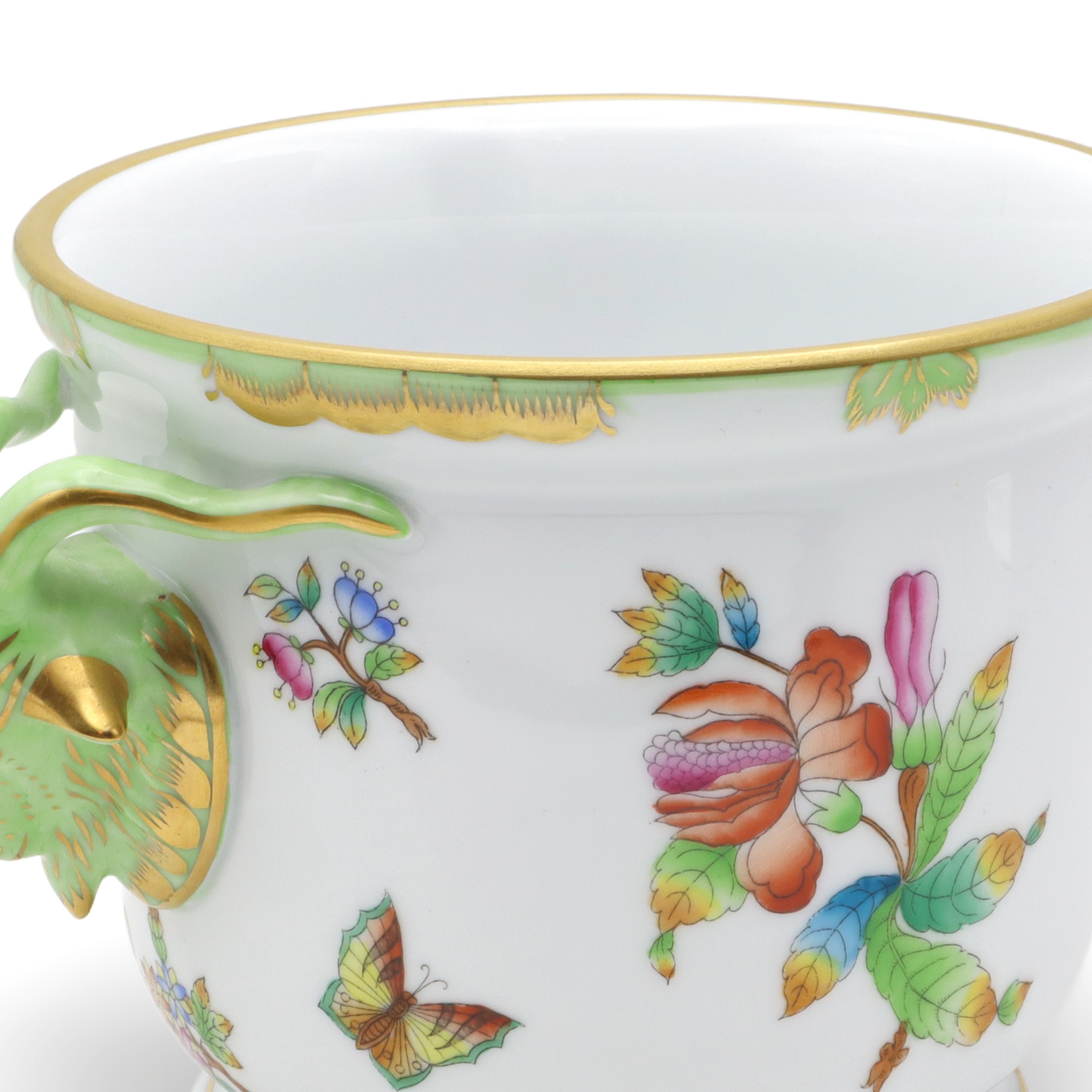 Die feine Vergoldung des oberen Randes und die goldenen Details an den Griffen runden das Gesamtbild ab, reflektieren das Licht und unterstreichen die Hochwertigkeit des Cachepot. Selbst nach all diesen Jahren sind die Farben genauso brillant wie am ersten Tag, und das Porzellan zeigt keine nennenswerten Gebrauchsspuren. Das spricht für den extrem sorgfältigen Umgang und die außerordentliche Qualität, für die Herend schon seit dem 19. Jahrhundert bekannt ist.