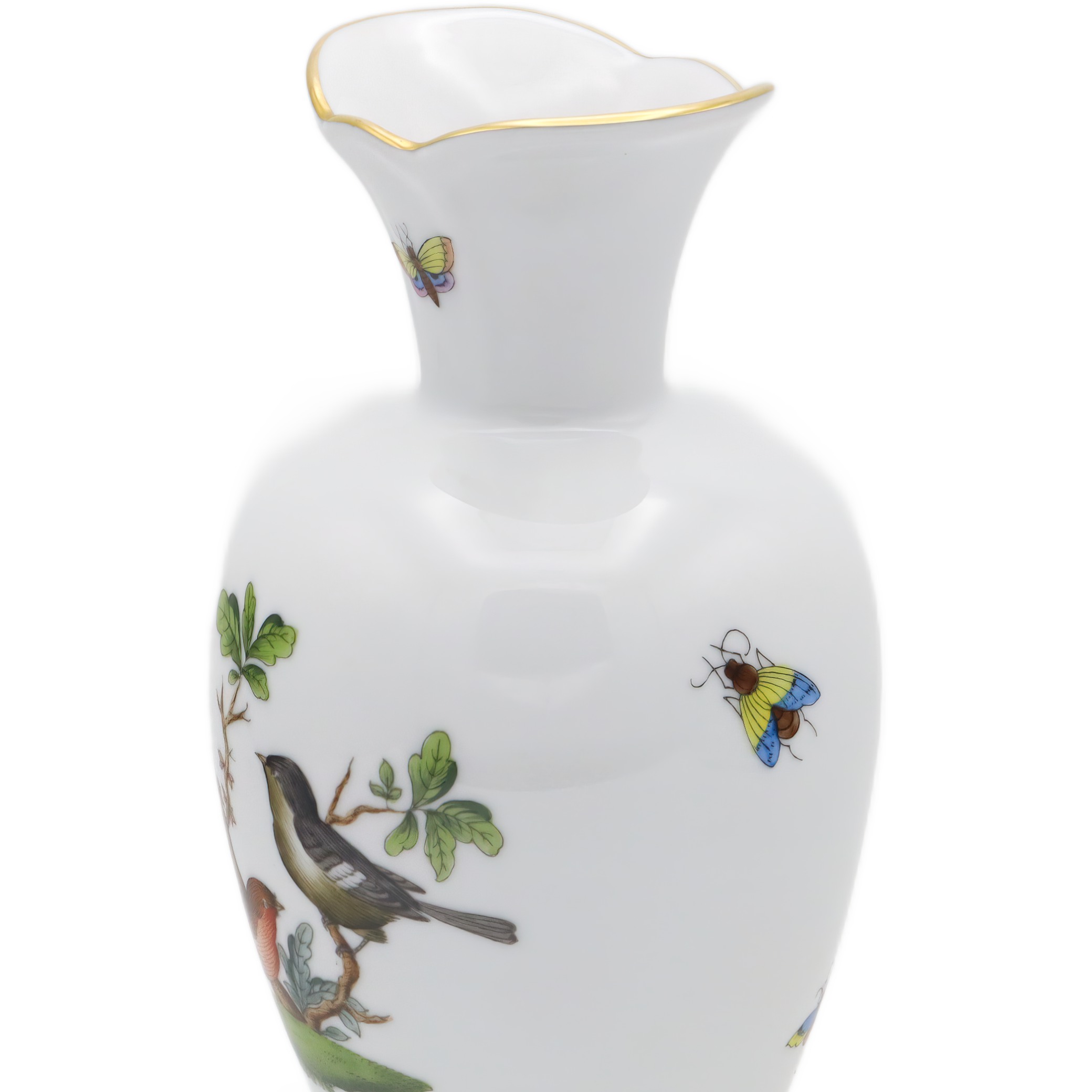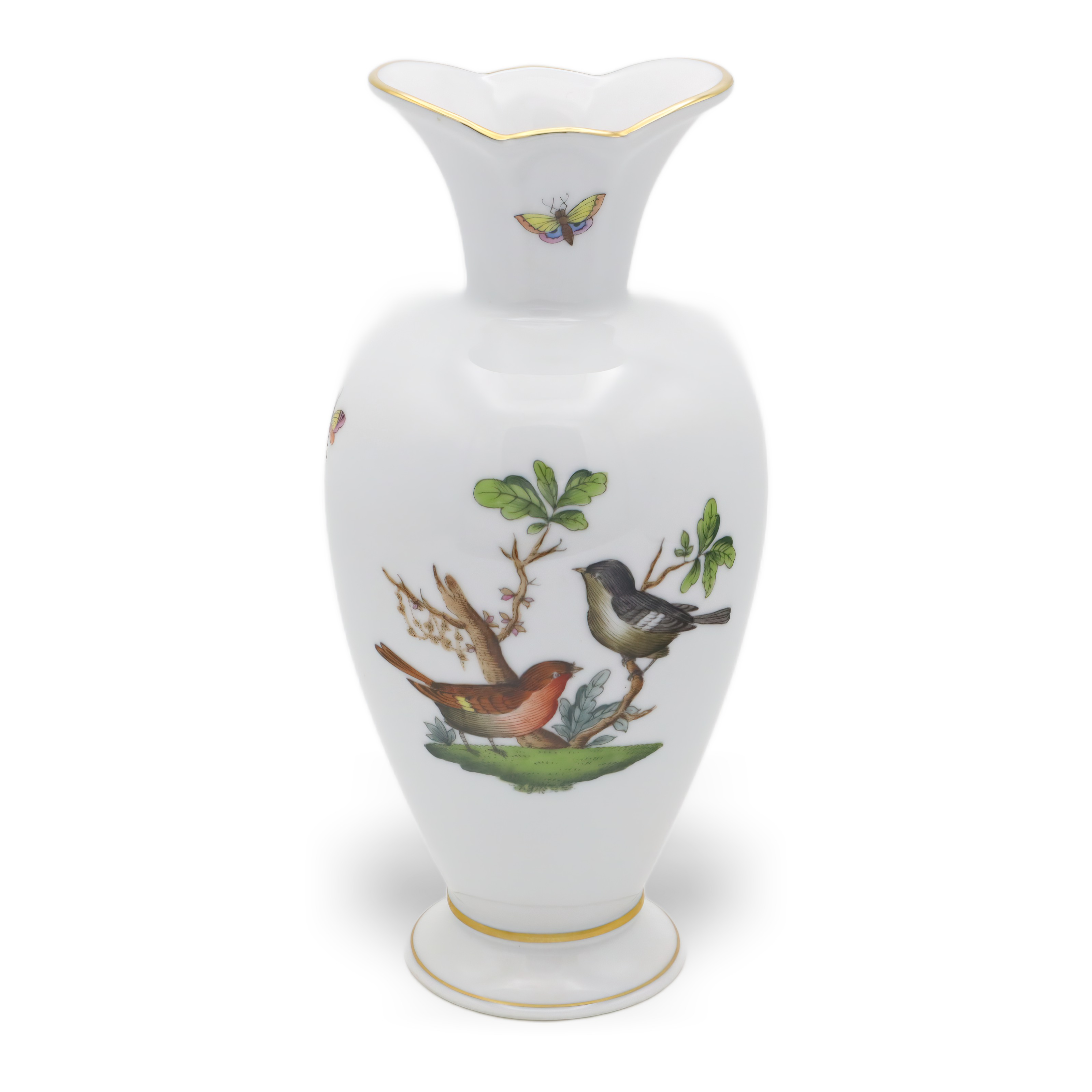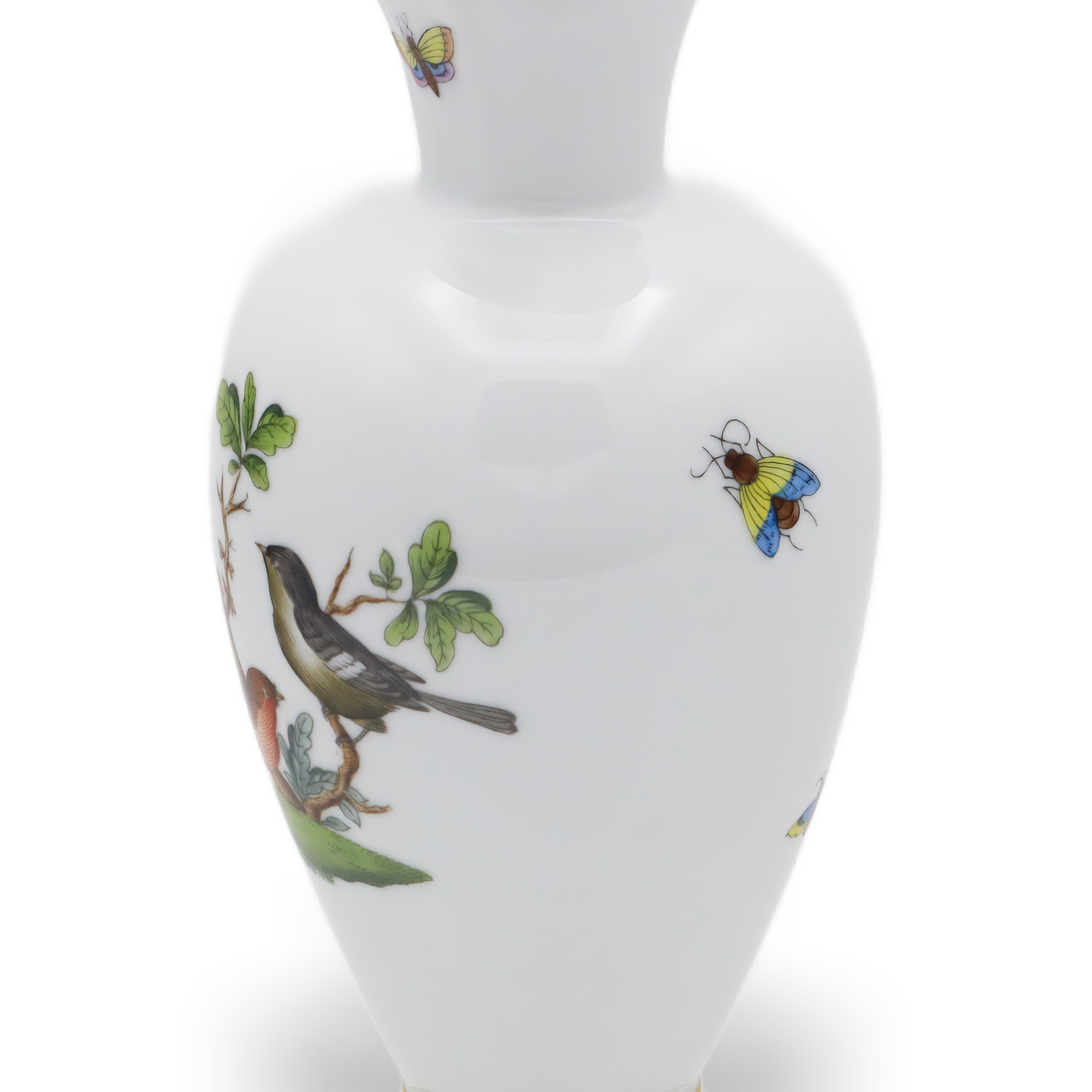 Der Korpus der Vase zeigt sich in schimmerndem Weiß. Die Form ist dezent bauchtig, an der Schulter rund auslaufend, mit einem Standfuß, der der ganzen Erscheinung große Stabilität und klassische Präsenz verleiht. Das Besondere an diesem Exemplar ist aber natürlich das von Hand aufgetragene Dekor: Im Zentrum steht das berühmte Rothschild-Motiv – zwei naturnah und äußerst detailreich gezeichnete Vögel, die auf einem Ast verweilen, umsäumt von grünenden Zweigen und zart angedeutetem Moos. Das Motiv wirkt fast lebendig, die Farben sind trotz des Alters unglaublich klar und nuanciert. Dezente Goldakzente an Rand sowie Sockel verstärken die Wertigkeit und zeigen, dass Luxus hier kein leeres Versprechen bleibt.