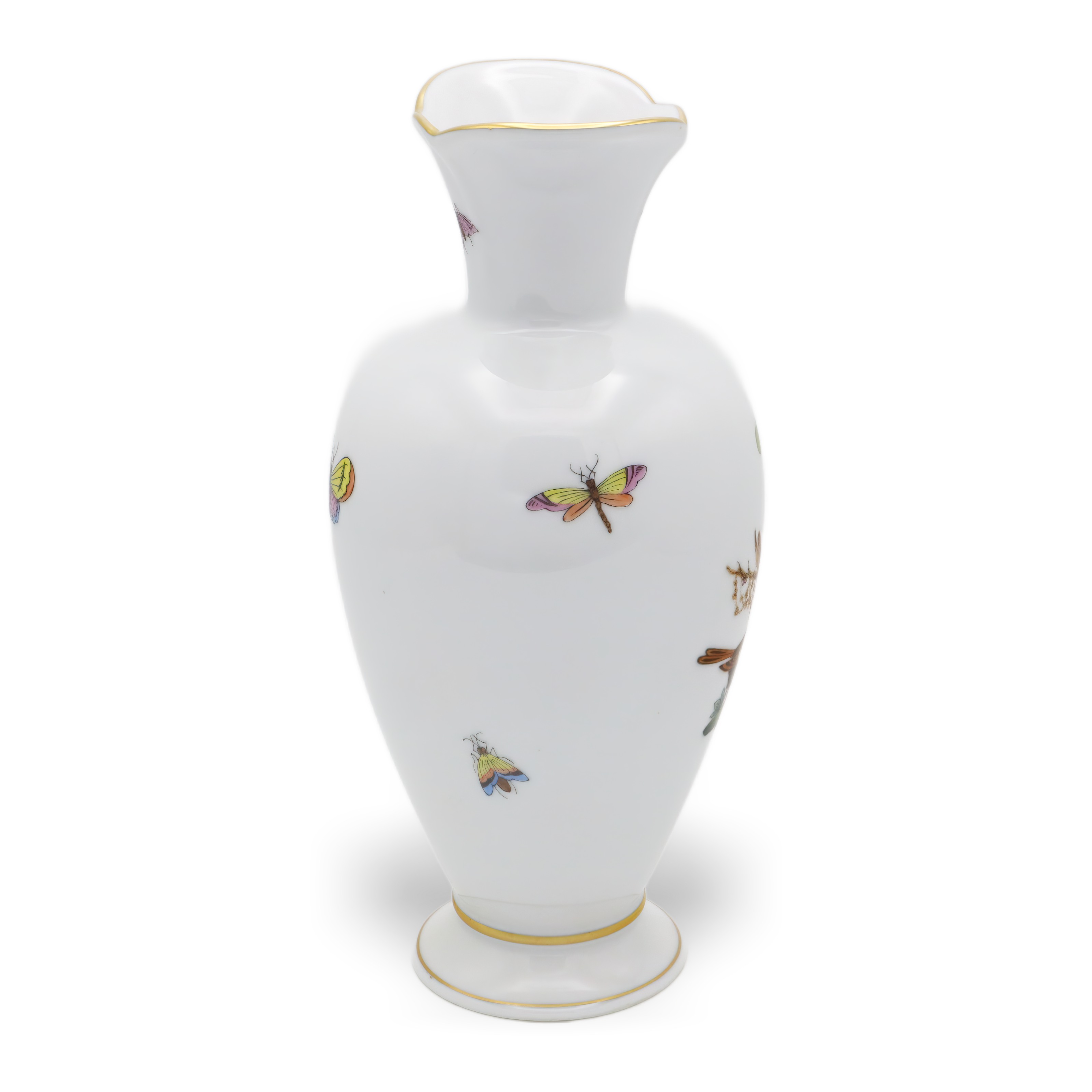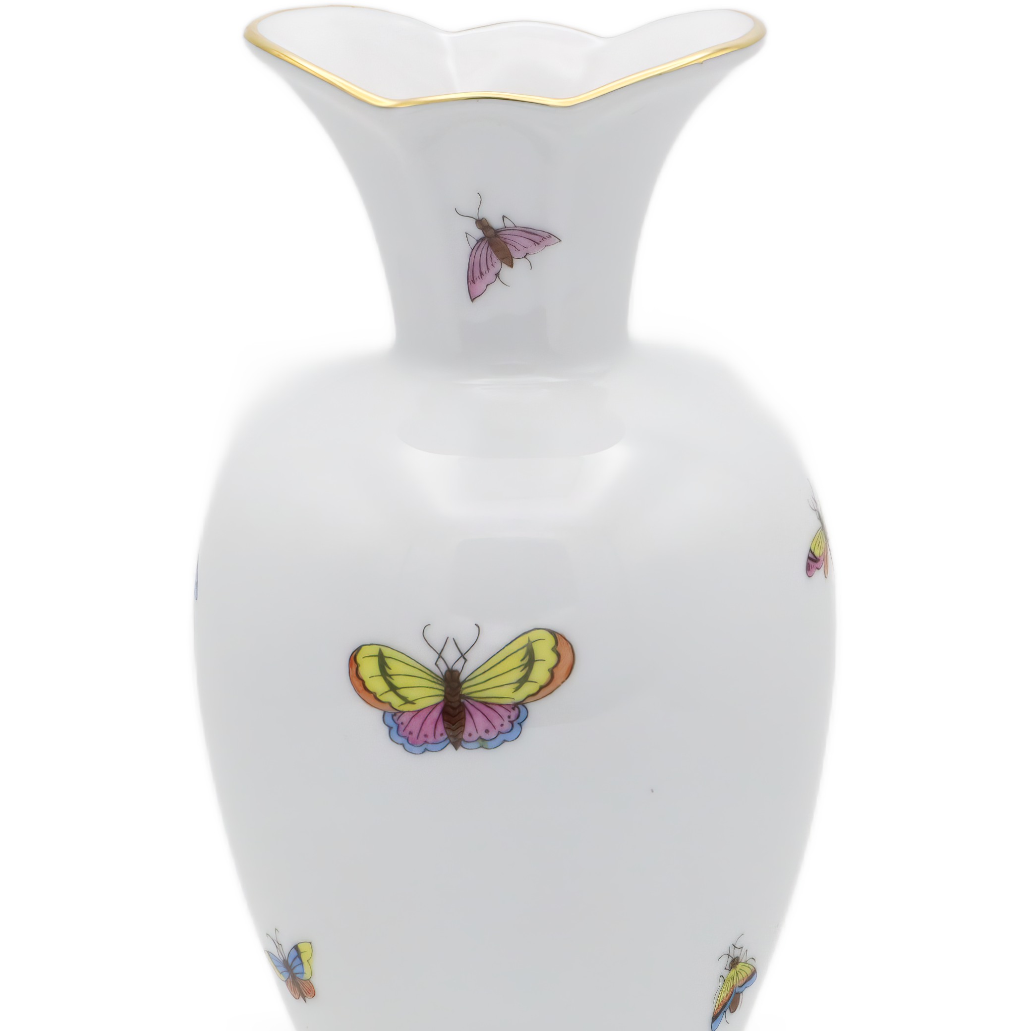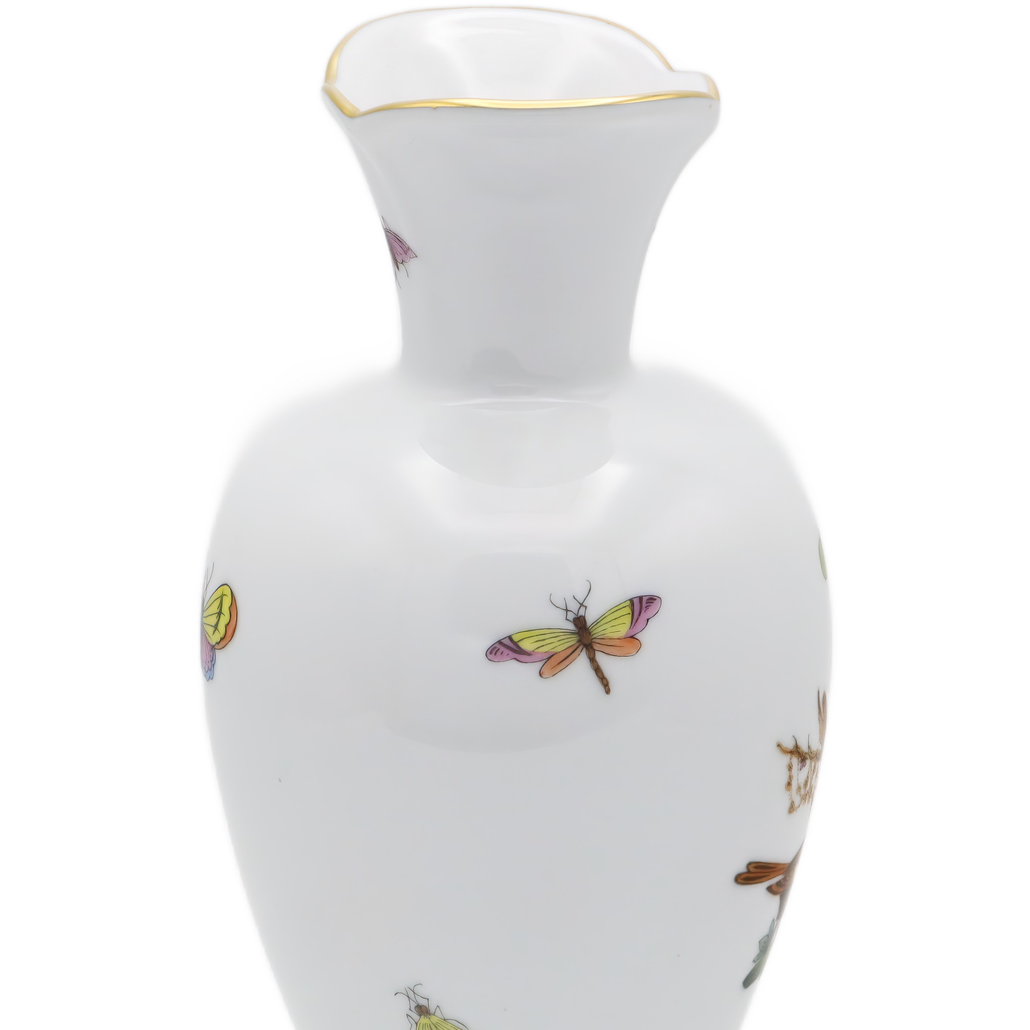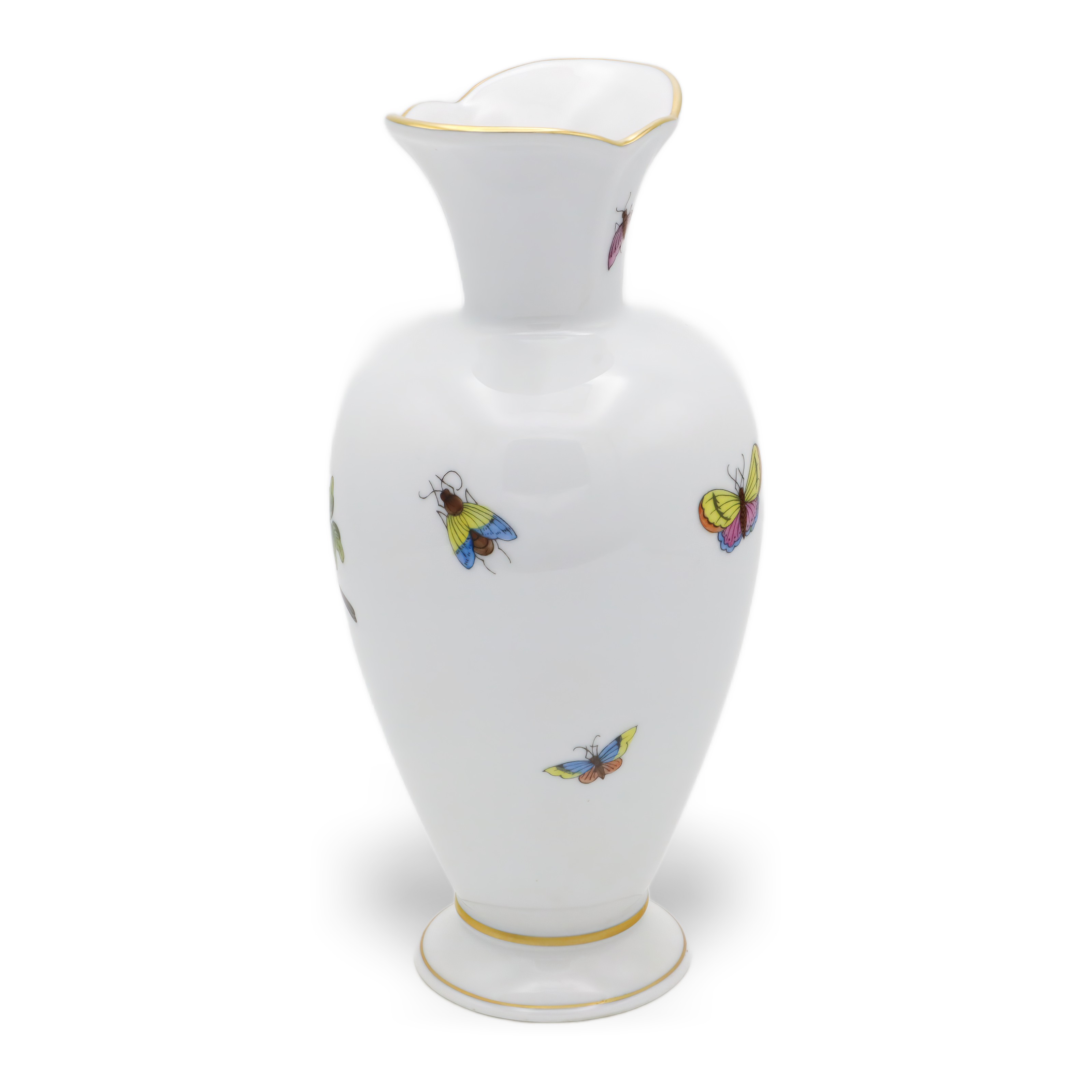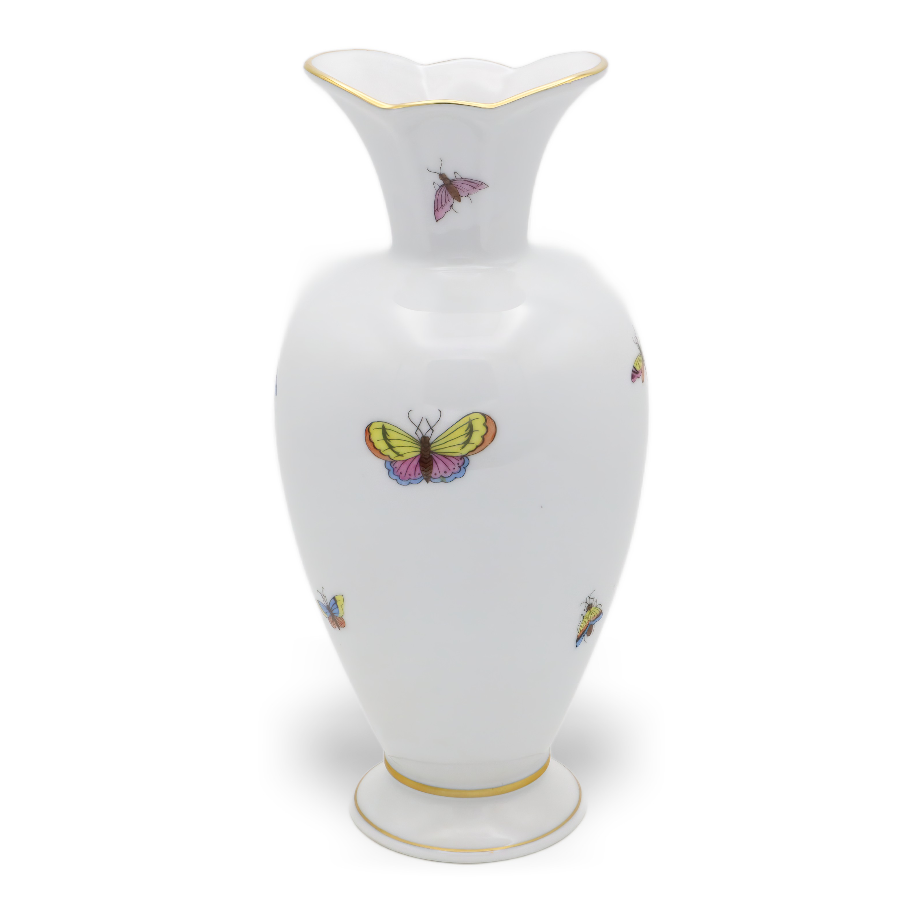 Über der hauchdünnen Porzellanglasur erkennt man die feine Pinselführung und die meisterliche Handarbeit der Herend-Künstler. Um den Hals tanzt ein zart gemaltes Schmetterlingsdekor, das dem Stück zusätzliche Verspieltheit und Leichtigkeit verleiht – ein kleiner, aber feiner Kontrast zum präzisen, fast botanischen Naturalismus der Vogelmalerei. Das Gesamtbild wirkt niemals überladen: Vielmehr strahlt diese Vase einen zurückhaltenden Luxus aus, der in Kombination mit jedem Wohnstil funktioniert und mühelos zu einem echten Blickfang avanciert.