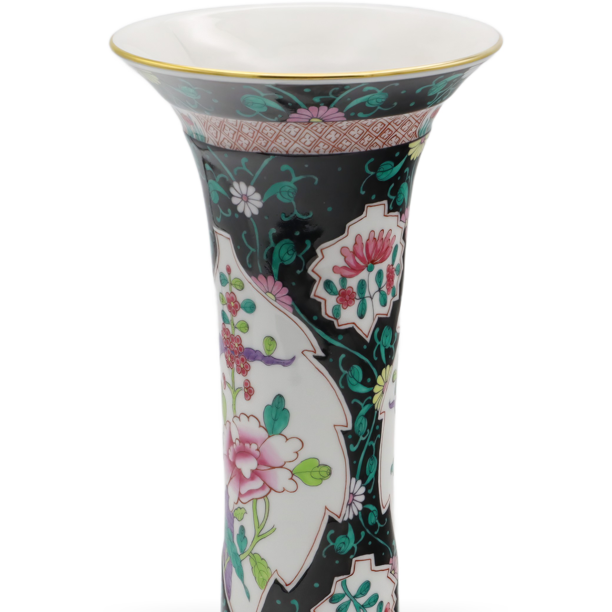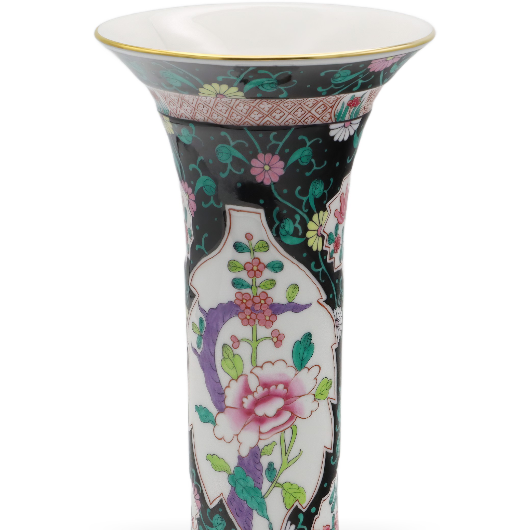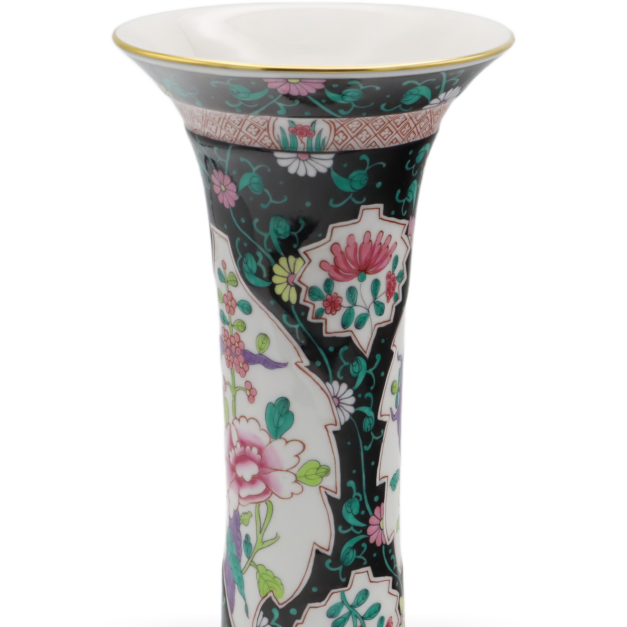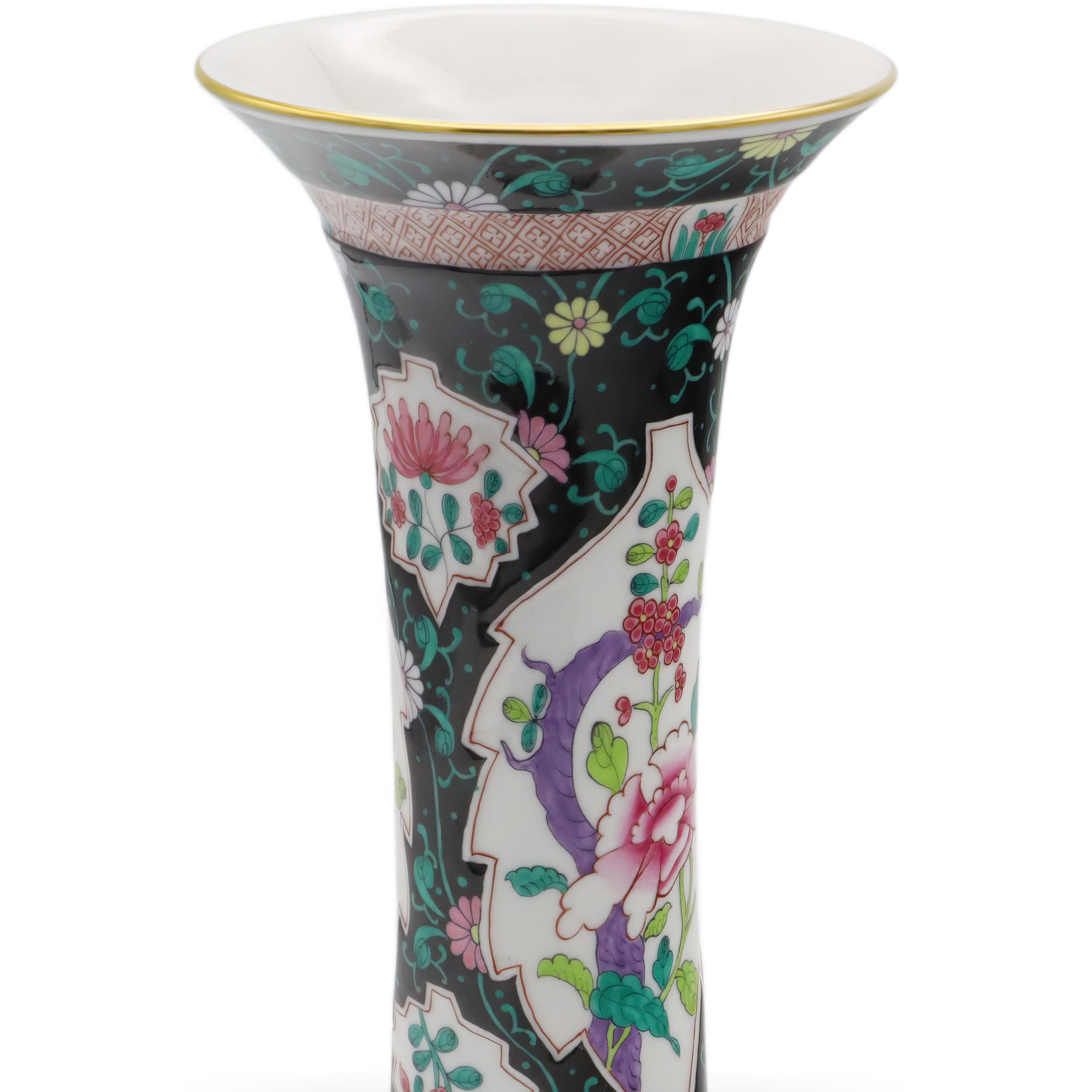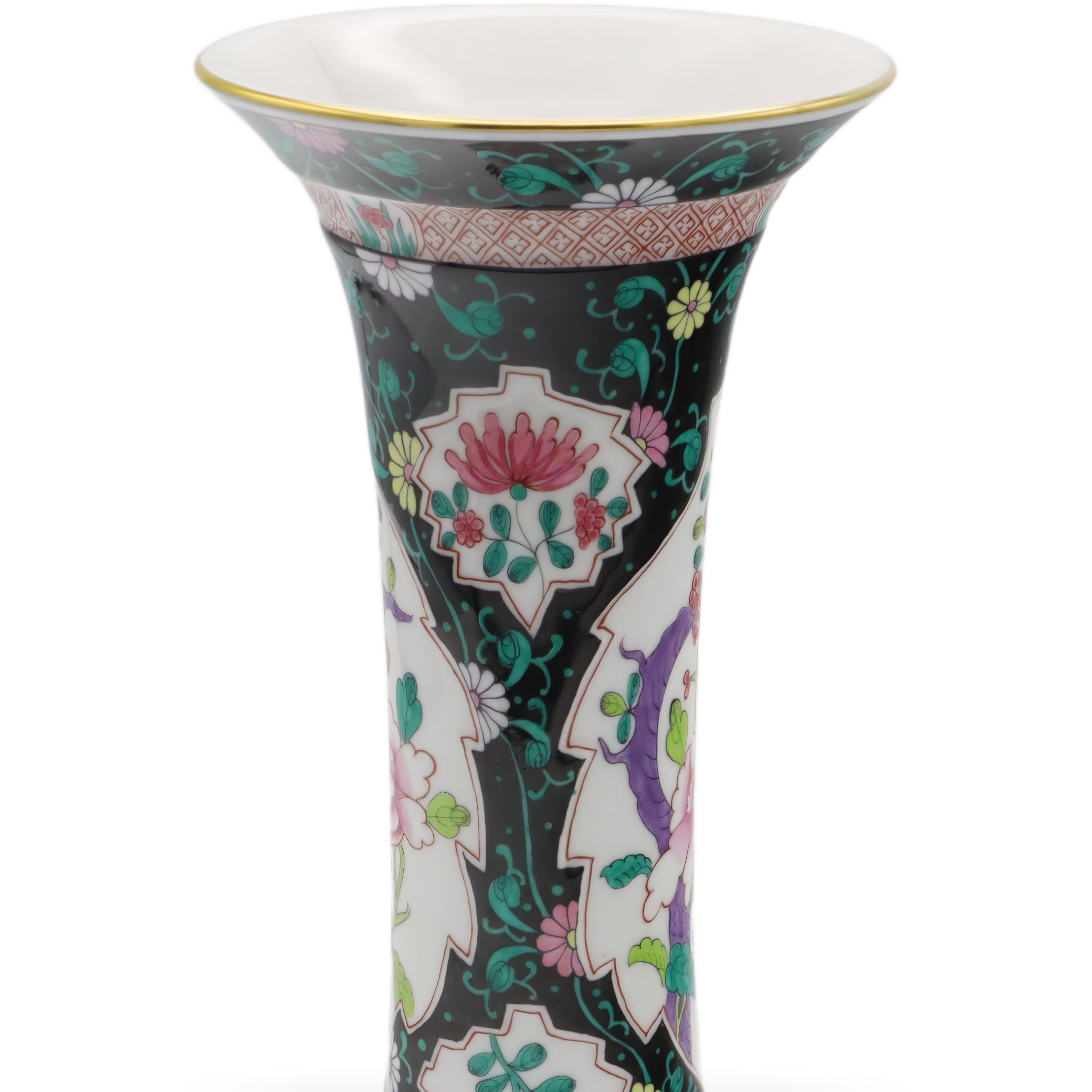 Der obere und untere Teil der Vase sind zudem mit geometrischen Bändern versehen, die das Gesamtbild mit zusätzlichen Details subtil abrunden. Goldene Ränder an der Lippe setzen gekonnt edle Akzente und verleihen der Vase eine royale Anmutung, ohne dass sie aufdringlich wirkt. Die Balance zwischen Farbenpracht und der Zurückhaltung des schwarzen Grundtons sorgt für ein faszinierendes Spannungsfeld, das Tradition und Moderne nahtlos miteinander verbindet.