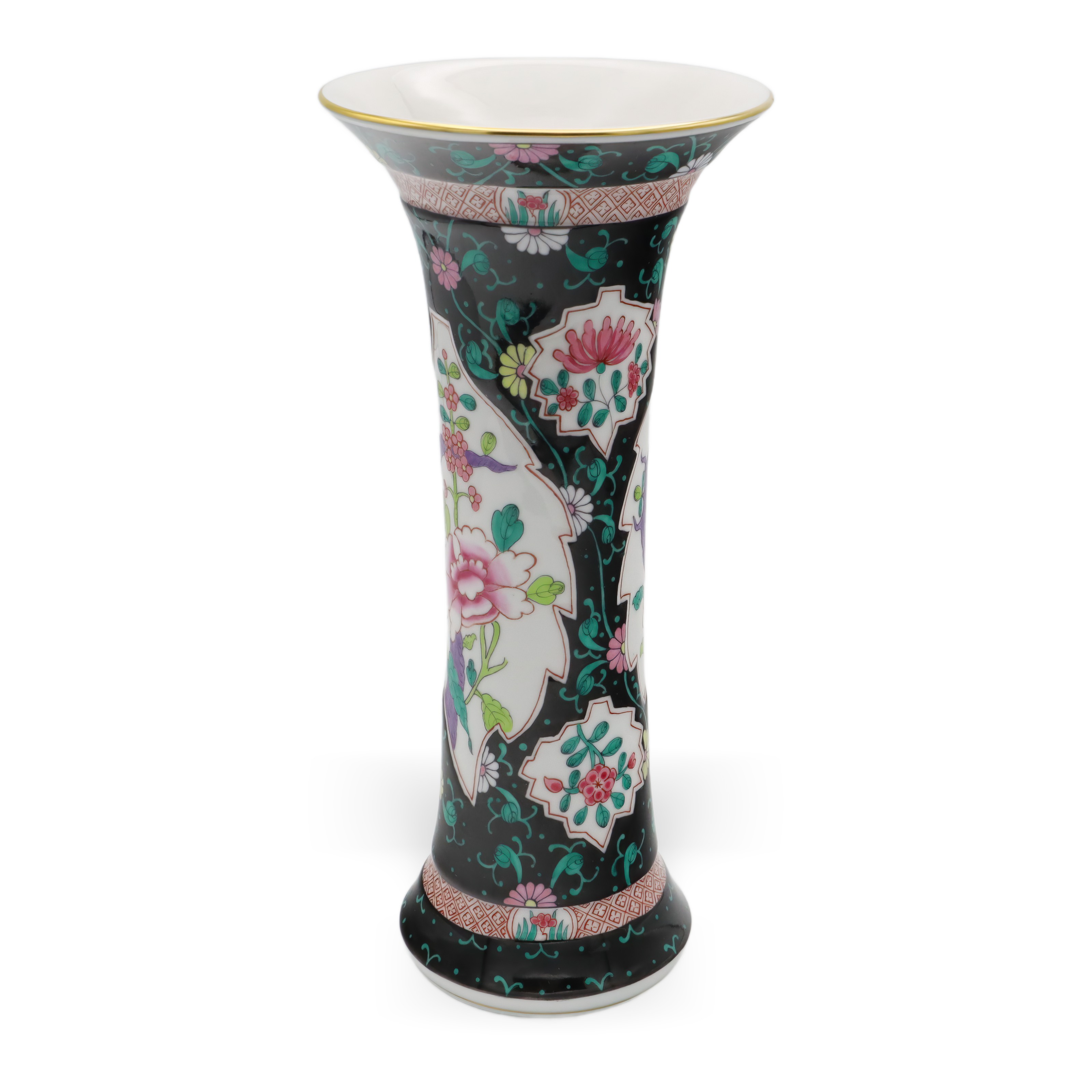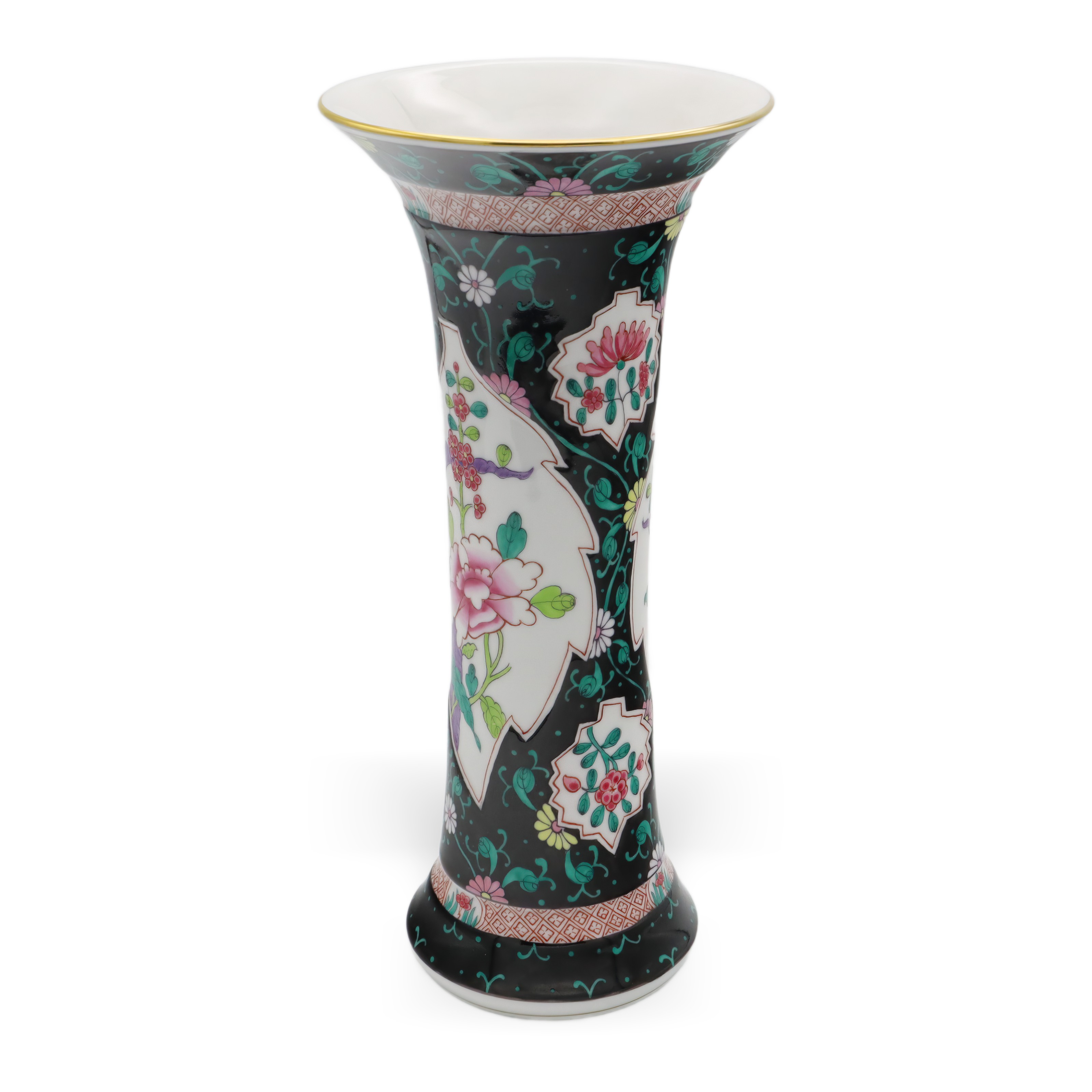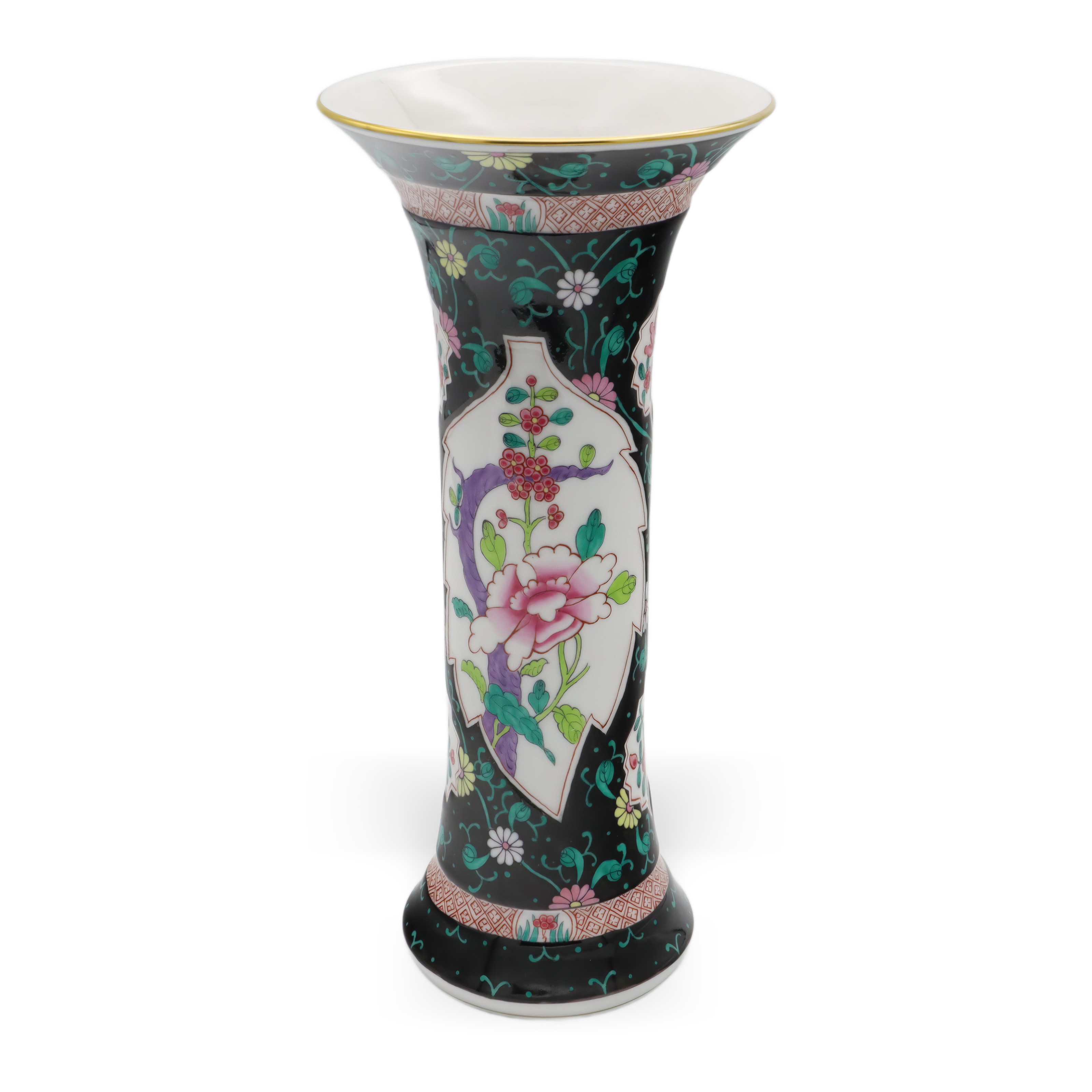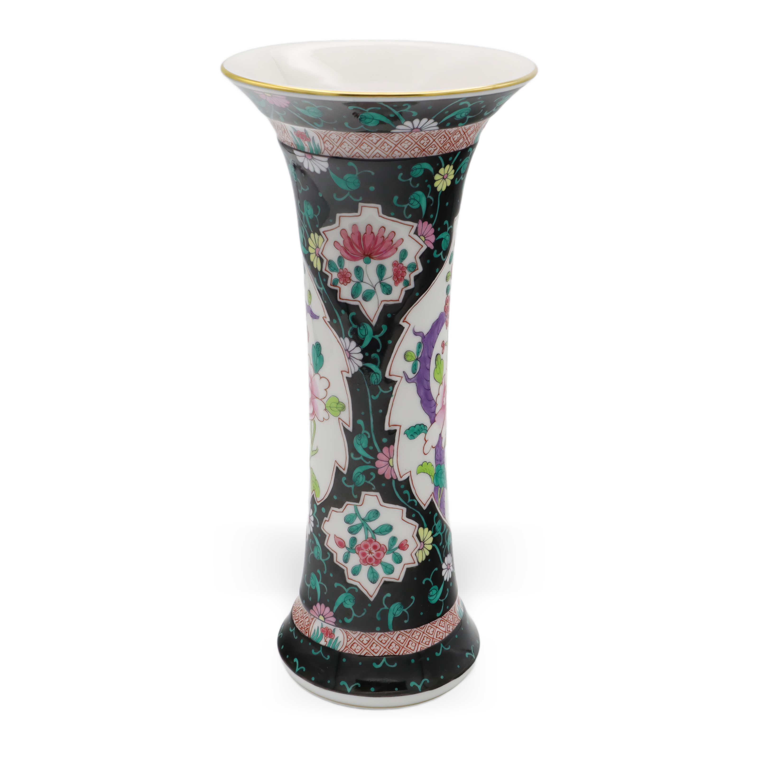 Der obere und untere Teil der Vase sind zudem mit geometrischen Bändern versehen, die das Gesamtbild mit zusätzlichen Details subtil abrunden. Goldene Ränder an der Lippe setzen gekonnt edle Akzente und verleihen der Vase eine royale Anmutung, ohne dass sie aufdringlich wirkt. Die Balance zwischen Farbenpracht und der Zurückhaltung des schwarzen Grundtons sorgt für ein faszinierendes Spannungsfeld, das Tradition und Moderne nahtlos miteinander verbindet.
