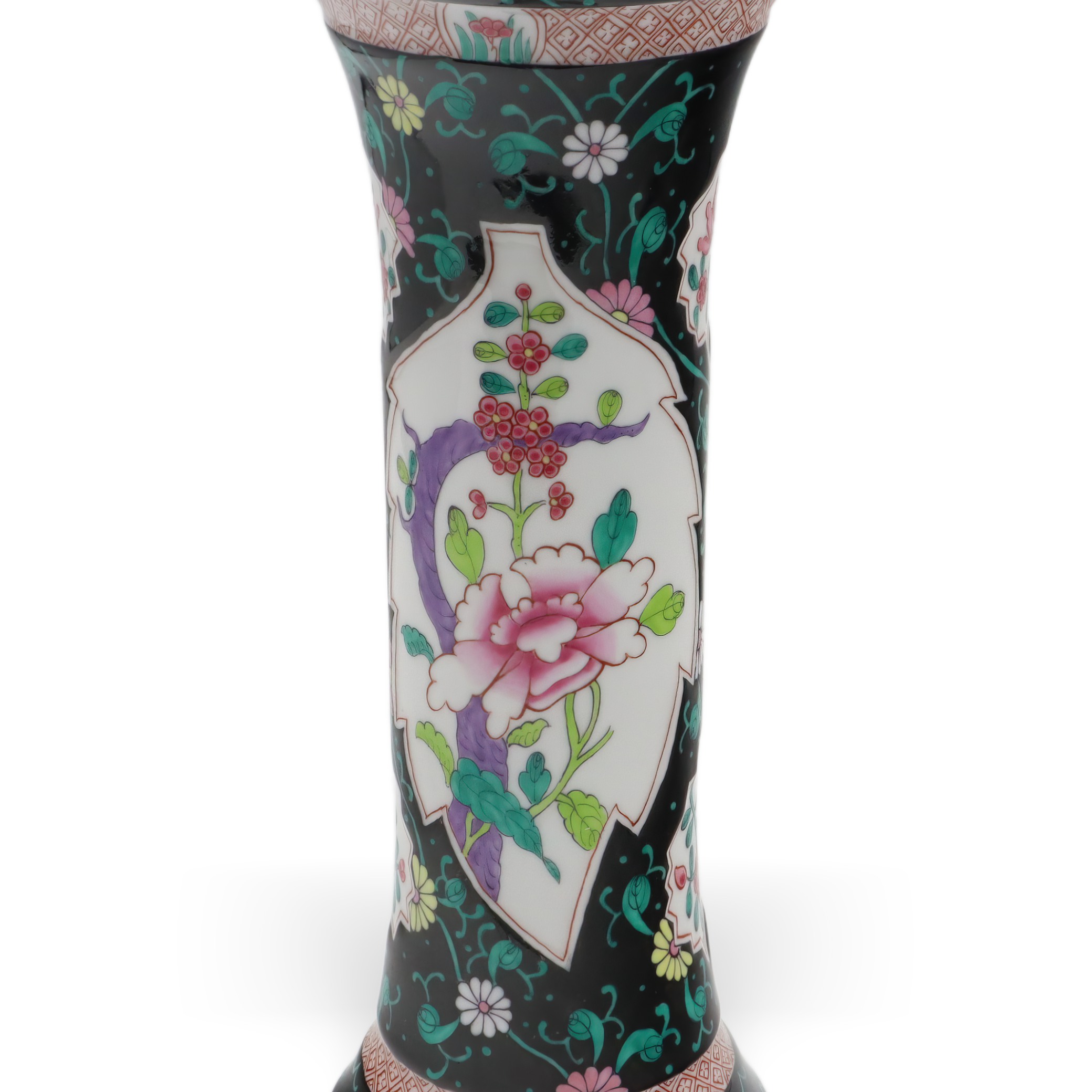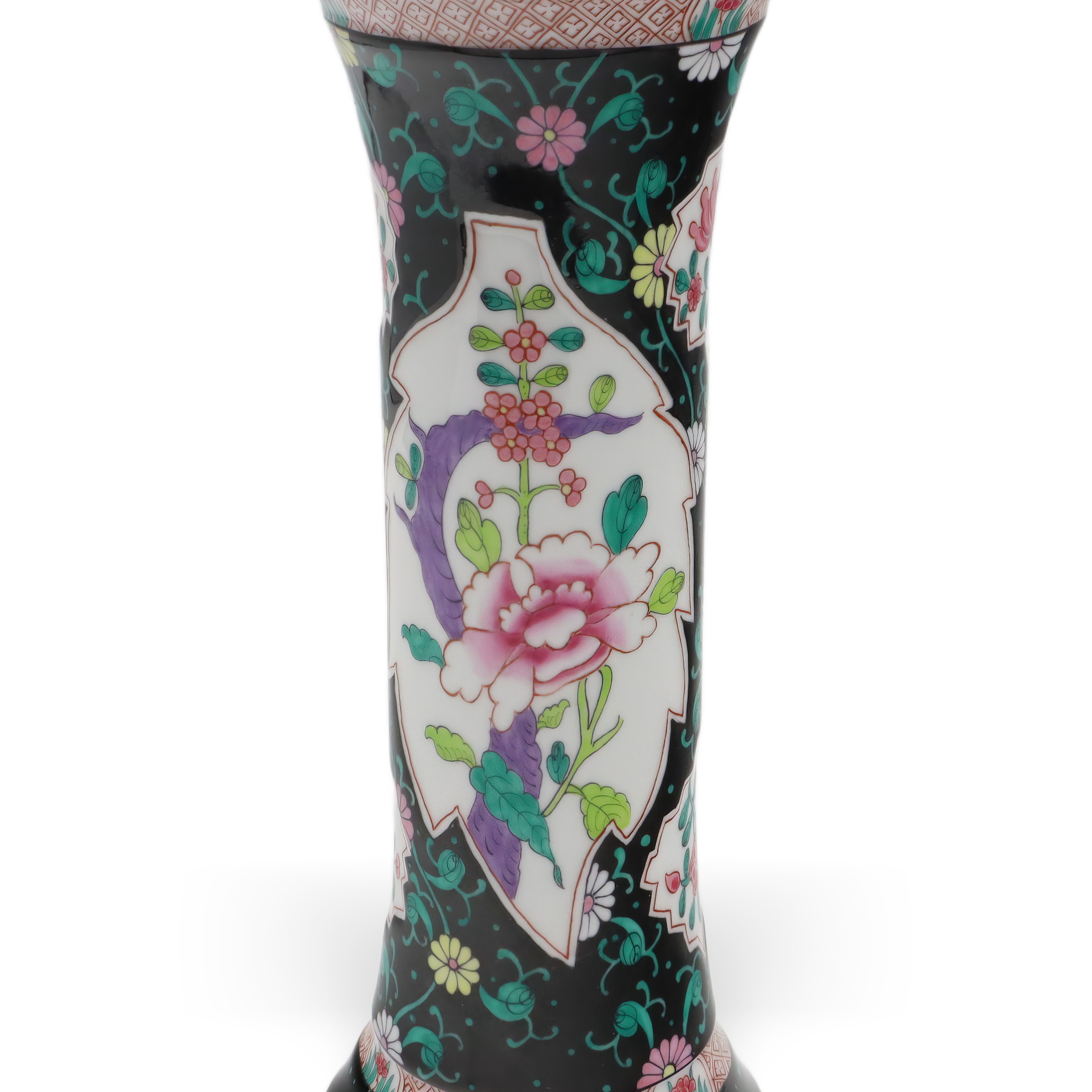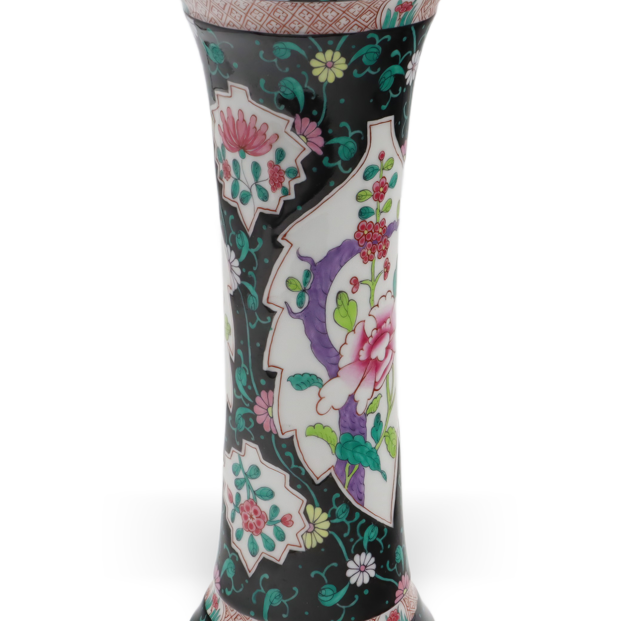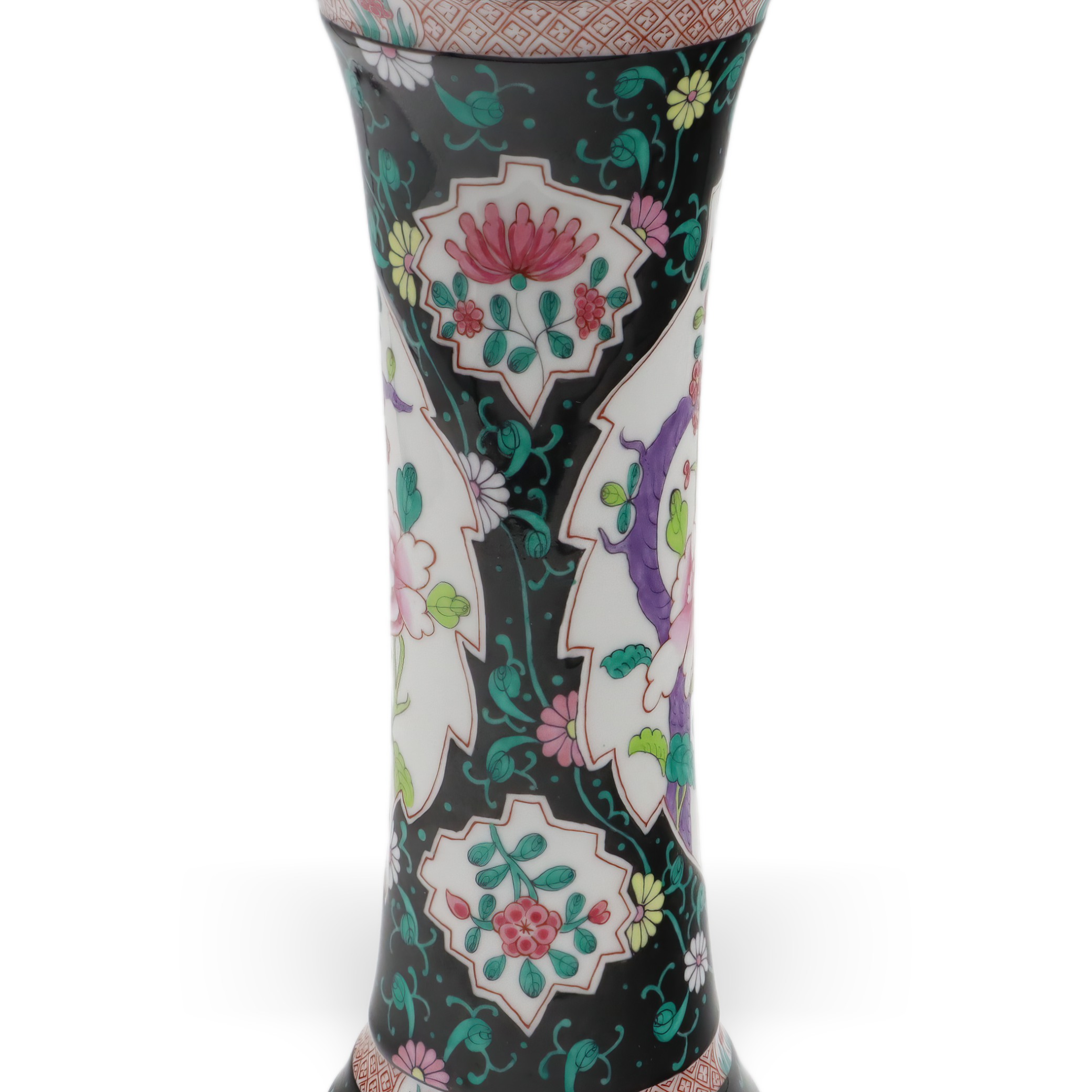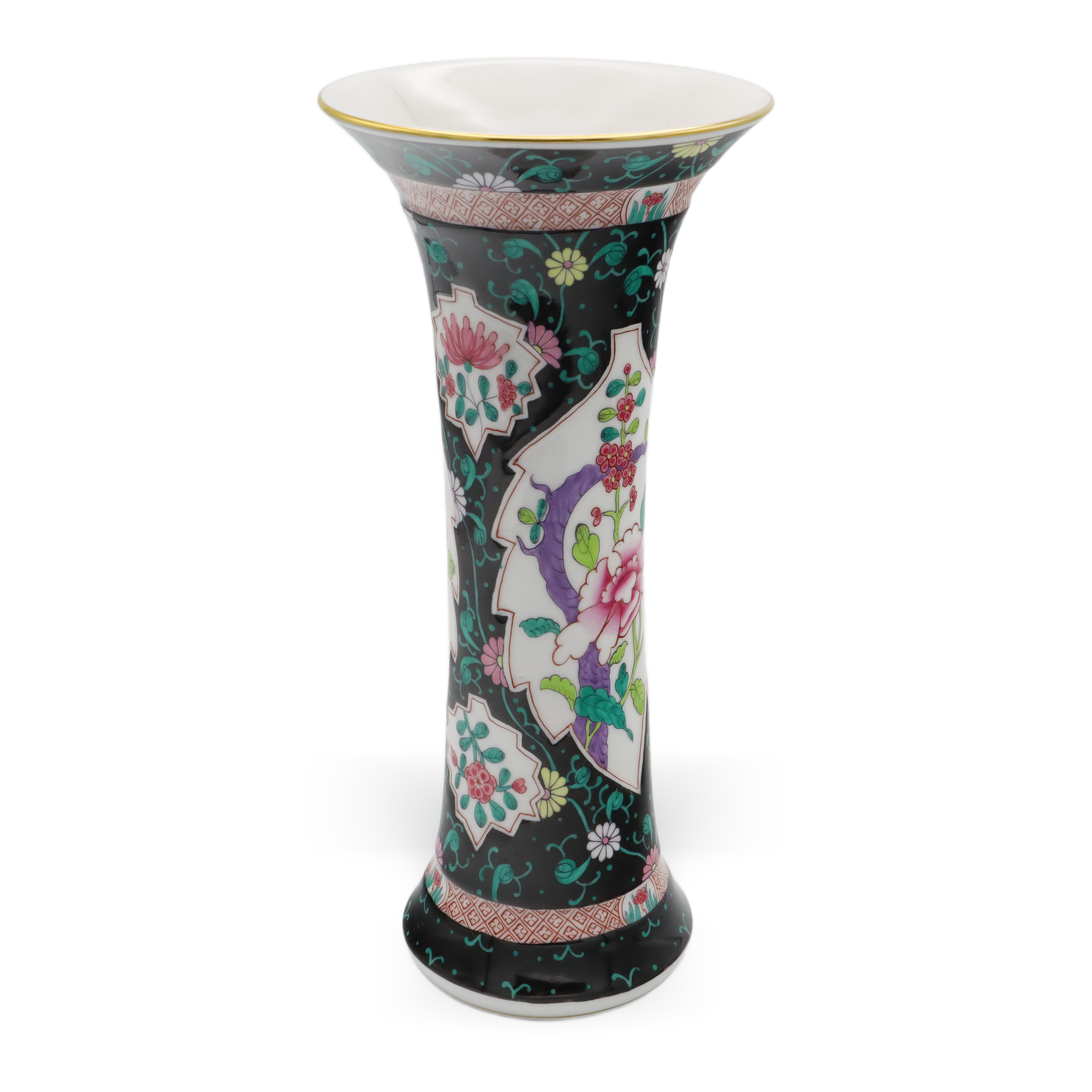 Der obere und untere Teil der Vase sind zudem mit geometrischen Bändern versehen, die das Gesamtbild mit zusätzlichen Details subtil abrunden. Goldene Ränder an der Lippe setzen gekonnt edle Akzente und verleihen der Vase eine royale Anmutung, ohne dass sie aufdringlich wirkt. Die Balance zwischen Farbenpracht und der Zurückhaltung des schwarzen Grundtons sorgt für ein faszinierendes Spannungsfeld, das Tradition und Moderne nahtlos miteinander verbindet.