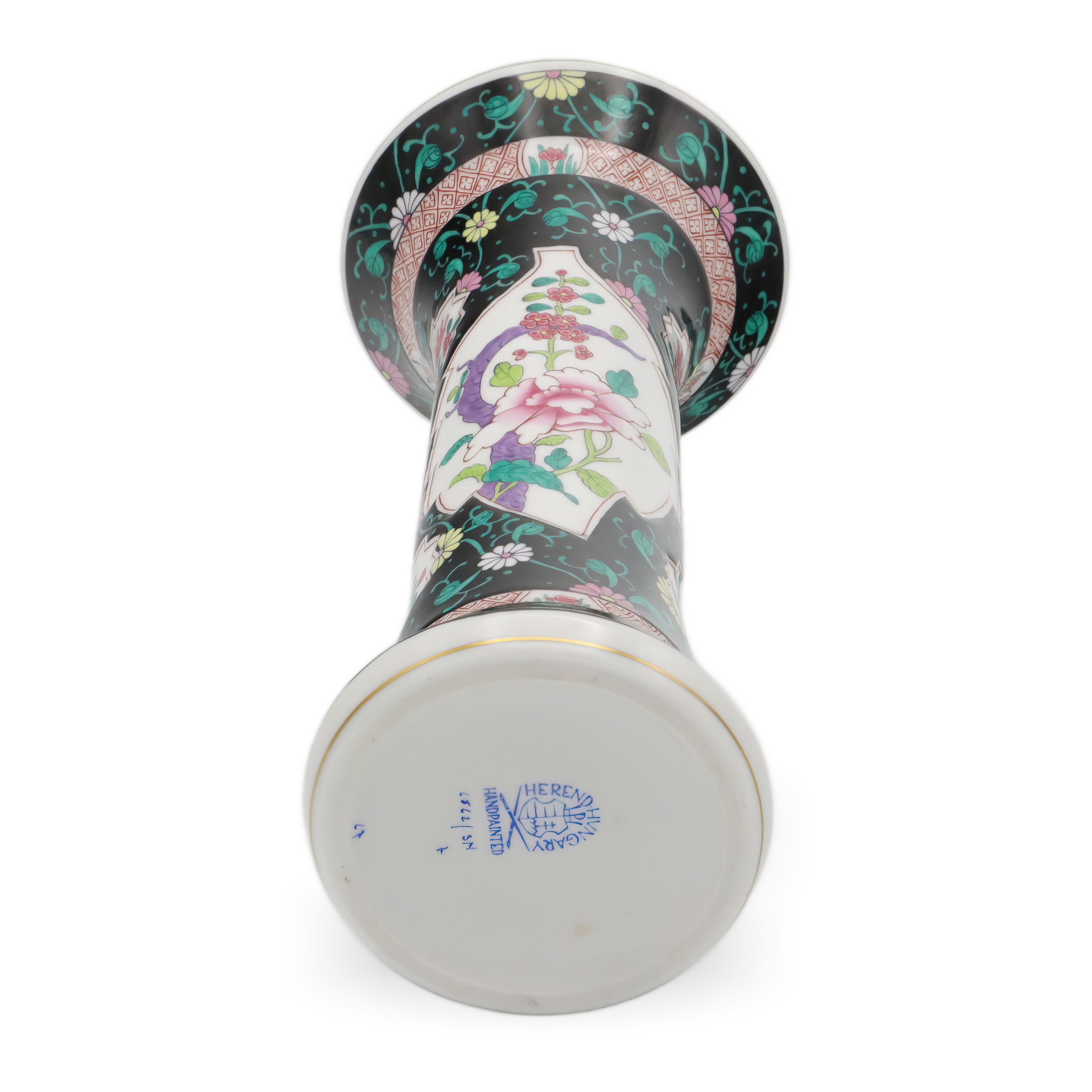 Herend steht seit 1826 für feinste Porzellankunst aus Ungarn. Die Manufaktur ist weltberühmt für ihre aufwändigen, handbemalten Dekore und die Verwendung nur bester Rohstoffe. Die Kollektion „Siang Noir“ oder auch „Black Dynasty“ betont ein besonderes, asiatisch inspiriertes Design, das sich durch den schwarzen Fond und die stilisierten, farbigen Blütendarstellungen von klassischen europäischen Porzellanen abhebt. Gerade in den späten 1970er und frühen 1980er Jahren fertigte Herend einige limitierte Sondereditionen, die heute besonders gesucht sind. Einzelstücke aus jener Zeit sind selten auf dem Markt, da sie oft in bedeutenden Sammlungen oder als Familienstücke gepflegt wurden. Die Verbindung von Handarbeit, Luxus und künstlerischer Raffinesse macht jedes Stück aus der Black Dynasty Linie zu einem Unikat – so auch diese Vase von 1980, die mit ihren über 40 Jahren bereits den Status eines echten Vintage-Objekts erreicht hat und besonders unter Kennern als begehrtes Sammlerobjekt gilt.