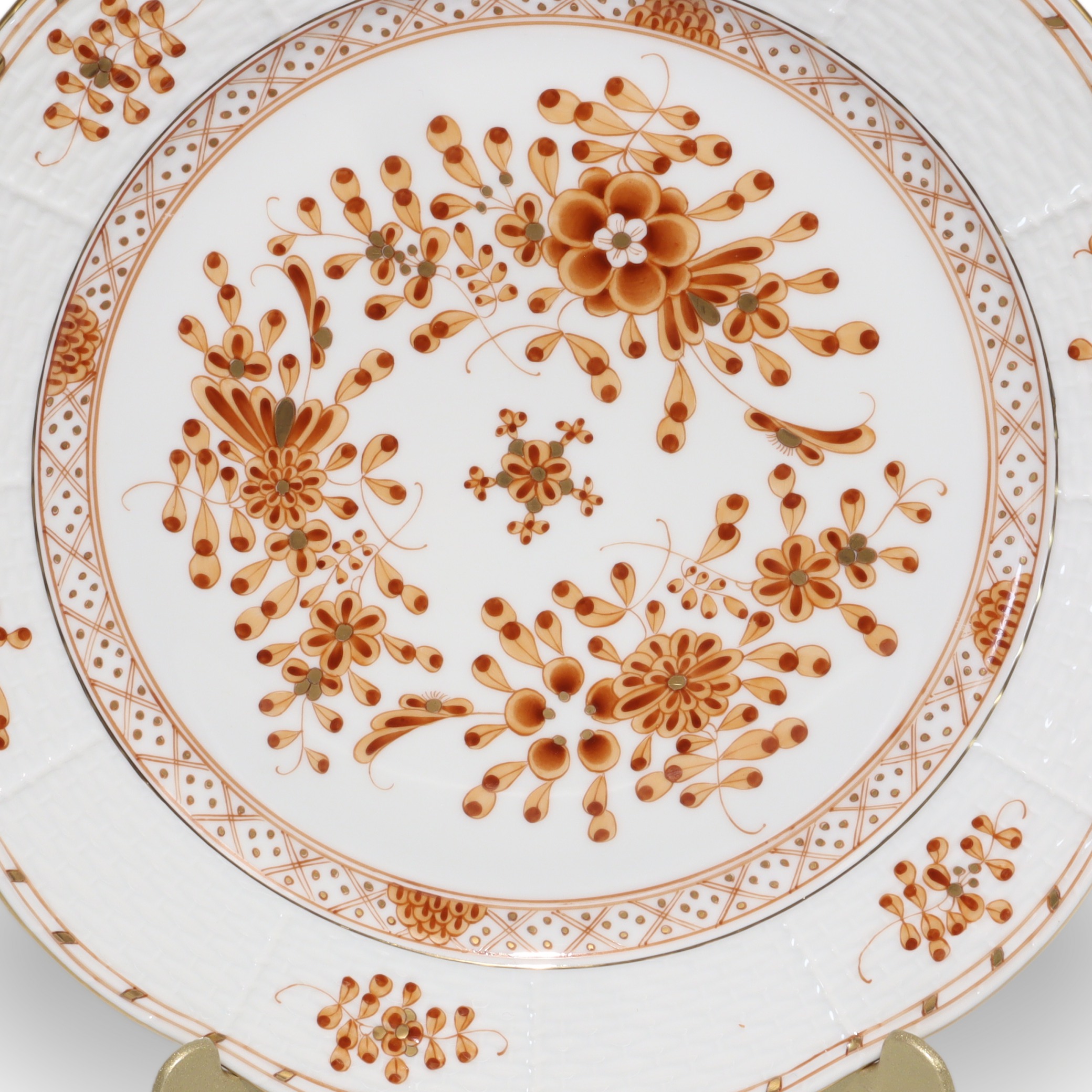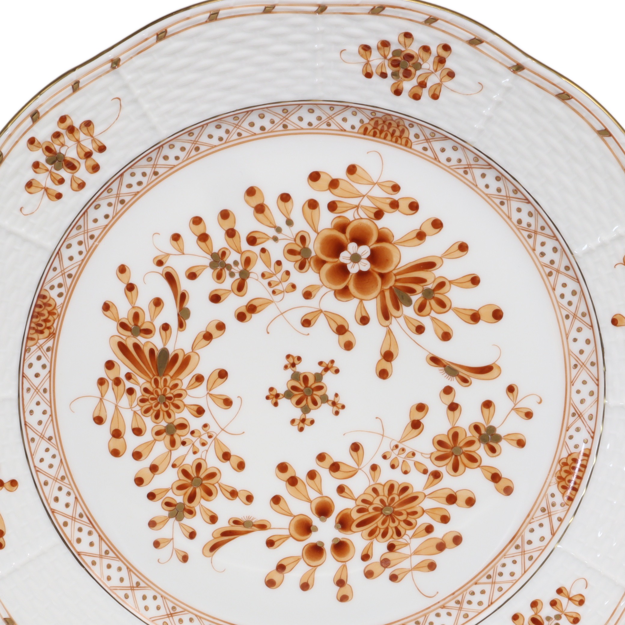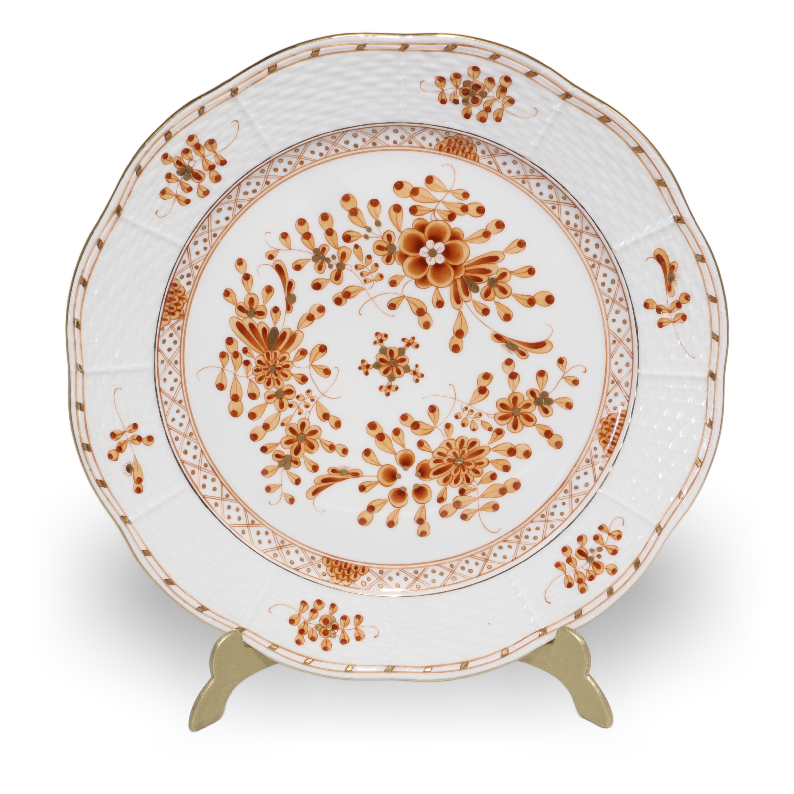 Das aufwendige Flechtmuster im Relief, welches sich über den Rand zieht, hebt dieses Modell besonders hervor. Es steht im spannenden Kontrast zur glatten, fein glasierten Spiegelmitte, während die mehrfarbige Floraldekoration für eine außergewöhnliche Lebendigkeit sorgt. Jeder Teller aus dieser Serie ist immer auch Ausdruck der Philosophie von Herend: Tradition, Luxus und Individualität verschmelzen auf jedem einzelnen Stück. Mit der warmen Marron-Farbpalette wirkt der Teller besonders edel und lässt sich hervorragend mit anderen klassischen oder modernen Service-Teilen kombinieren.