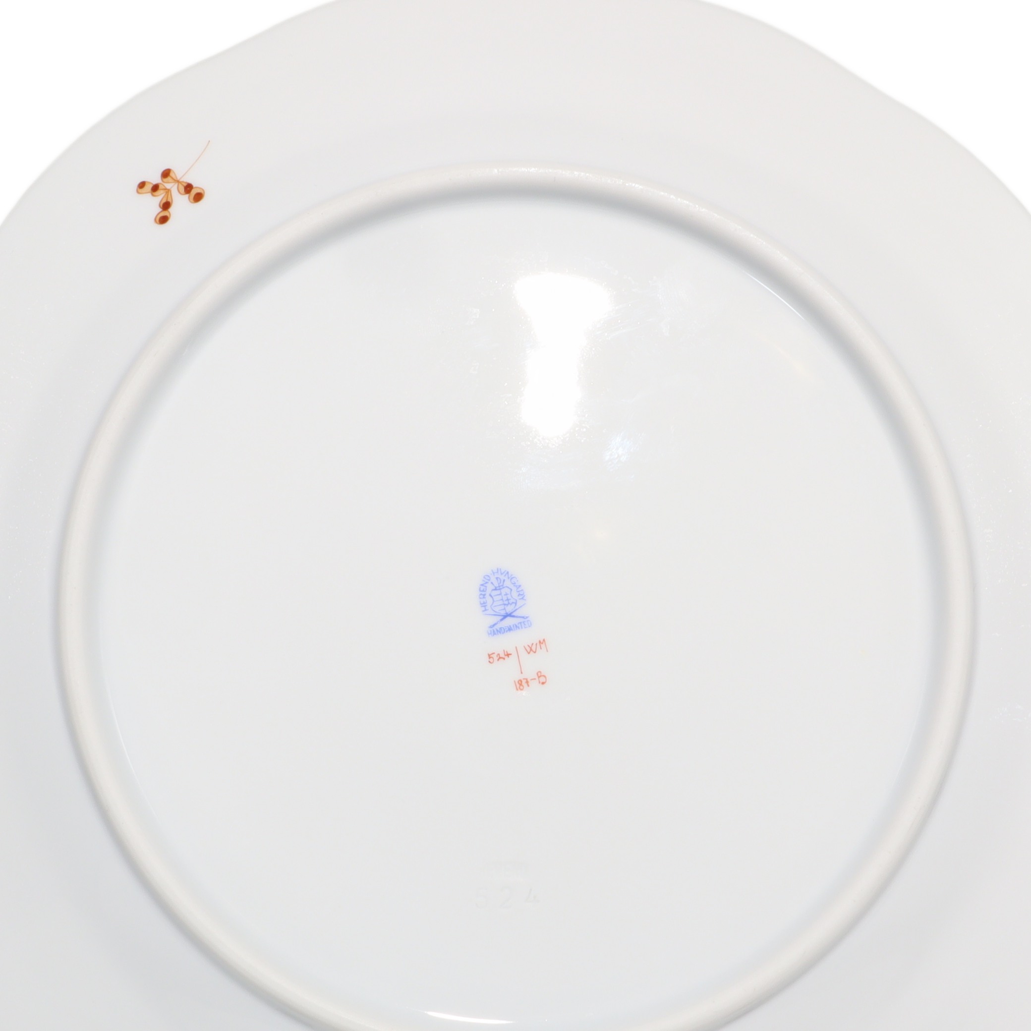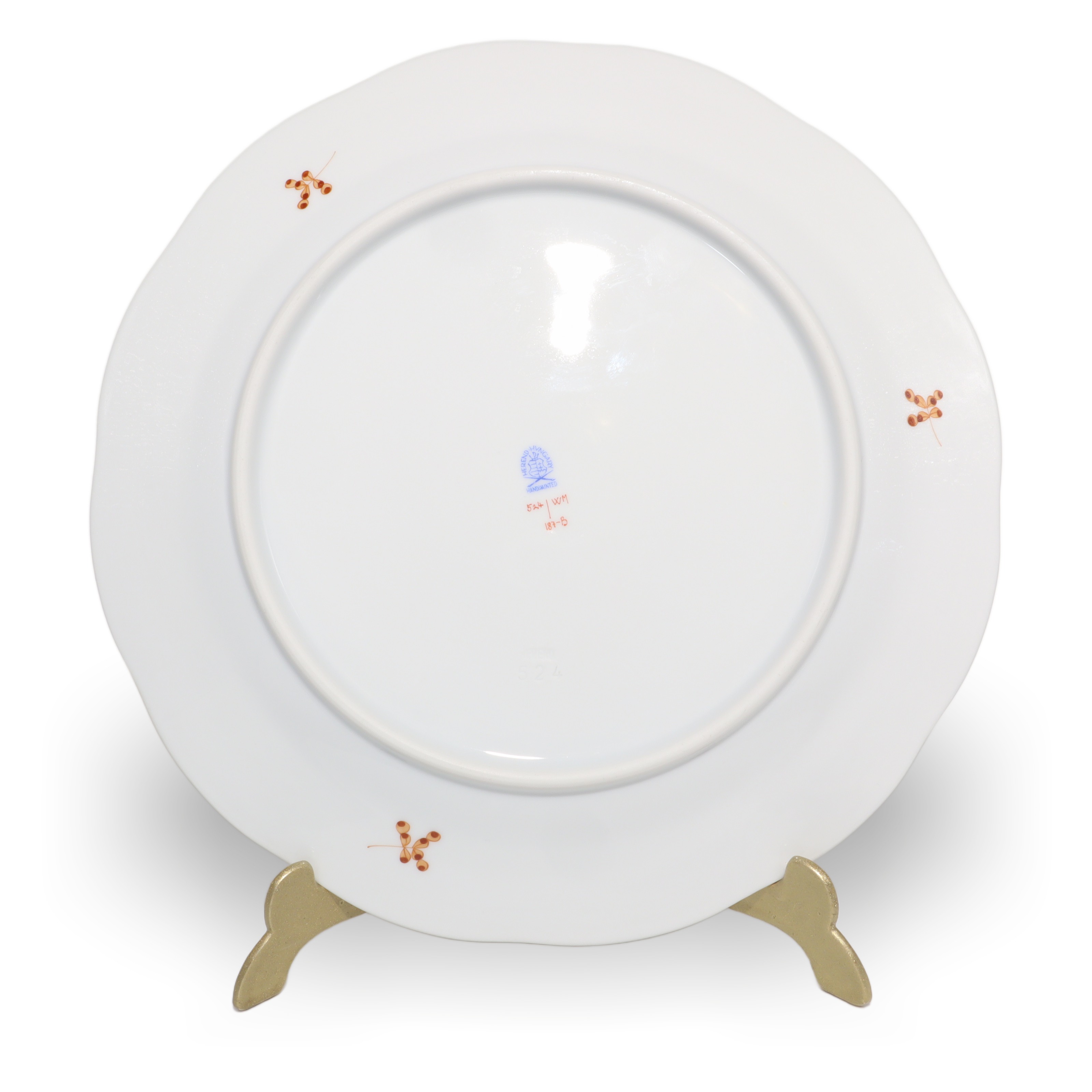 Die Marke Herend steht seit Generationen für Porzellantradition auf höchstem Niveau. Bereits 1826 gegründet, hat sich die Manufaktur international einen exzellenten Ruf erarbeitet und liefert bis heute an Adelshäuser sowie in Museen und an anspruchsvolle Privatkunden weltweit. Besonderes Merkmal sind die handgemalten Motive, die oft historischen Mustersammlungen und Naturstudien entlehnt sind. Die Linie „Waldstein Marron“ zählt zu den eleganteren und selteneren Dekoren aus dieser Ära und verbindet klassische Jugendstilelemente mit dem modernen Geschmack der späten 1970er und frühen 1980er Jahre. Das Motiv ist nicht mehr im aktuellen Produktionsprogramm und nur noch auf dem Sekundärmarkt erhältlich – was diesen Teller zu einem raren Fundstück macht.