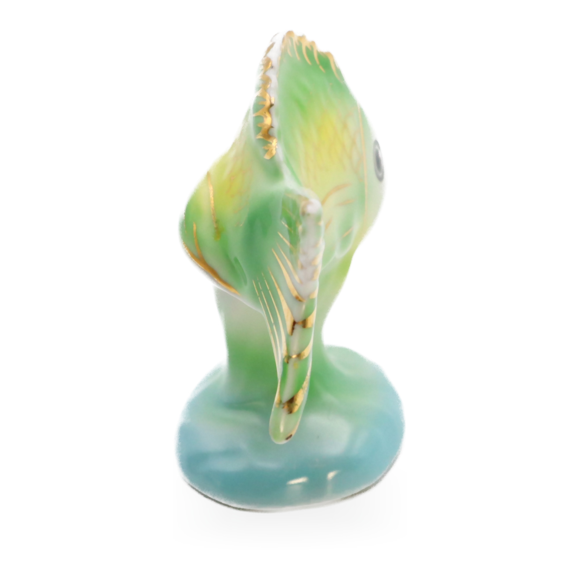 Die feine Handbemalung dieser Vintage-Keramik-Kolletible-Skulptur zeigt eine außergewöhnliche Liebe zum Detail. Die lebhaften Farben des Fisches, die in einem harmonischen Zusammenspiel von Grün- und Gelbtönen erstrahlen, sind ein besonderes Merkmal dieser Figur. Jedes Schuppendetail und jeder Konturstrich ist meisterhaft ausgeführt und verleiht dem Stück eine lebendige Präsenz. Tatsächlich scheint der Fisch in seiner Bewegung eingefangen zu sein, als ob er in den Wellen des Ozeans tanzt, und lädt den Betrachter ein, sich ein wenig länger mit seiner unvergleichlichen Schönheit zu beschäftigen.