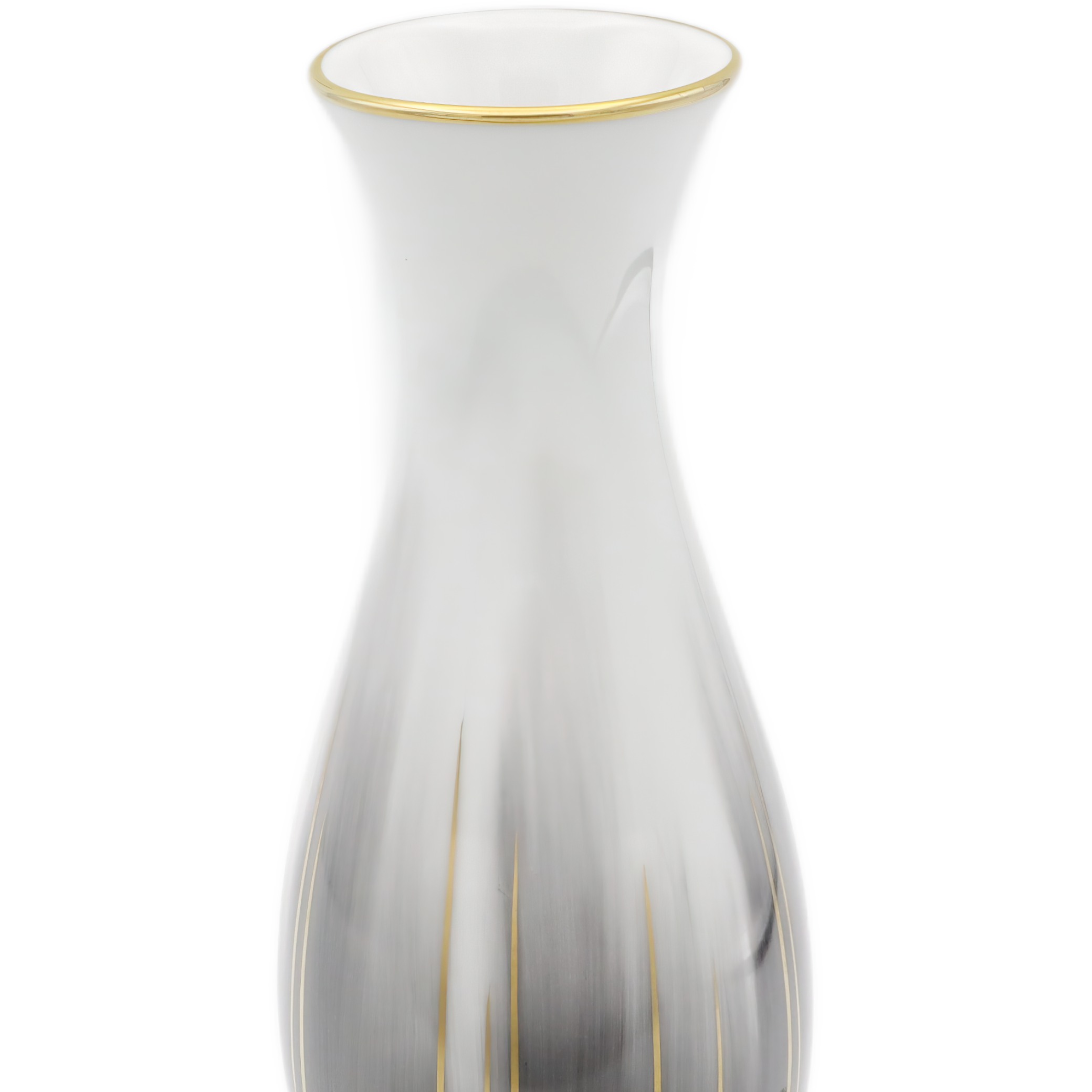Hier hast du ein echtes Schmuckstück für stilbewusste Sammler:innen und Liebhaber:innen deutschen Porzellan-Designs: Die Vintage Rosenthal Vase mit Goldrand aus dem Jahr 1970. Diese Vase verkörpert in Perfektion die Ästhetik der Mid Century Modern Bewegung und ist dabei ein typisches Beispiel für die berühmte Studio Line von Rosenthal. Das schlichte Weiß wird durch ein feines, florales Muster aufgelockert, das subtil, aber wirkungsvoll den Blick anspricht. Die zarte Linienführung im Dekor unterstreicht das zeitlose, elegante Design – typisch Rosenthal, typisch 70er!
