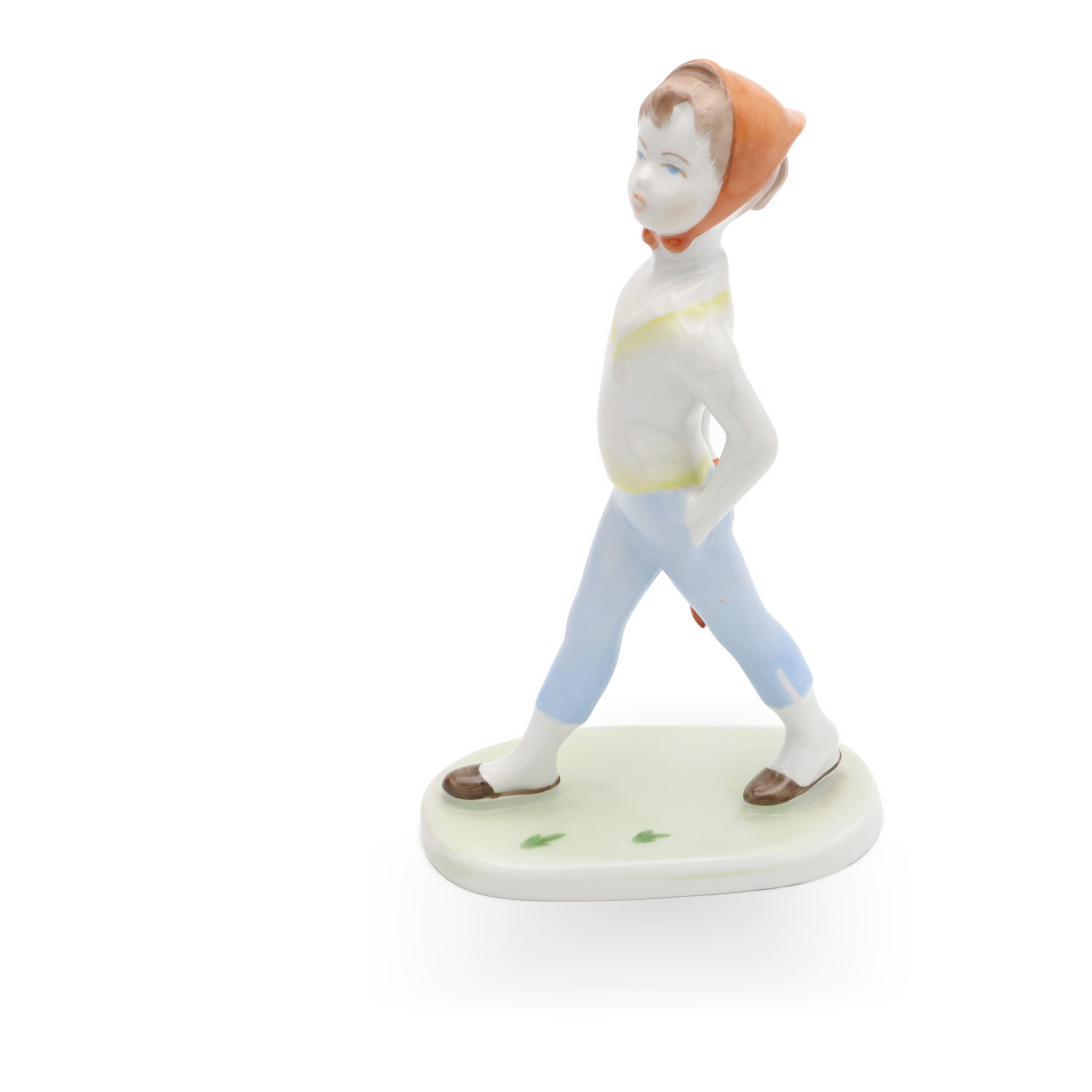 Der sanfte Farbton des Porzellans, kombiniert mit den feinen Pinselstrichen der Bemalung, lässt die Figur lebendig erscheinen. Die Farbpalette, die überwiegend aus weichen Pastelltönen besteht, verleiht dem Stück eine beruhigende und gleichzeitig fröhliche Ausstrahlung. Ihr Kopf ist mit einem rot-braunen Tuch bedeckt, das einen schönen Kontrast zu den zarten Blautönen der Kleidung bildet. Die Hände des Mädchens sind lässig an den Hüften positioniert, was den Eindruck einer entspannten Spaziergängerin verstärkt.