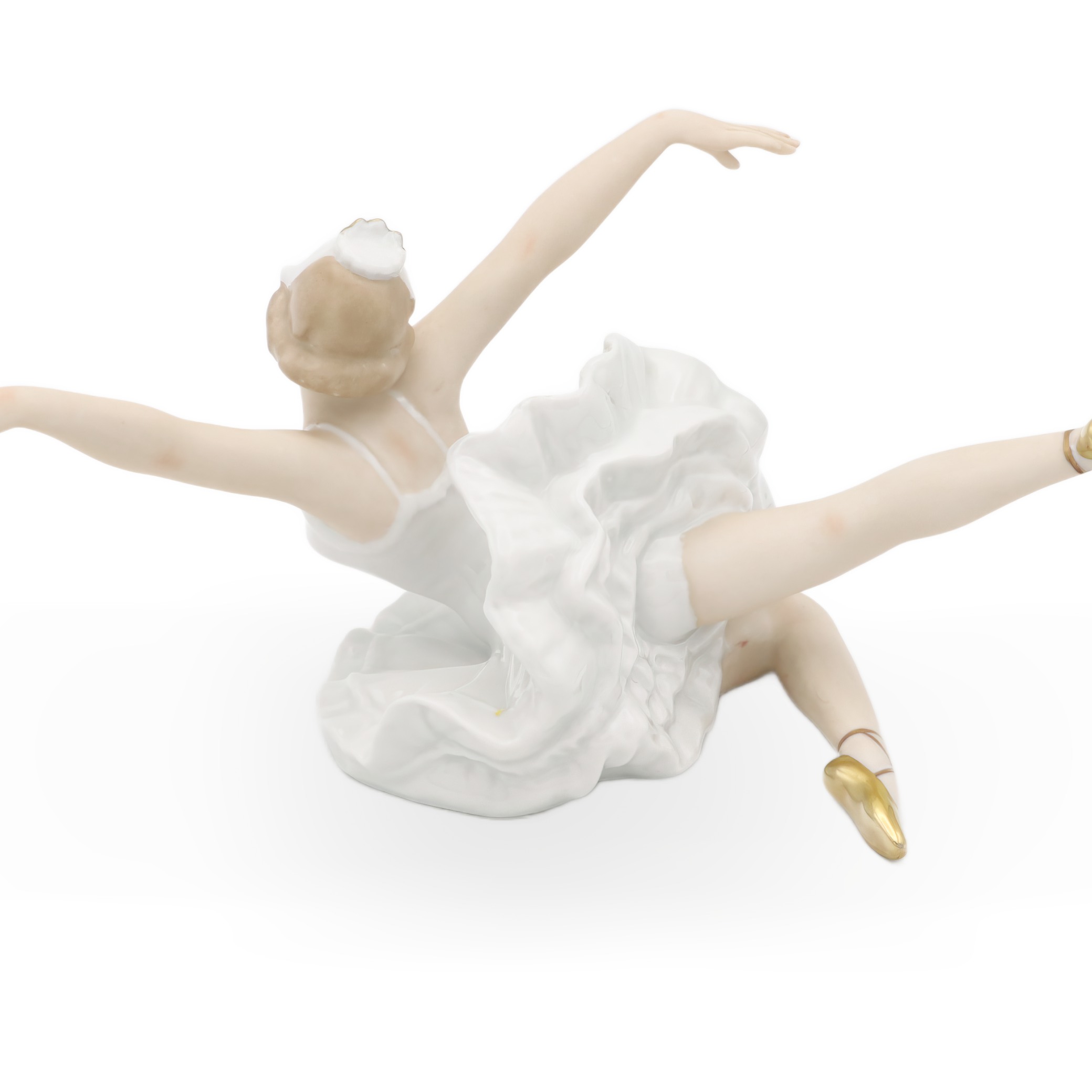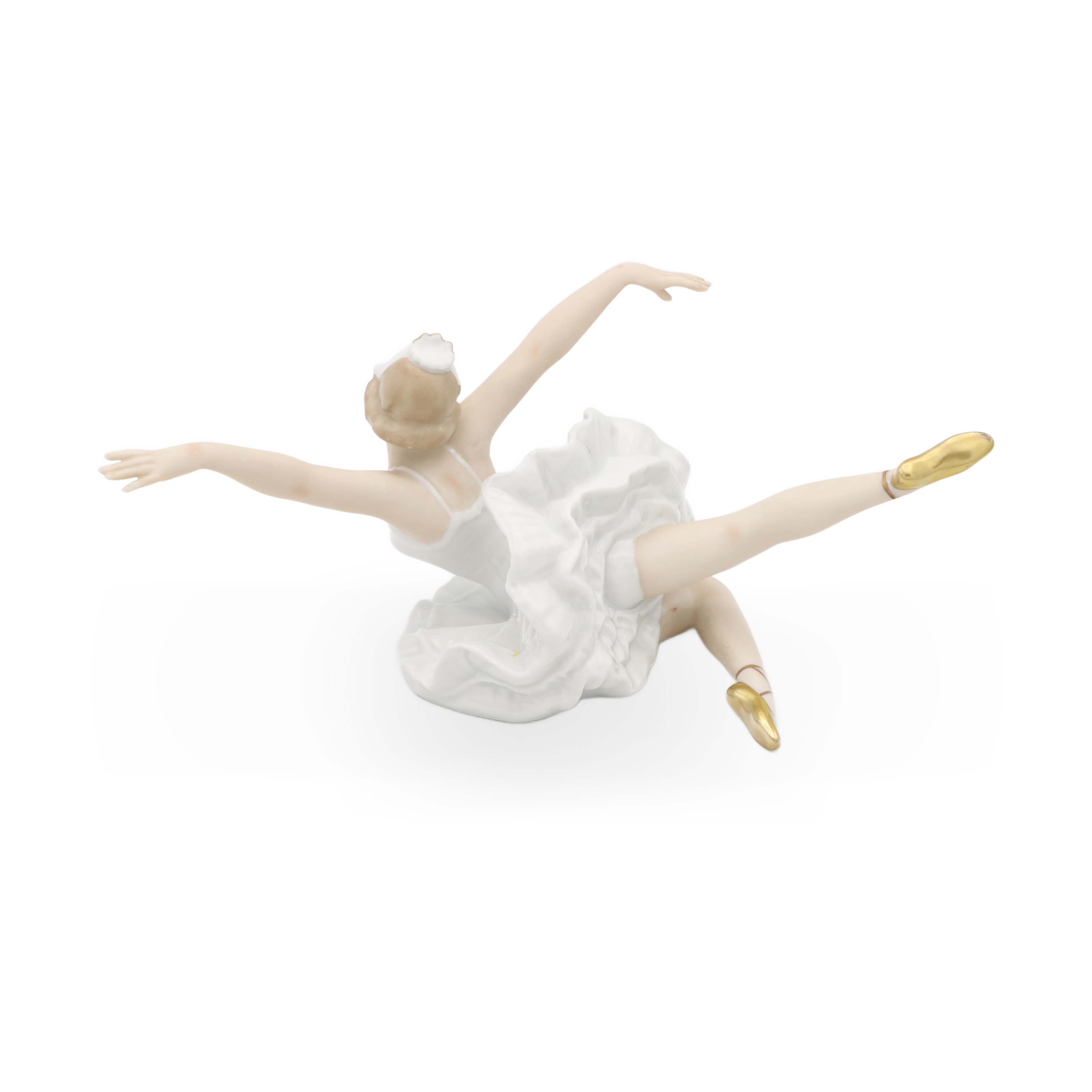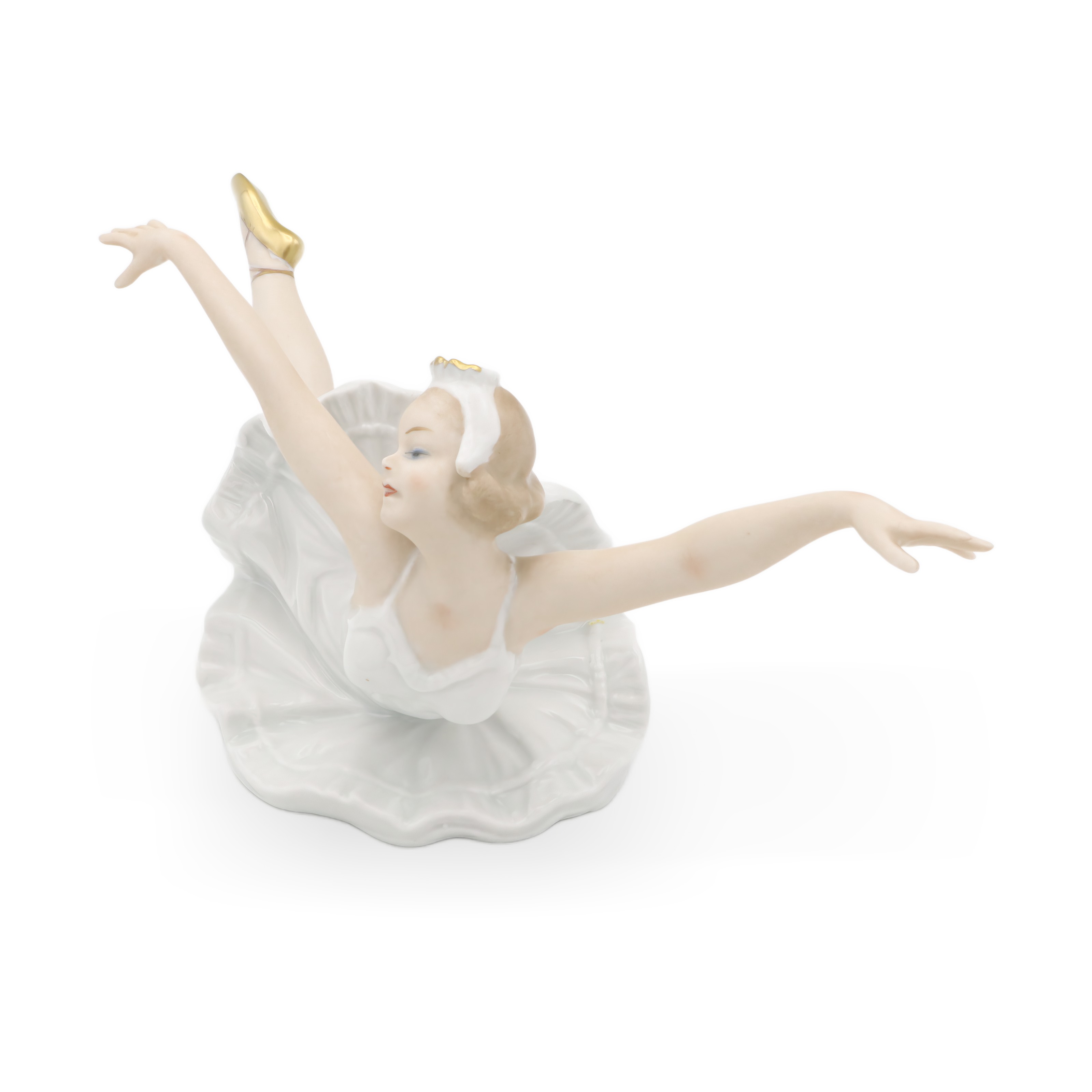 Die Tänzerin misst in der Höhe 11,25 cm, in der Breite 13,75 cm und in der Länge 16,25 cm – eine ausgezeichnet präsentierbare Größe für jede Vitrine oder ein stilvolles Sideboard. Ihr Zustand ist fast neuwertig, was dieser Figur einen ganz besonderen Wert verleiht. Die fein ausgearbeiteten Gesichtszüge und der sanfte Teint, akzentuiert durch zartblaue Augenschatten und eine wunderbar ausdrucksvolle Mimik, hauchen ihr beinahe Leben ein. Goldene Akzente an den Ballettschuhen und der Tiara setzen elegante Highlights und fügen einen Hauch von Luxus hinzu.