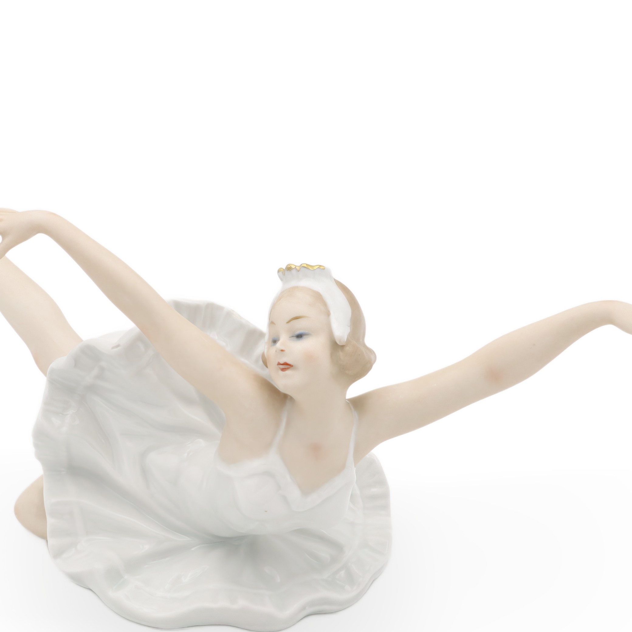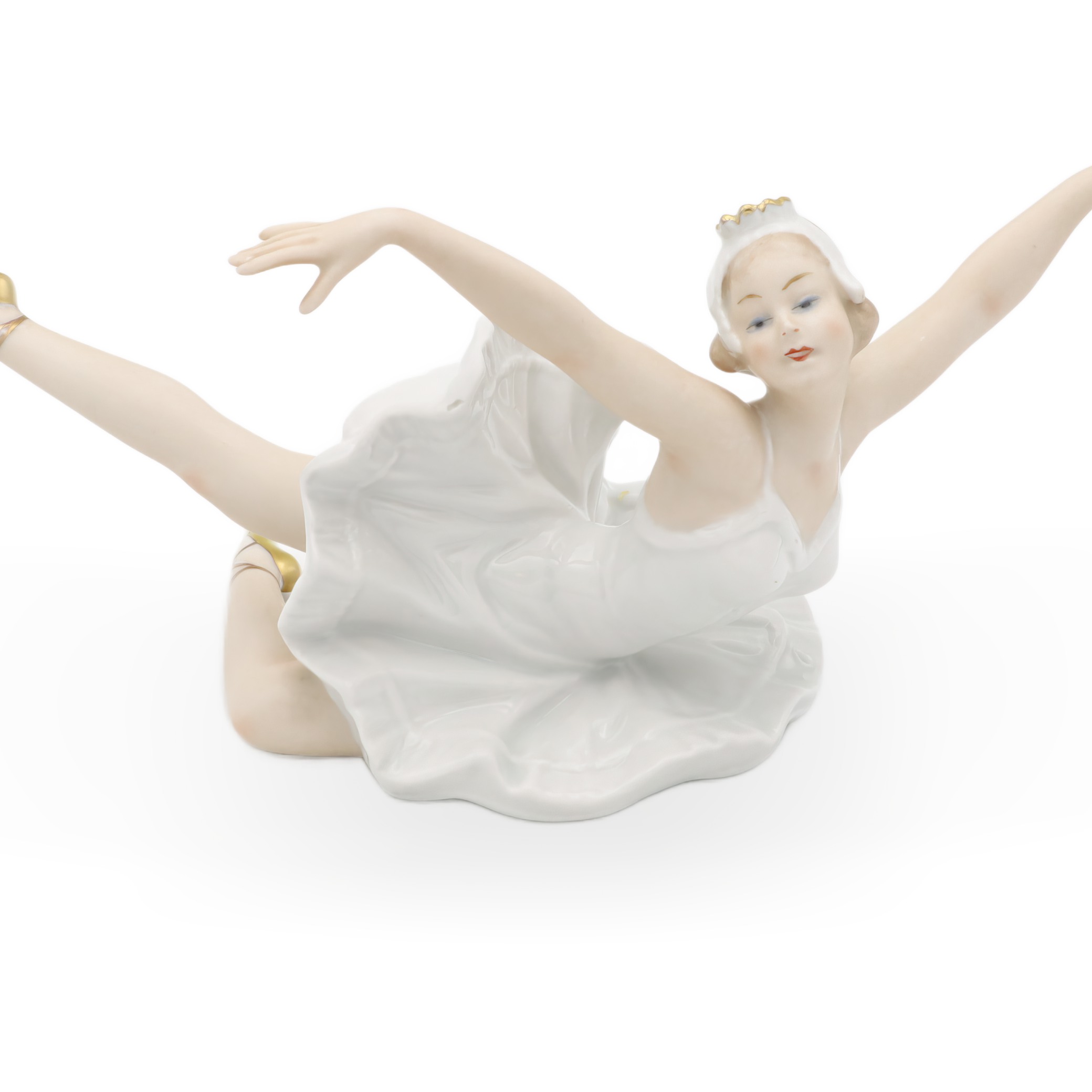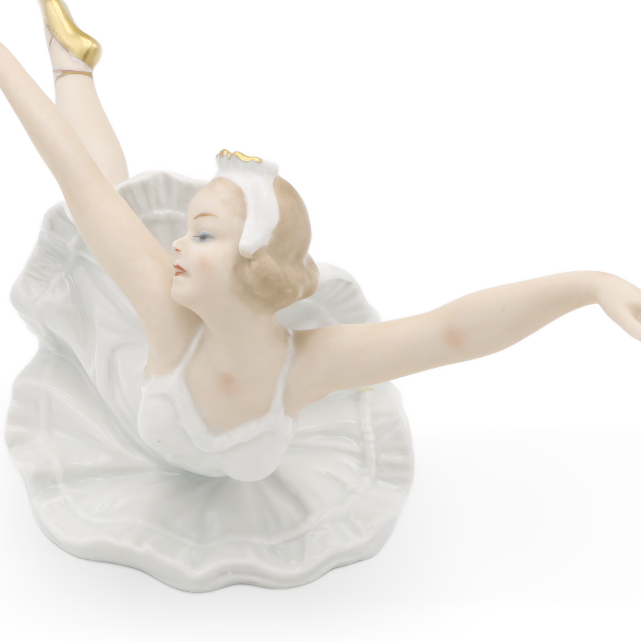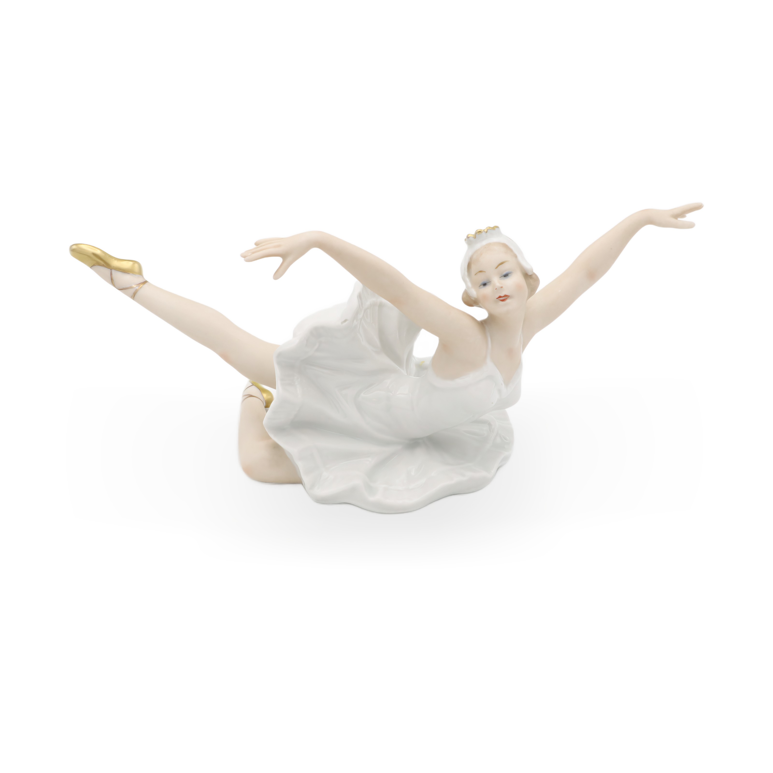 Die Tänzerin misst in der Höhe 11,25 cm, in der Breite 13,75 cm und in der Länge 16,25 cm – eine ausgezeichnet präsentierbare Größe für jede Vitrine oder ein stilvolles Sideboard. Ihr Zustand ist fast neuwertig, was dieser Figur einen ganz besonderen Wert verleiht. Die fein ausgearbeiteten Gesichtszüge und der sanfte Teint, akzentuiert durch zartblaue Augenschatten und eine wunderbar ausdrucksvolle Mimik, hauchen ihr beinahe Leben ein. Goldene Akzente an den Ballettschuhen und der Tiara setzen elegante Highlights und fügen einen Hauch von Luxus hinzu.
