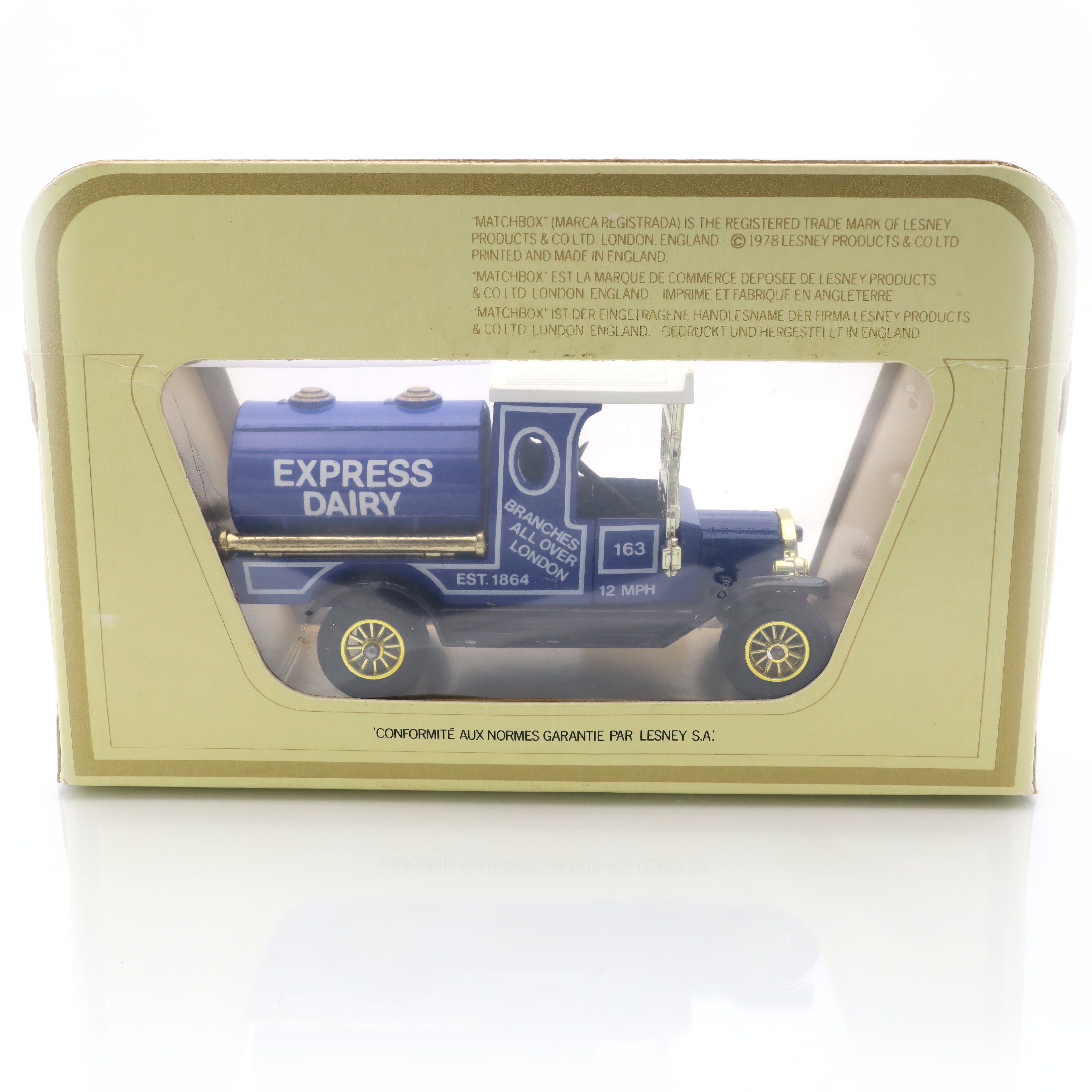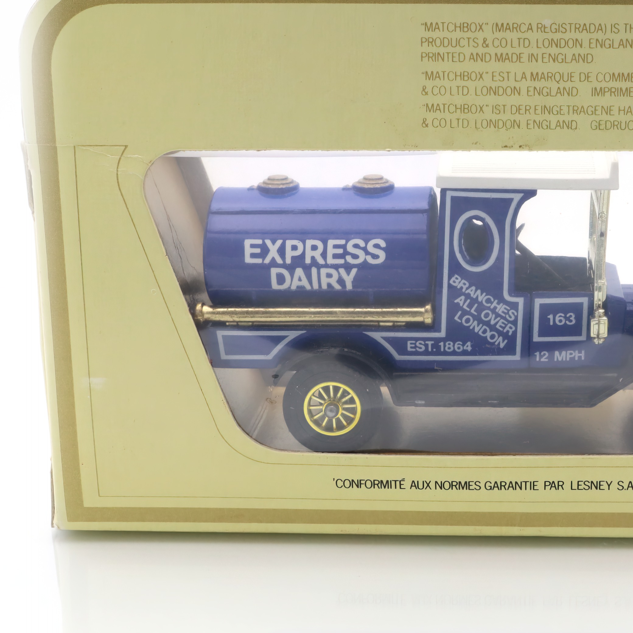 Der Tankwagen selbst ist im Maßstab gehalten, der für die „Modelle von gestern“-Serie typisch ist, und macht besonders in der OVP – der originalen Verpackung – eine hervorragende Figur. Die Verpackung, noch wunderbar erhalten, unterstreicht den Vintage-Charakter des Stücks. Sie spiegelt mit ihrem typischen Design und dem großen Fenster das Feeling der 1970er und 1980er Jahre wider – ganz im Charakter der Zeit, als Spielzeug neben Spielfreude zunehmend auch Sammlerwert erlangte. Wenn du das Modell näher betrachtest, entdeckst du die liebevoll gestalteten Logos und typischen Hinweise auf Londoner Filialen der Express Dairy, was den Bezug zur britischen Stadtgeschichte nochmals verstärkt.