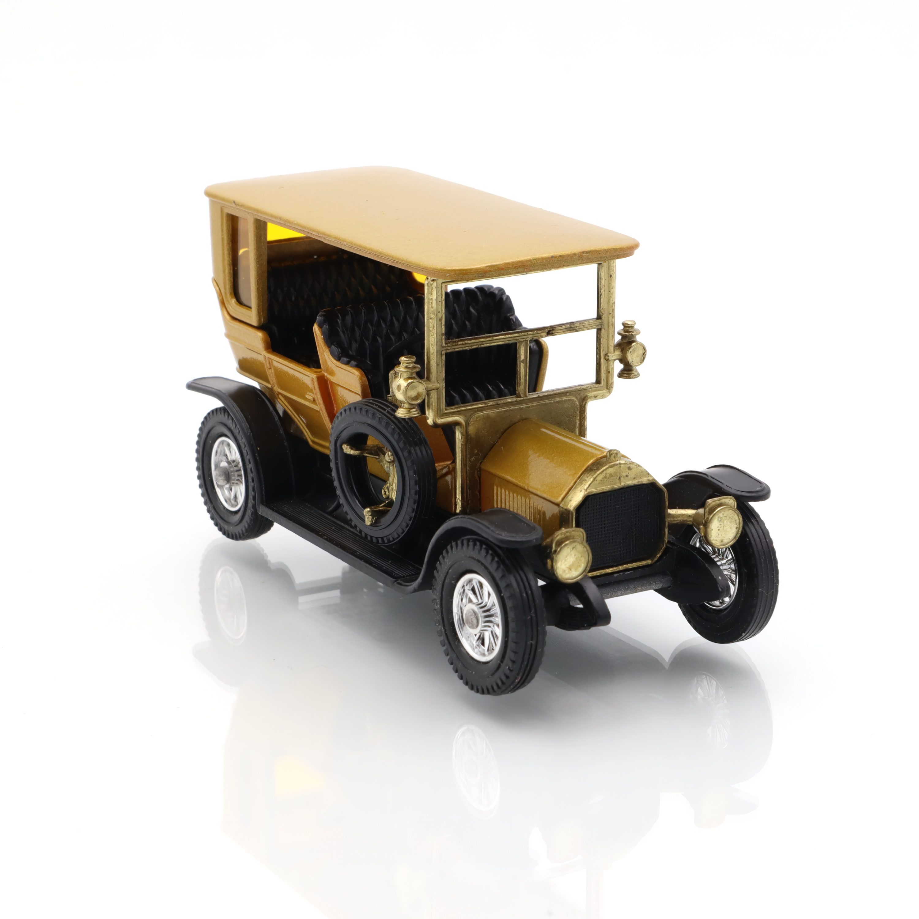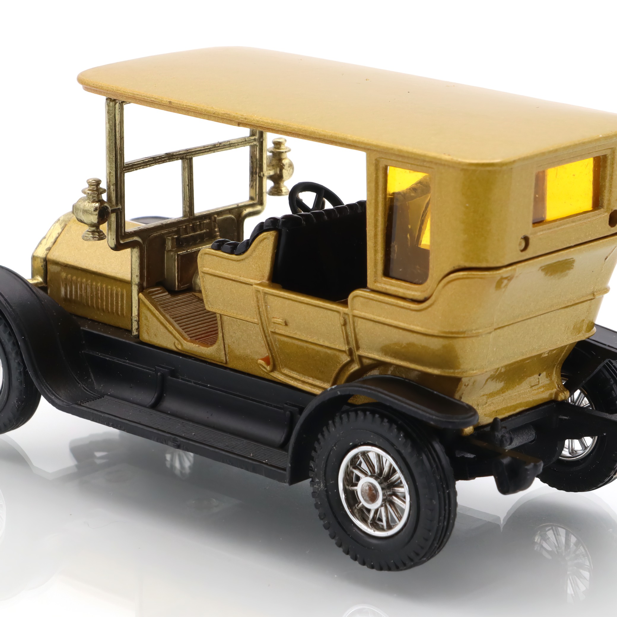 Die Karosserie dieses Miniaturautos ist in einem edlen Goldton gehalten, der das luxuriöse Flair jener Zeit perfekt einfängt. Die schwarzen Kotflügel und das schlichte, doch stilvolle Dach in passender Farbe unterstreichen die Authentizität. Die Räder sind, wie beim Original, mit Speichen gestaltet, was dem Sammlerauto einen Hauch von Nostalgie verleiht. Auch die kleinen Details wie Scheinwerfer, Türgriffe und das Armaturenbrett machen sofort klar, dass dieser Y-5 1907 Peugeot aus der Matchbox-Serie etwas ganz Besonderes ist.